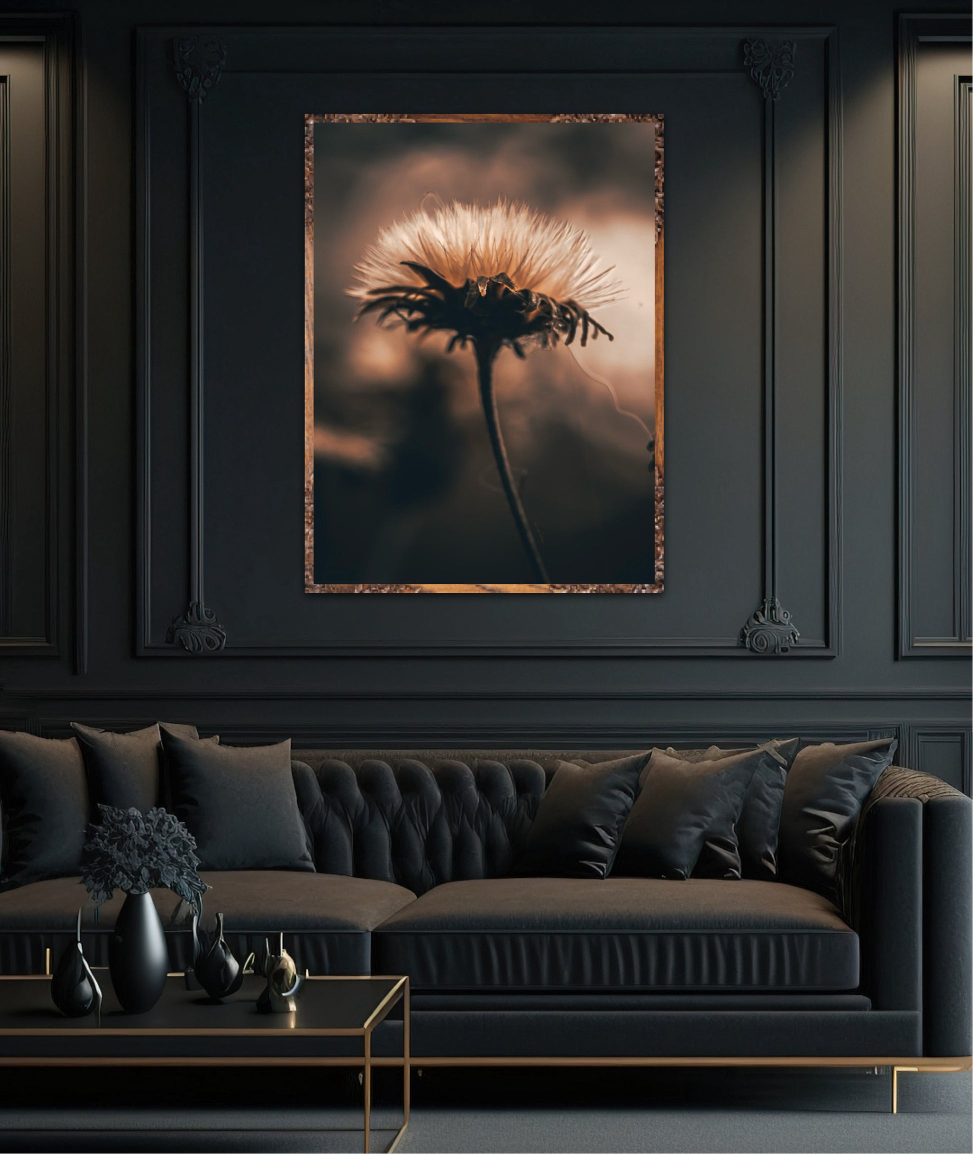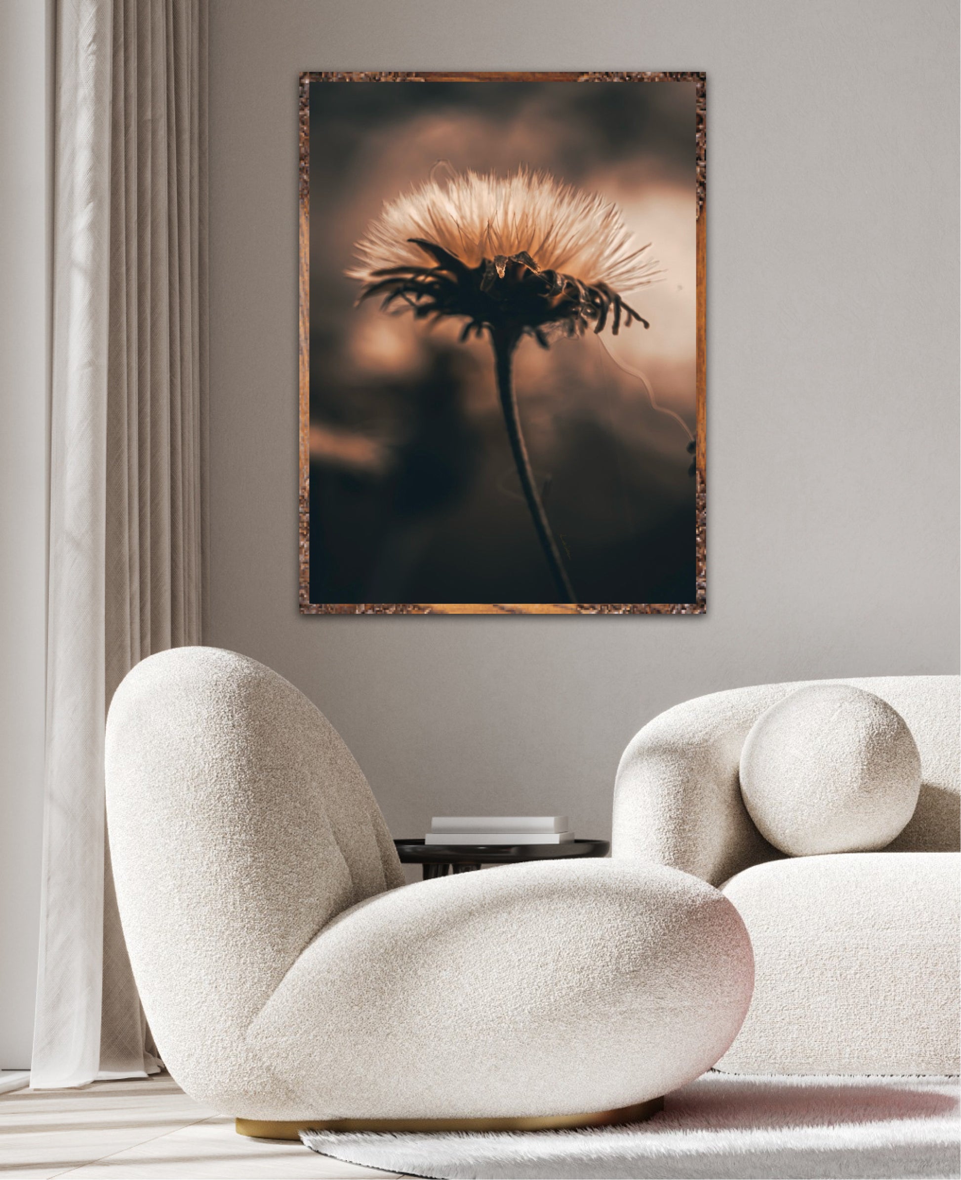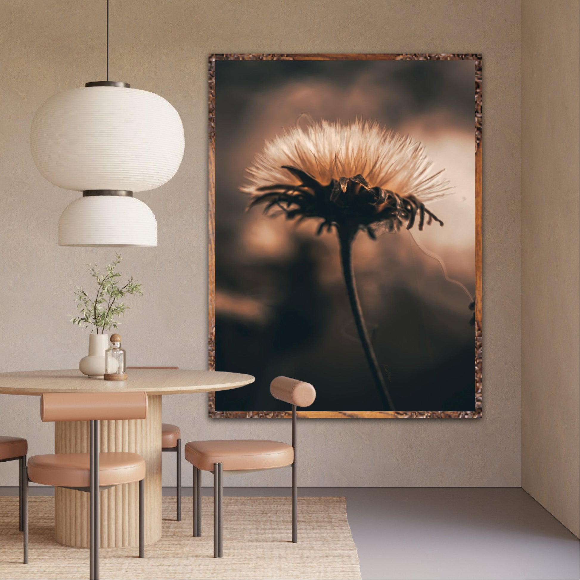 Beautiful photographic wall art of a fluffy, withered plant. The wallart has dramatic light ang comes in a beige, brown and black color.