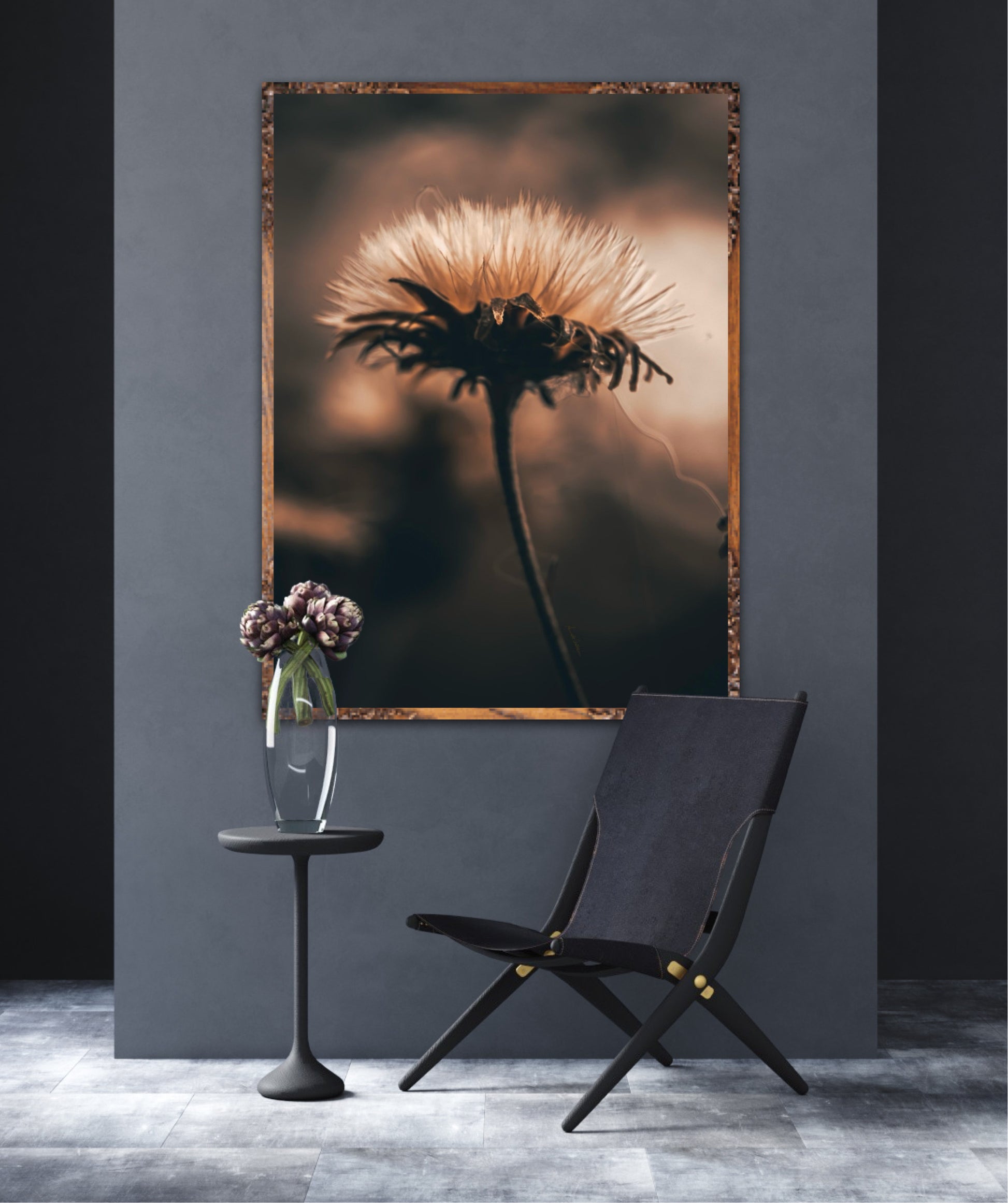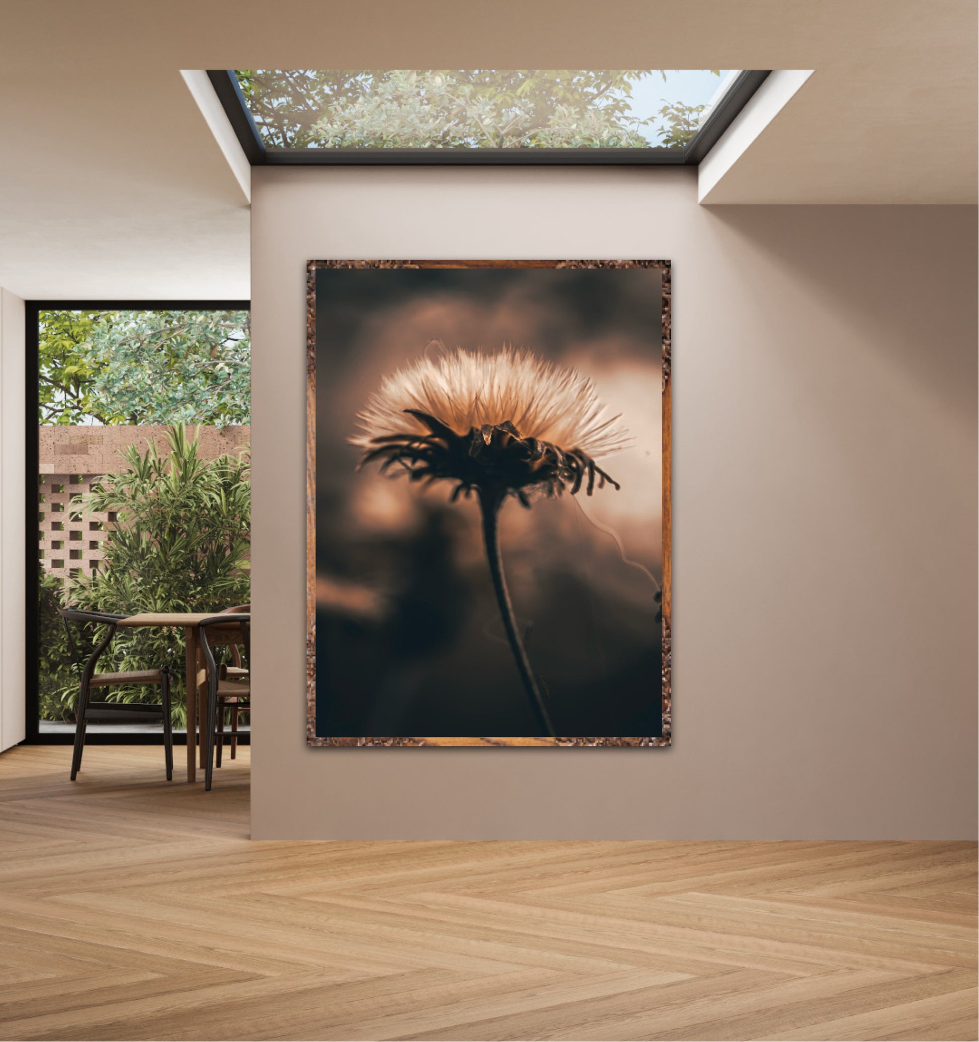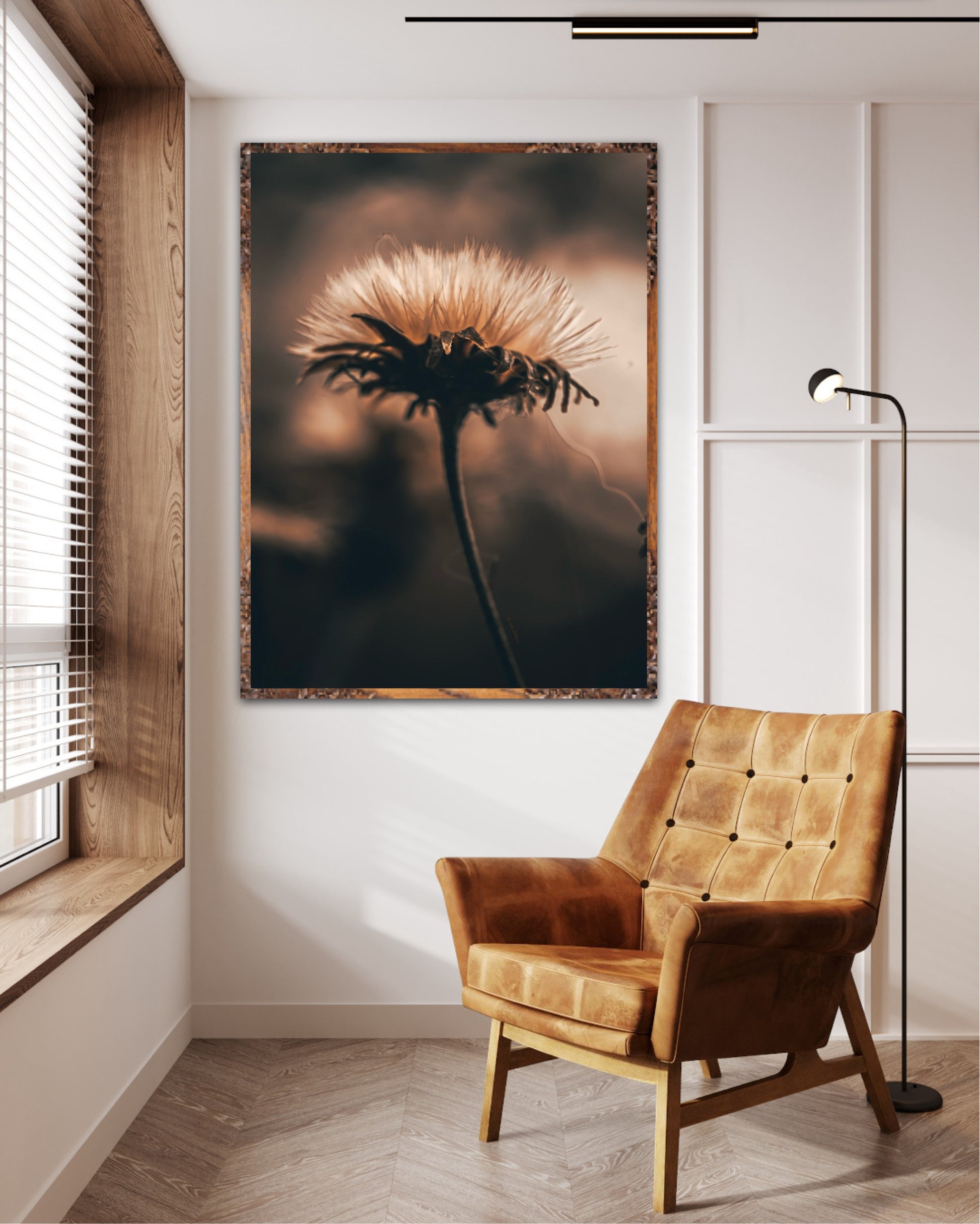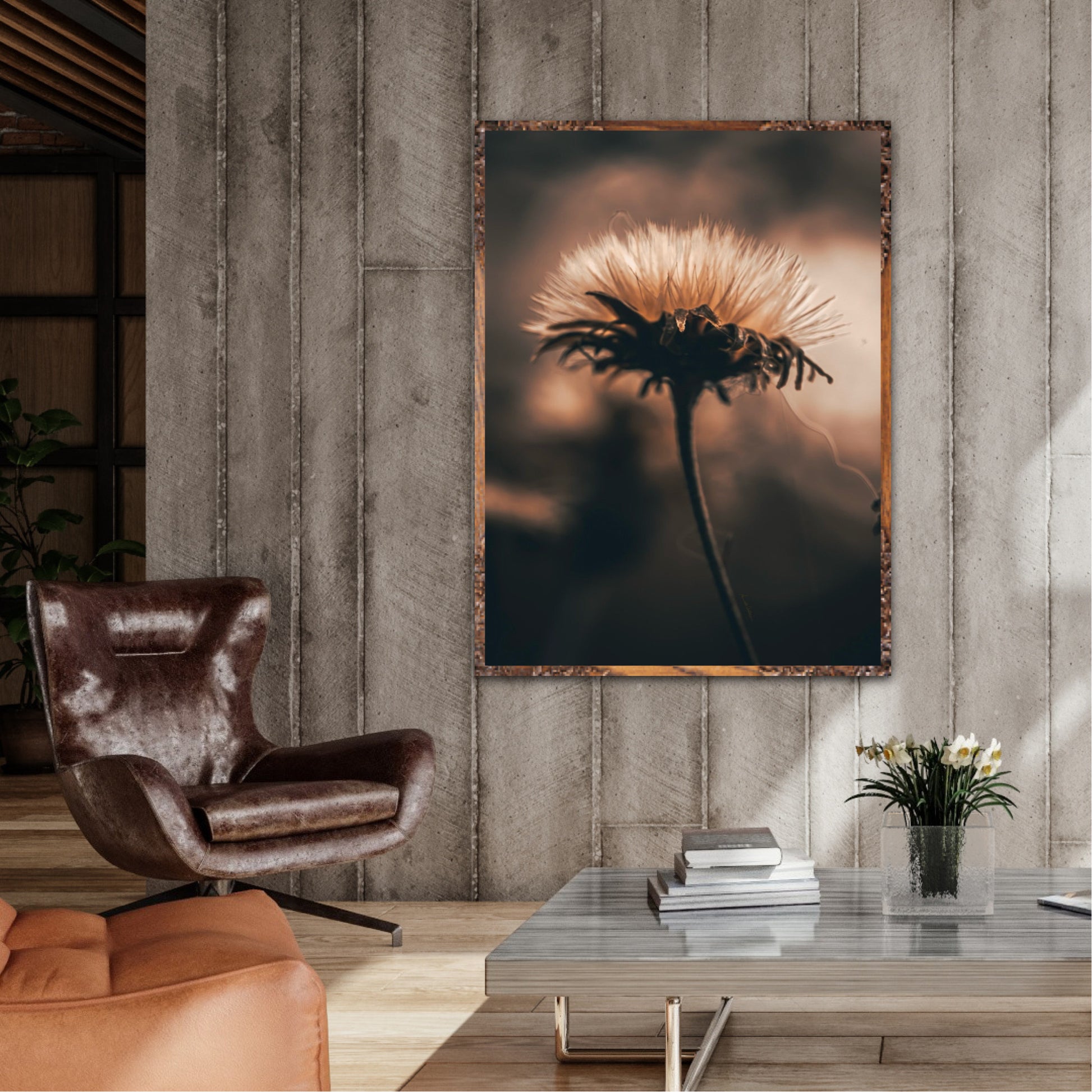 Beautiful photographic wall art of a fluffy, withered plant. The wallart has dramatic light ang comes in a beige, brown and black color.