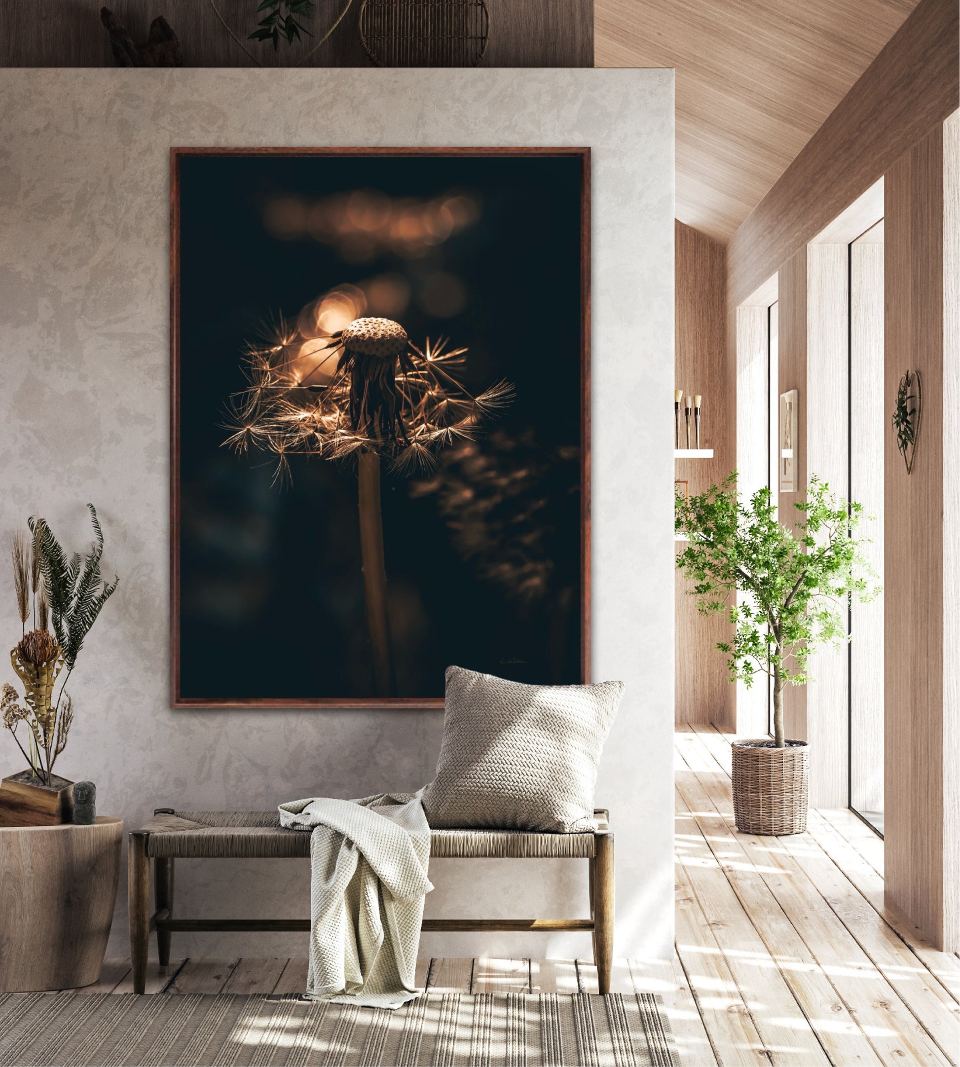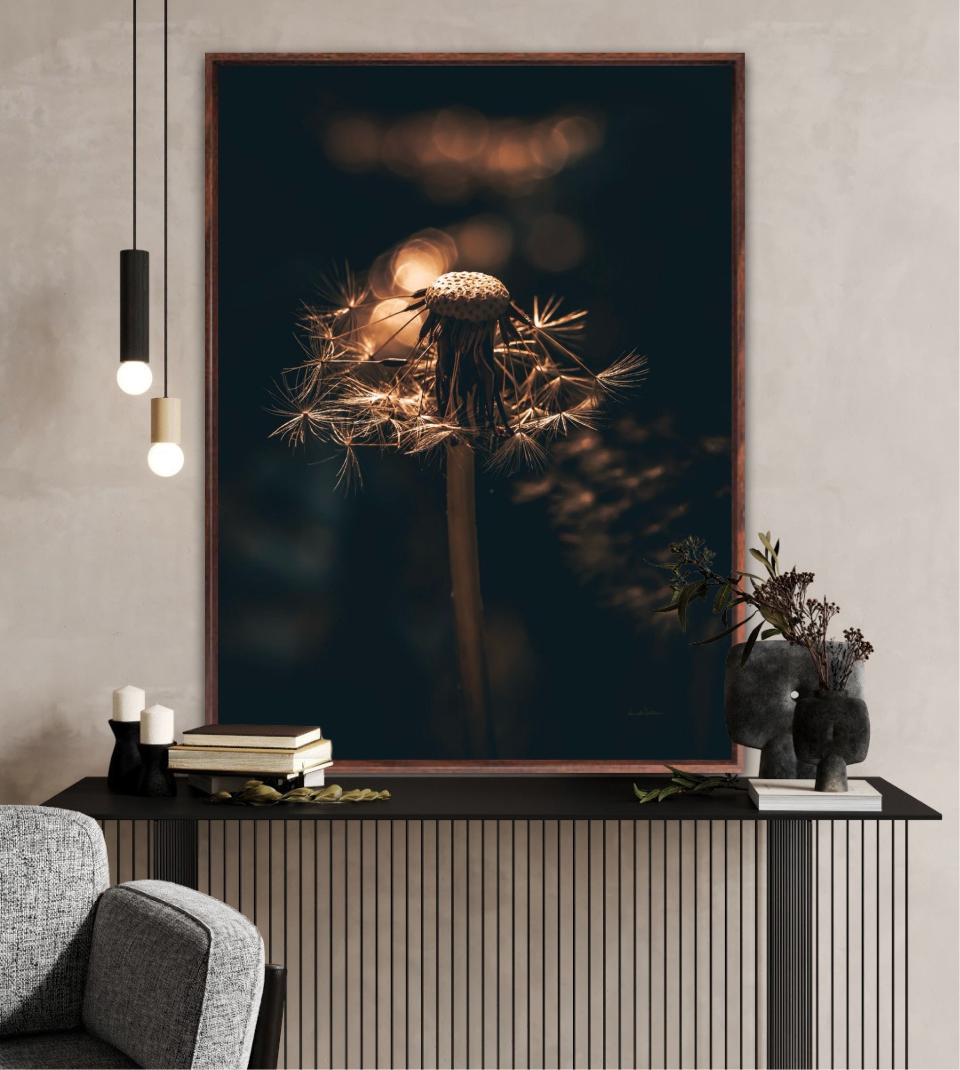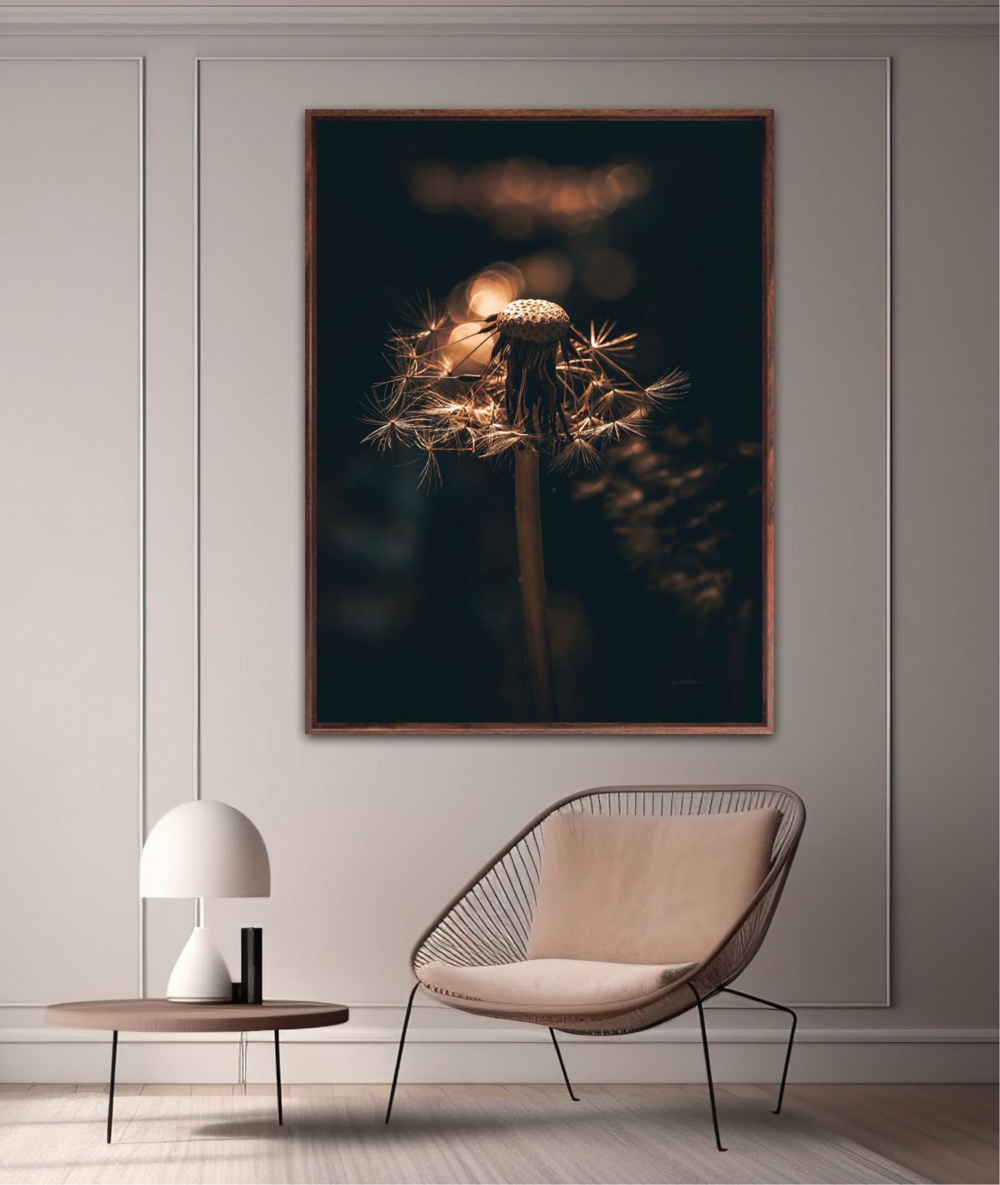 Beautiful photographic wall art of a withered dandelion in warm, golden tones, glitterings sunlight reflecting in the background. This wall art is like a warm hug.