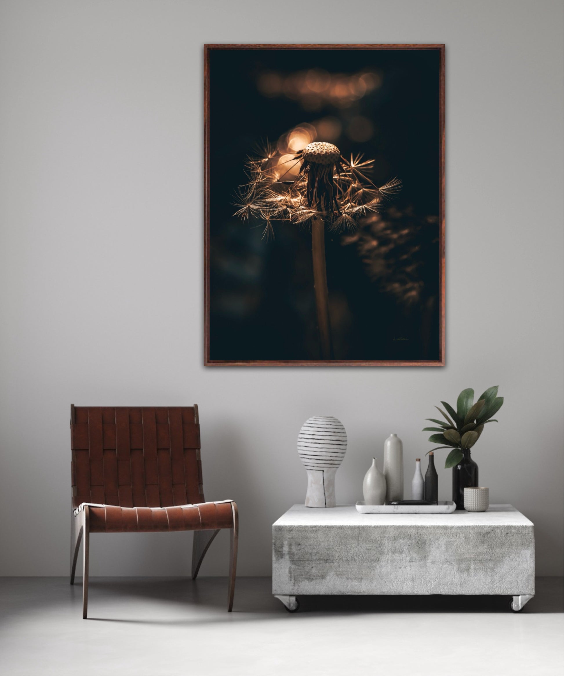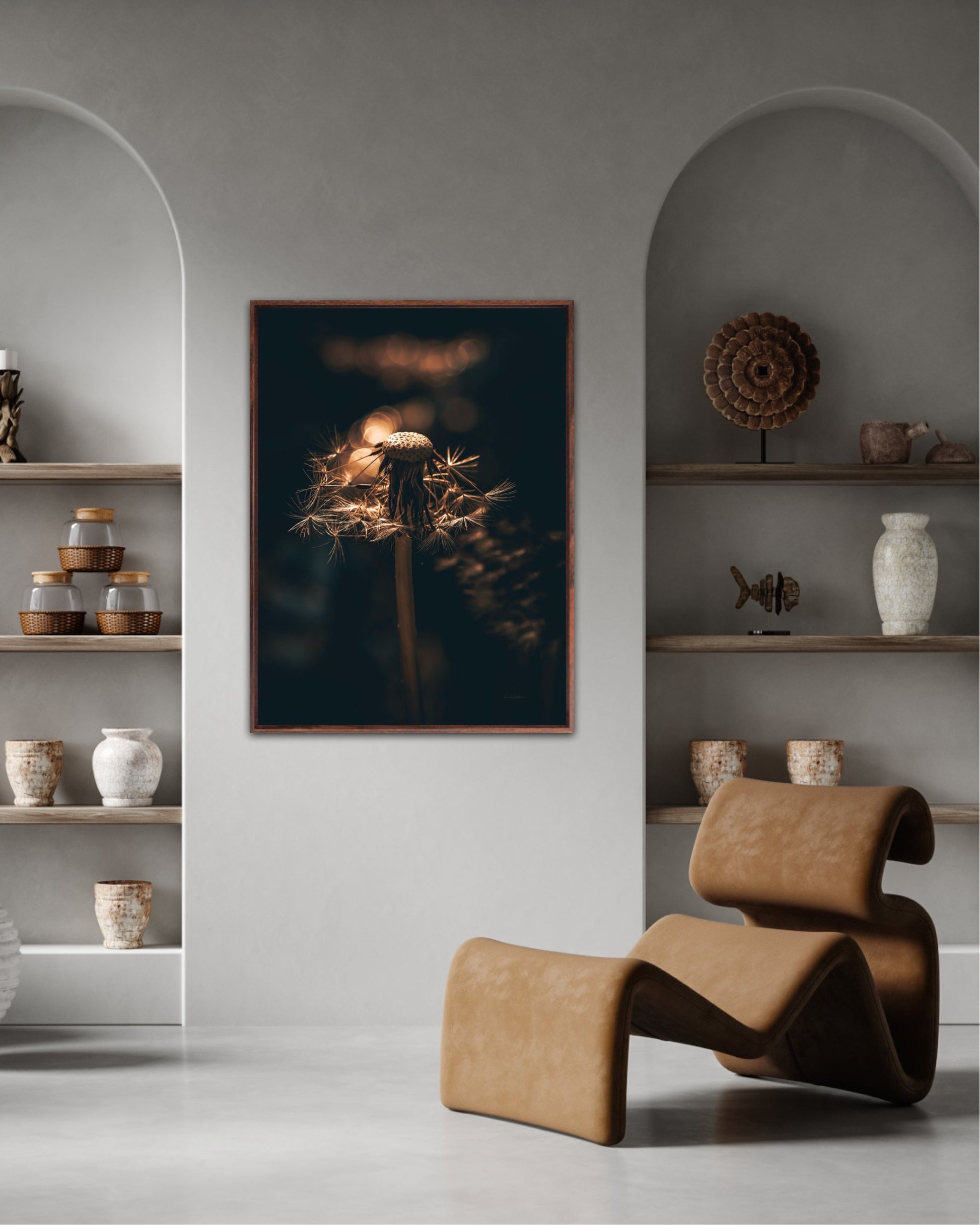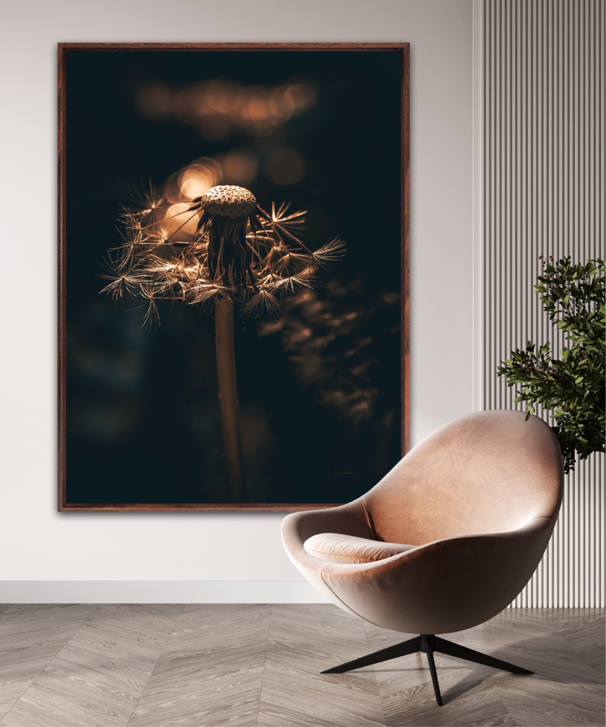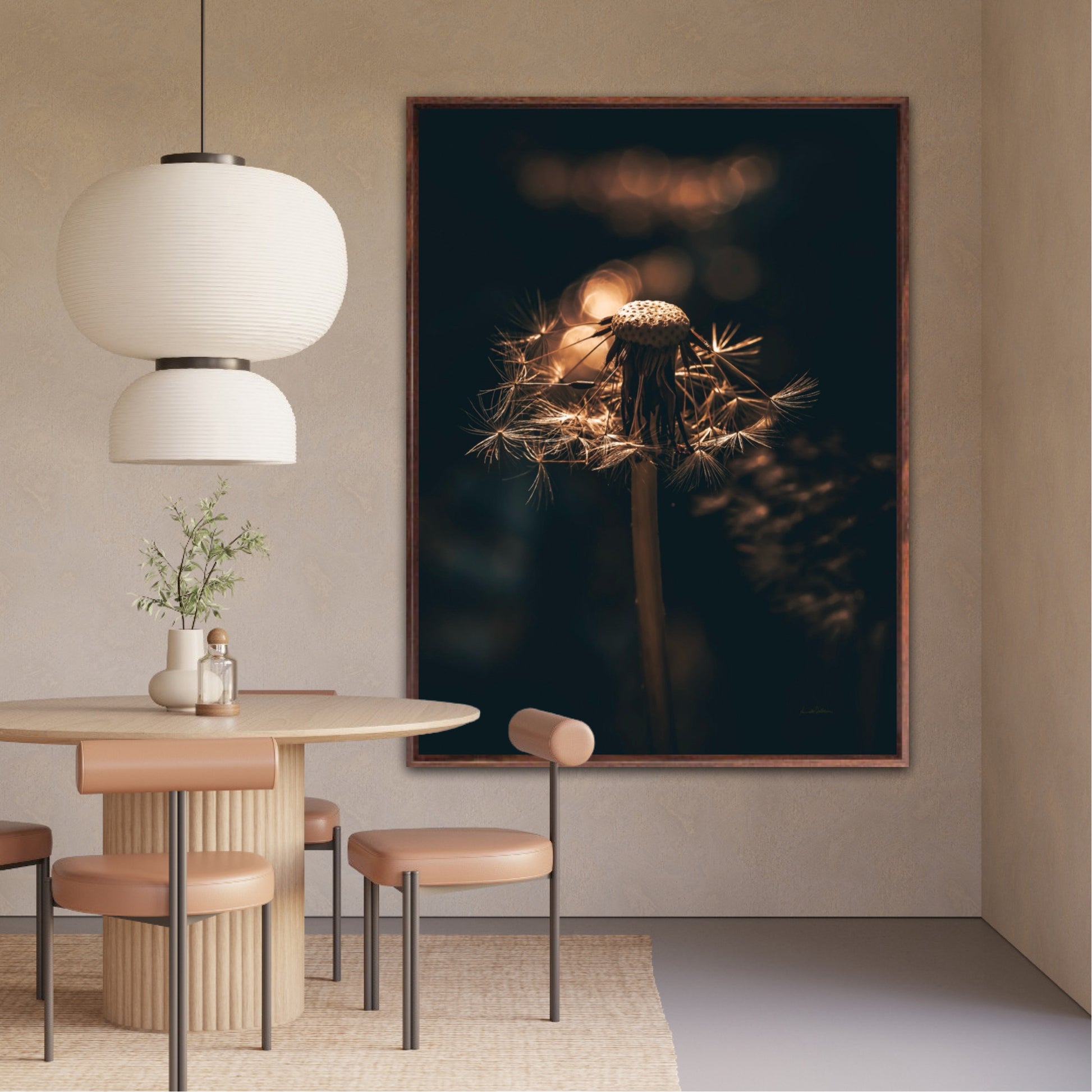 Beautiful photographic wall art of a withered dandelion in warm, golden tones, glitterings sunlight reflecting in the background. This wall art is like a warm hug.
