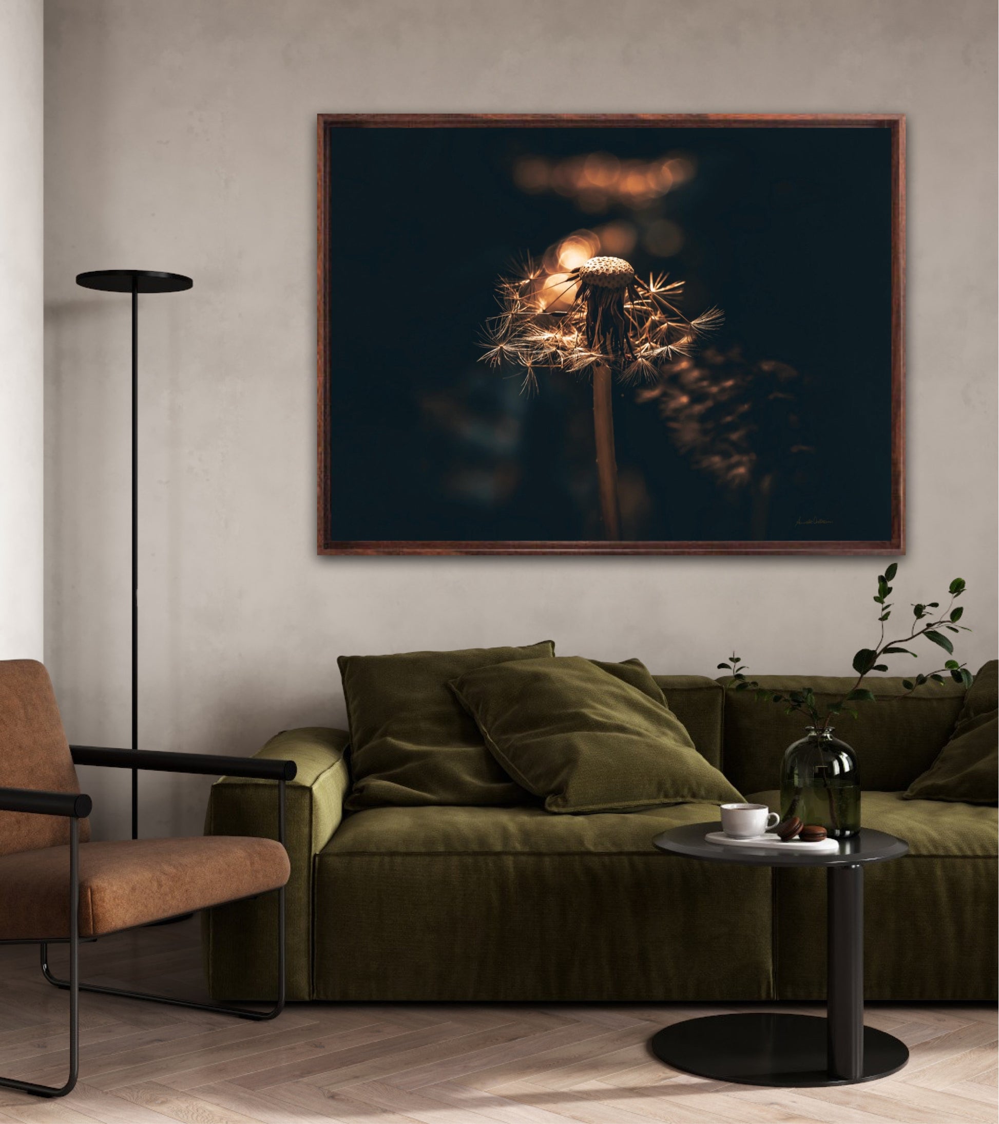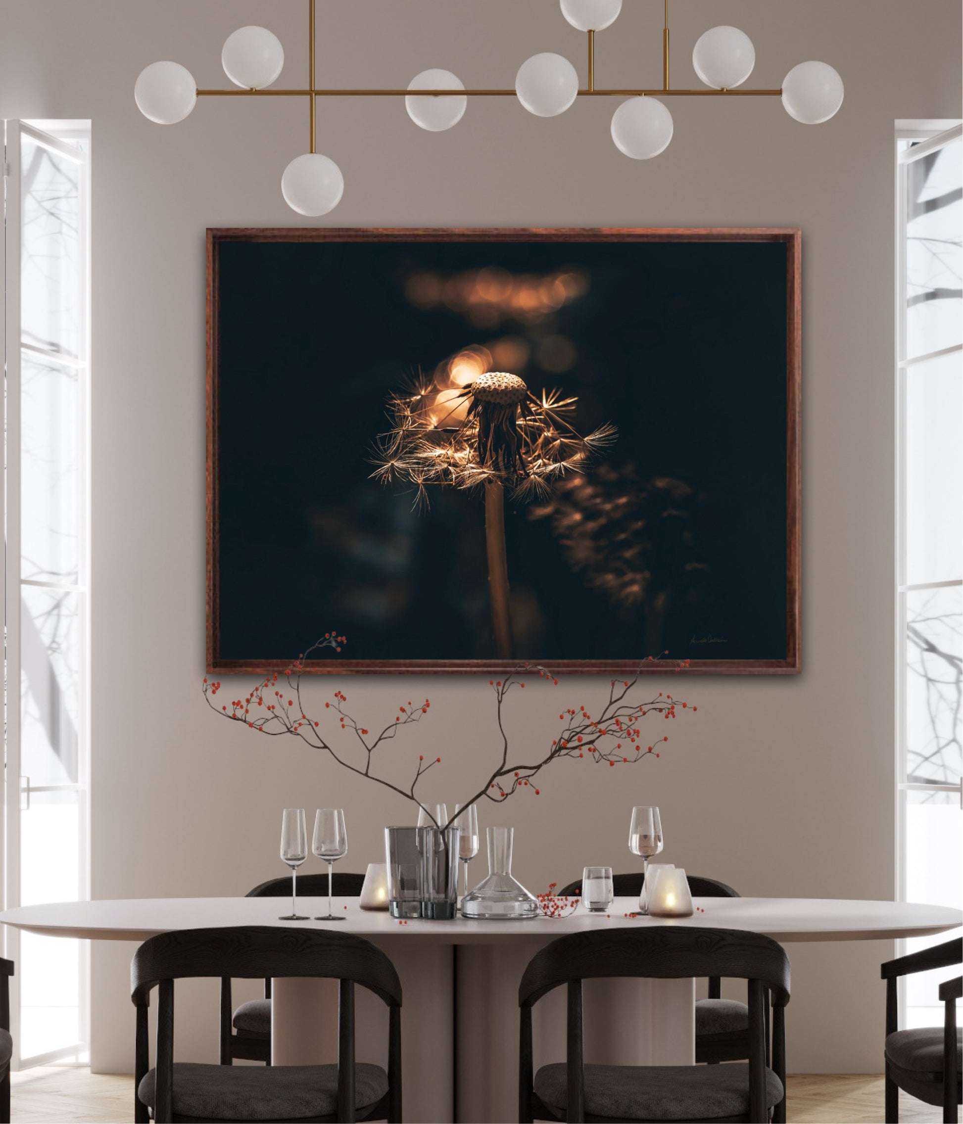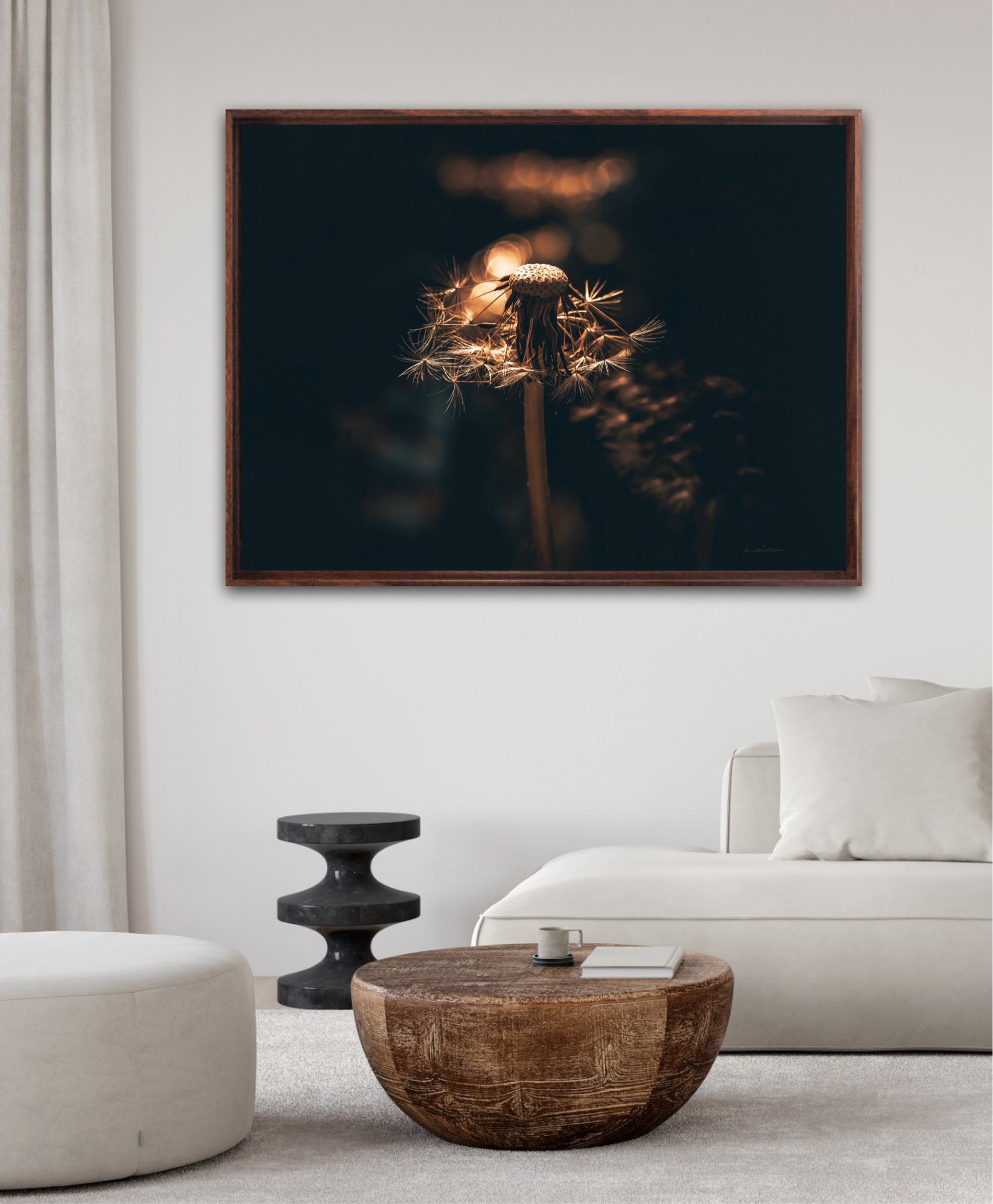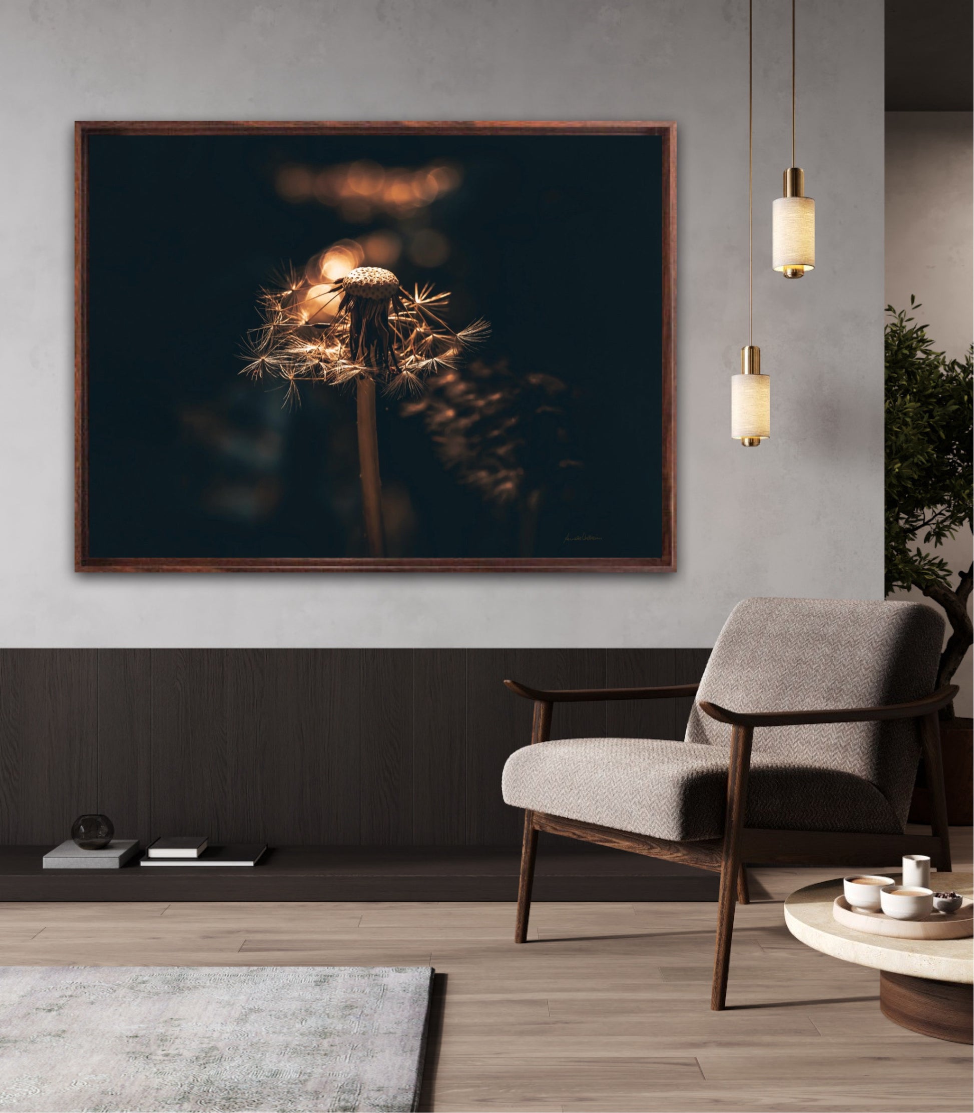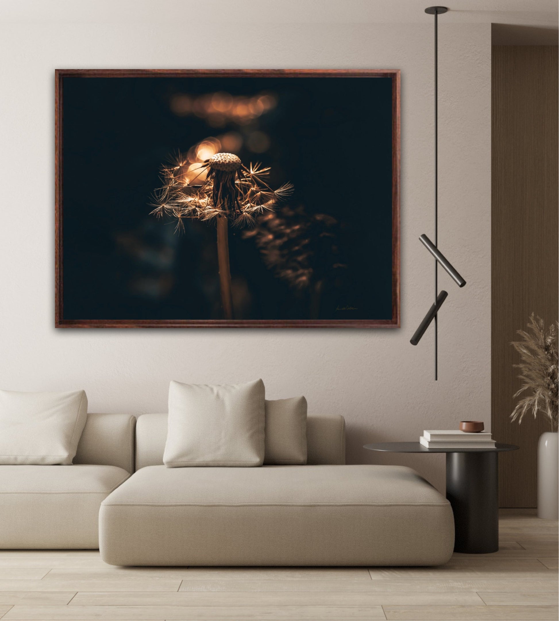 Beautiful photographic wall art of a withered dandelion in warm, golden tones, trails from reflections in the water in the background. This wall art is like a warm hug and gives your home a really cosy vibe.