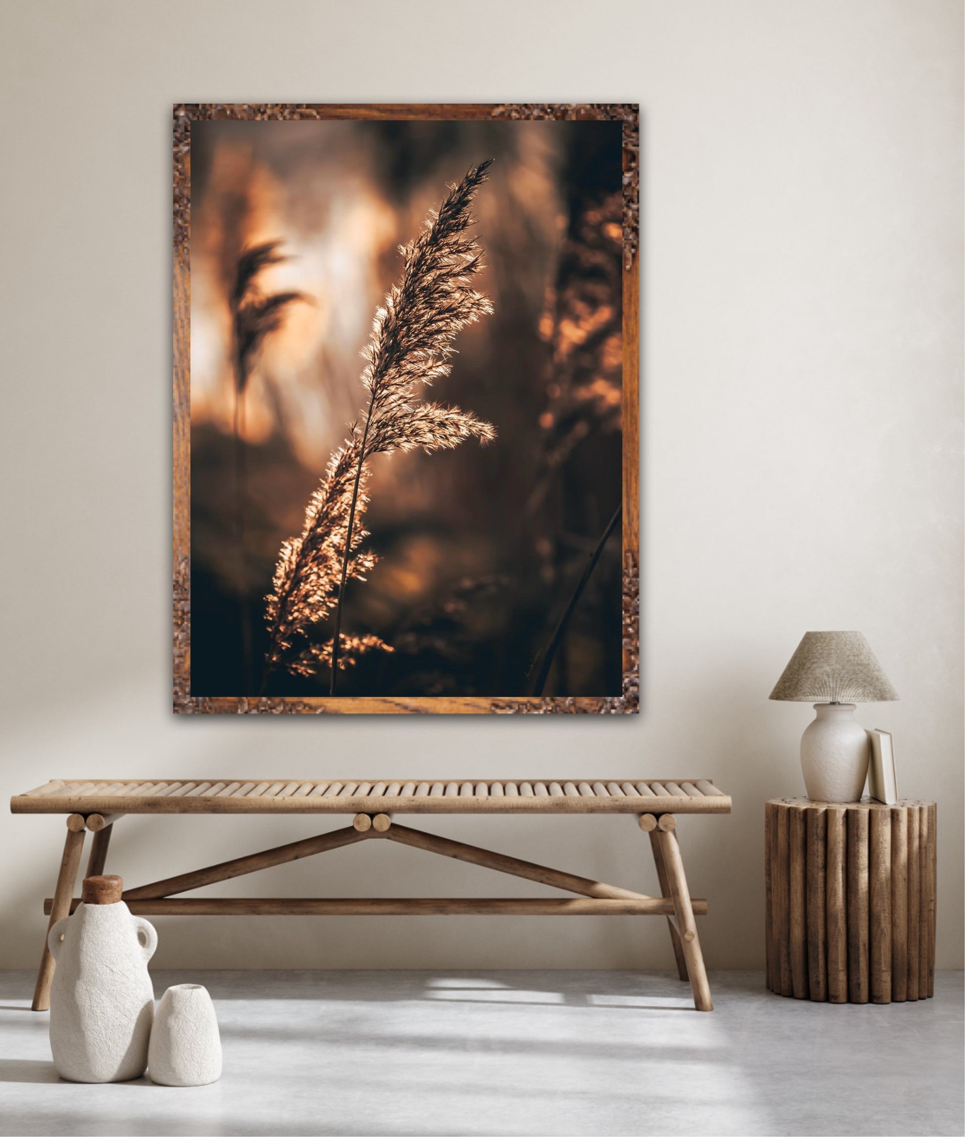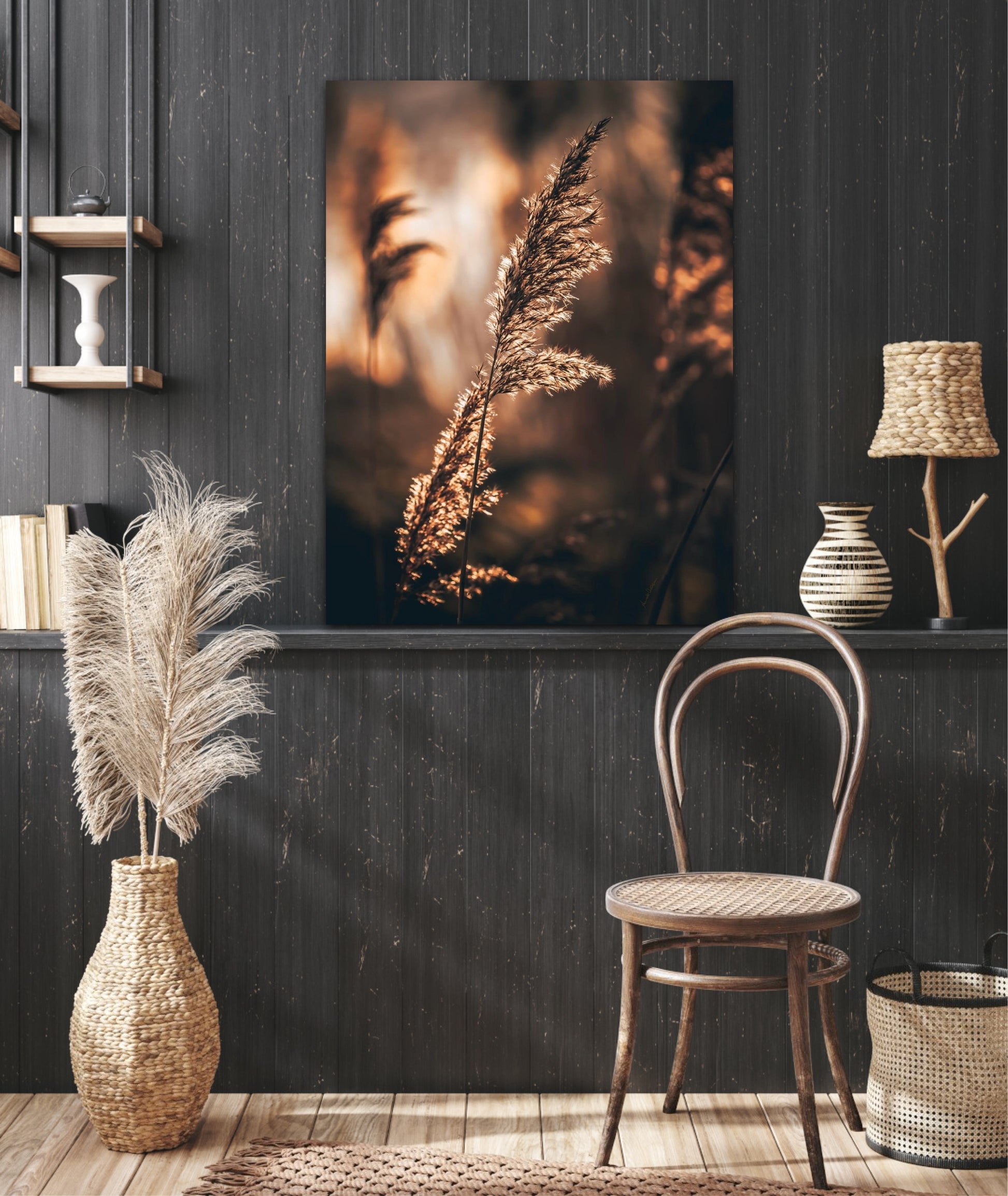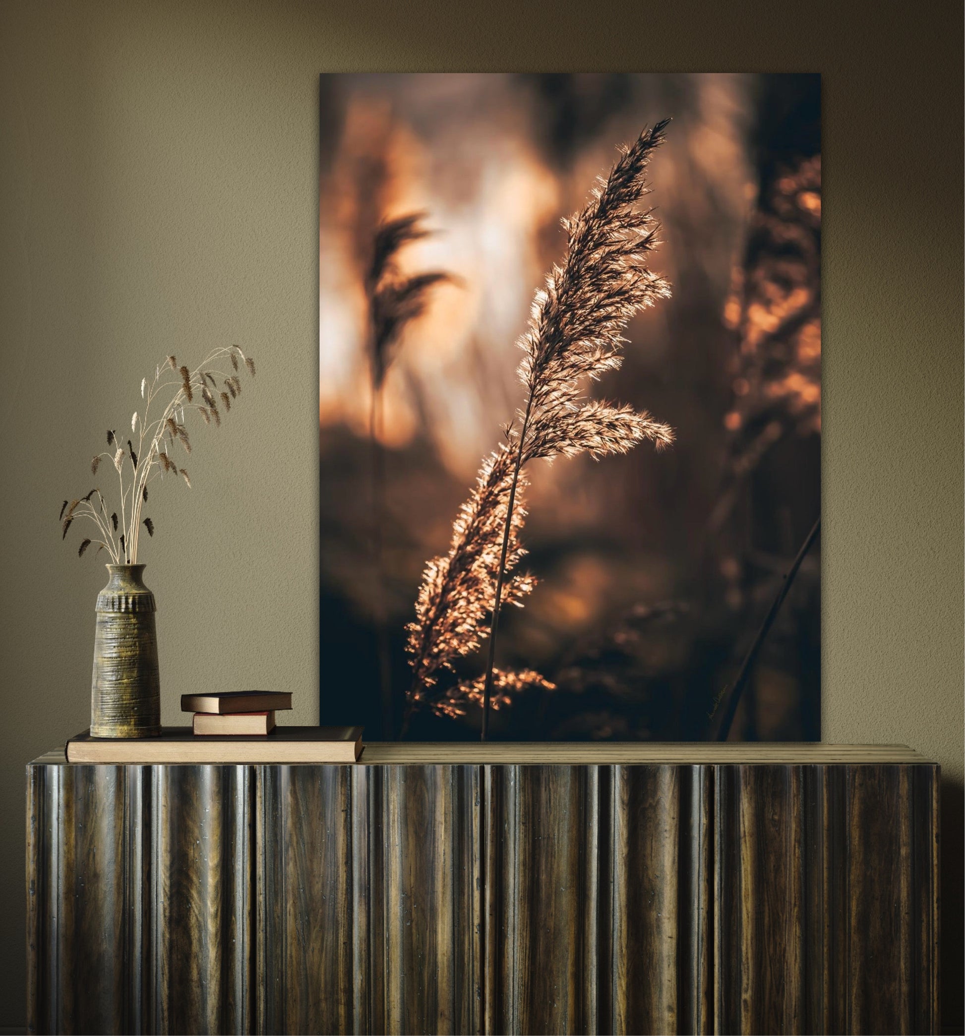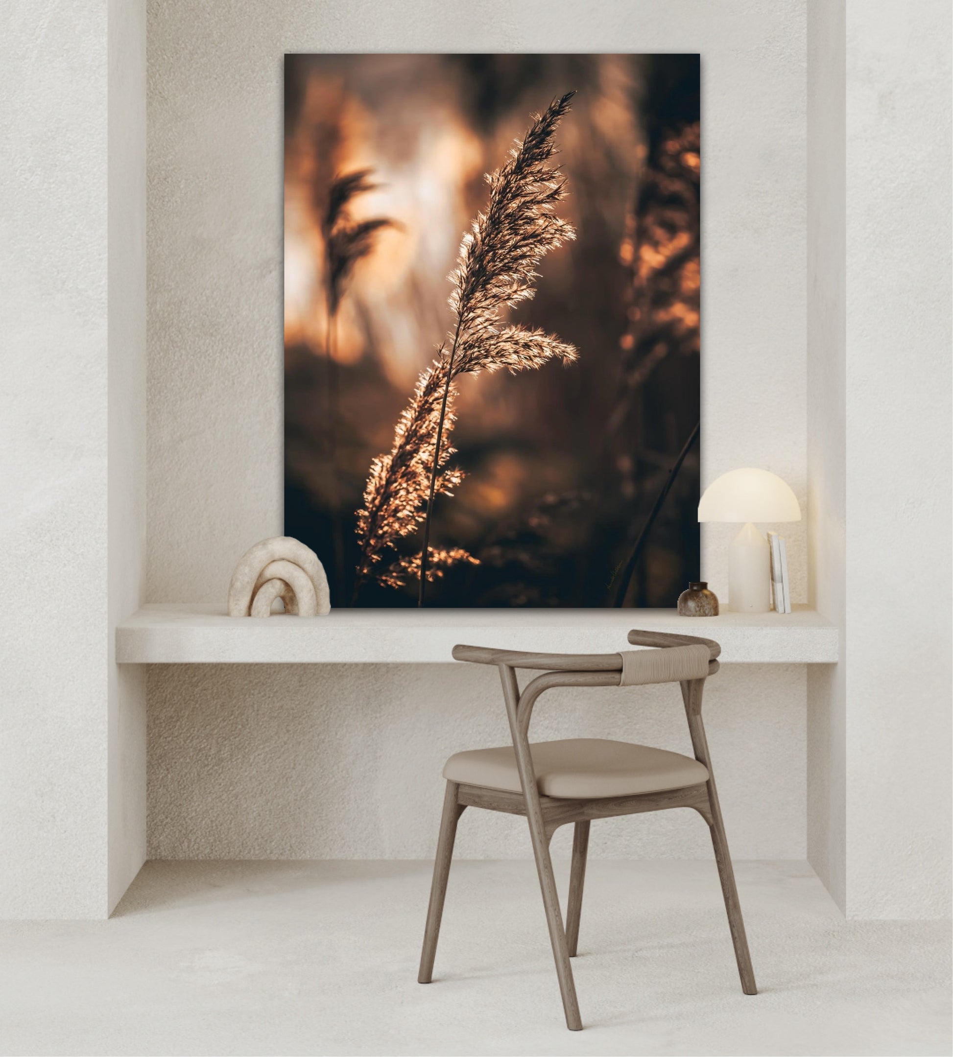 Beautiful photographic wall art of a straw at the waterfront during sunset. Magical, wonderful colours and light will bring great atmosphere to your home.