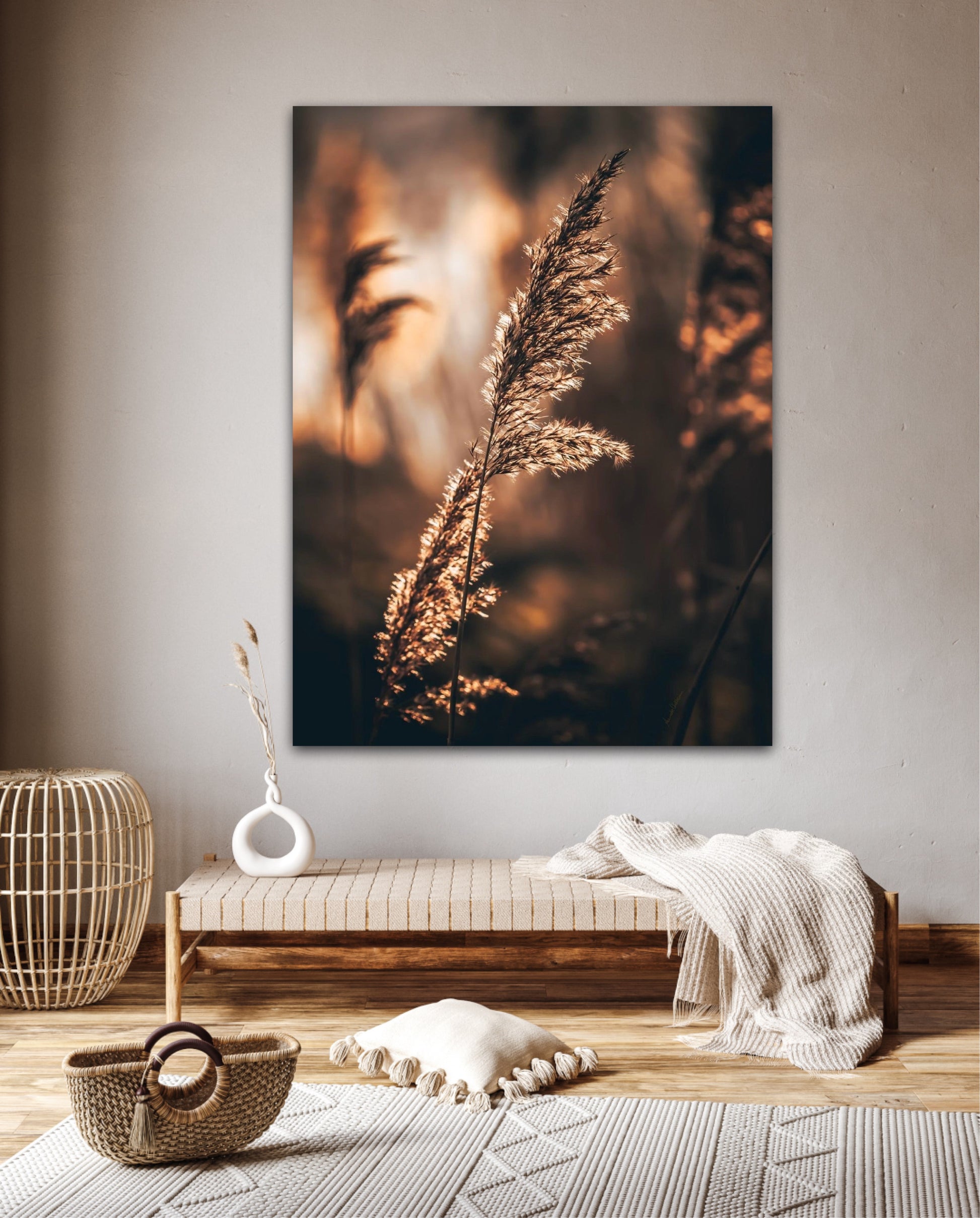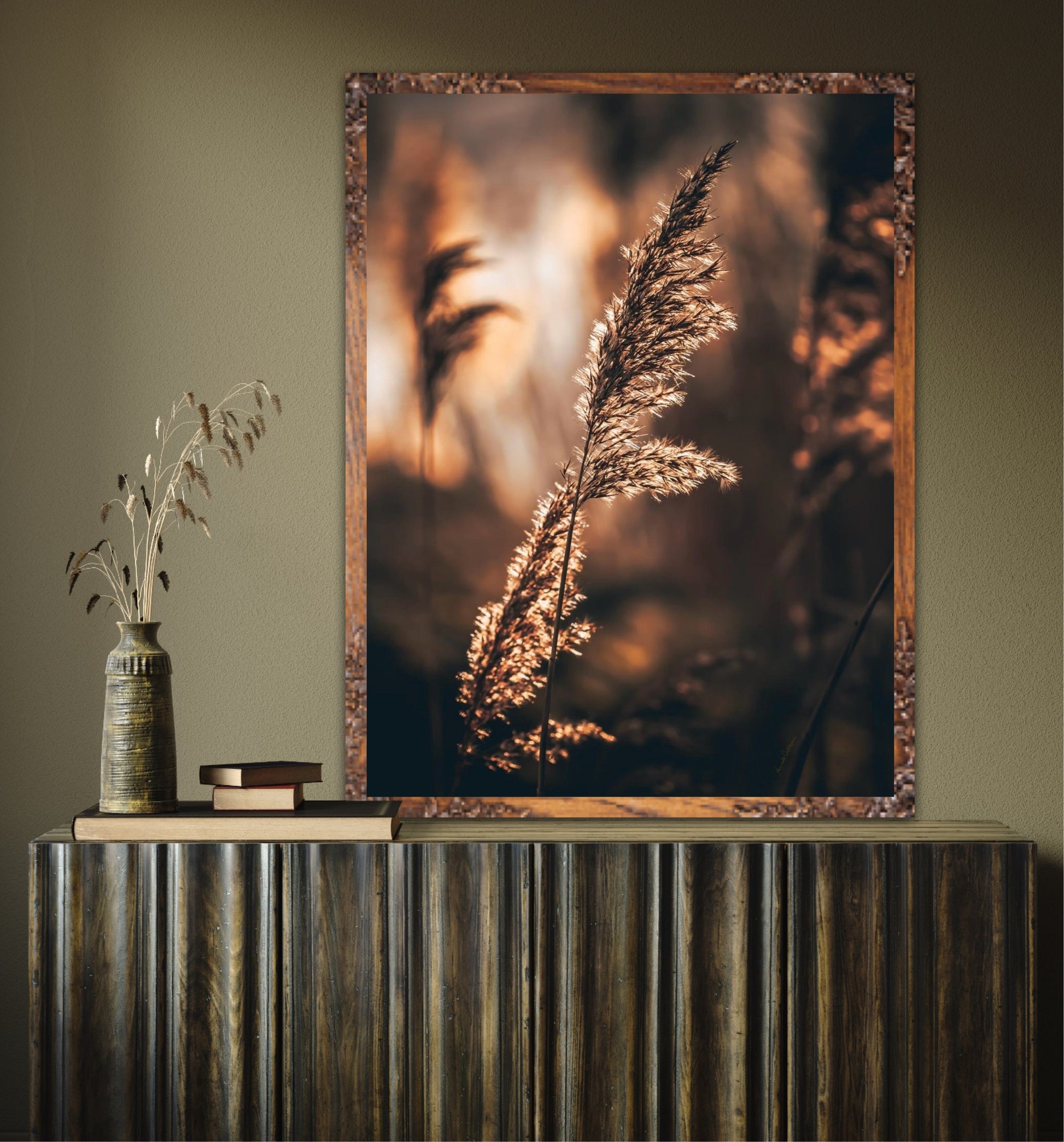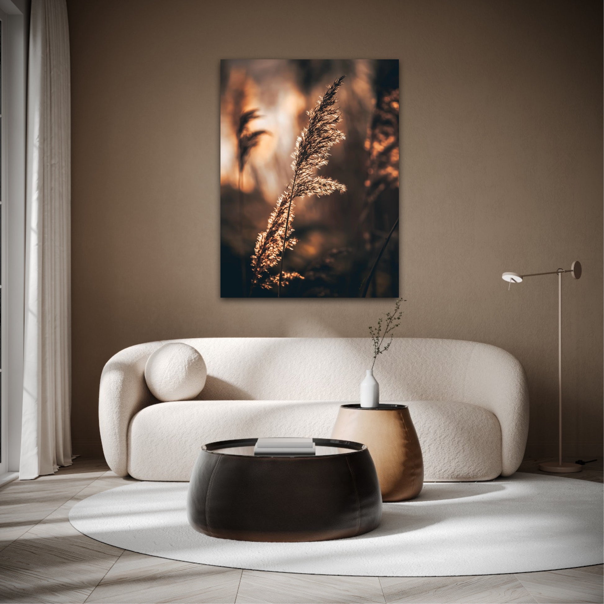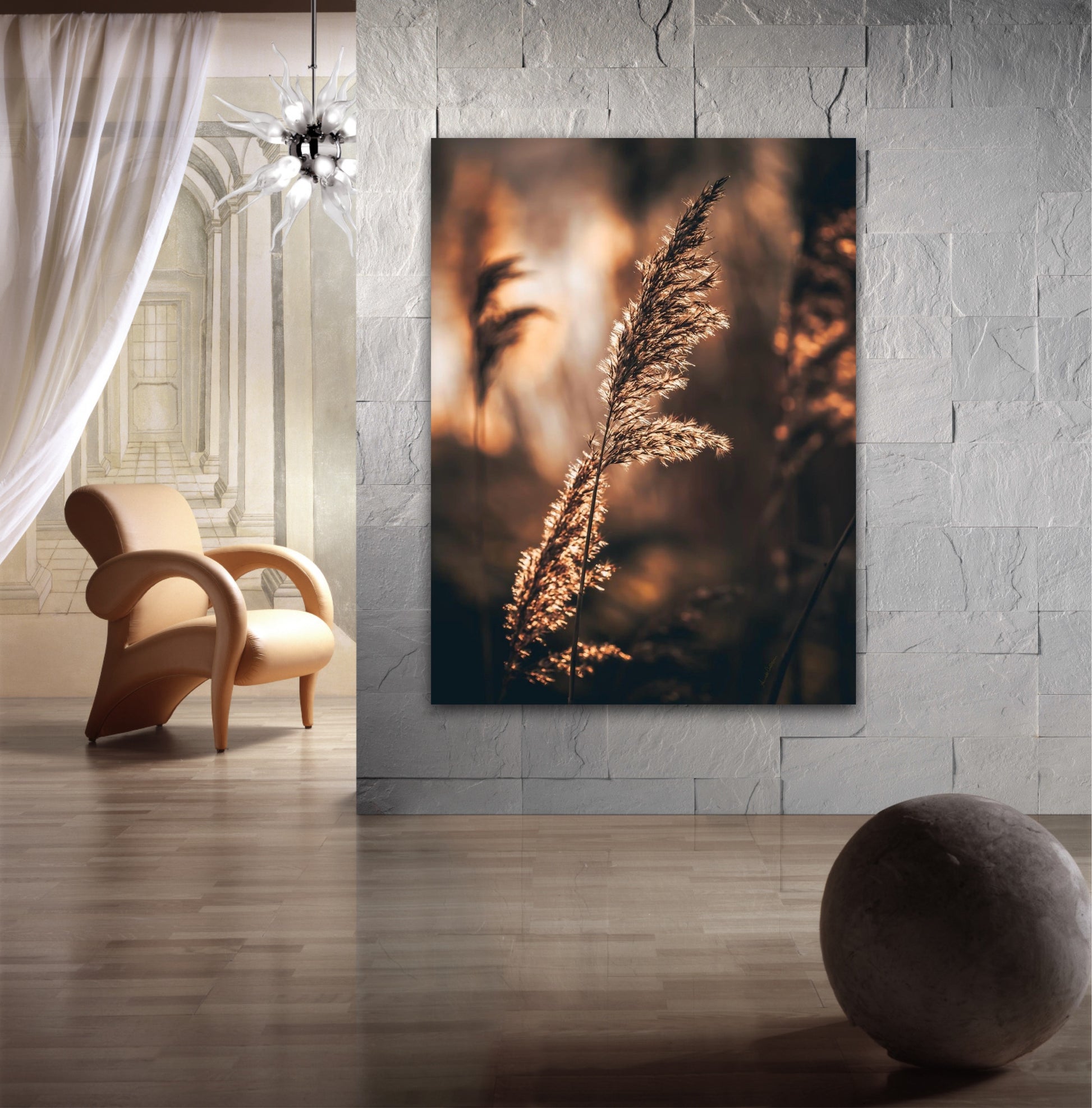 Beautiful photographic wall art of a straw at the waterfront during sunset. Magical, wonderful colours and light will bring great atmosphere to your home.