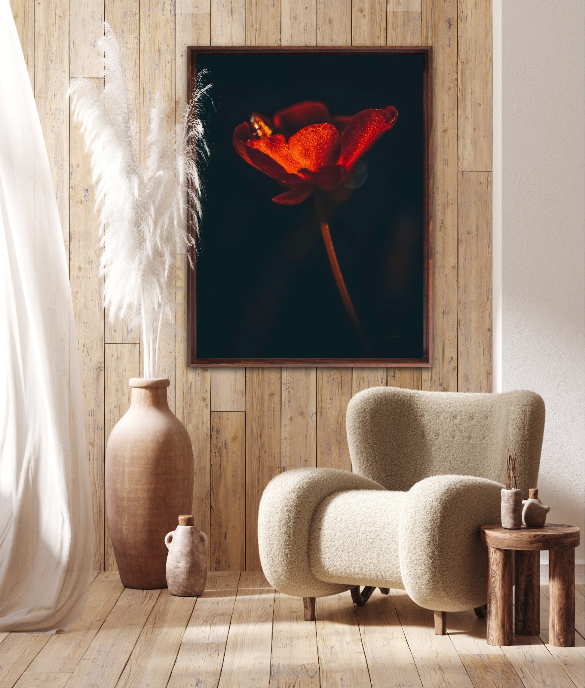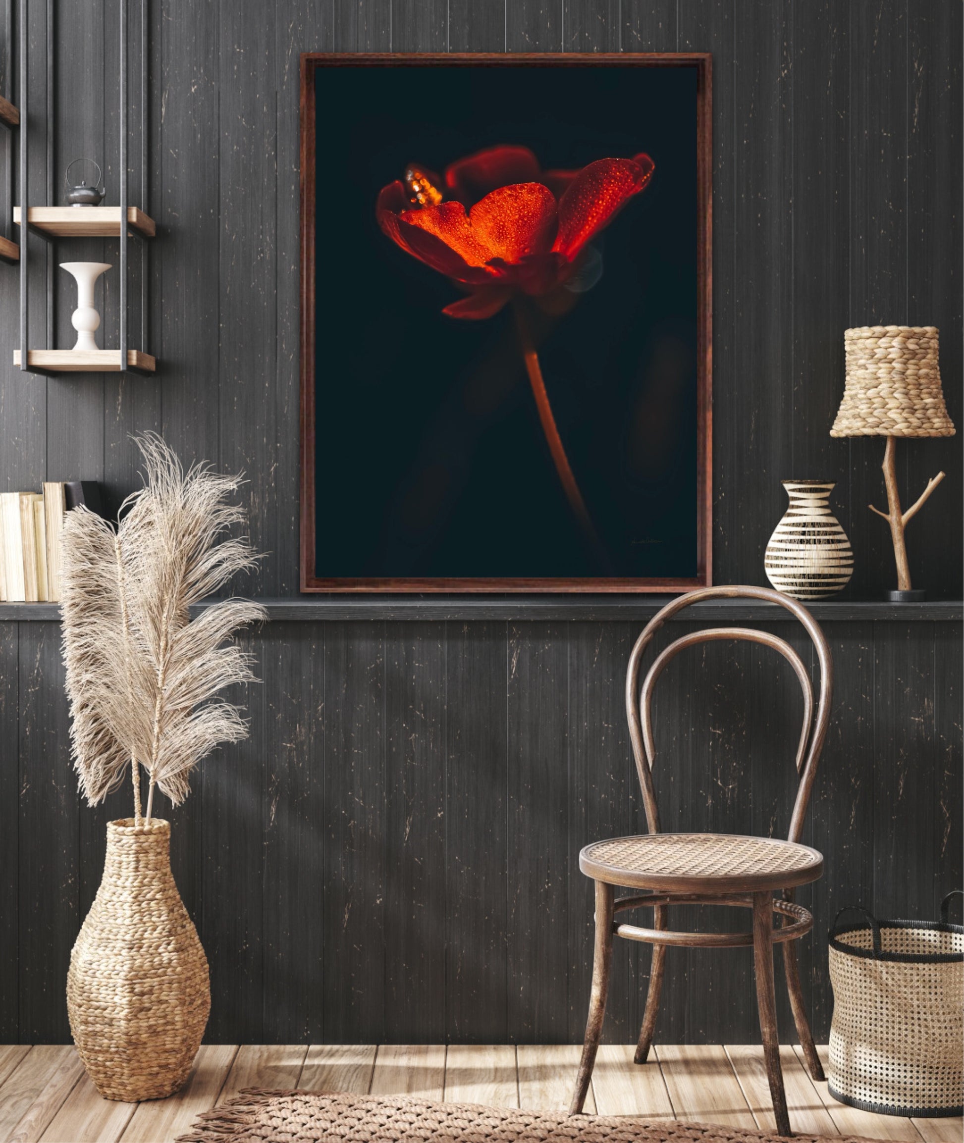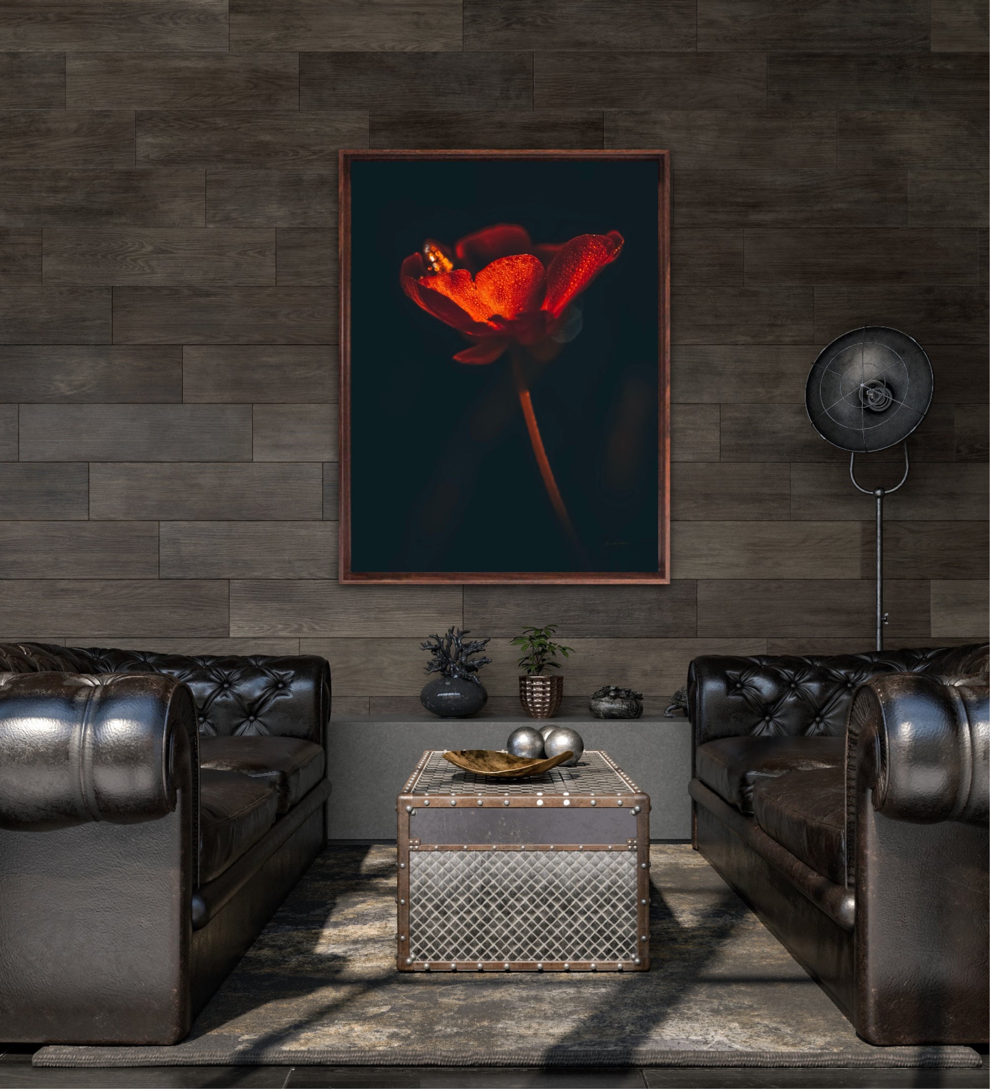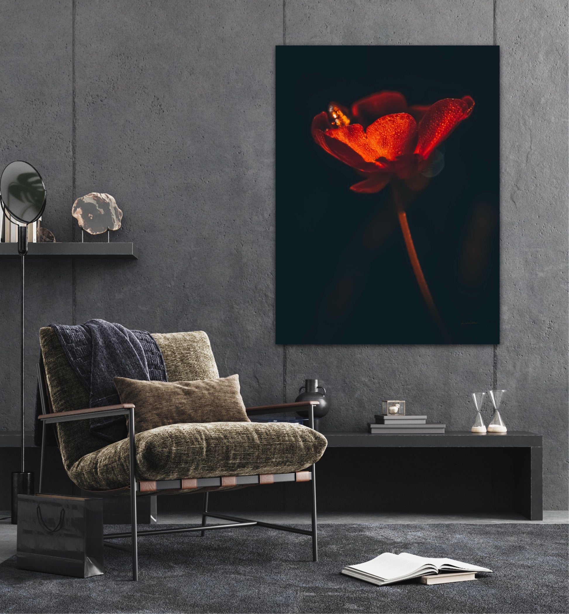 Beautiful photographic wall art of a flower in deep red tones on a black background.