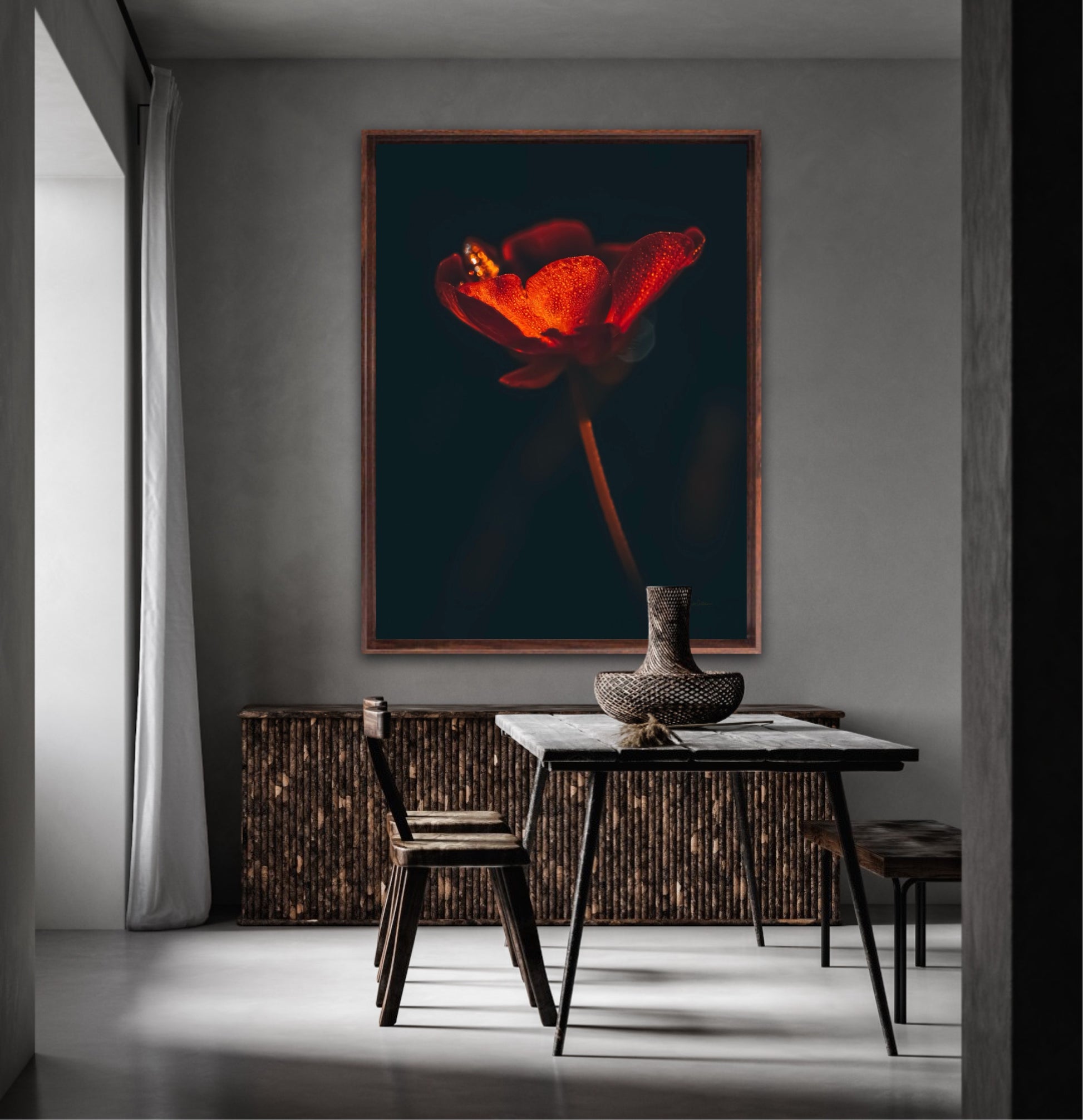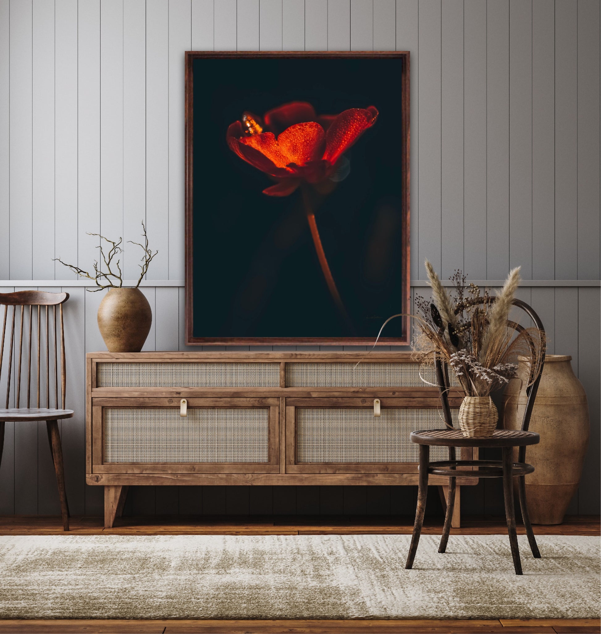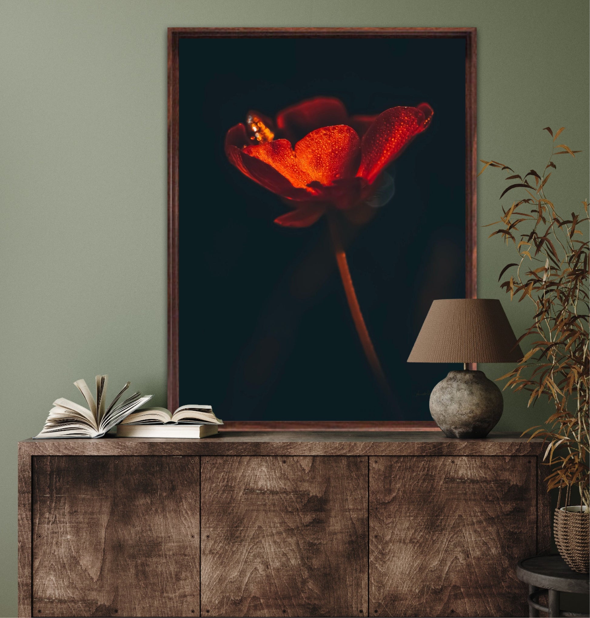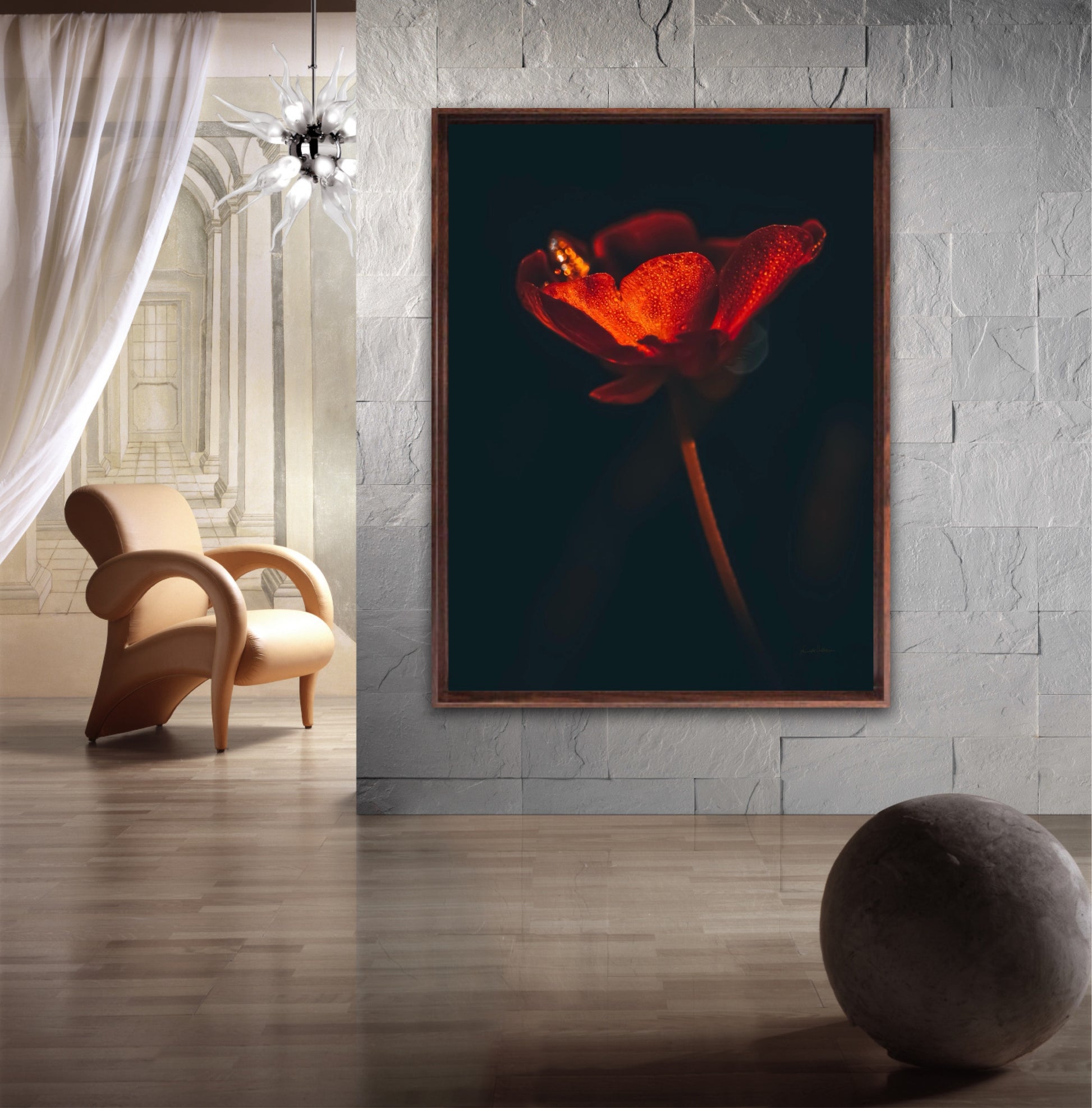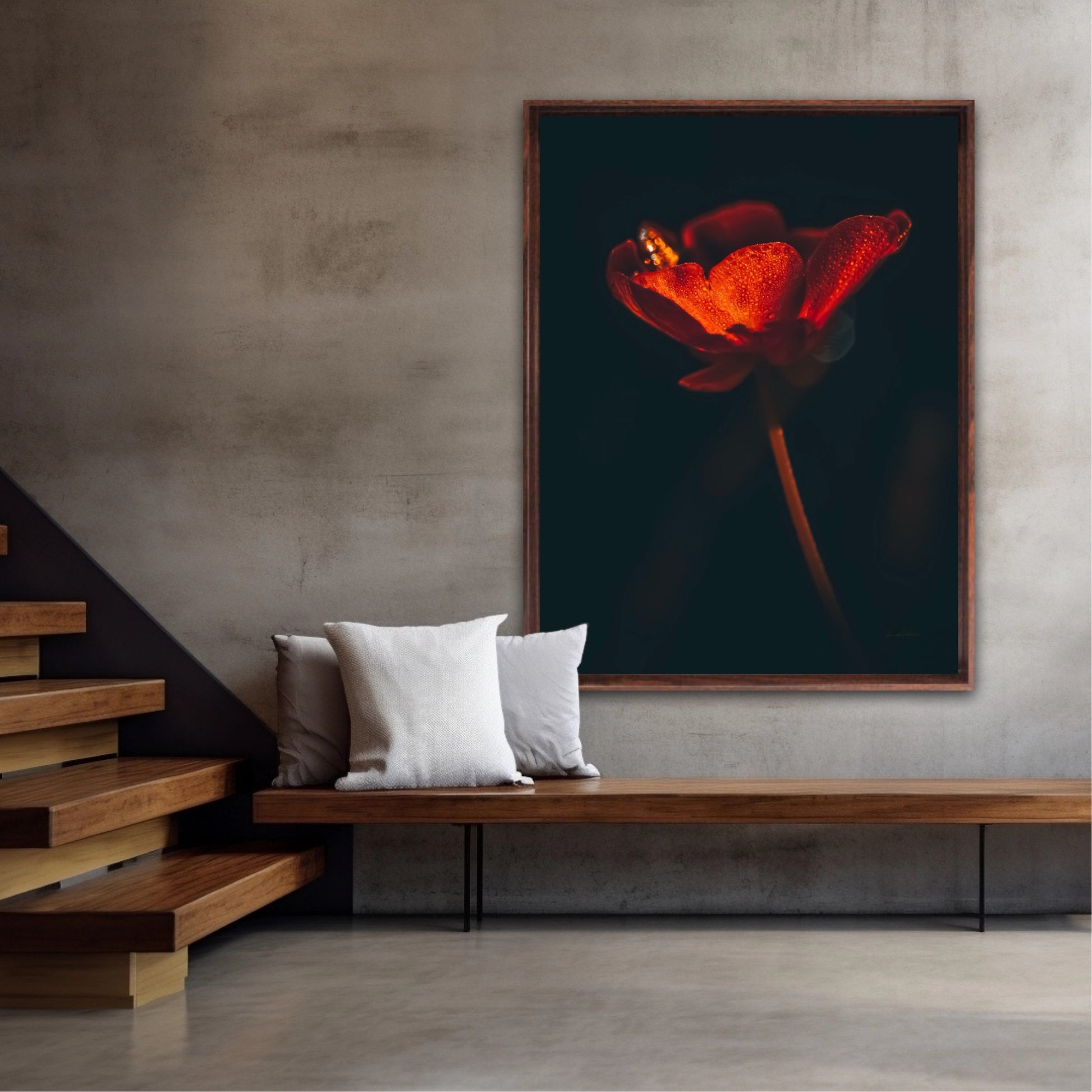 Beautiful photographic wall art of a flower in deep red tones on a black background.