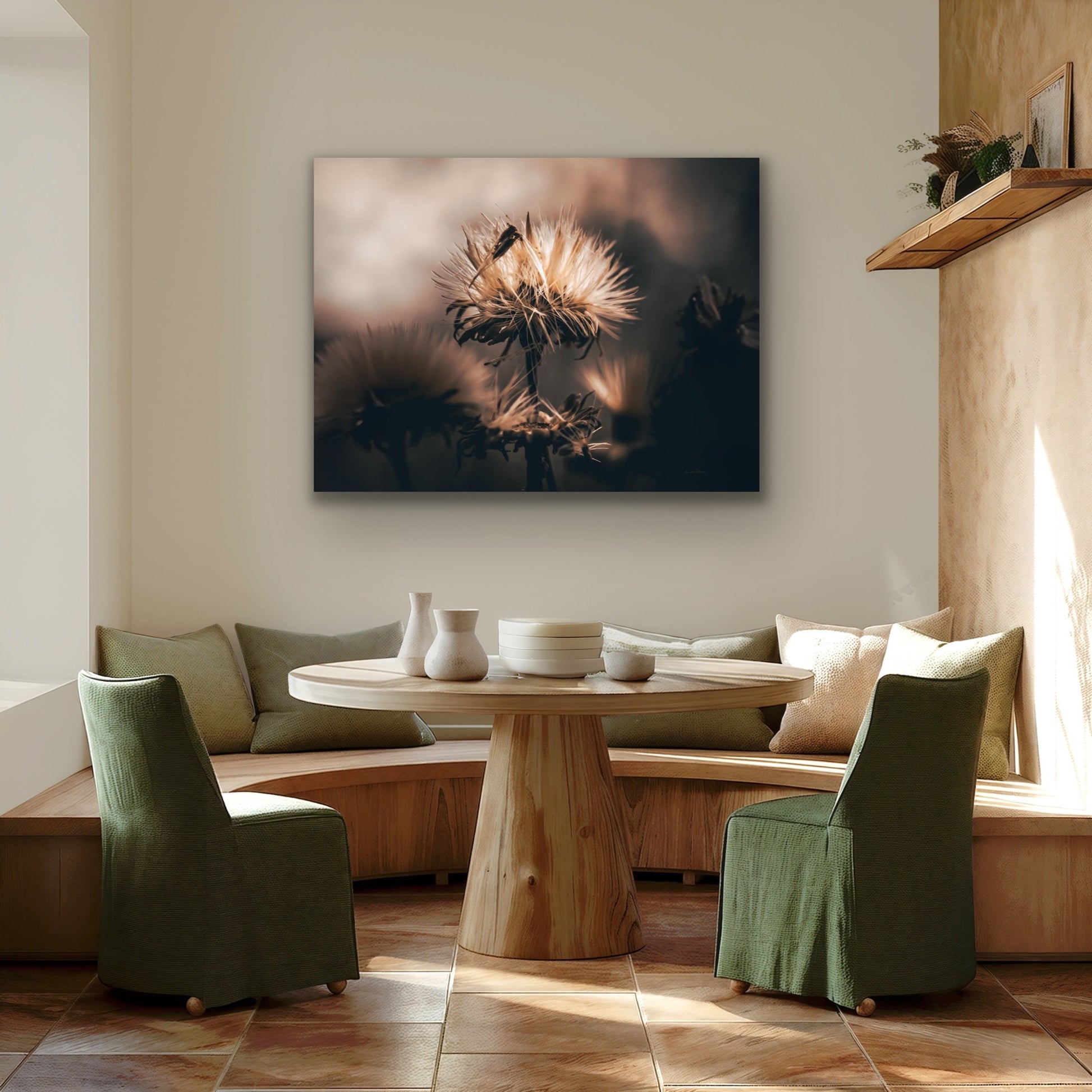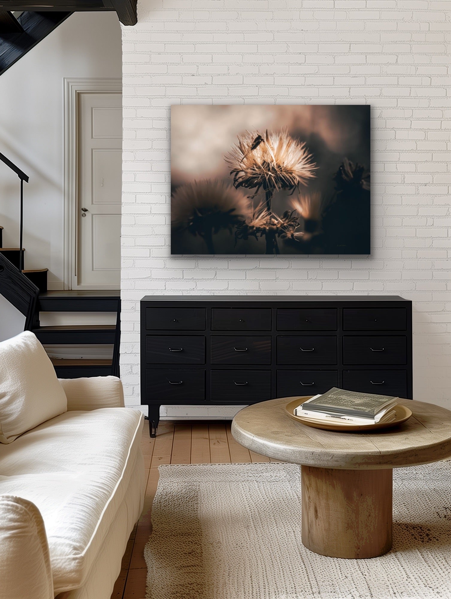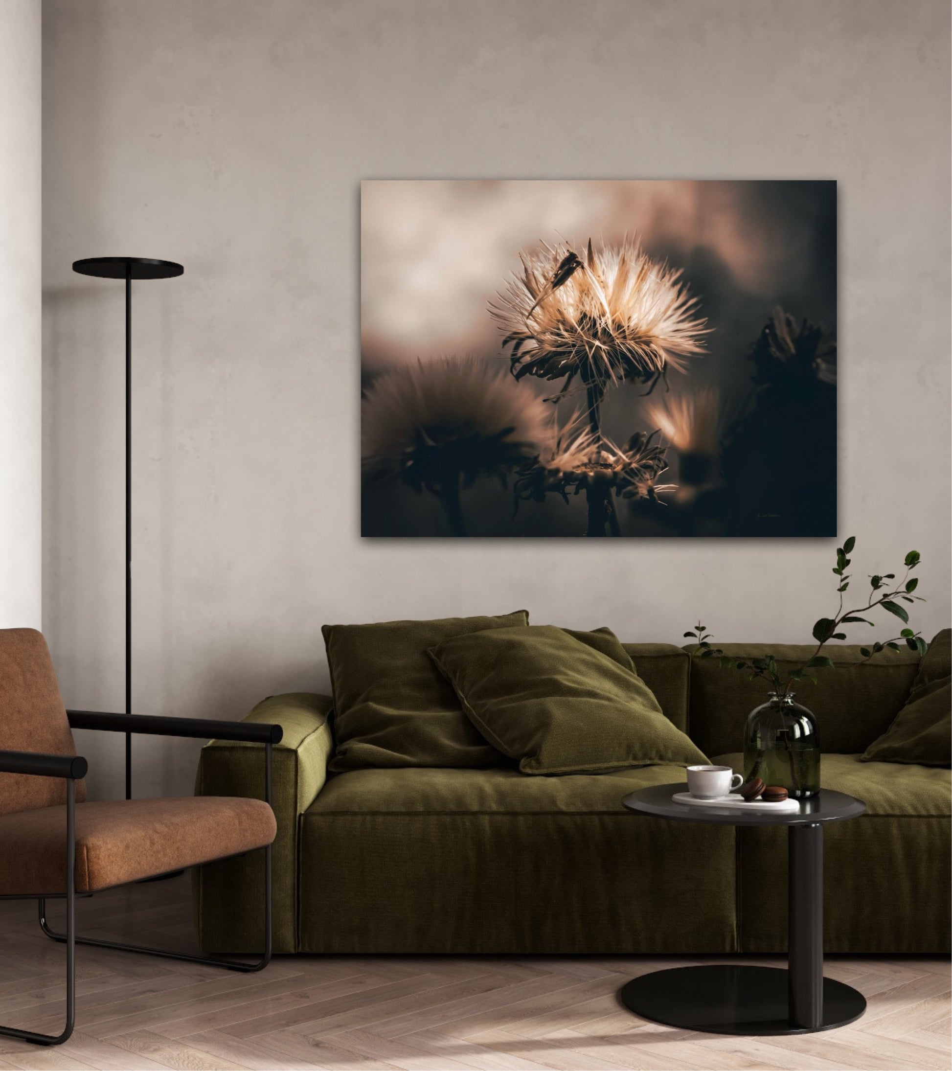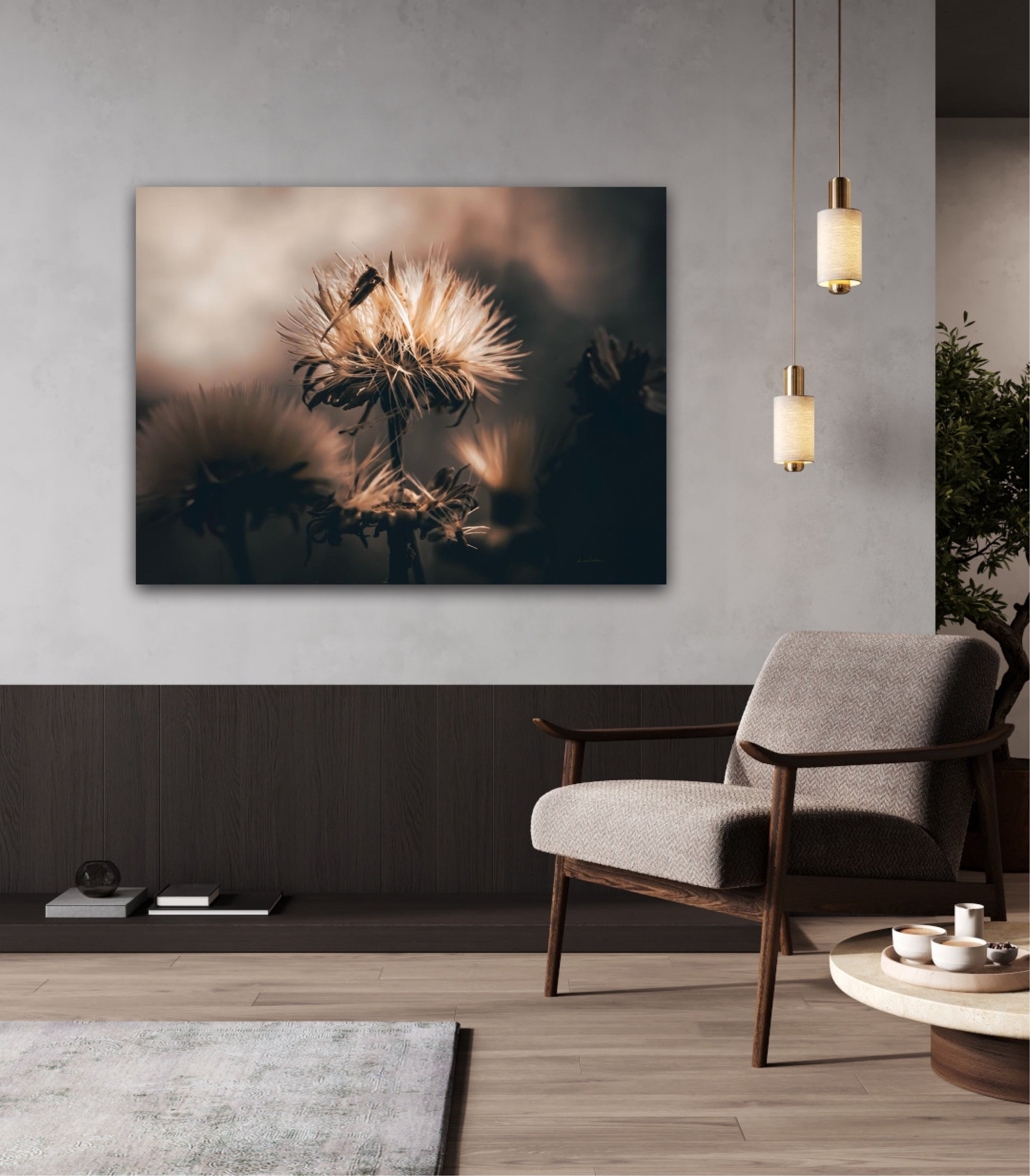Beautiful photographic wall art of a dandelion in muted dark beige brown and black color. The background is dramatic with beautiful light effects.