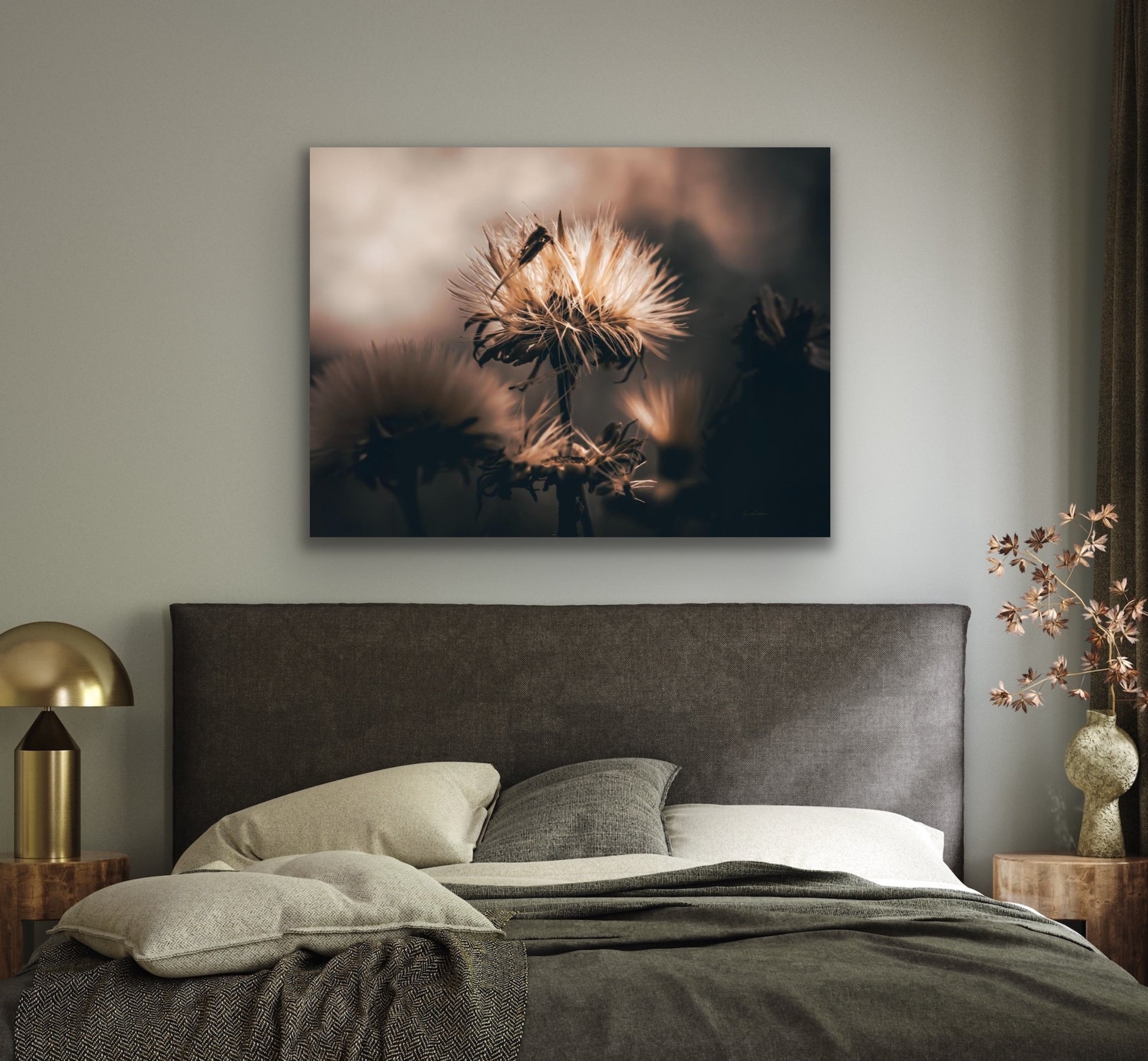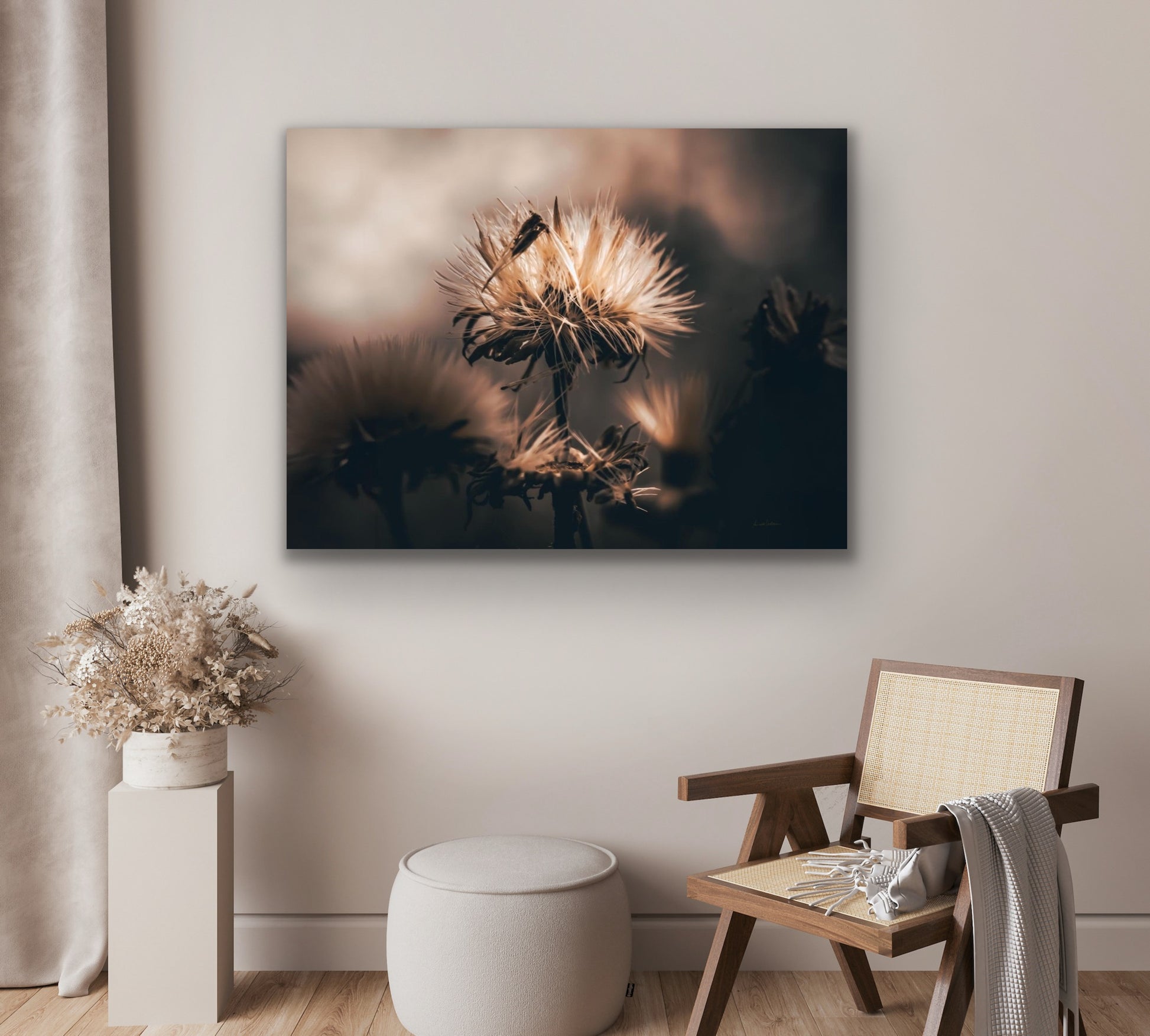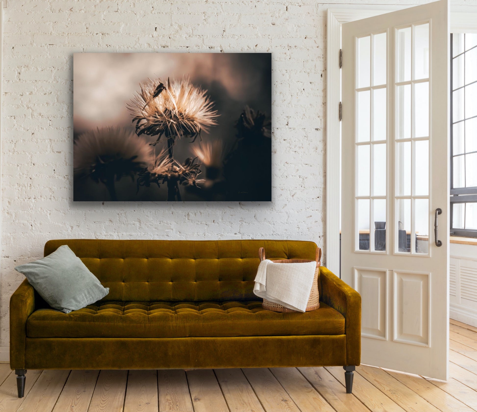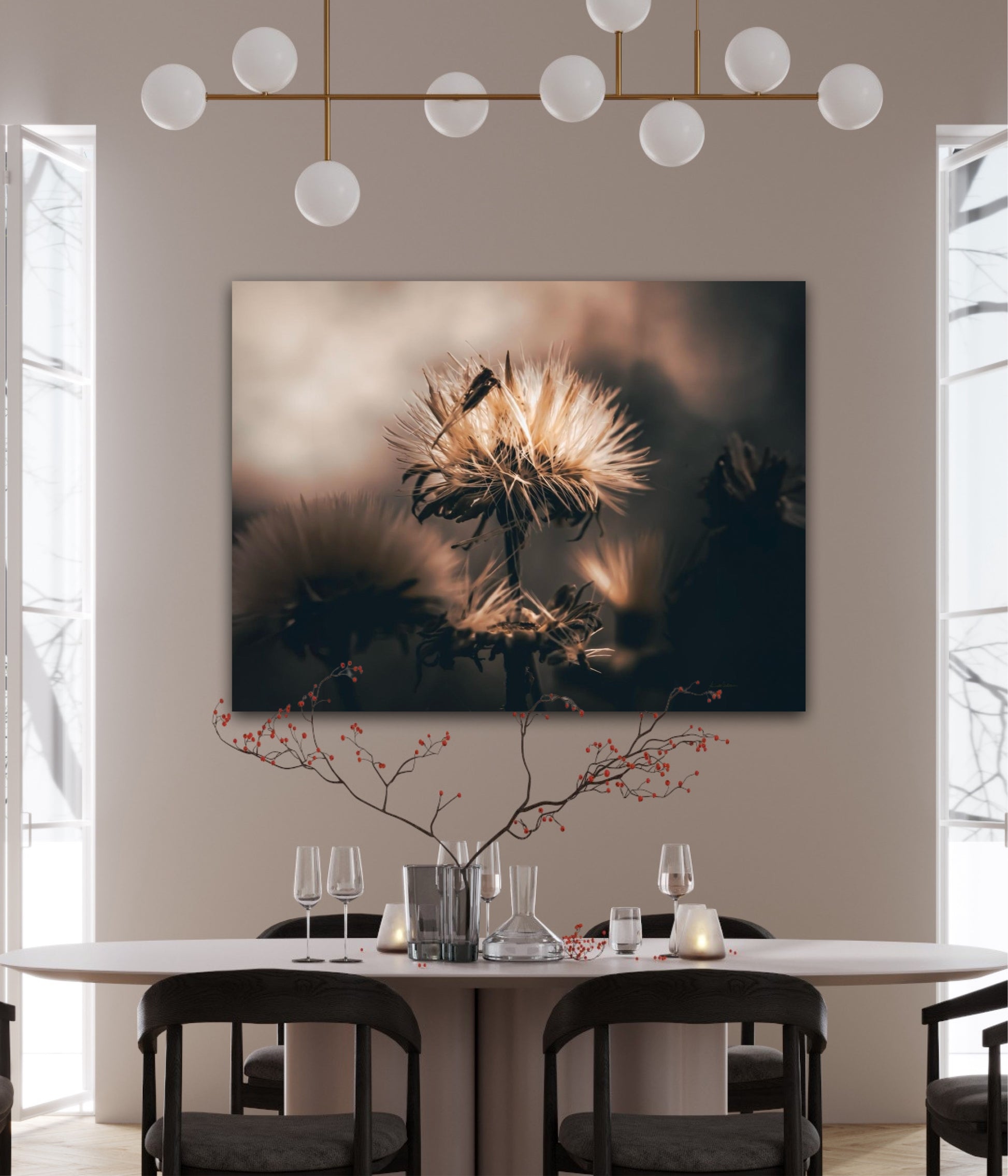 Beautiful photographic wall art of a dandelion in muted dark beige brown and black color. The background is dramatic with beautiful light effects.