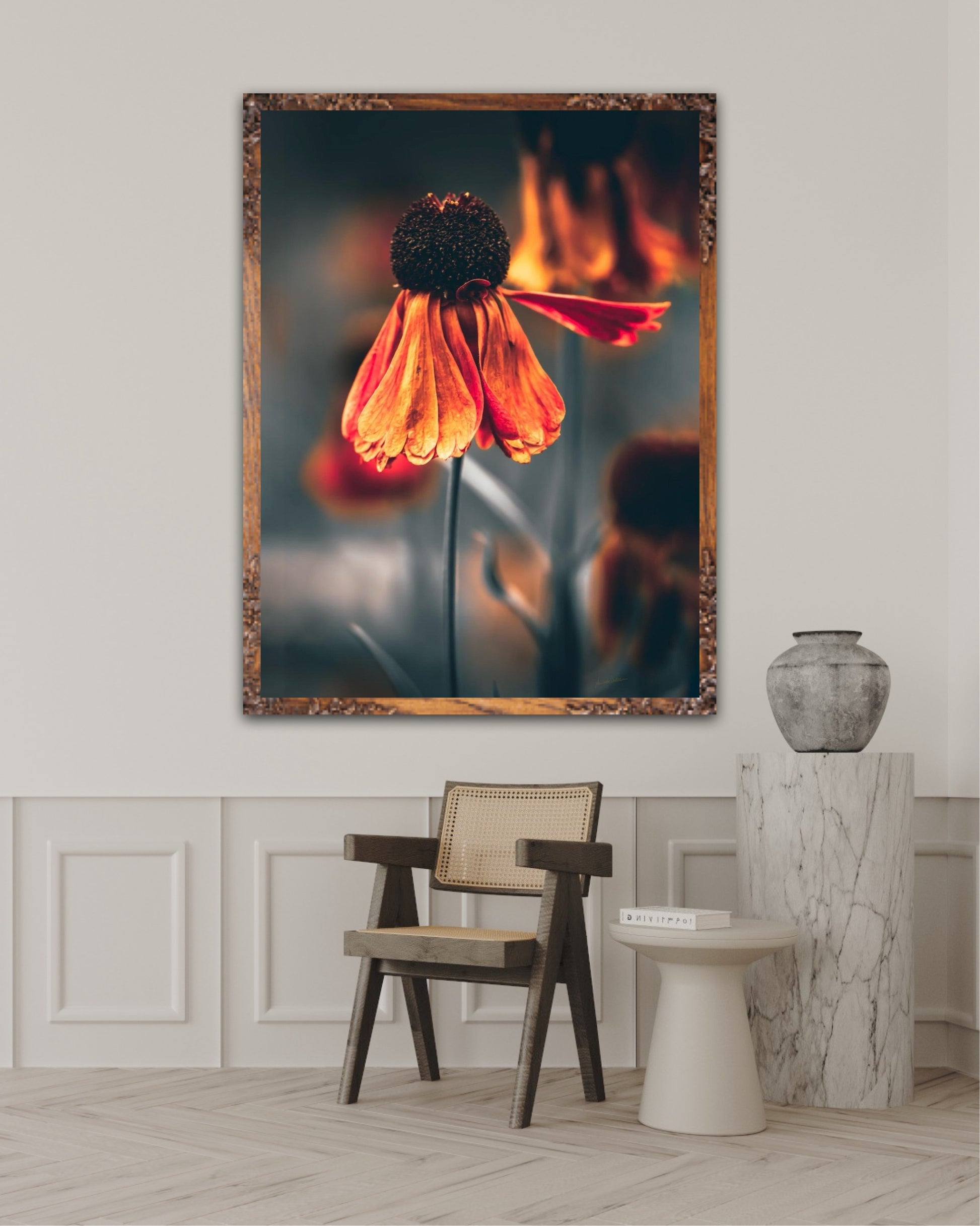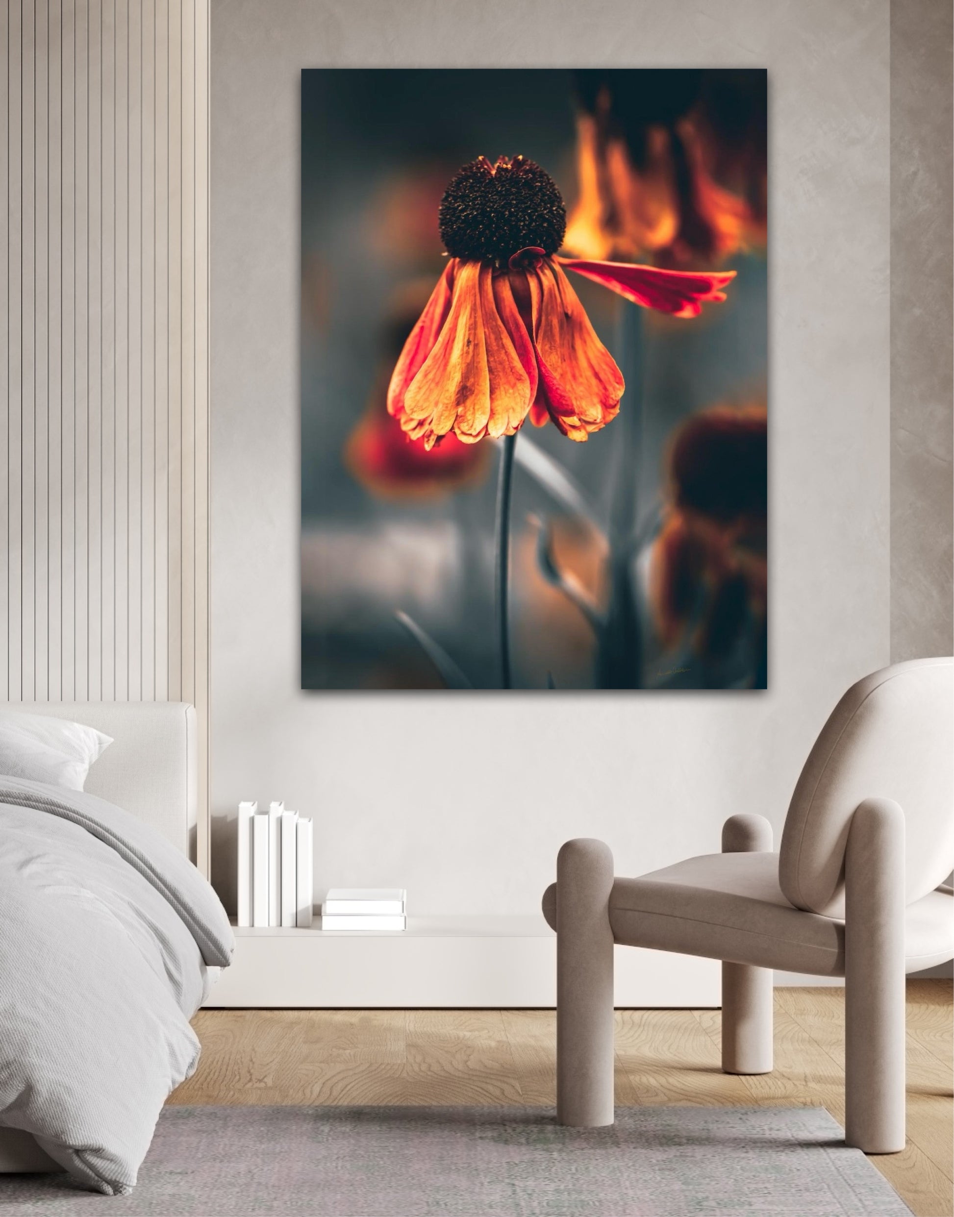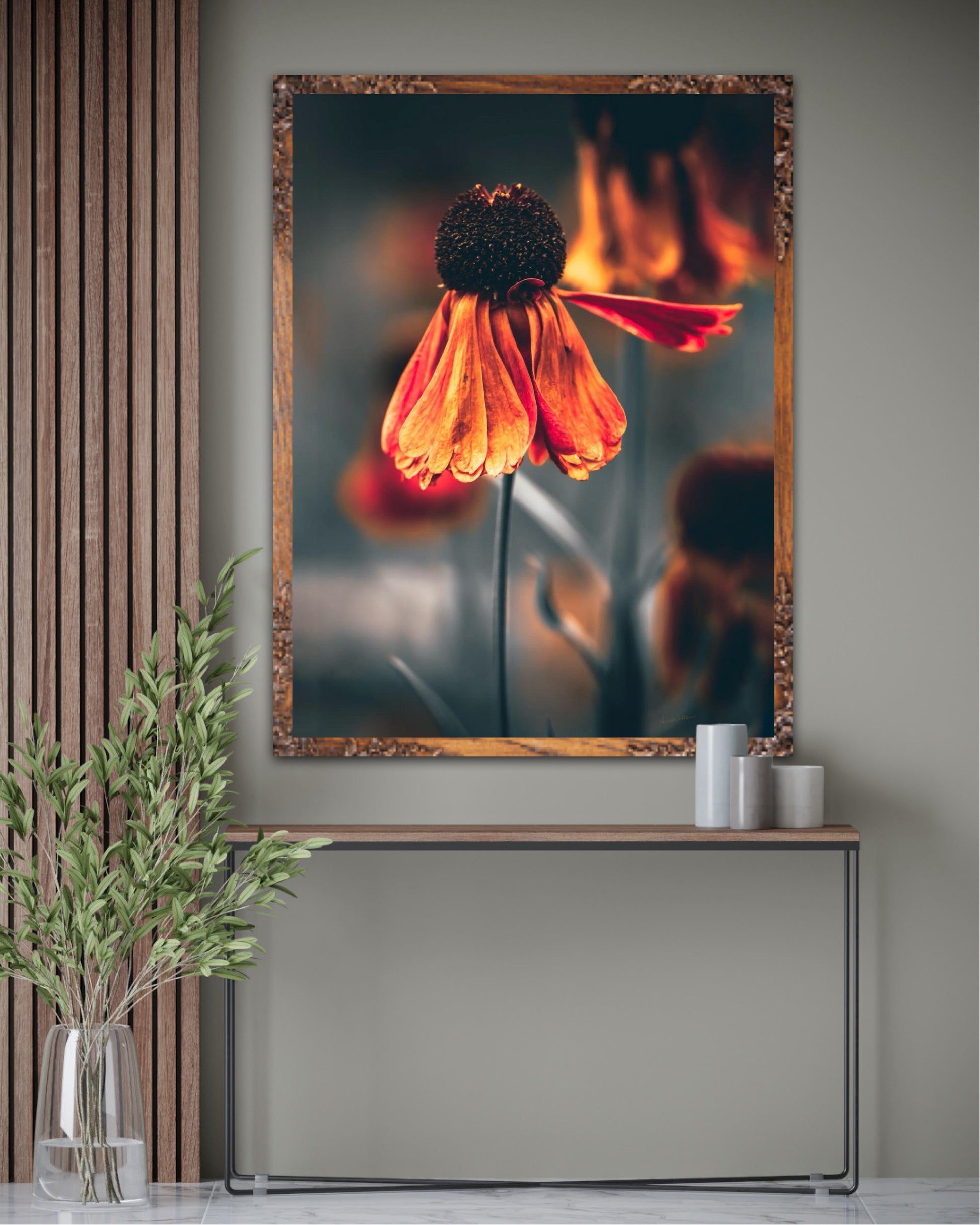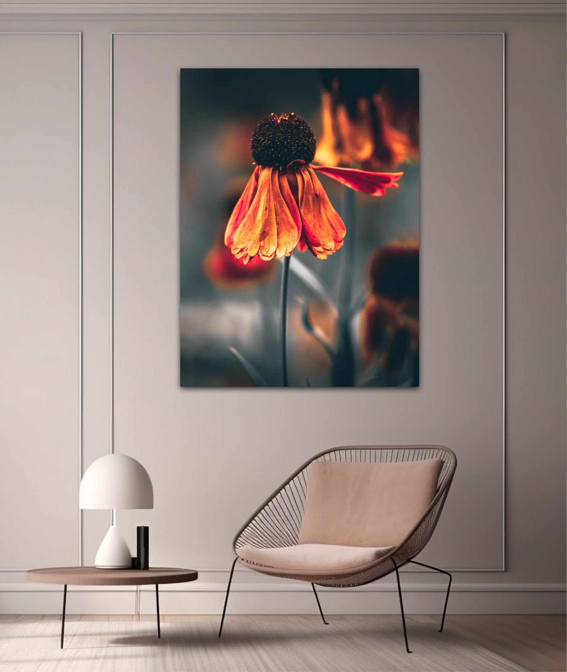 Beautiful photographic wall art of Helenium flower in straight and proud posture, created by the wind blowing. This artwork will bring you energy and a good mood.