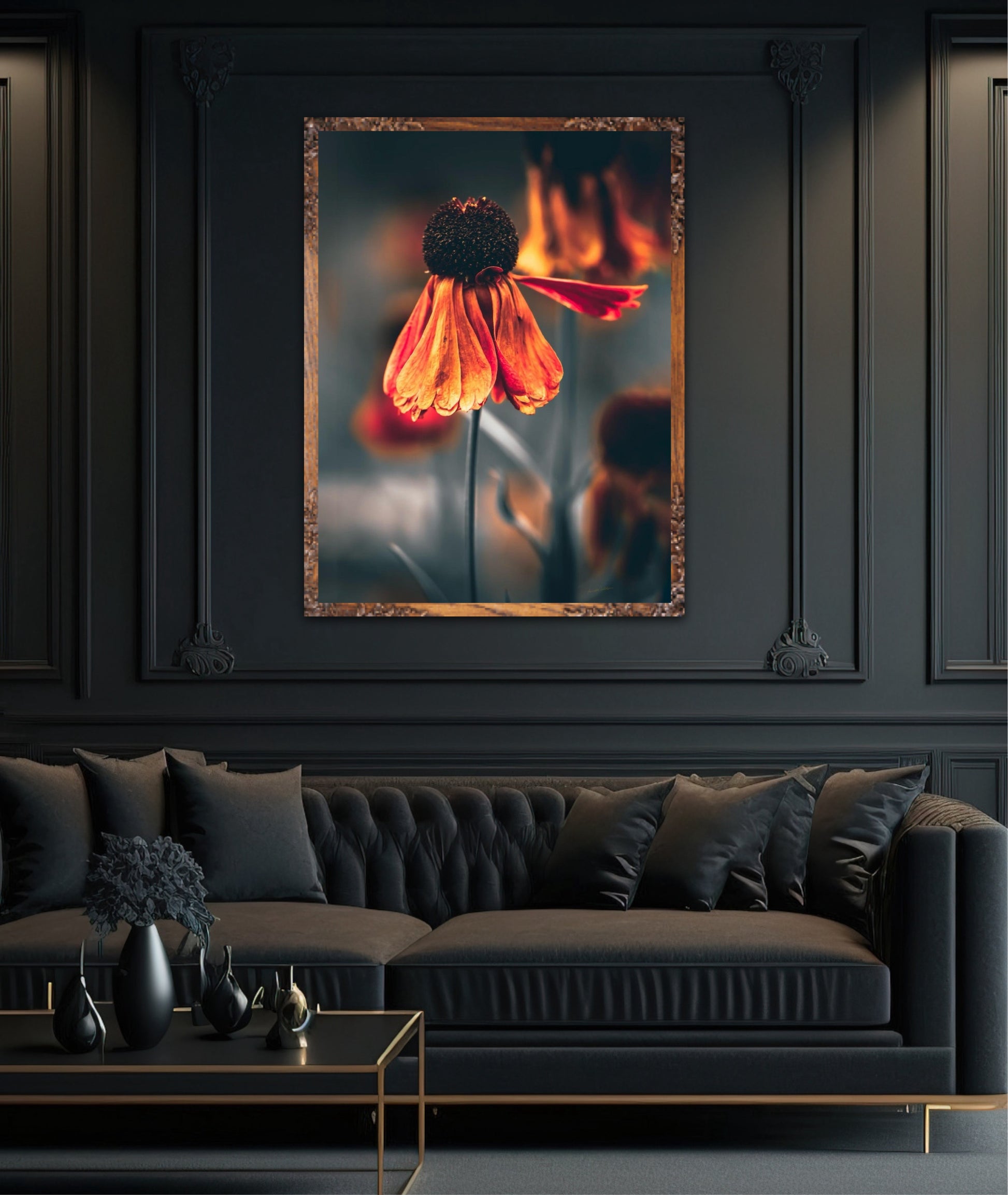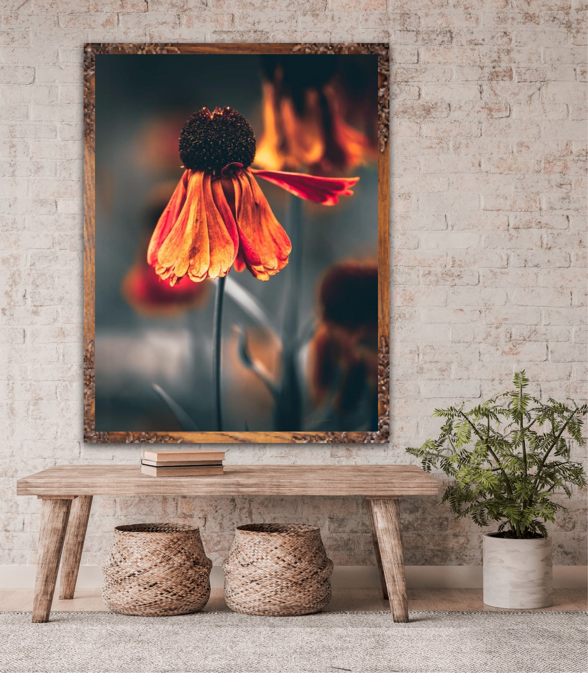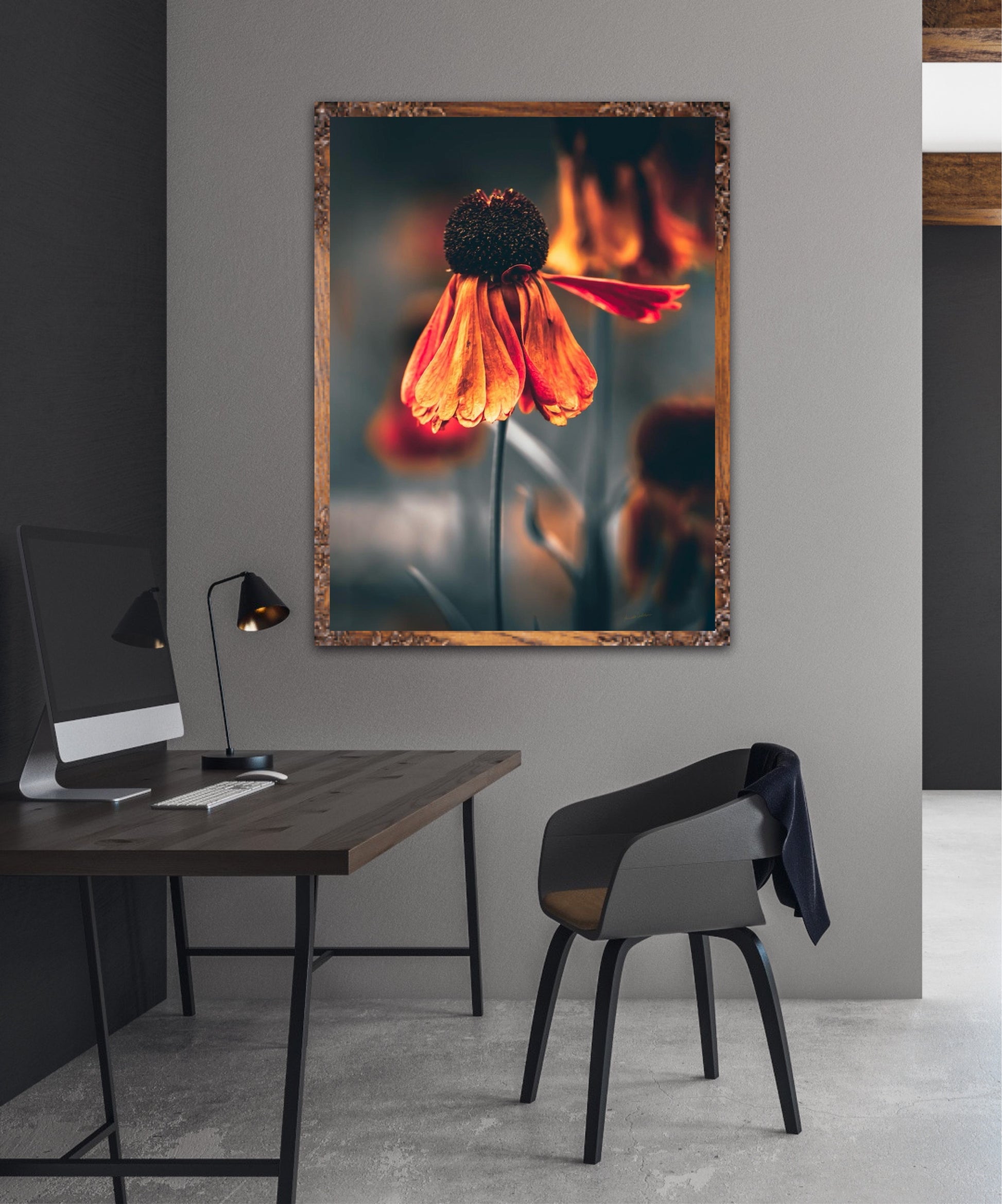Beautiful photographic wall art of Helenium flower in straight and proud posture, created by the wind blowing. This artwork will bring you energy and a good mood.