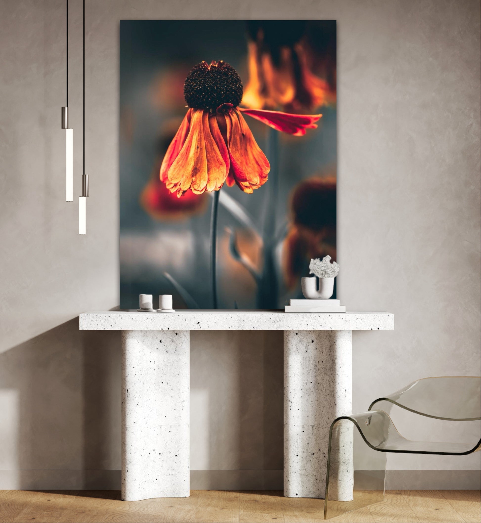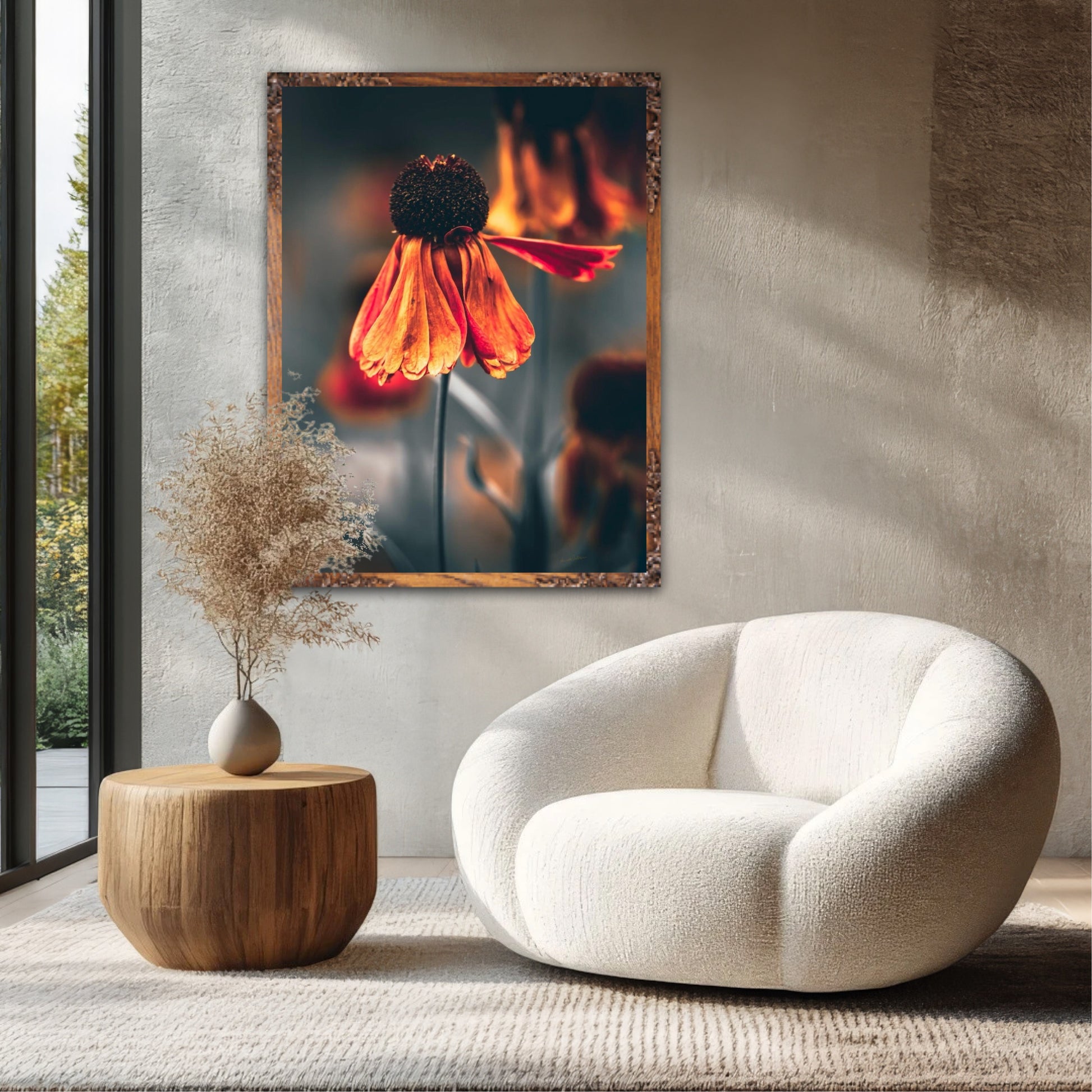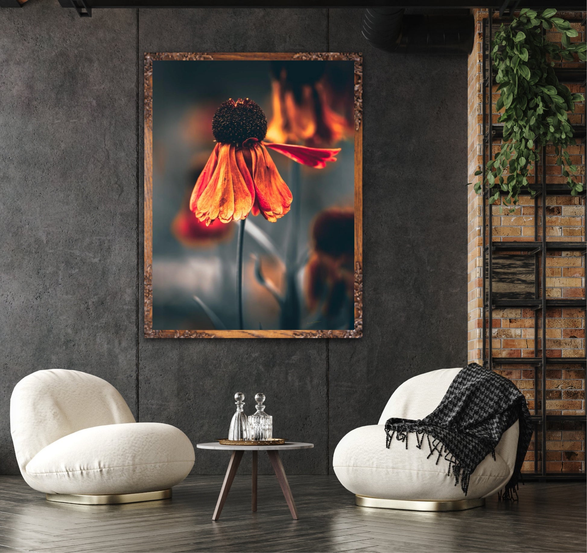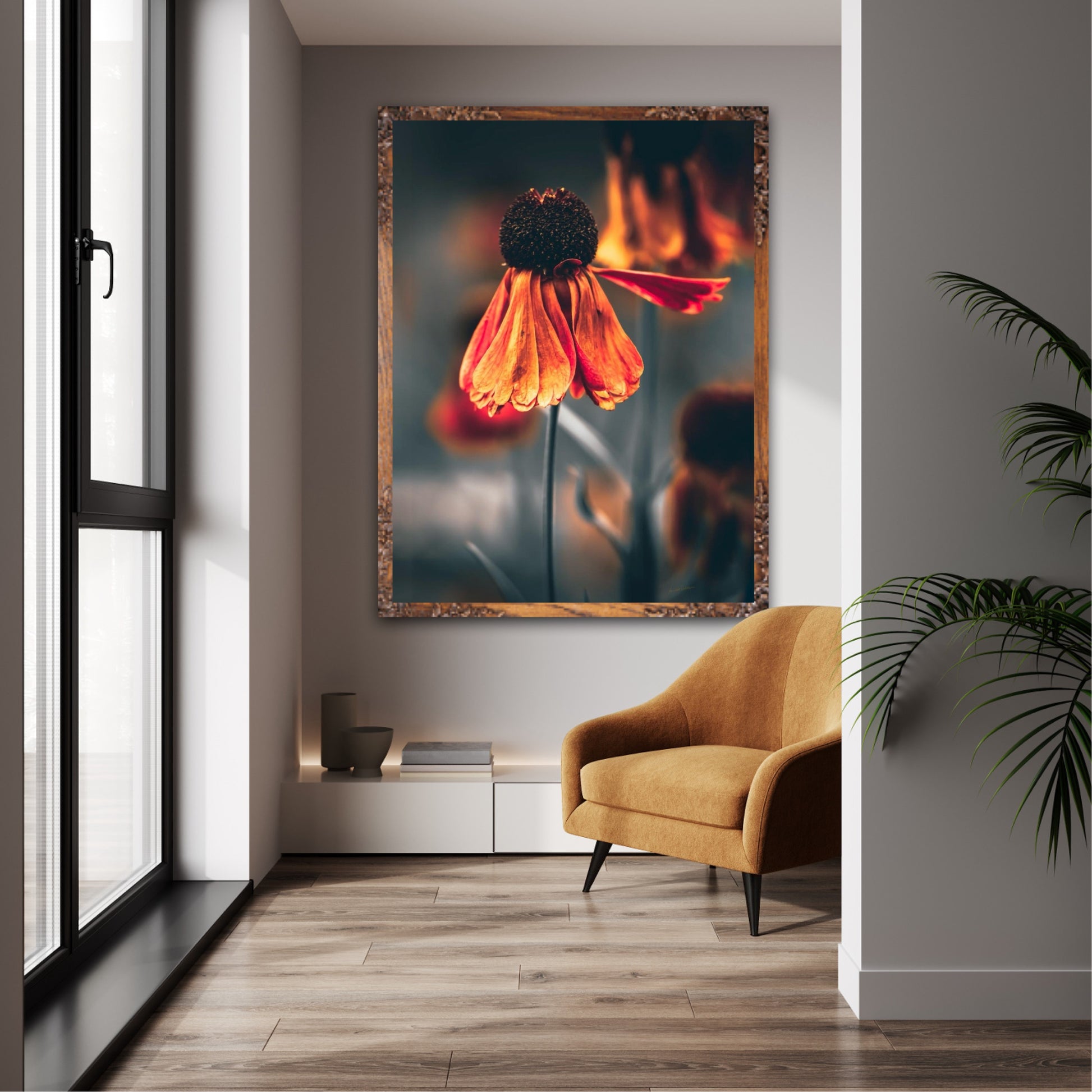 Beautiful photographic wall art of Helenium flower in straight and proud posture, created by the wind blowing. This artwork will bring you energy and a good mood.