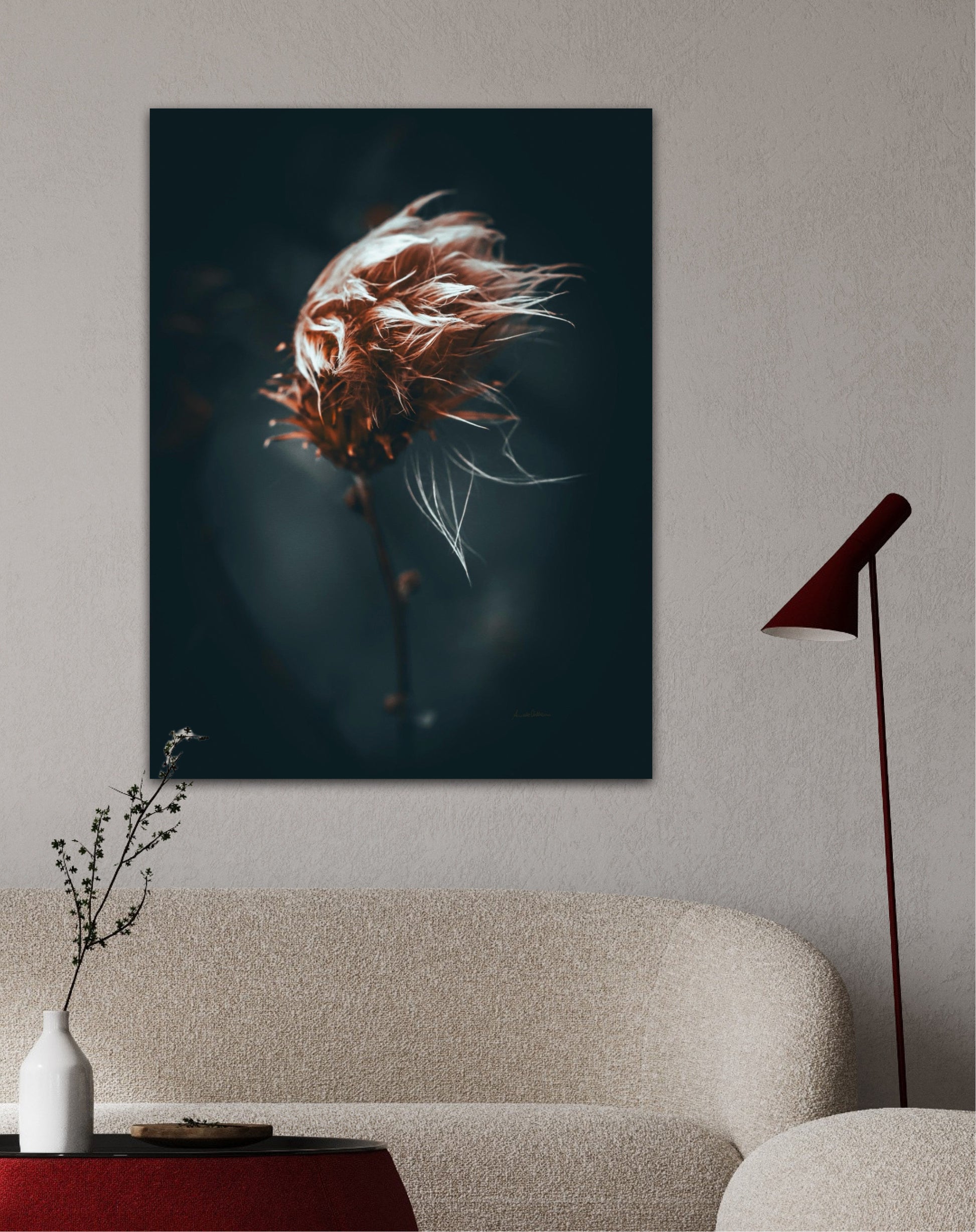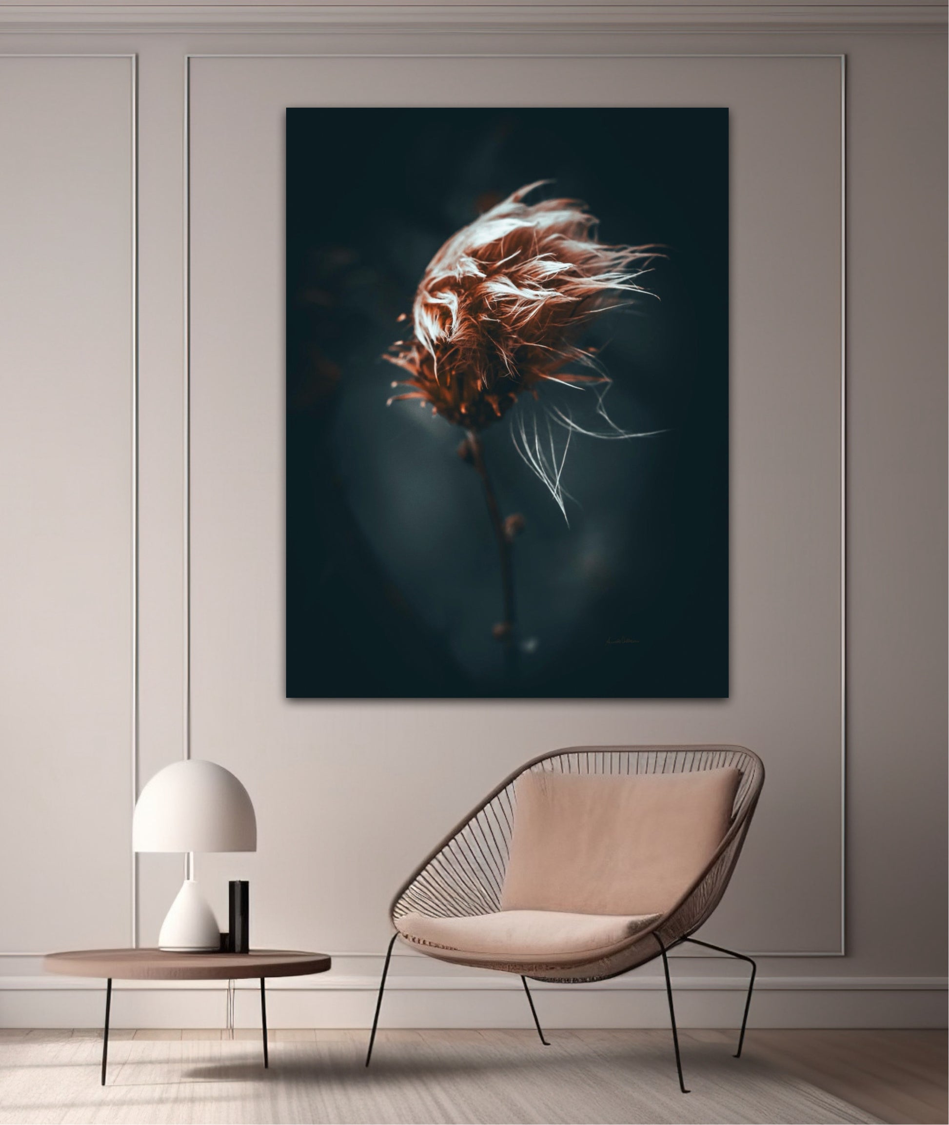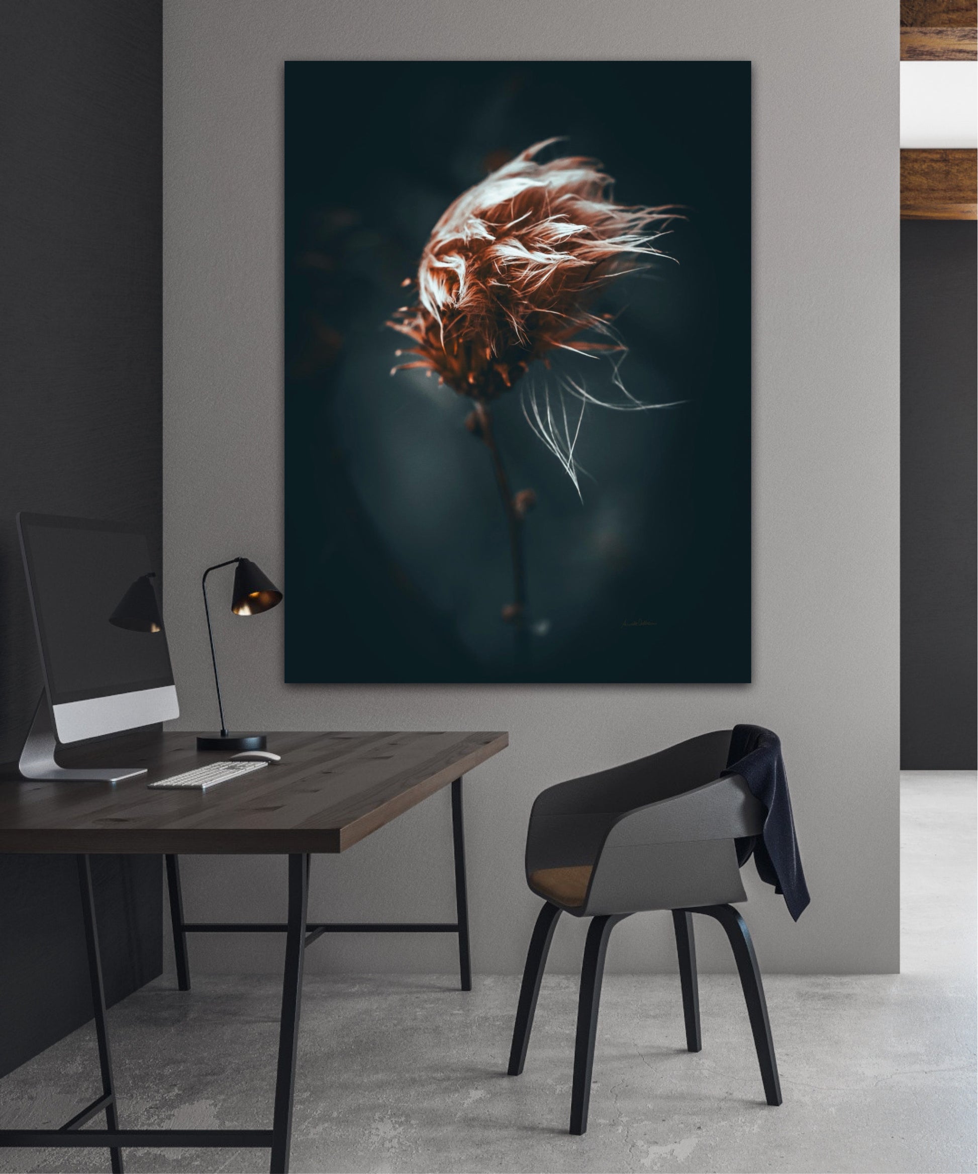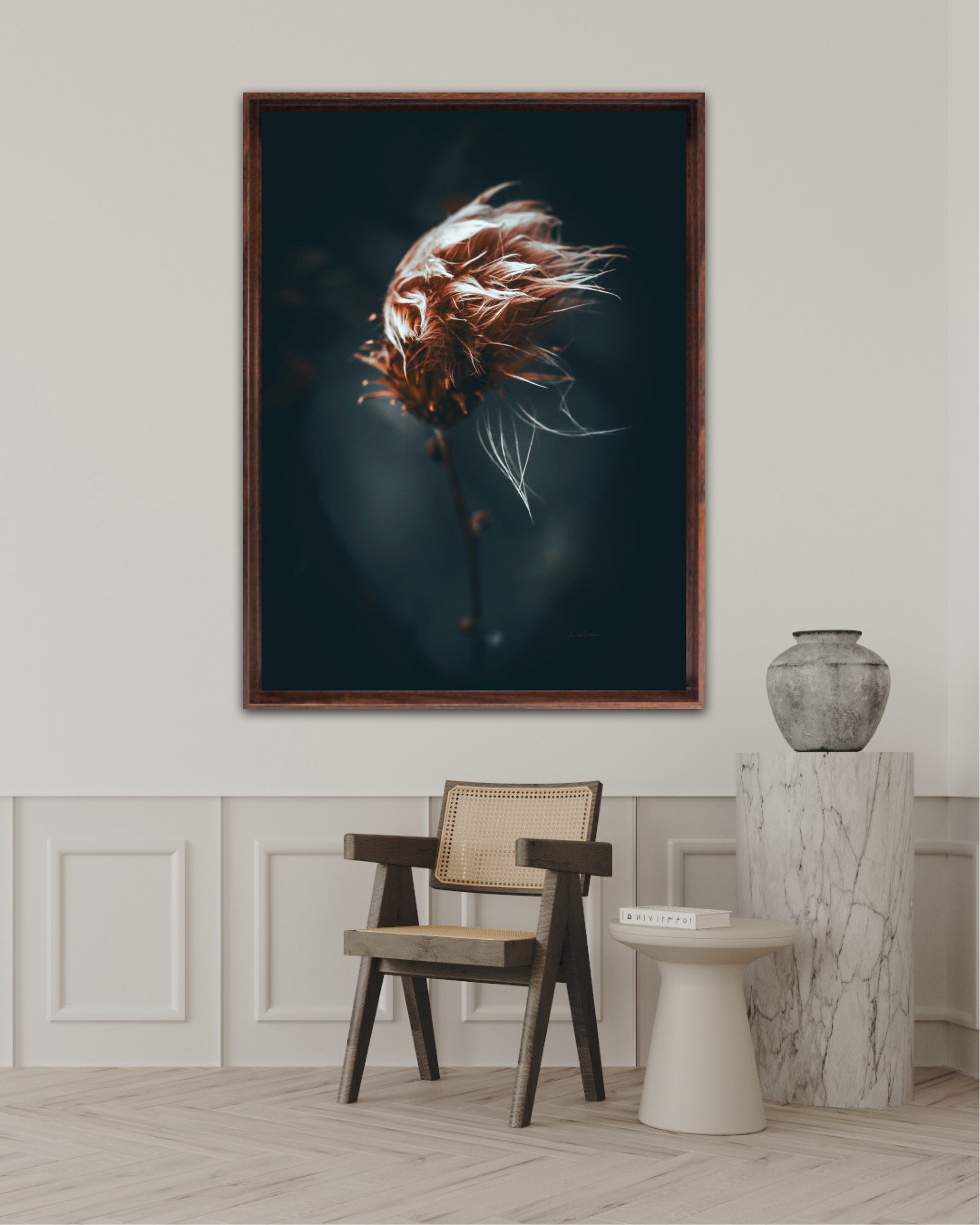Beautiful photographic wall art of a dried thistle plant. Do you feel the wind ruffling your hair? This is a lovely wall rt of a dried thistle plant shaped by rain and wind. Get a special and emotional piece of art on your wall that will give you the good feeling from nature every time you look at it. Impress friends and family with this gorgeous wall art.
