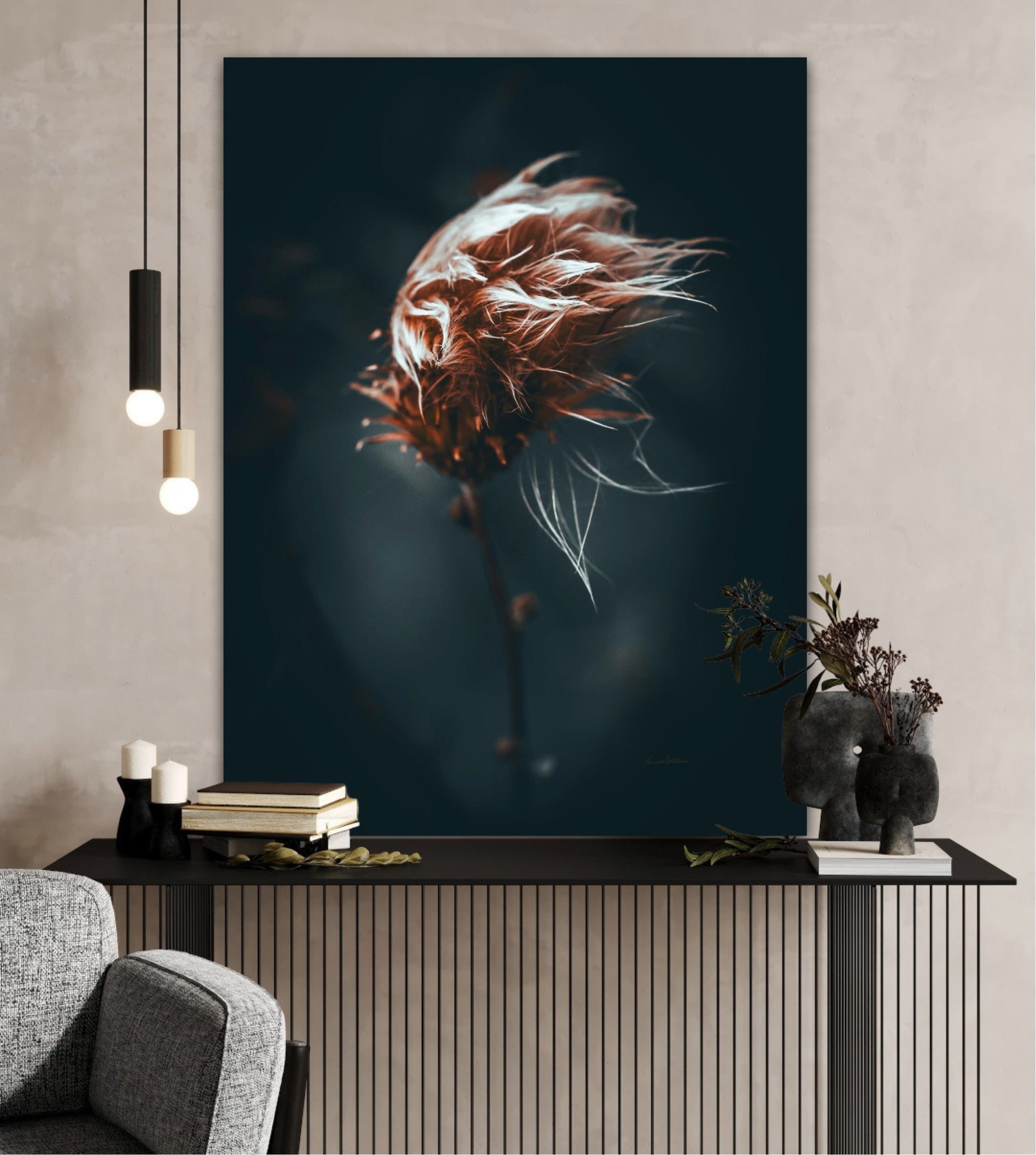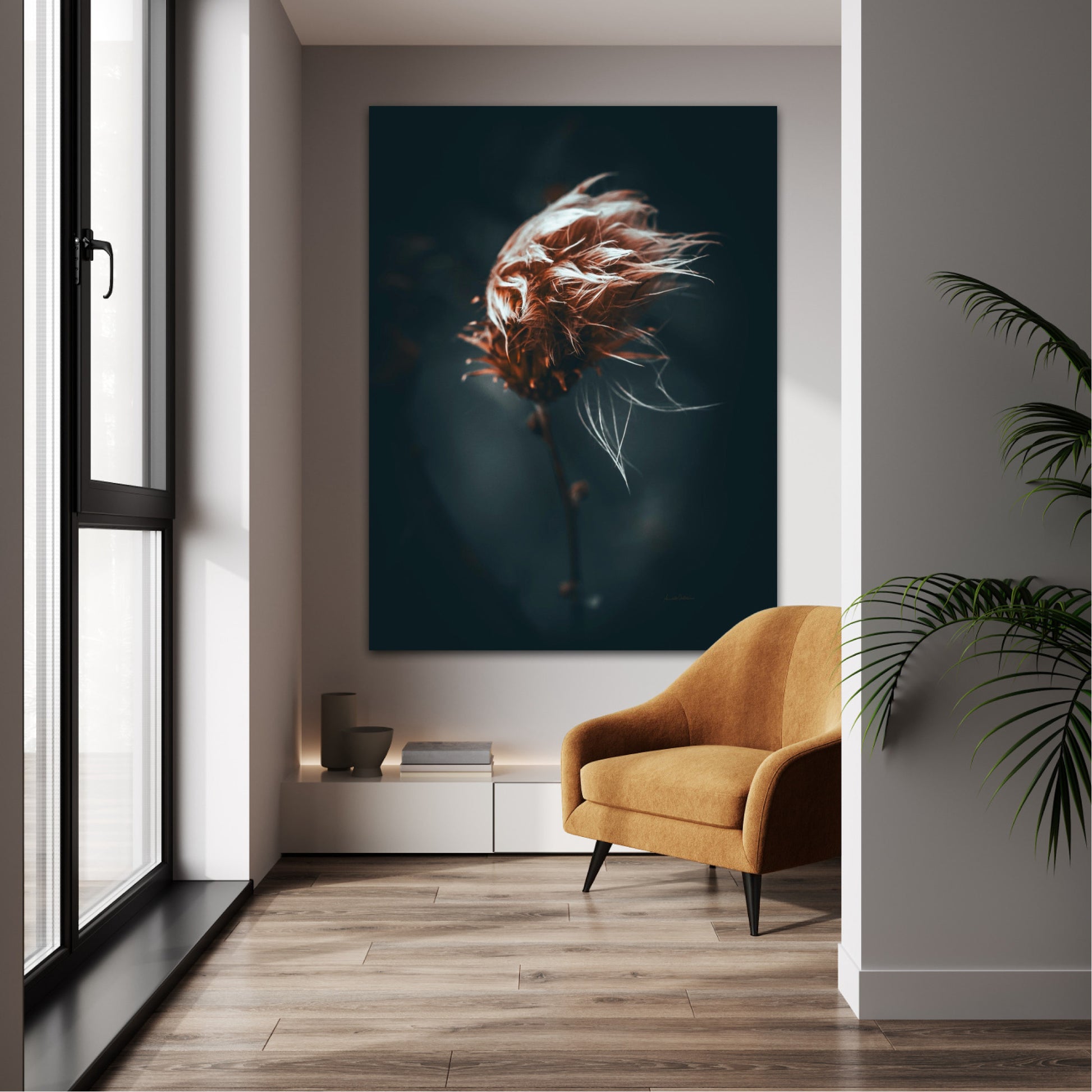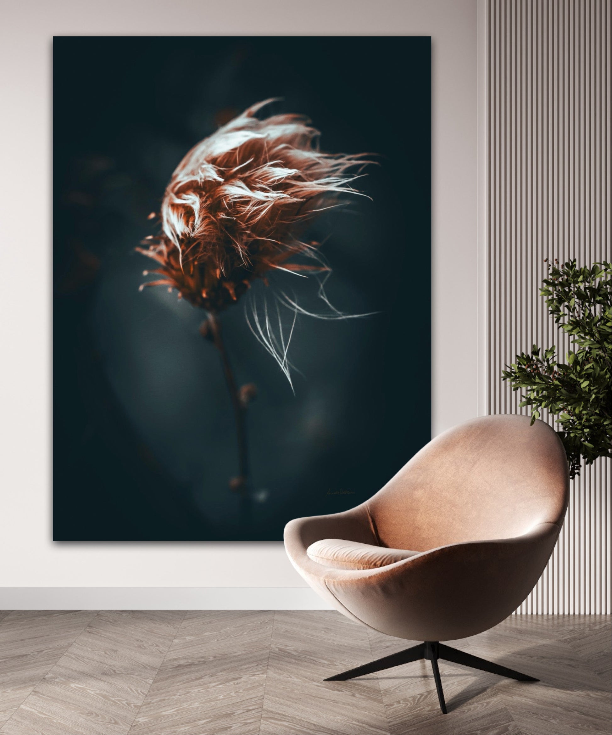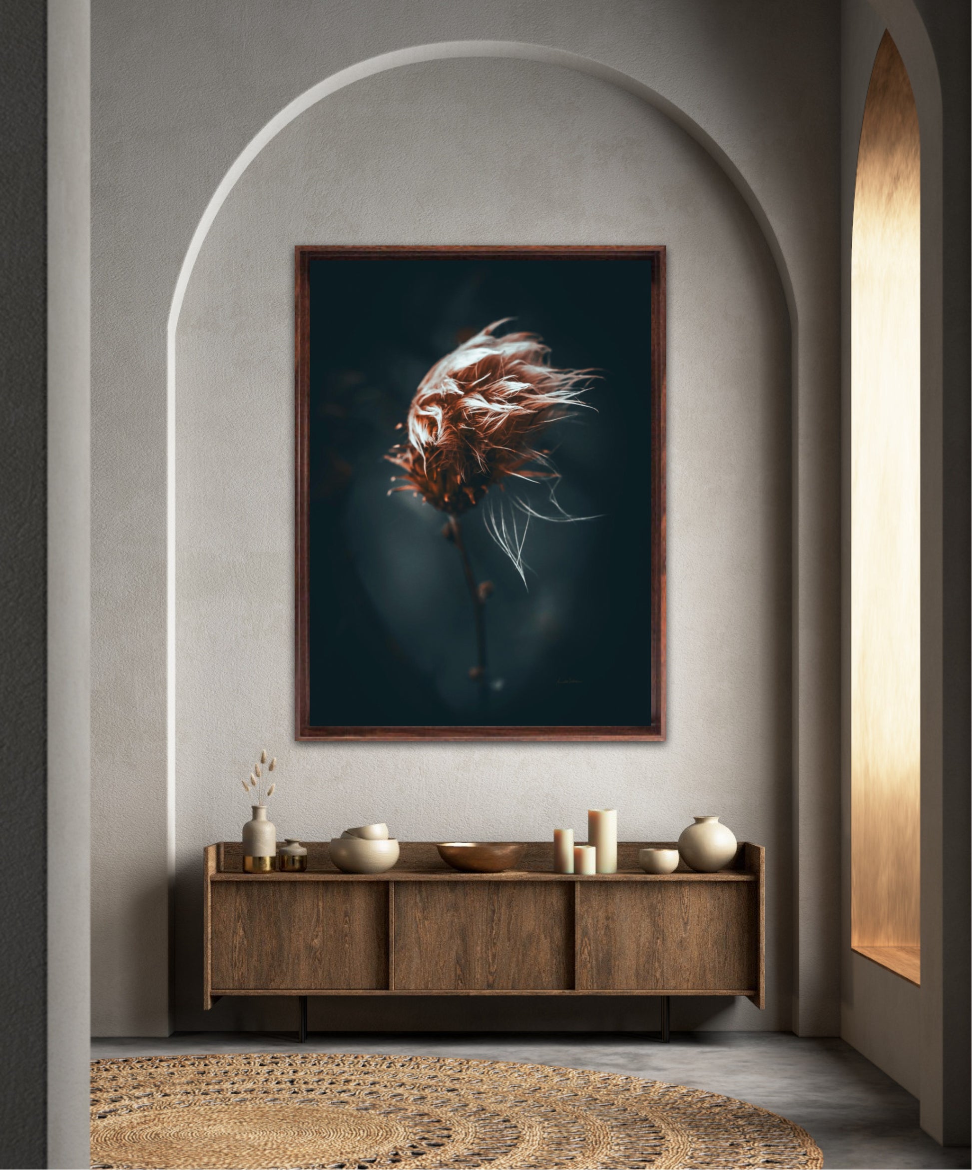 Beautiful photographic wall art of a dried thistle plant. Do you feel the wind ruffling your hair? This is a lovely wall rt of a dried thistle plant shaped by rain and wind. Get a special and emotional piece of art on your wall that will give you the good feeling from nature every time you look at it. Impress friends and family with this gorgeous wall art.