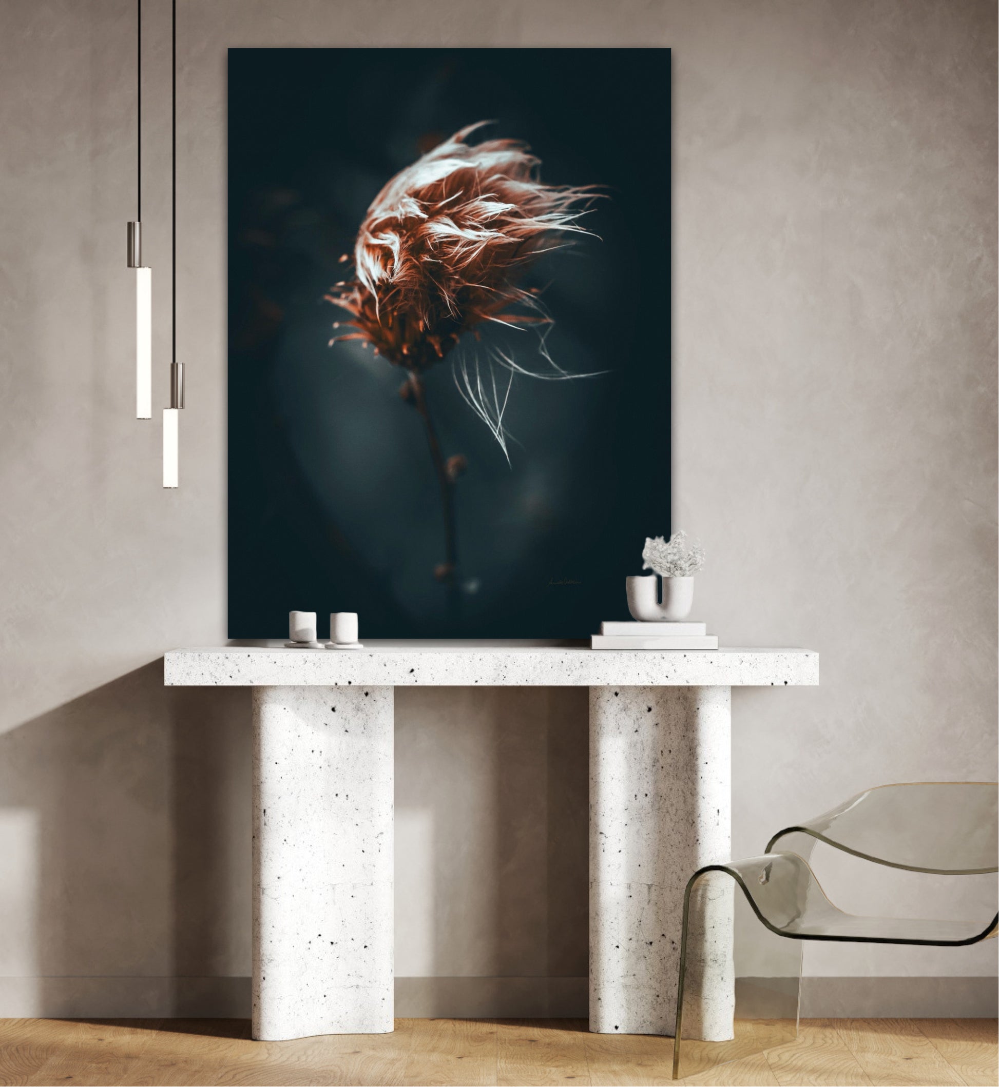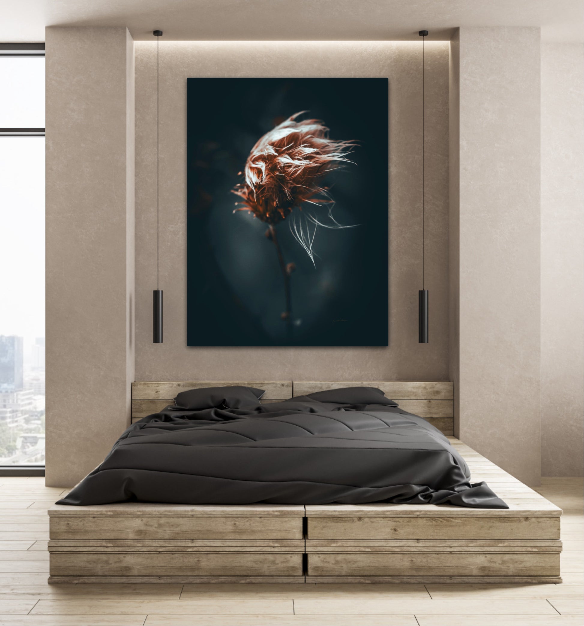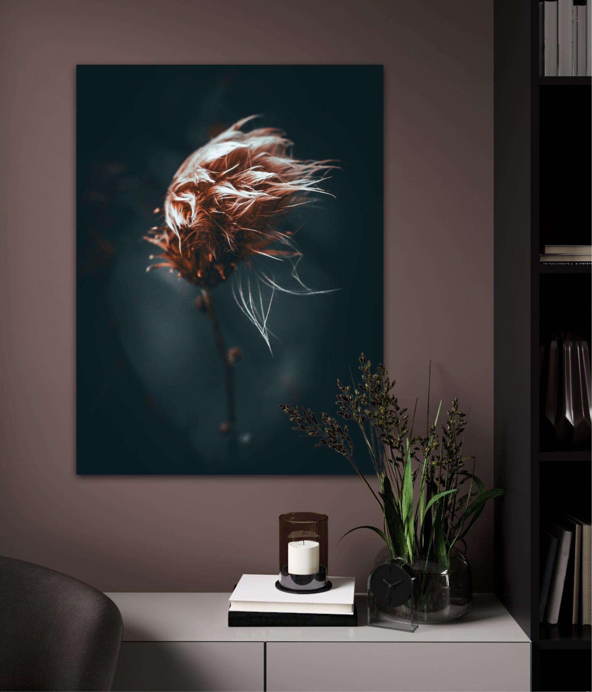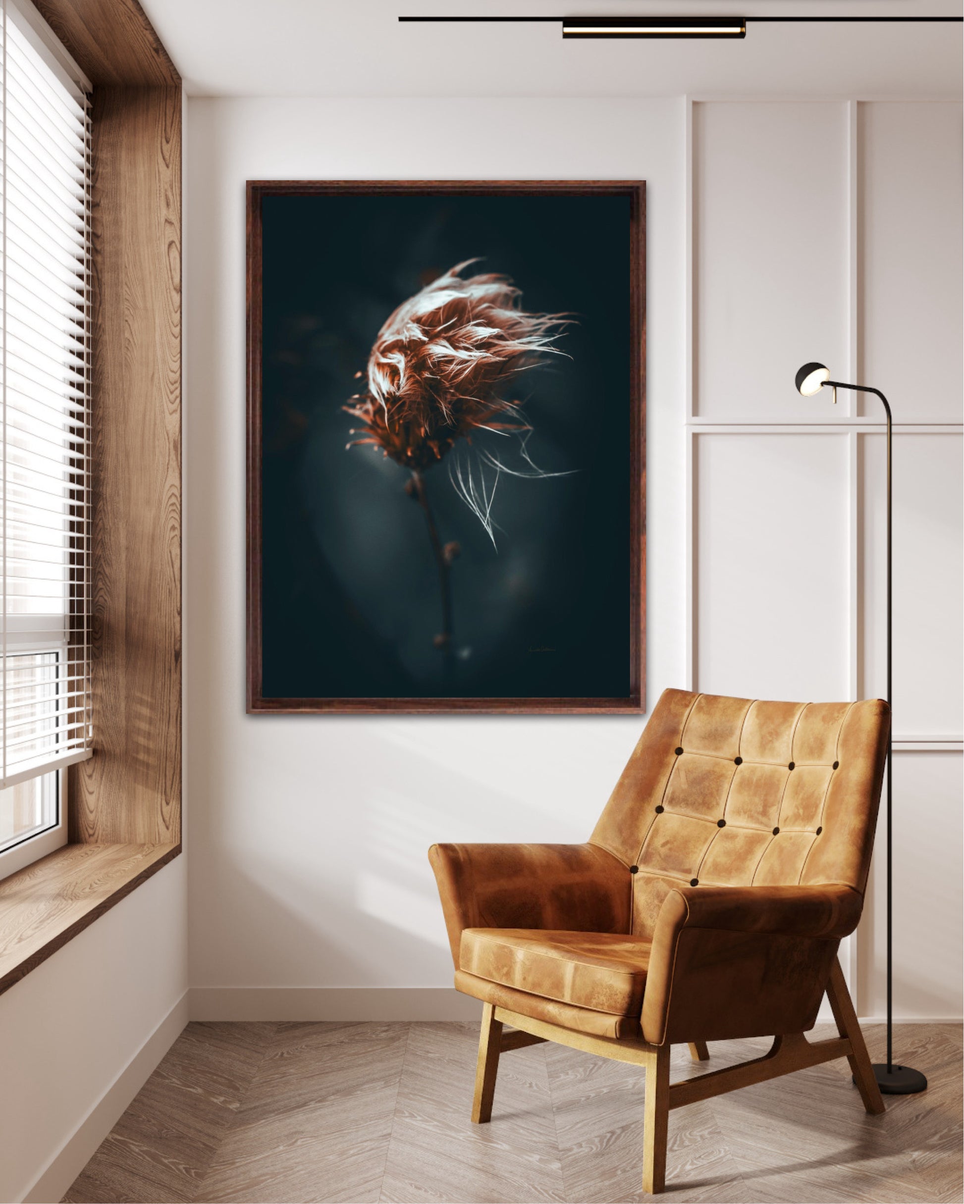 Beautiful photographic wall art of a dried thistle plant. Do you feel the wind ruffling your hair? This is a lovely wall rt of a dried thistle plant shaped by rain and wind. Get a special and emotional piece of art on your wall that will give you the good feeling from nature every time you look at it. Impress friends and family with this gorgeous wall art.