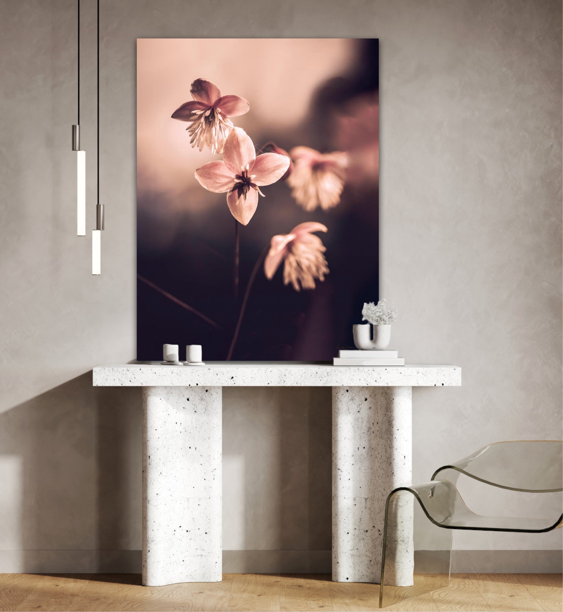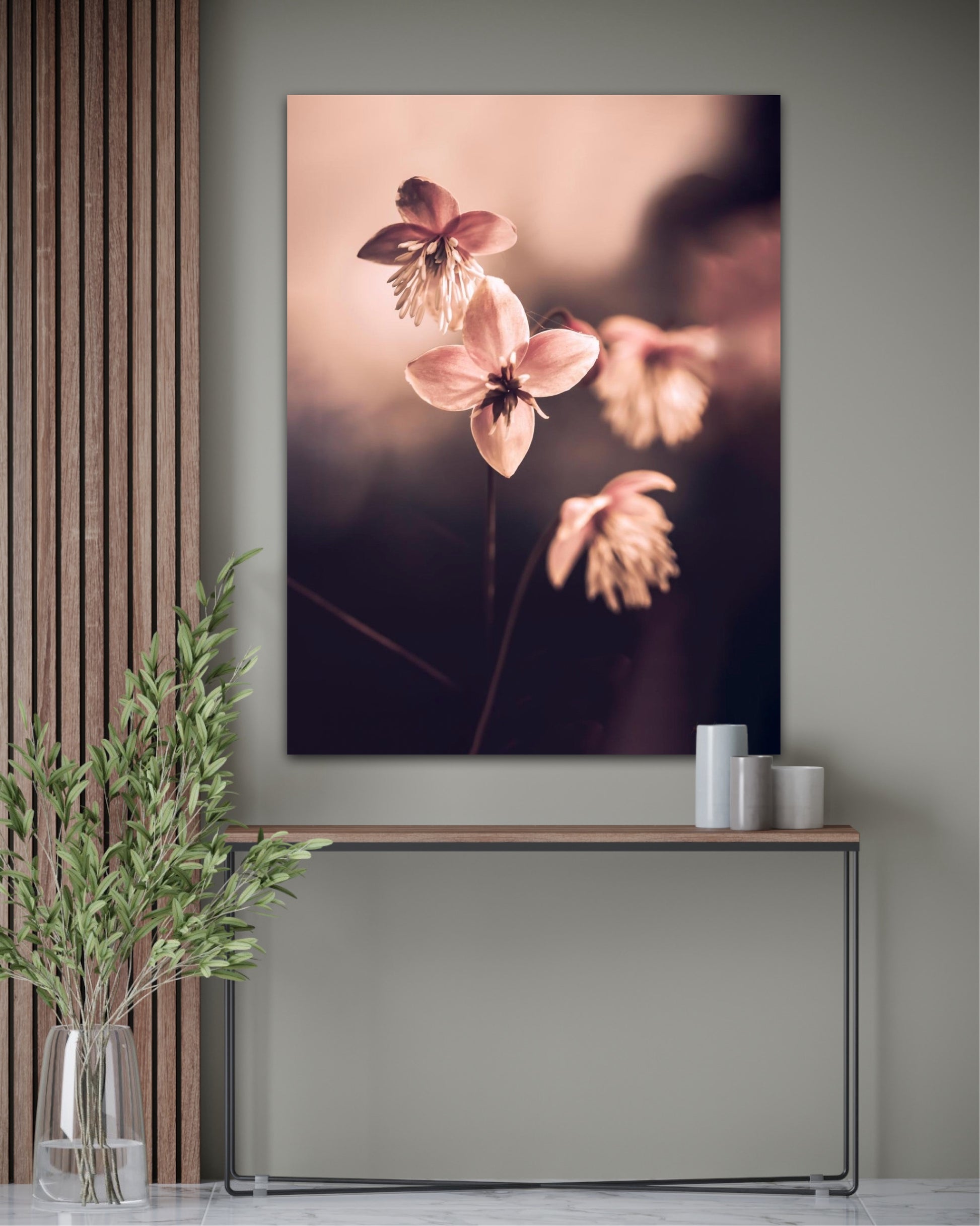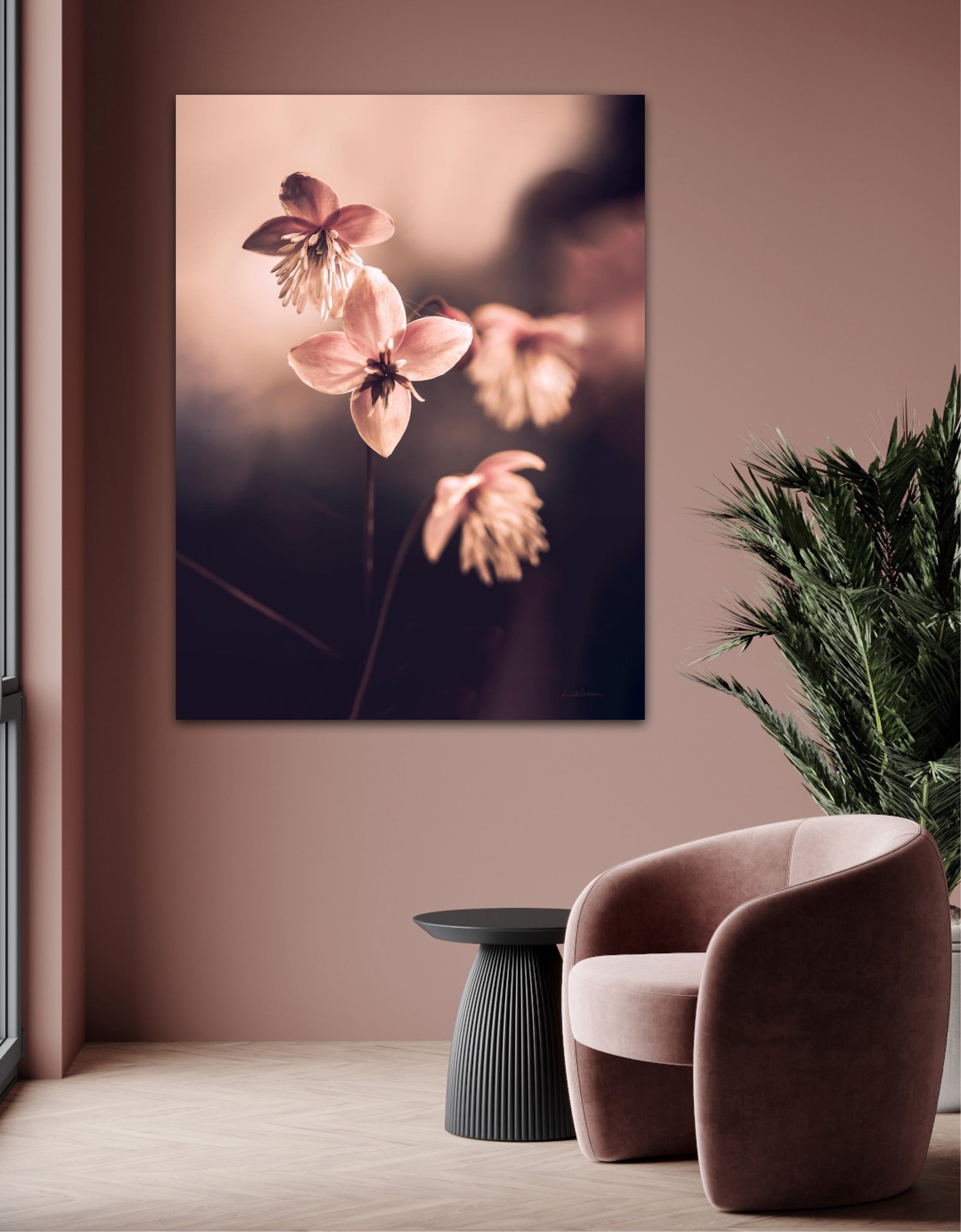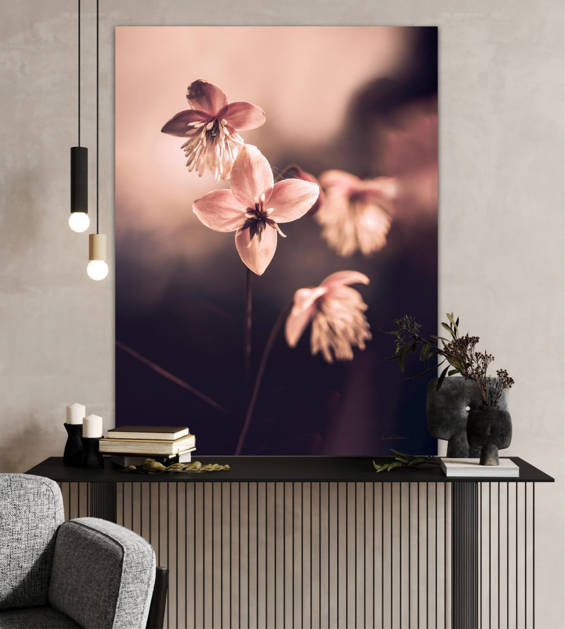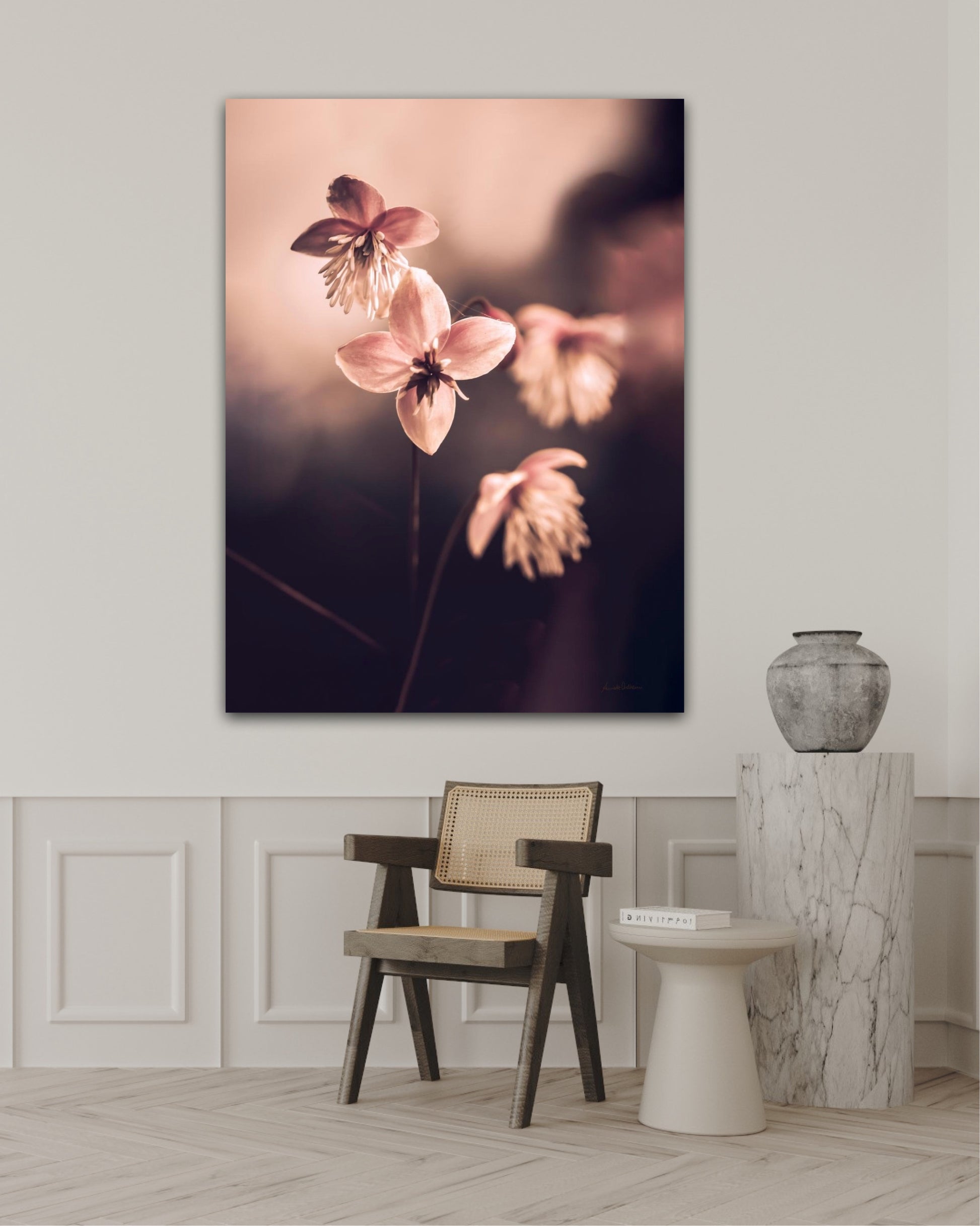 Beautiful photographic wall art of some gorgeous Meadow rue flowers in wonderful tones of pink on a dark lilac and black background. This photo really has amazing atmosphere! Bring peace to your home with this beautiful artwork, and order today!