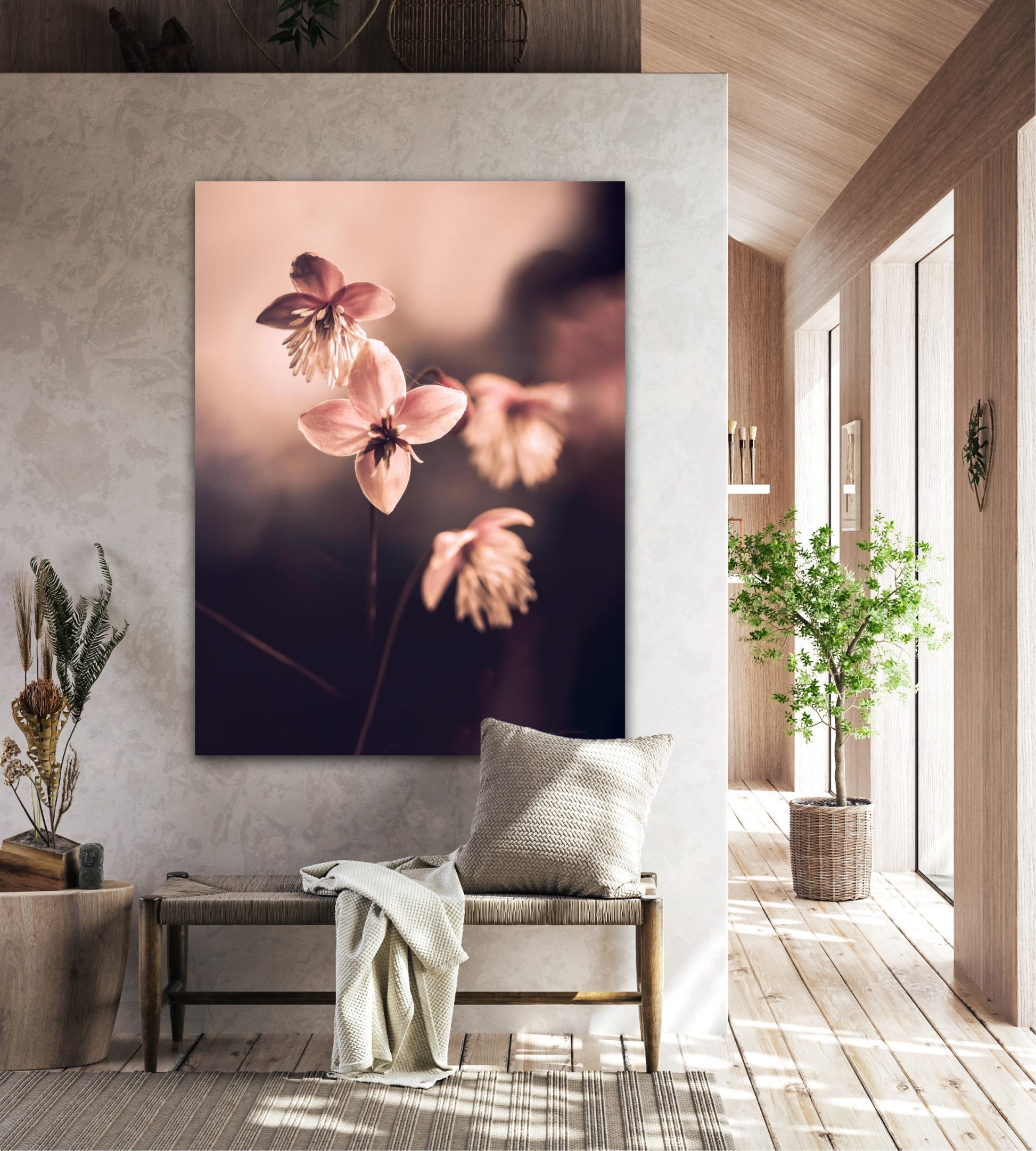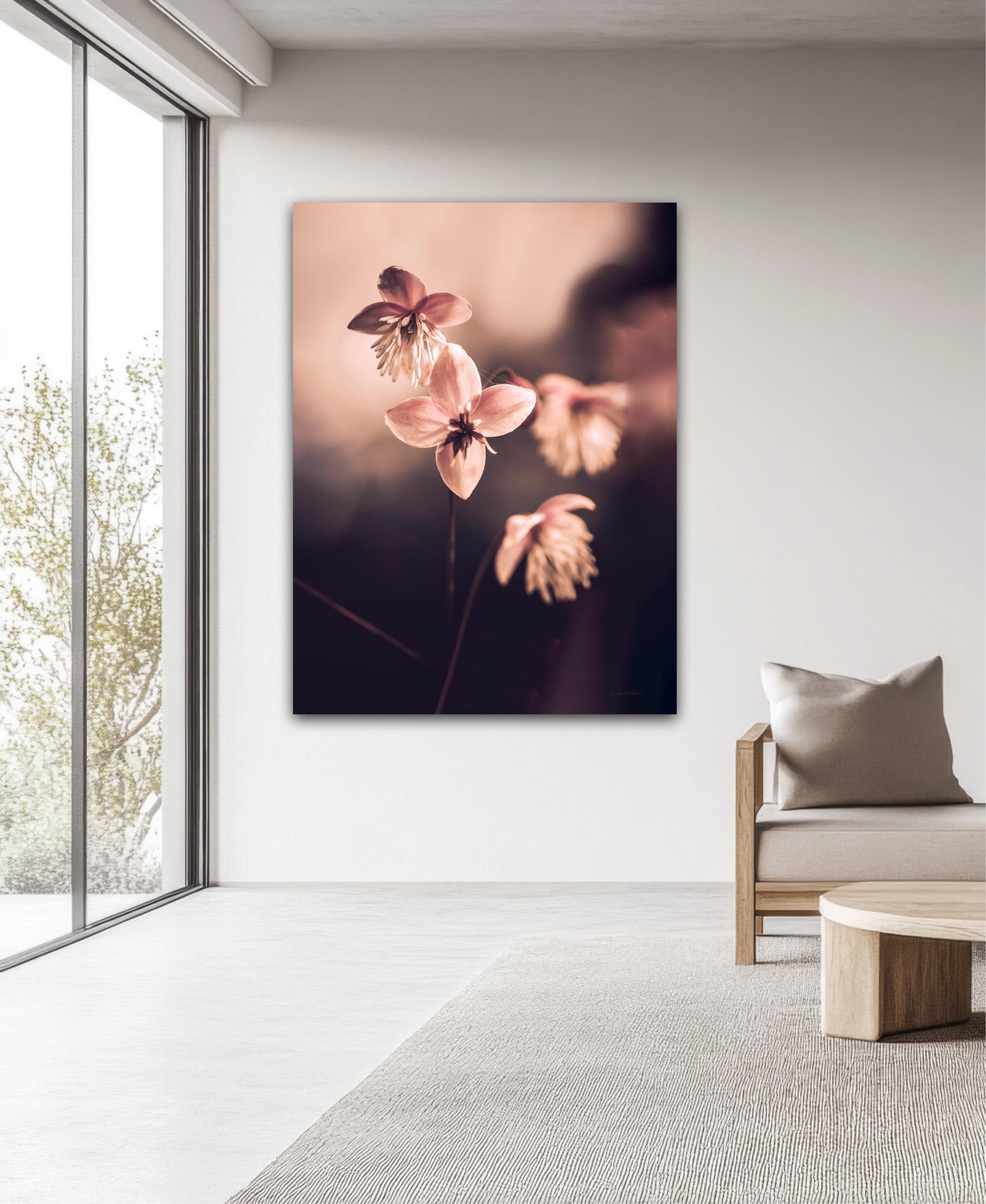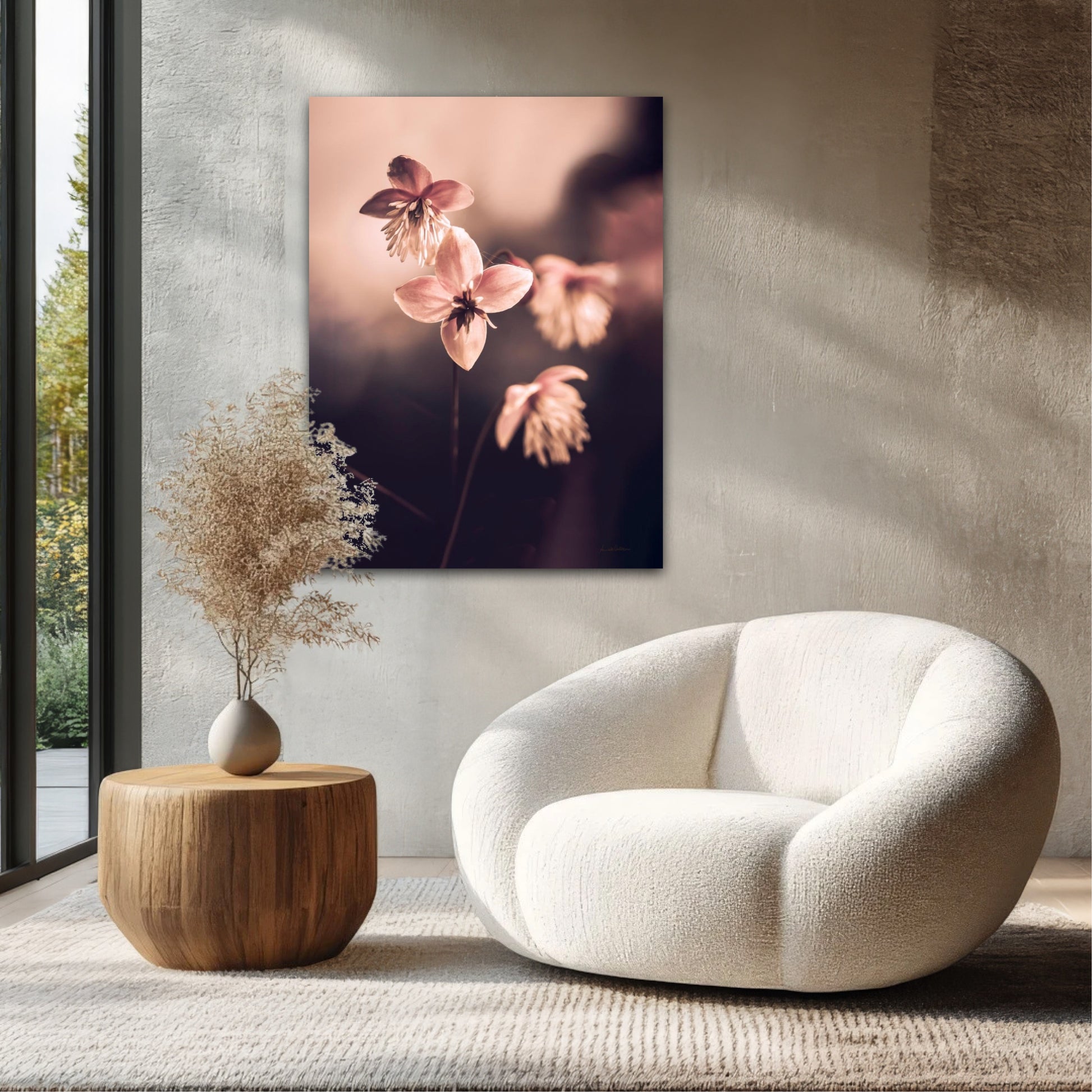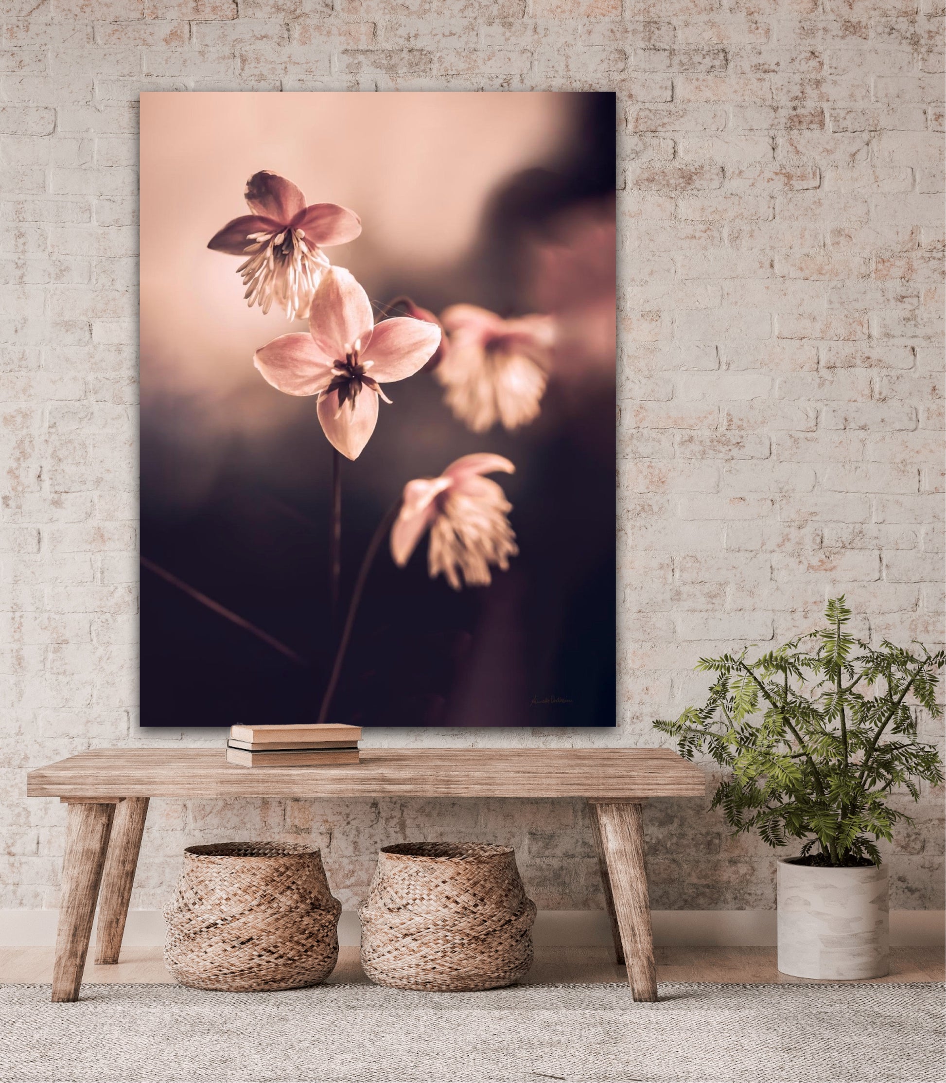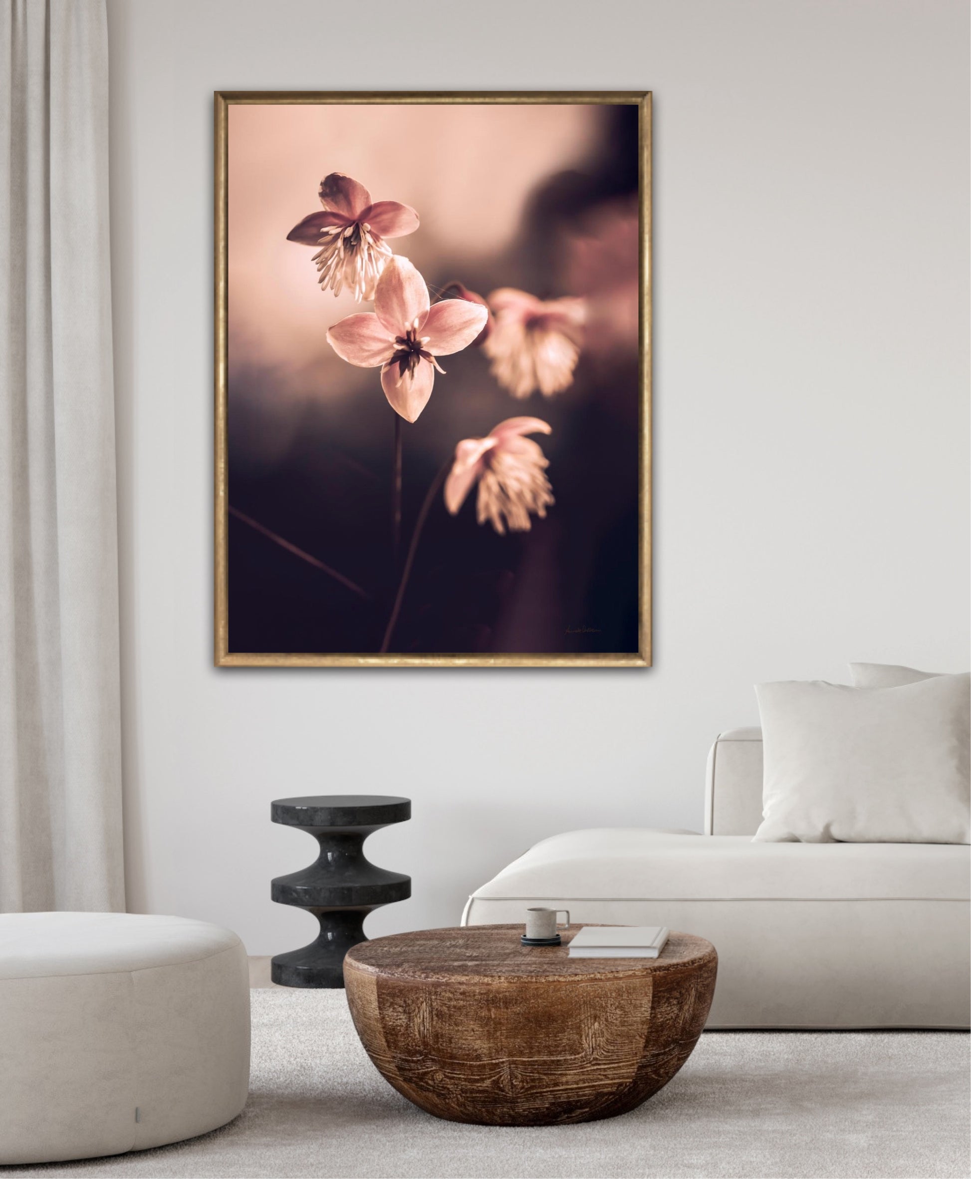Beautiful photographic wall art of some gorgeous Meadow rue flowers in wonderful tones of pink on a dark lilac and black background. This photo really has amazing atmosphere! Bring peace to your home with this beautiful artwork, and order today!