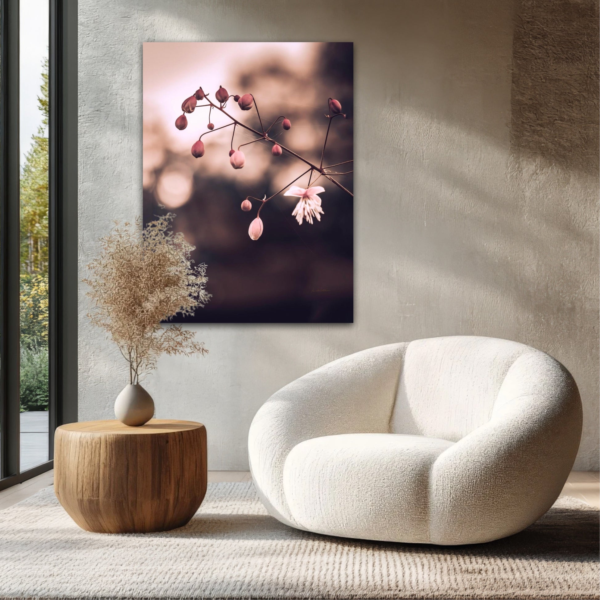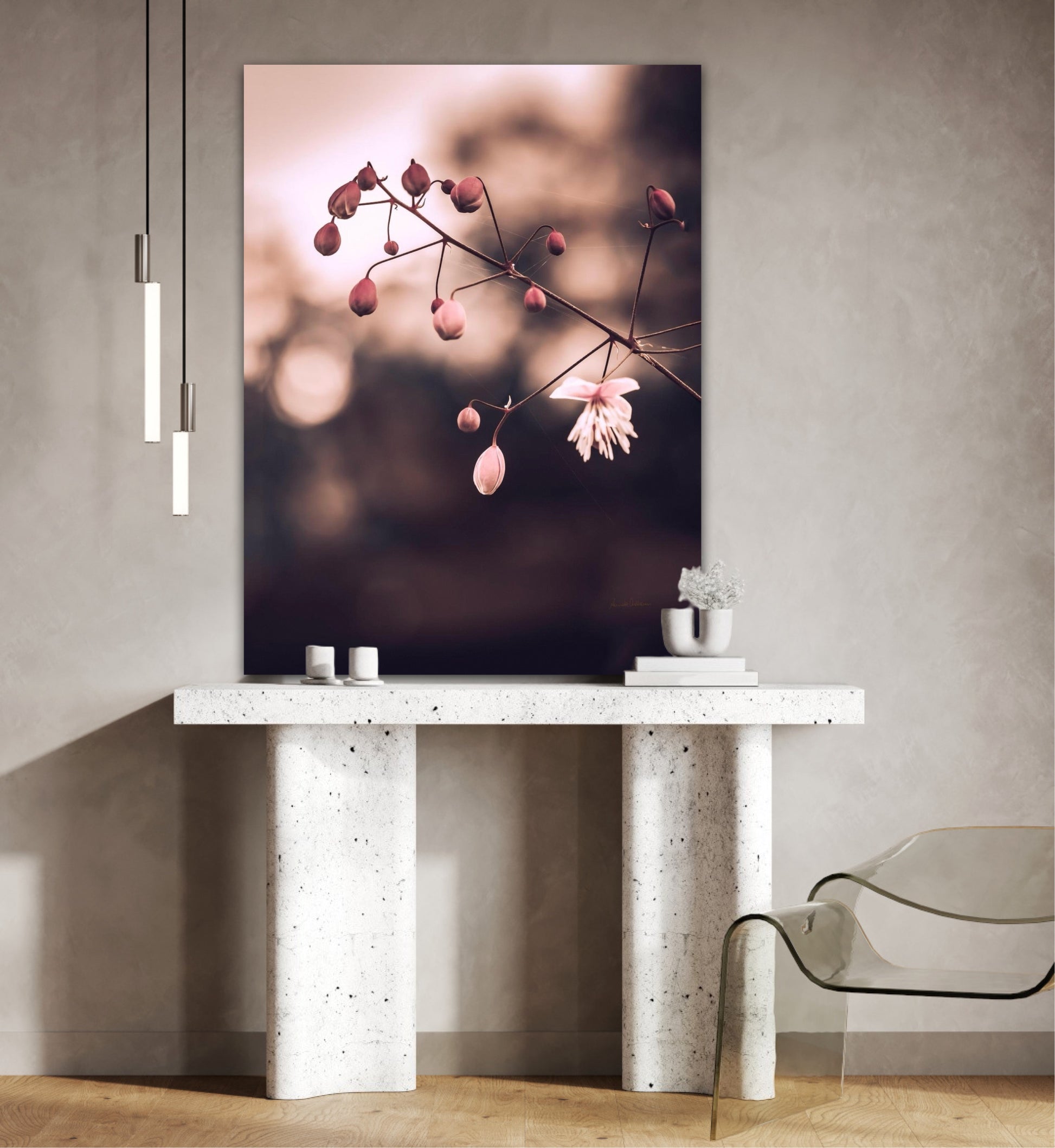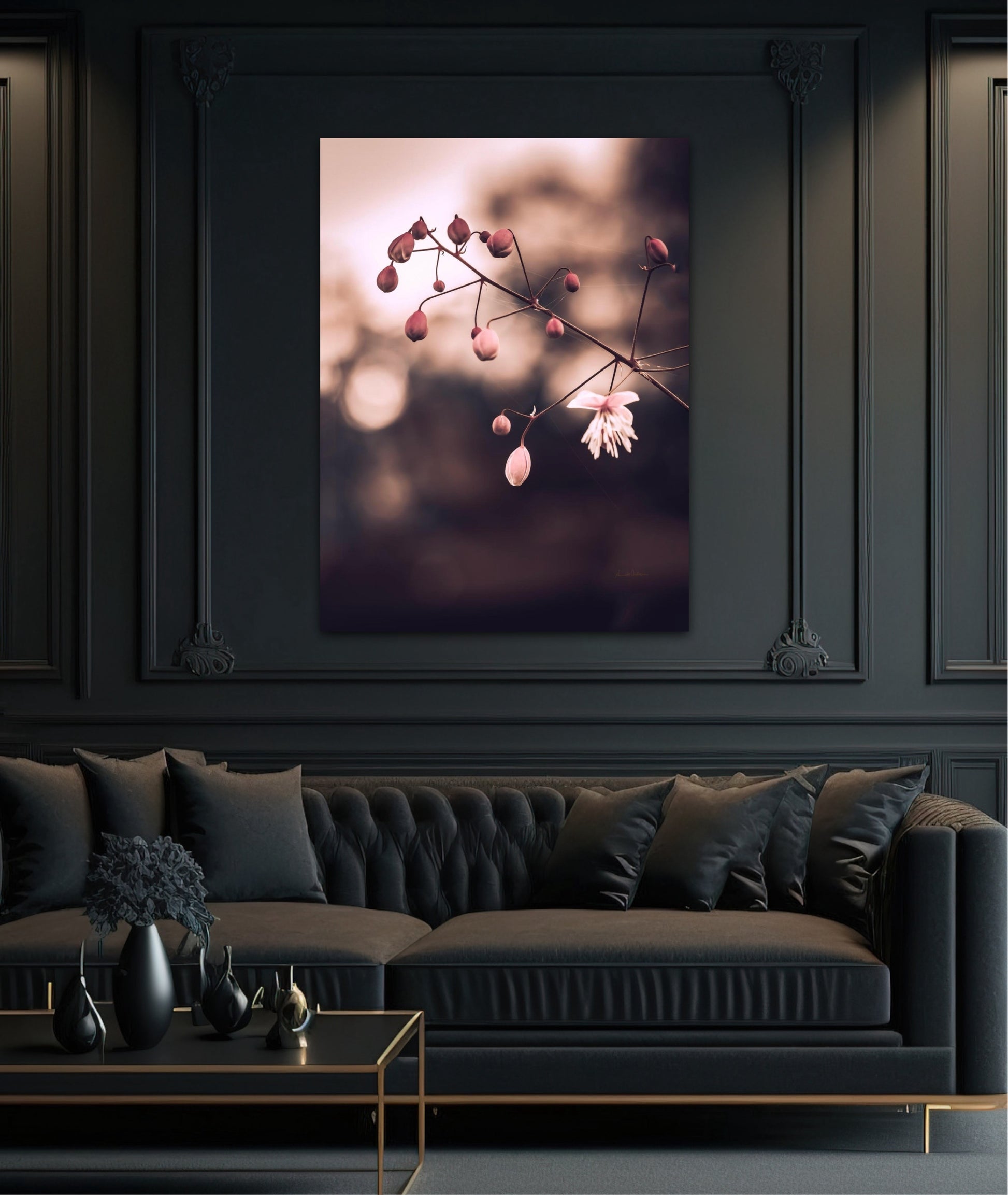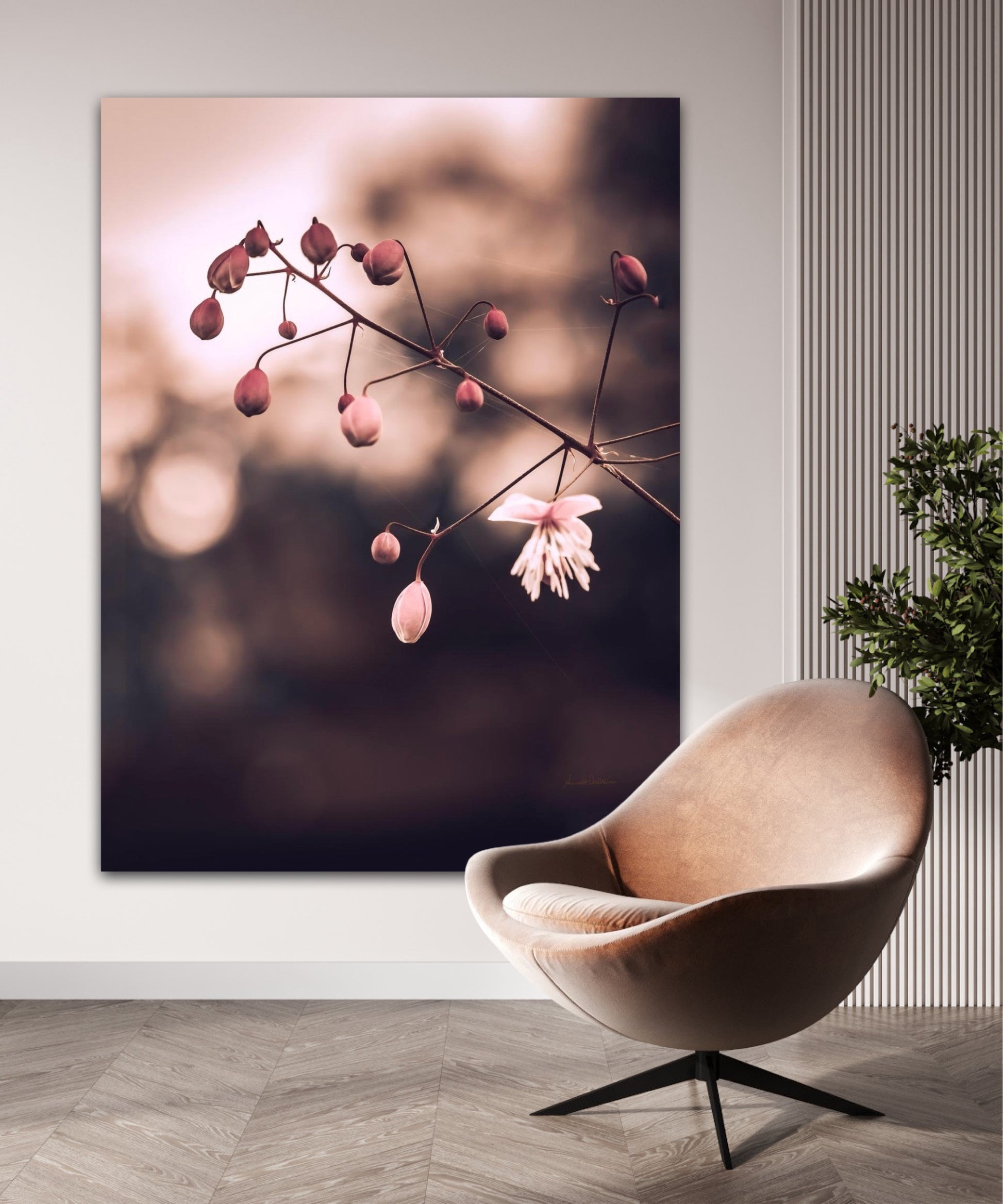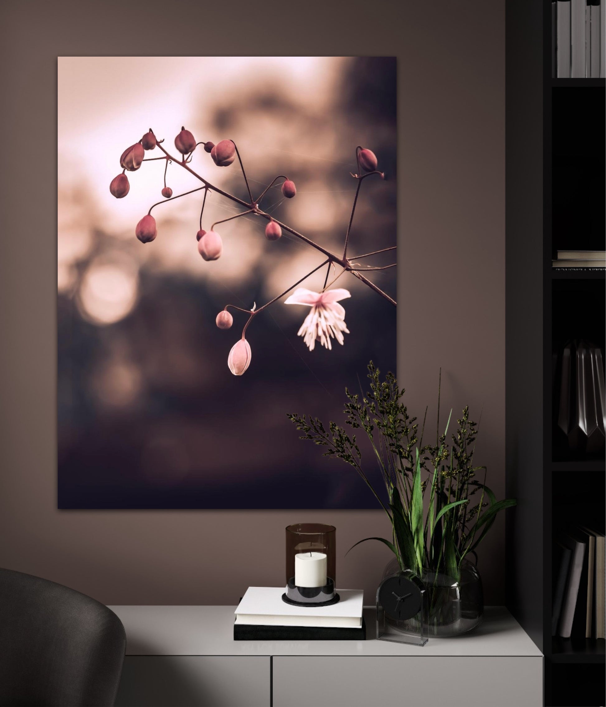 Beautiful photographic wall art of some gorgeous Meadow rue flowers in wonderful tones of pink on a dark lilac and black background. This photo really has amazing atmosphere! Bring peace to your home with this beautiful artwork, and order today!