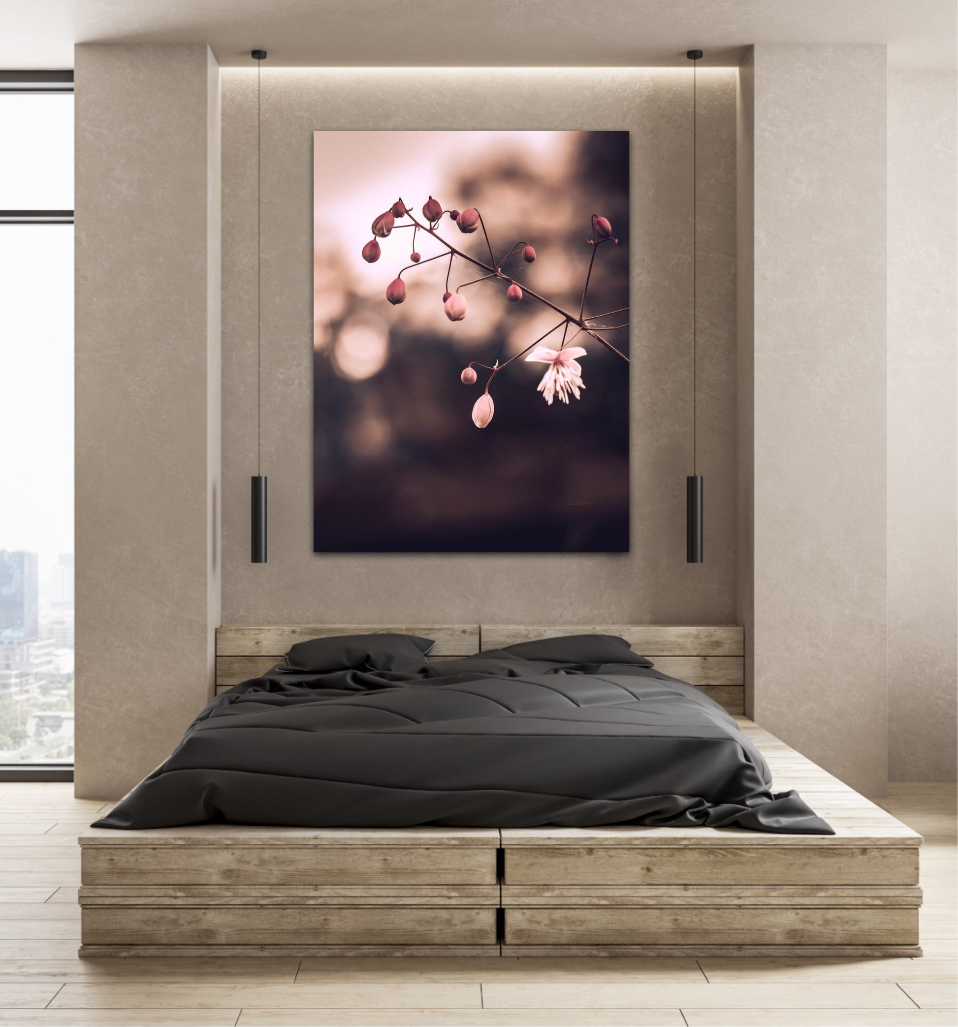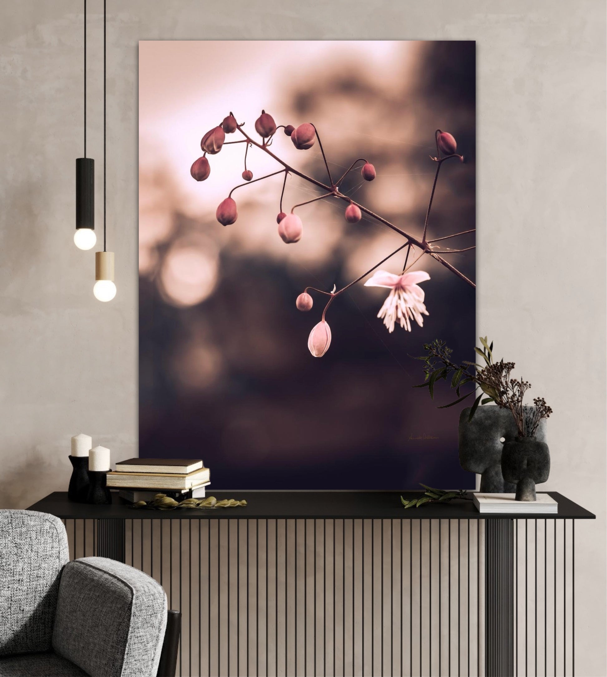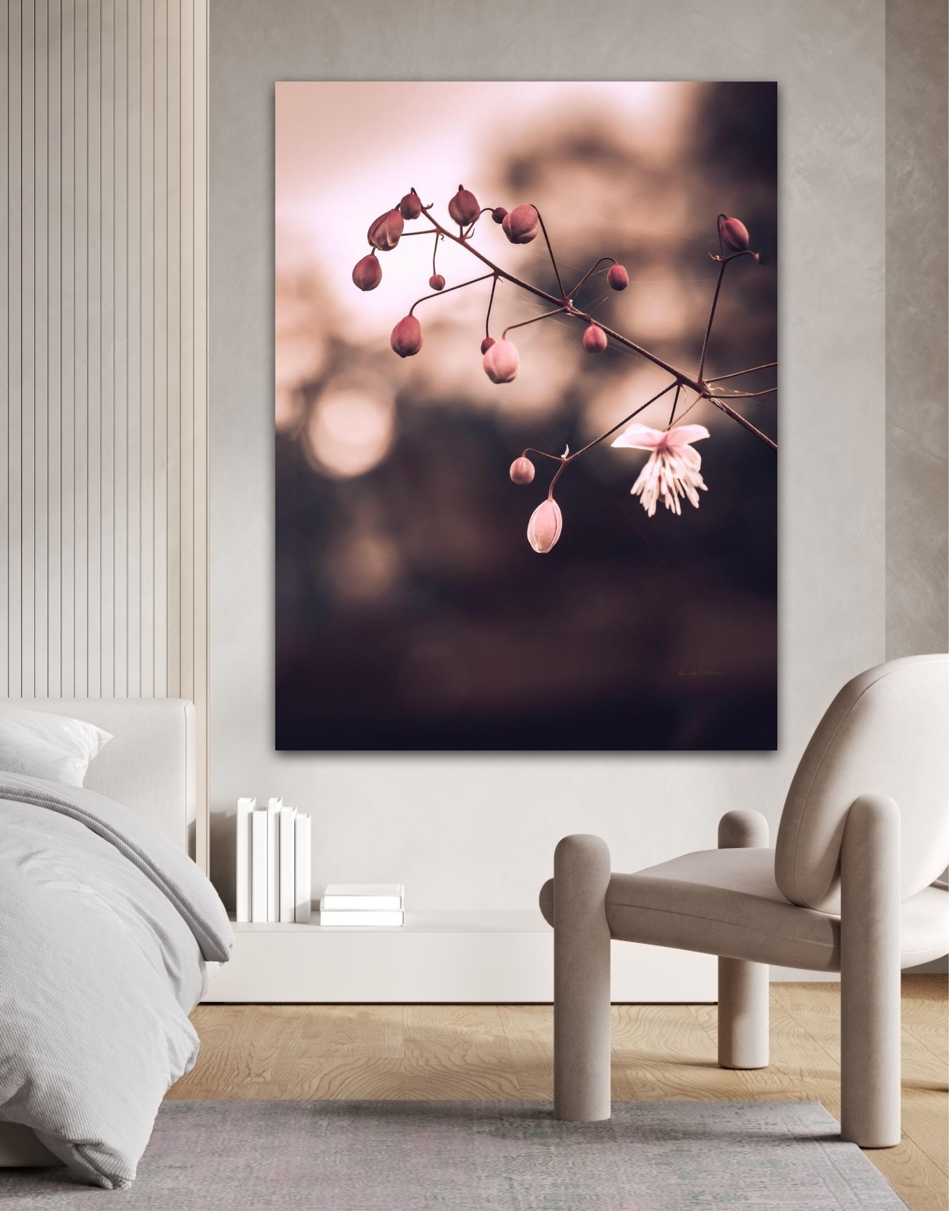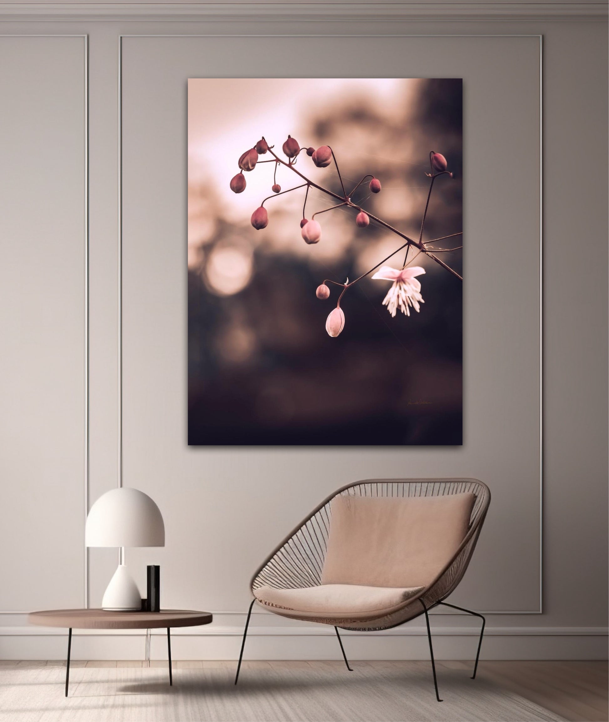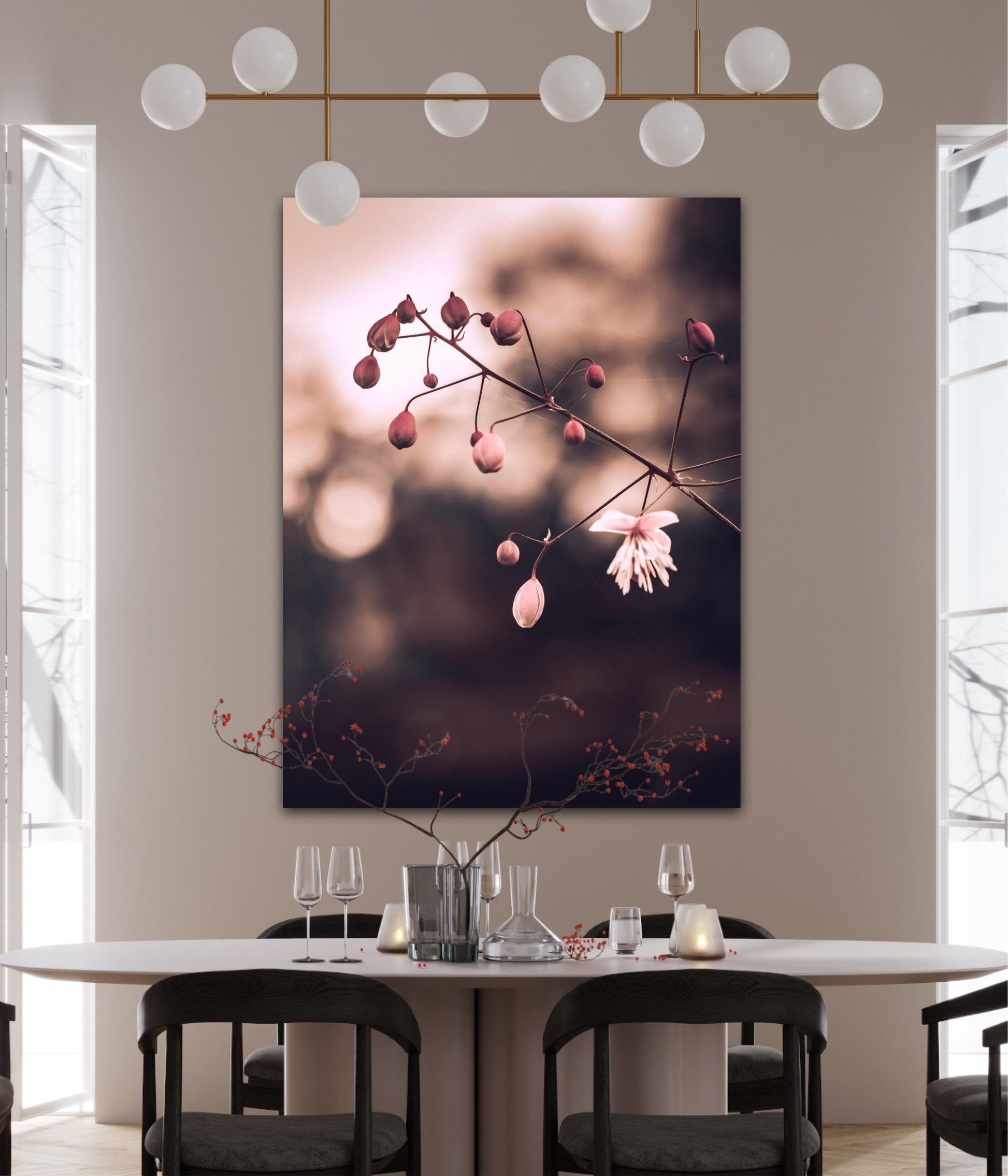 Beautiful photographic wall art of some gorgeous Meadow rue flowers in wonderful tones of pink on a dark lilac and black background. This photo really has amazing atmosphere! Bring peace to your home with this beautiful artwork, and order today!