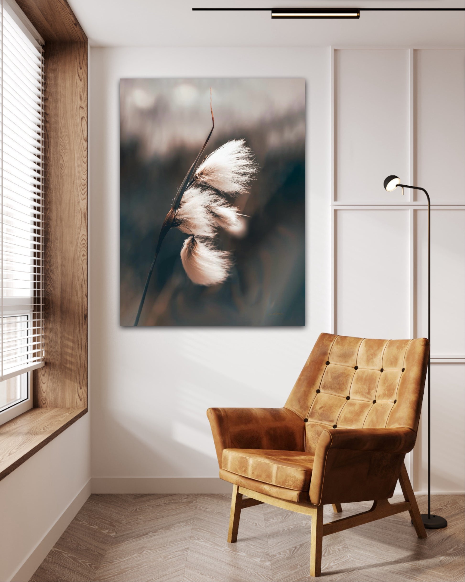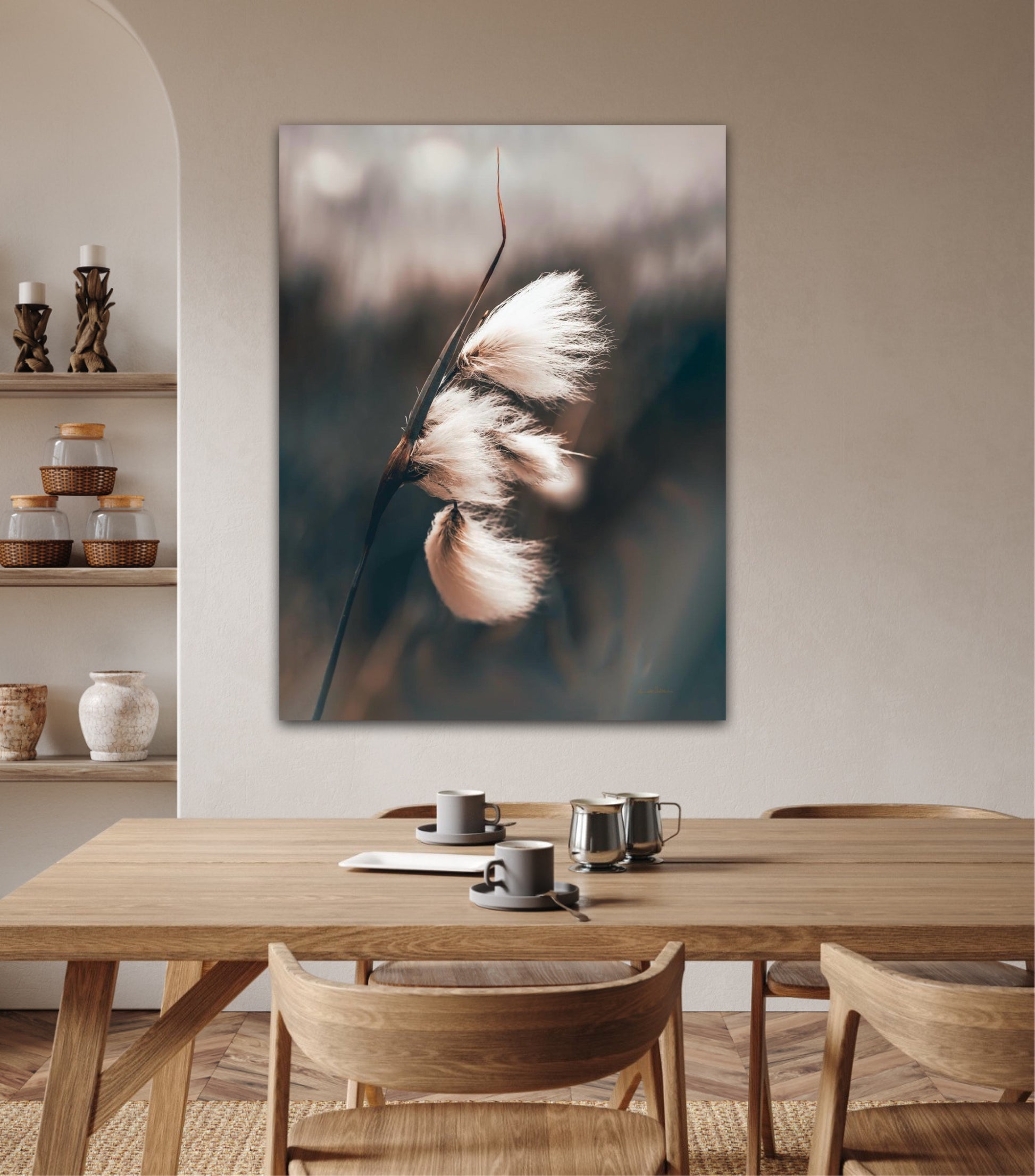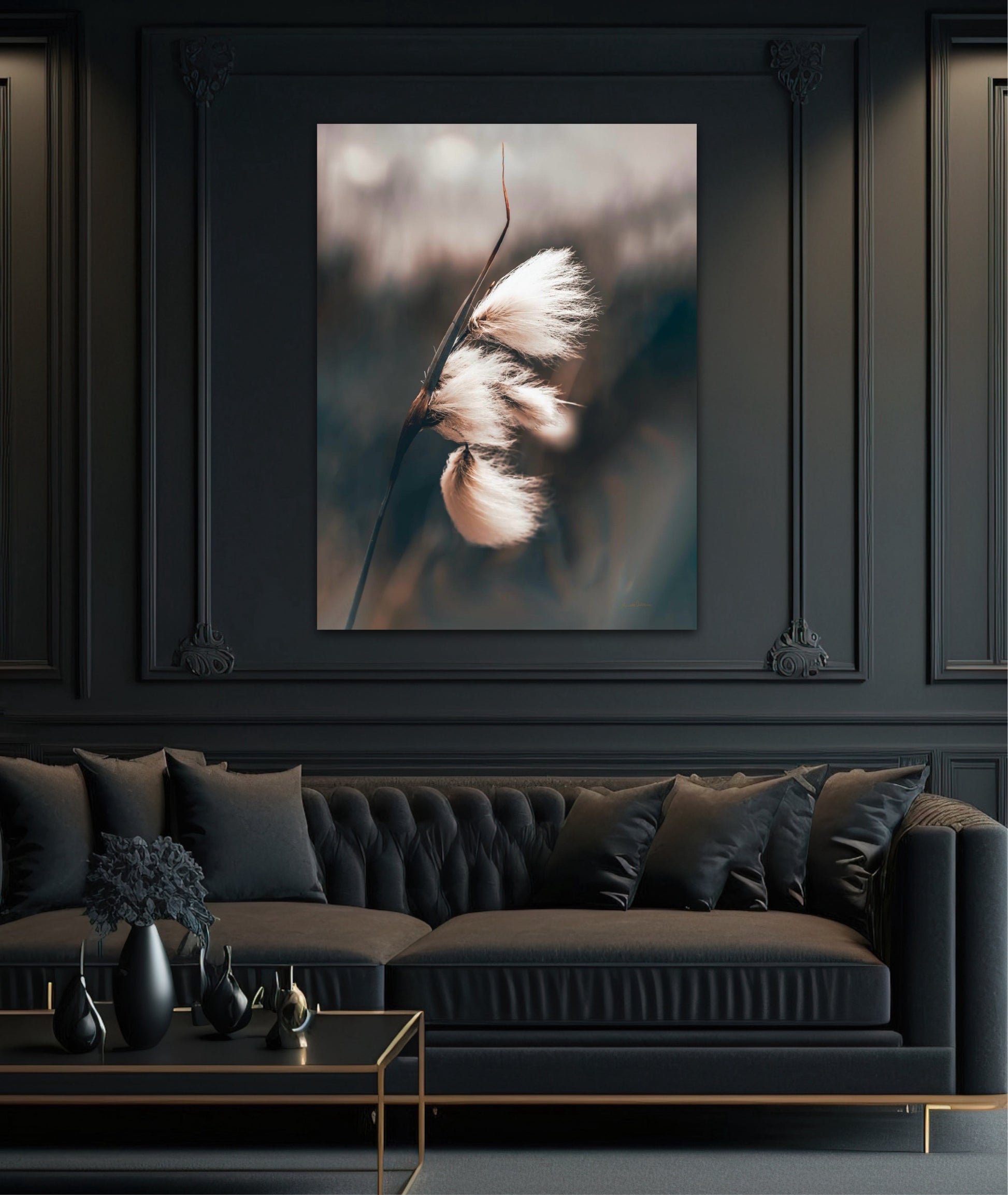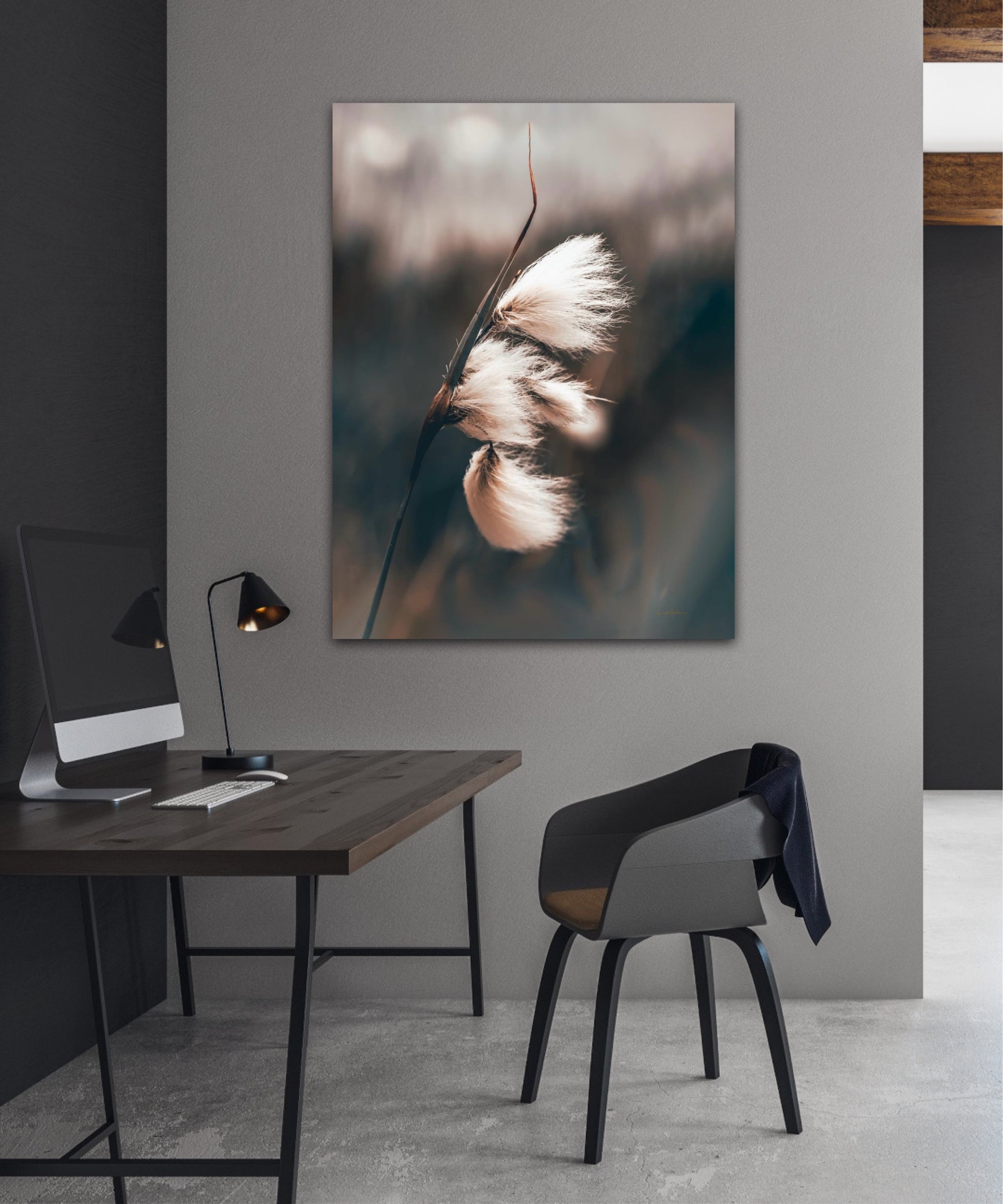 Beautiful and warm photographic art image of cottongrass in the mountain in wonderful earth tones on a dark and light background. Beautiful and peaceful, get the good feeling with this beautiful artwork.