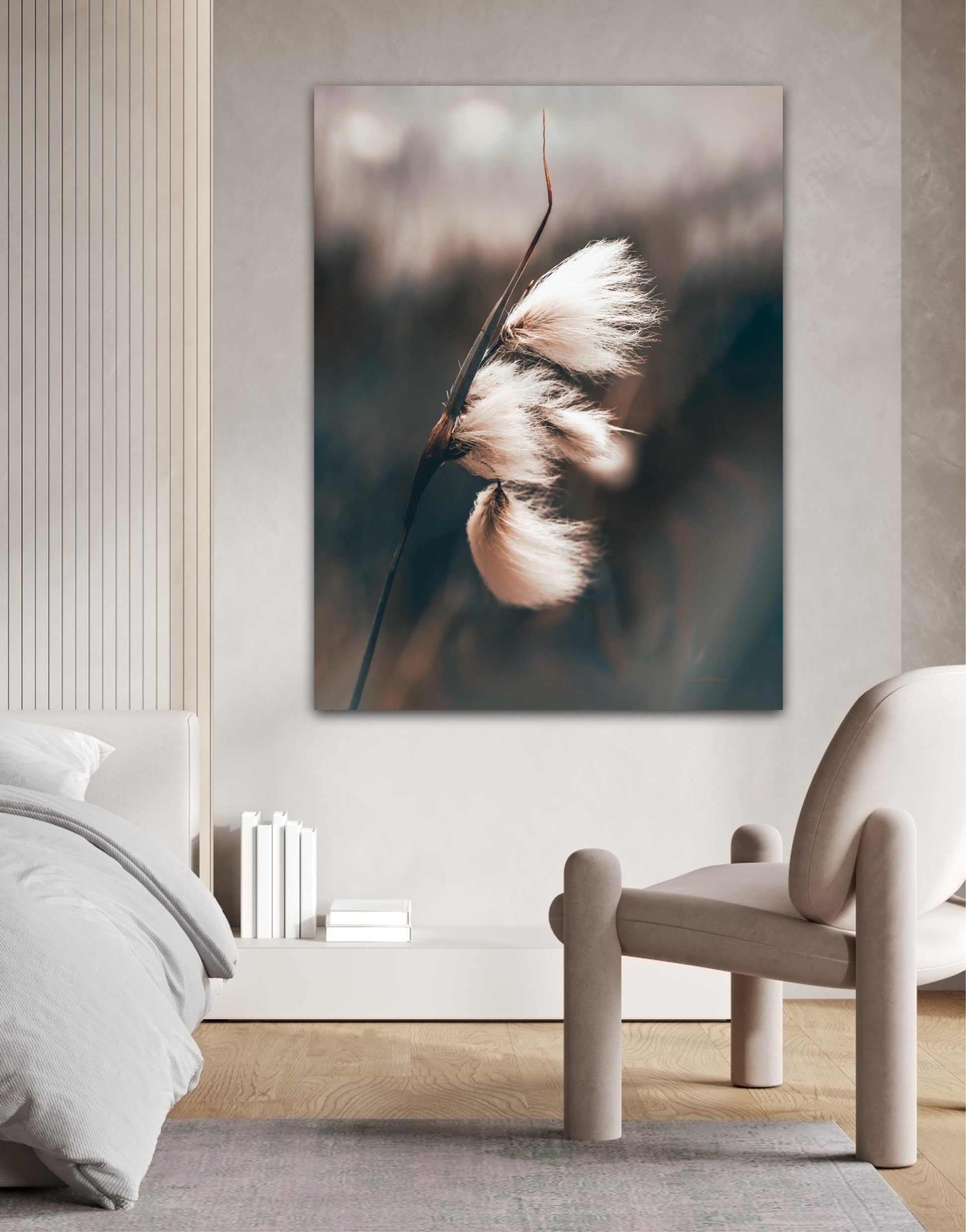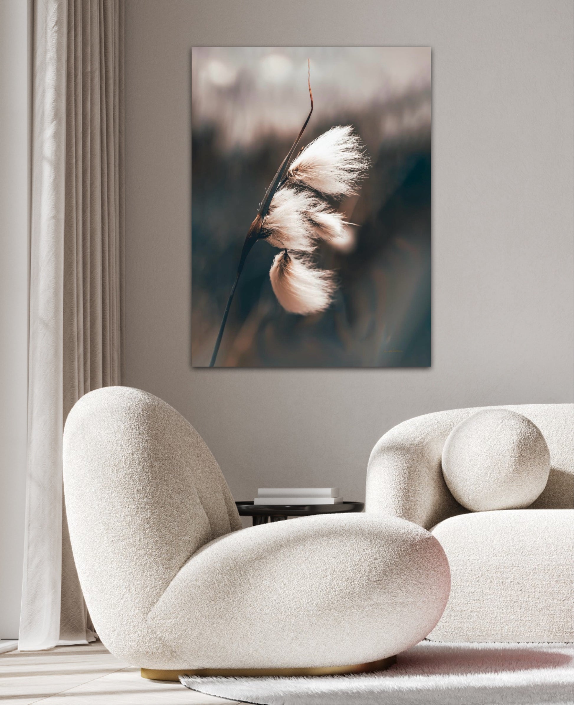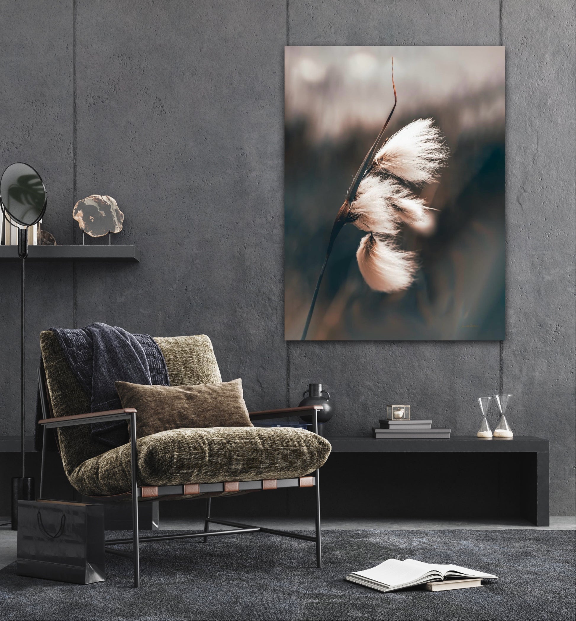 Beautiful and warm photographic art image of cottongrass in the mountain in wonderful earth tones on a dark and light background. Beautiful and peaceful, get the good feeling with this beautiful artwork.