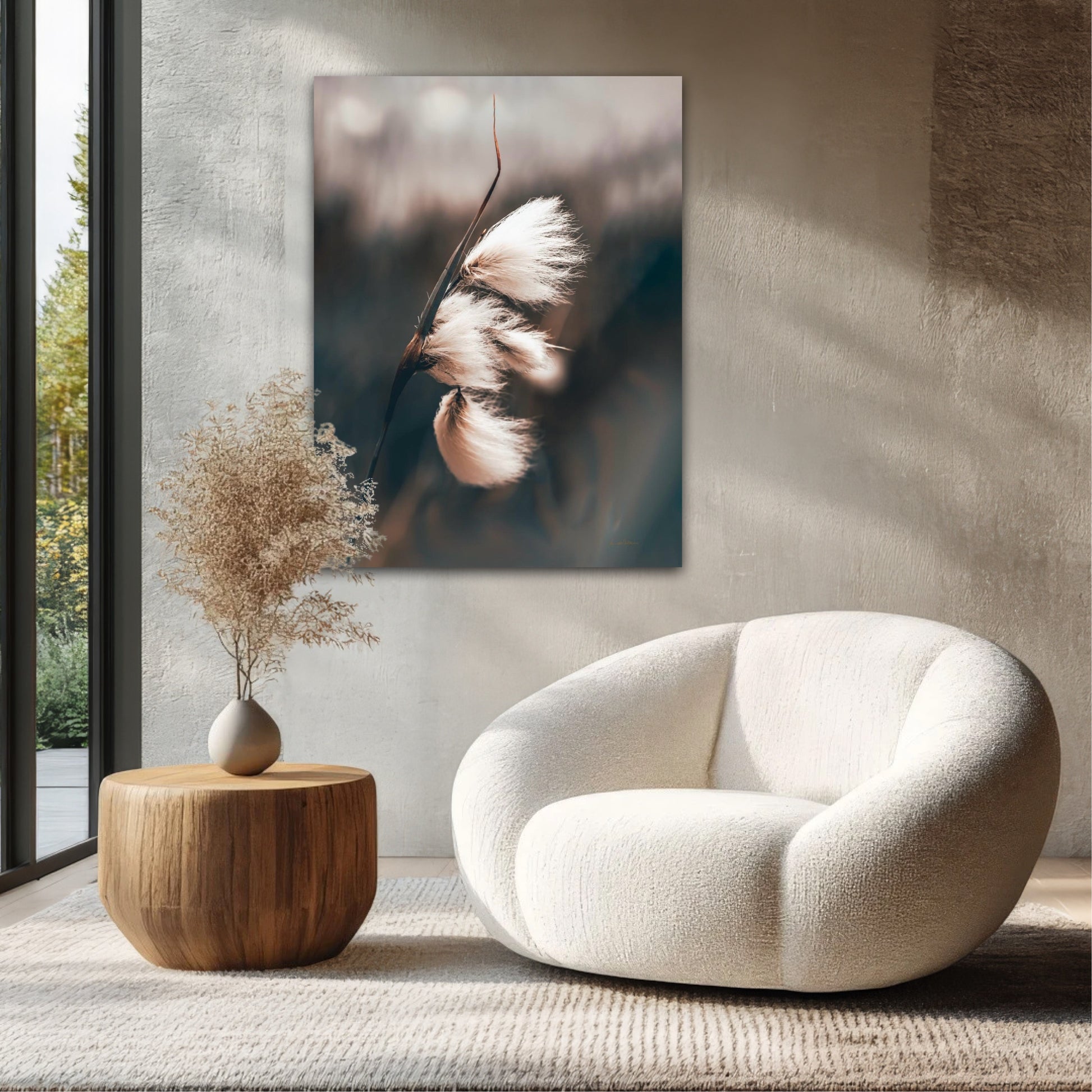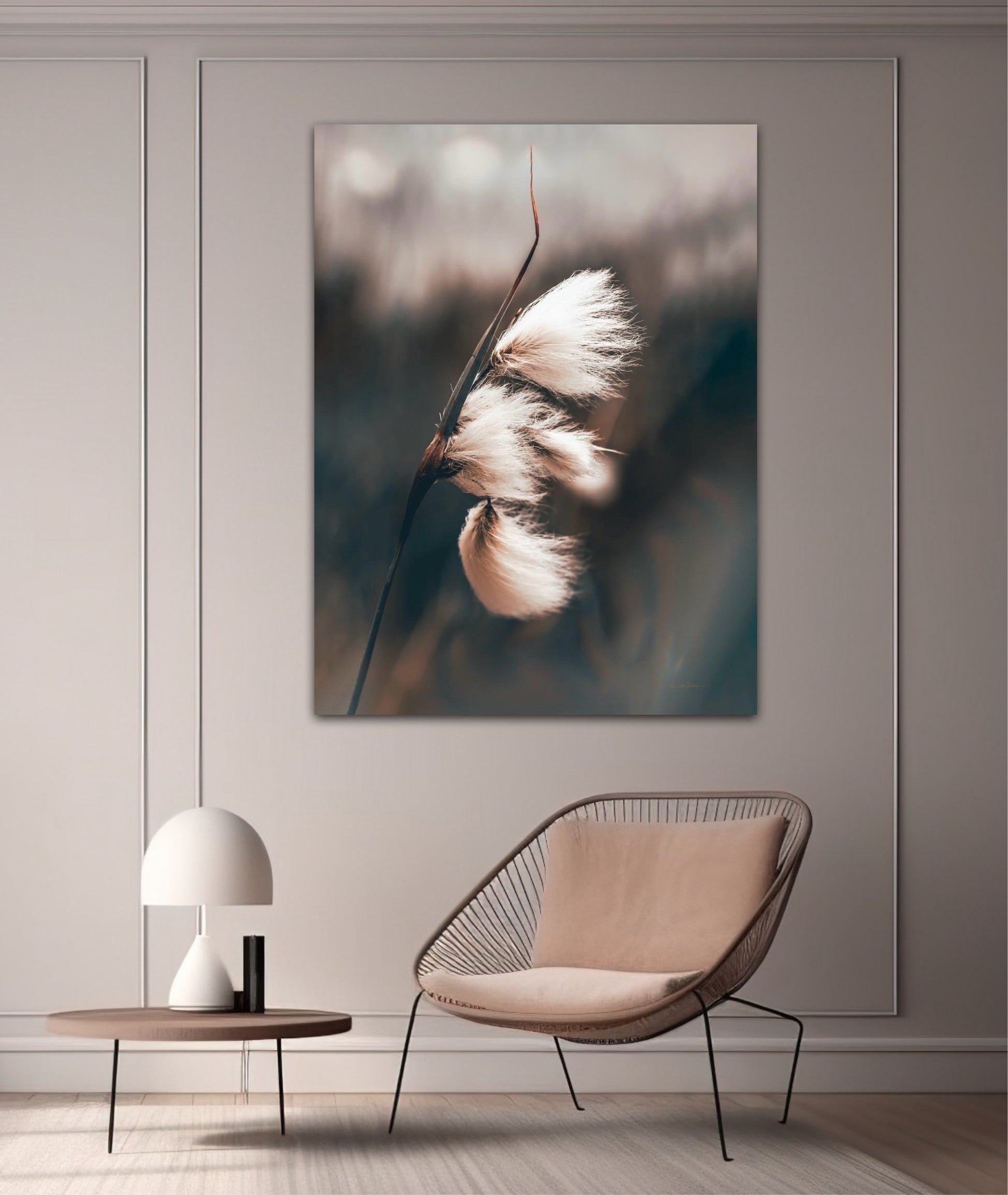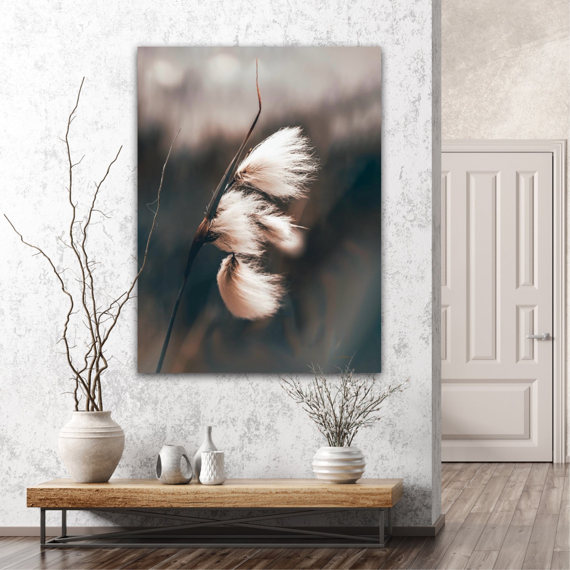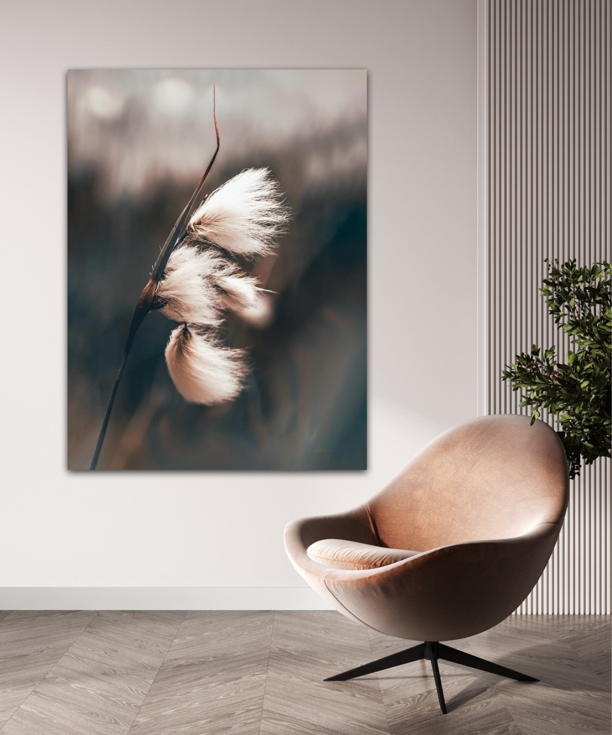 Beautiful and warm photographic art image of cottongrass in the mountain in wonderful earth tones on a dark and light background. Beautiful and peaceful, get the good feeling with this beautiful artwork.