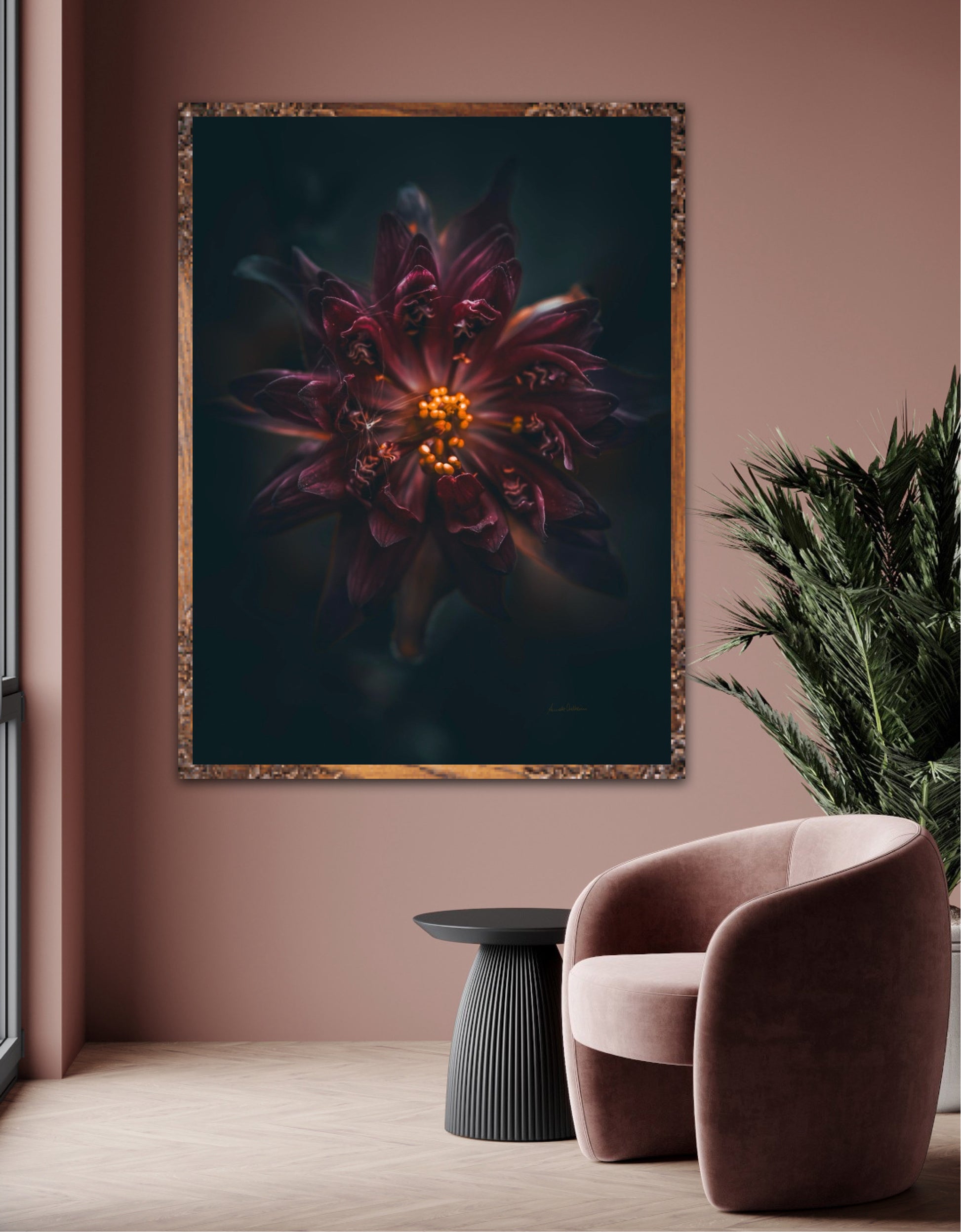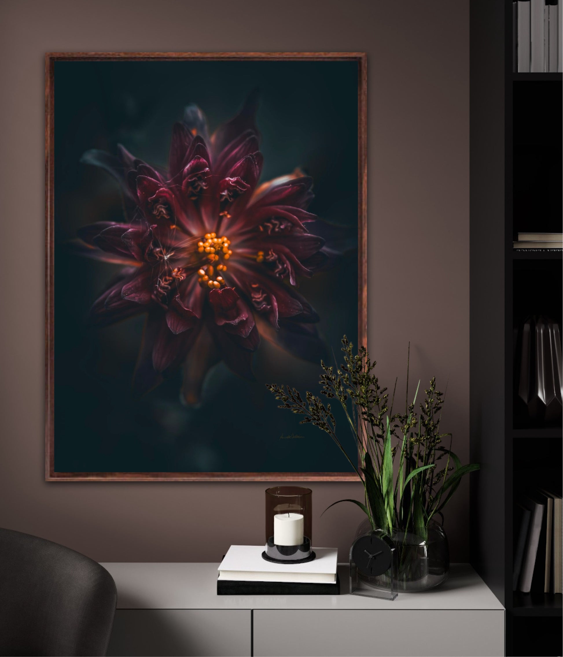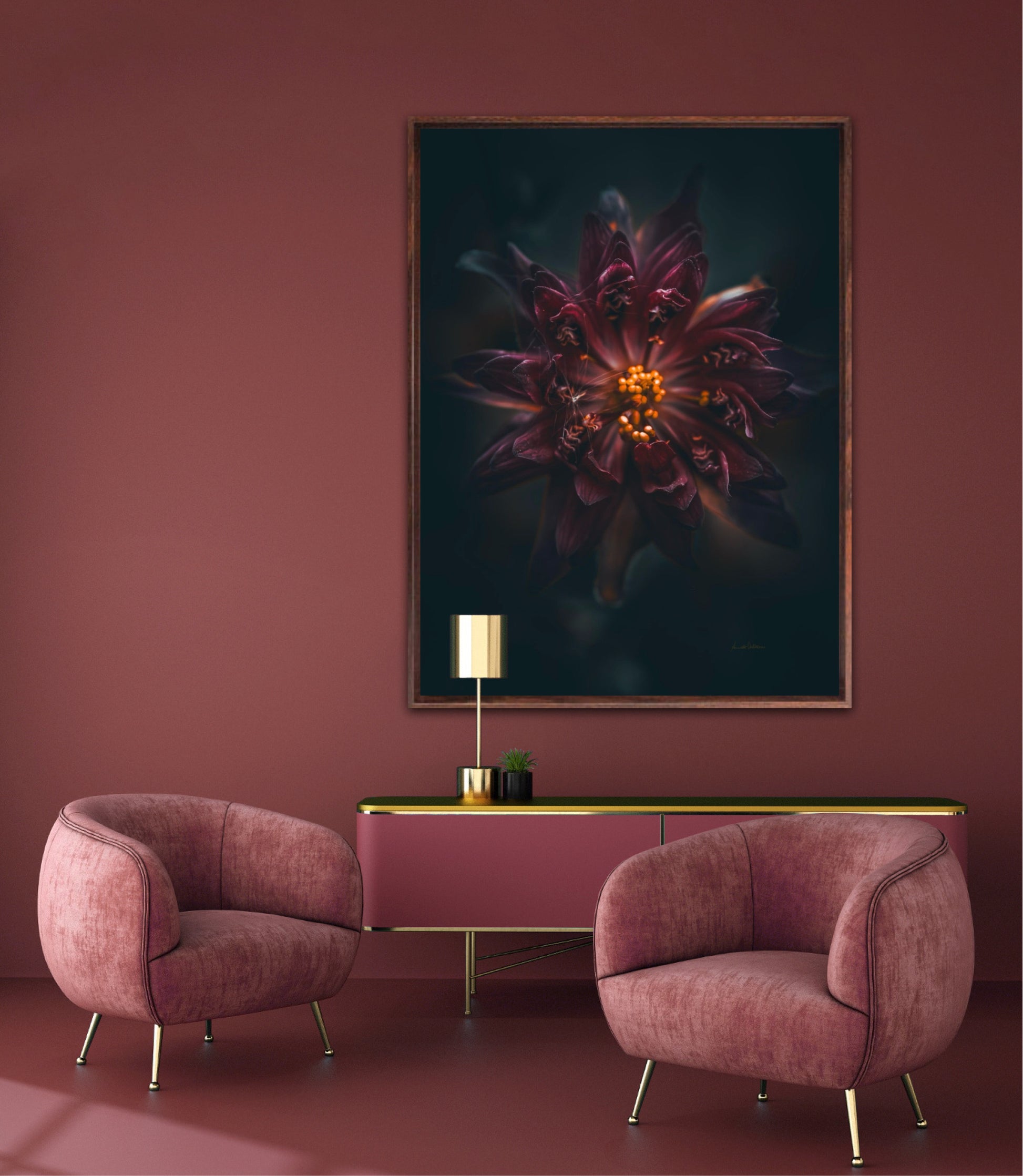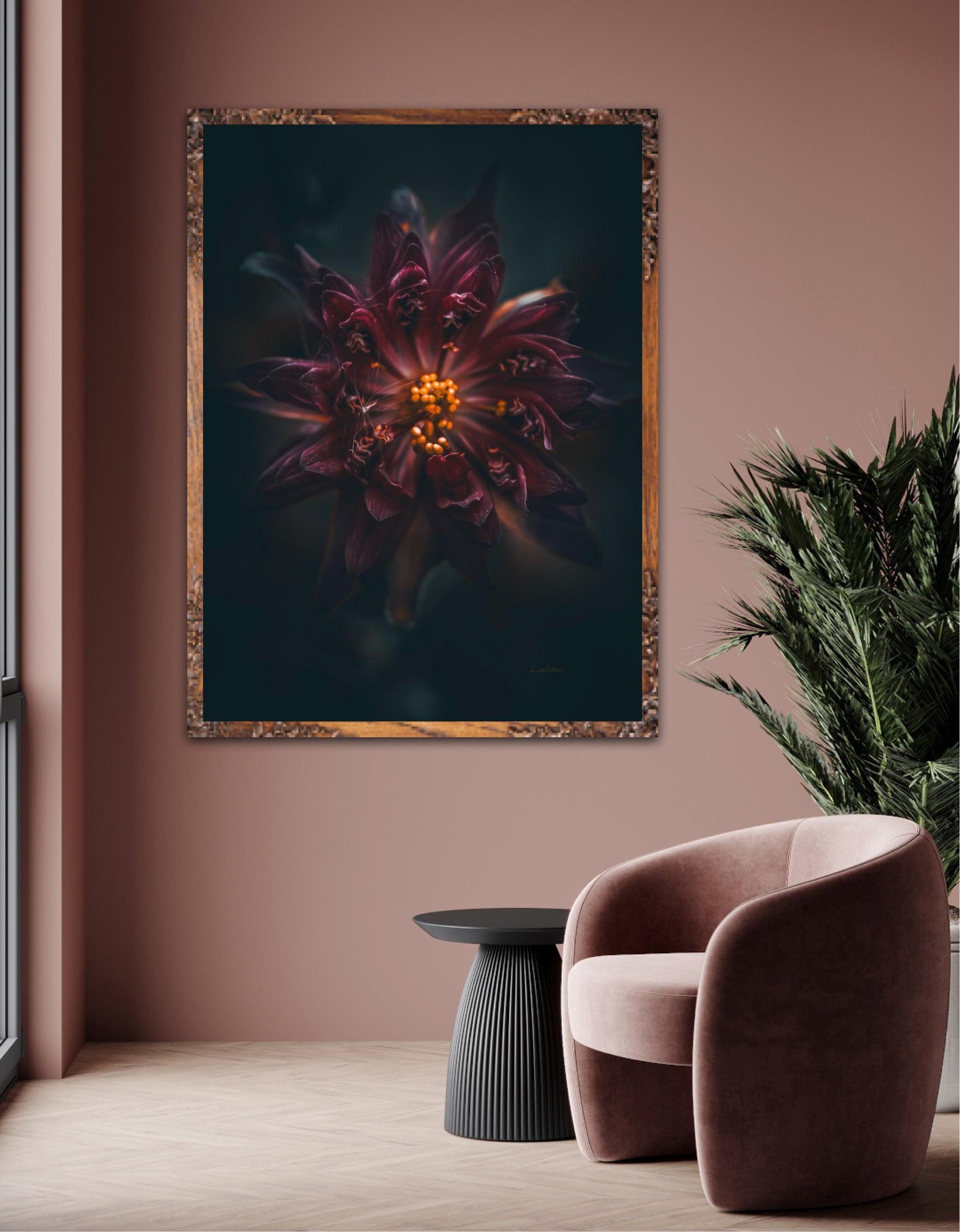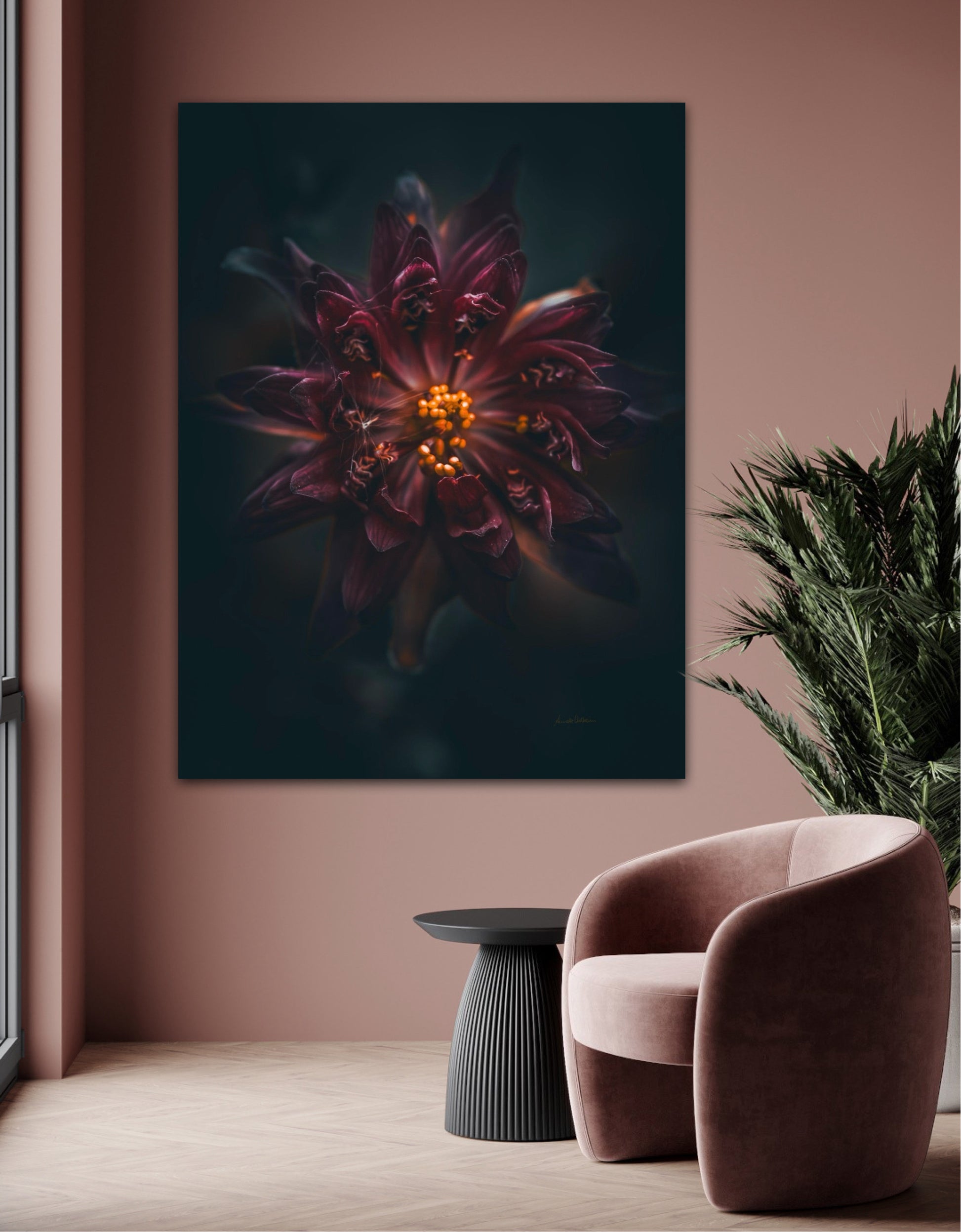 Beautiful photographic wall art of a gorgeous warm deep red-lilac flower on a dark background. This art piece will warm your heart.