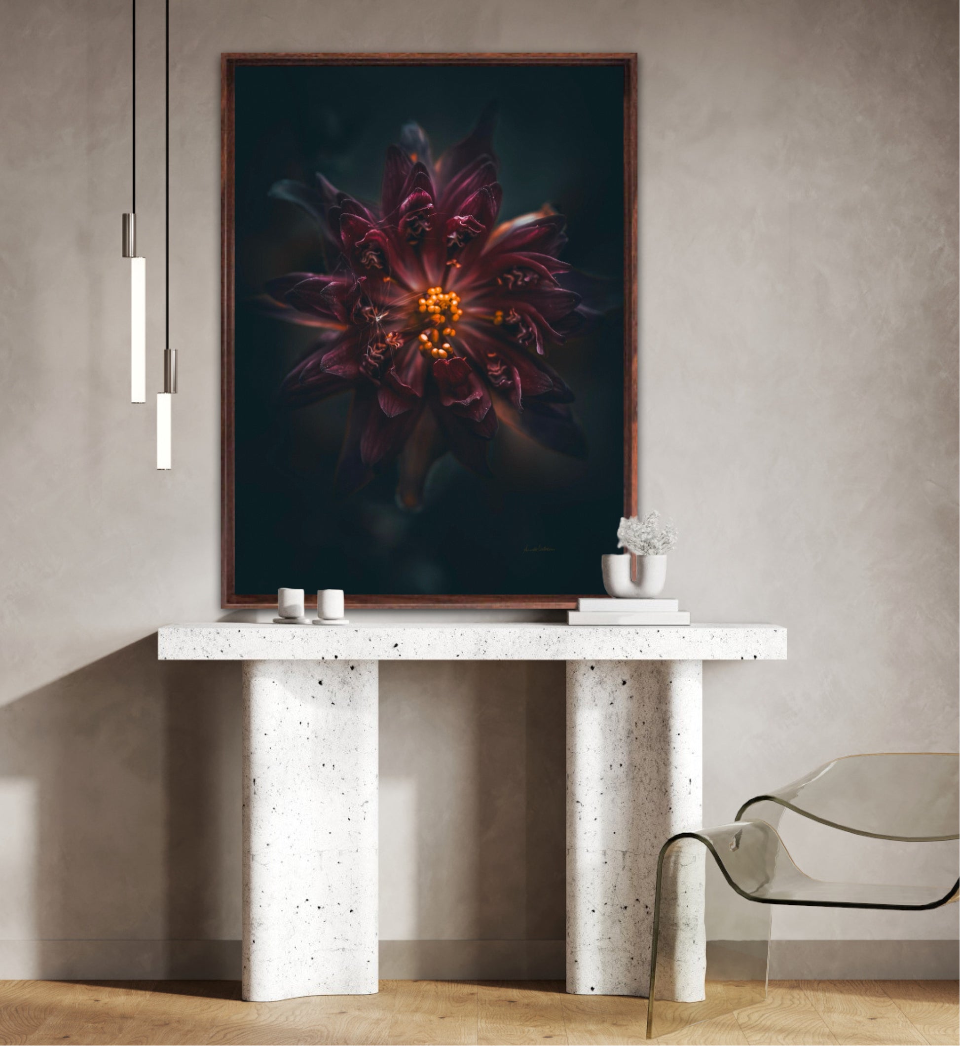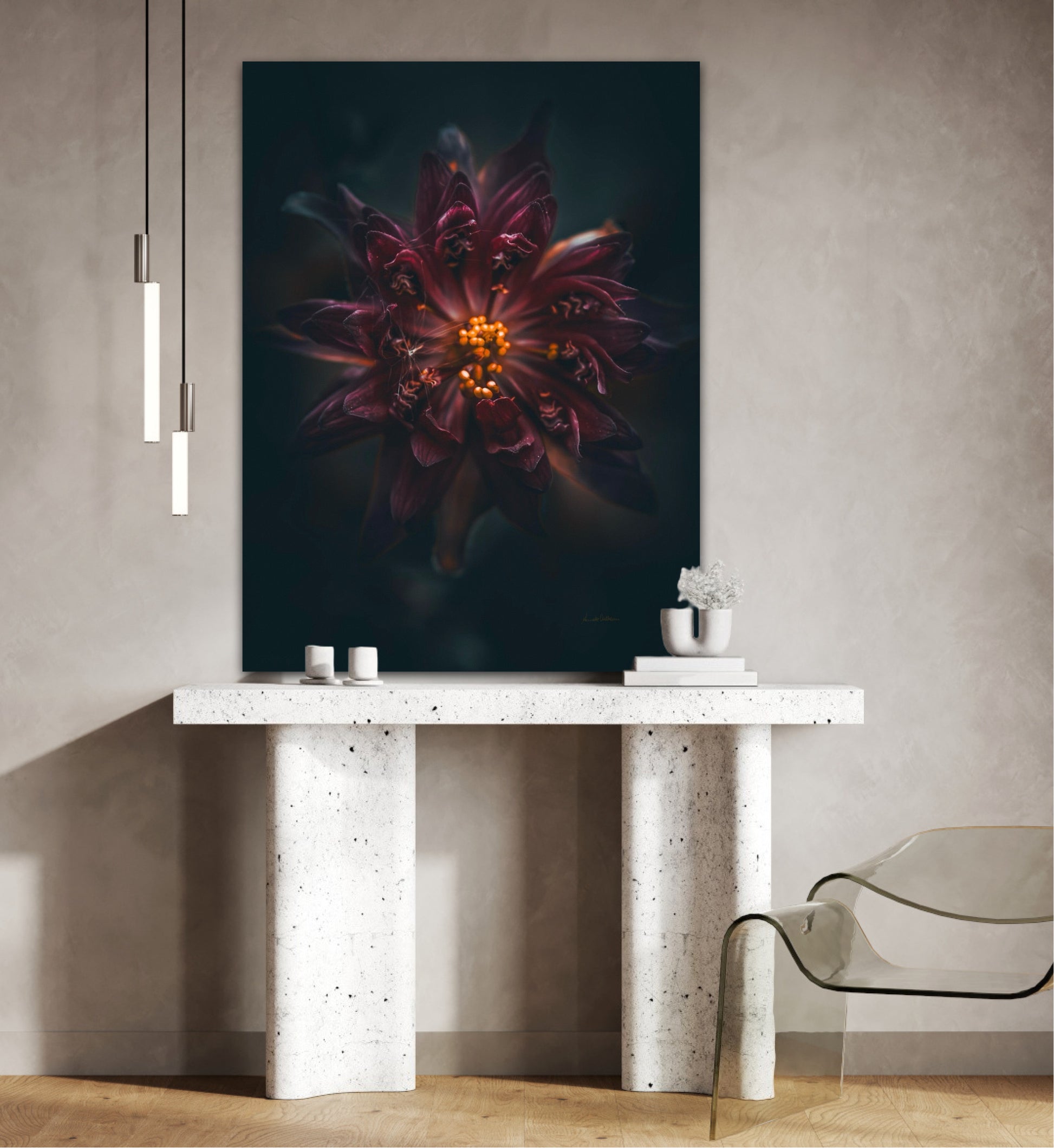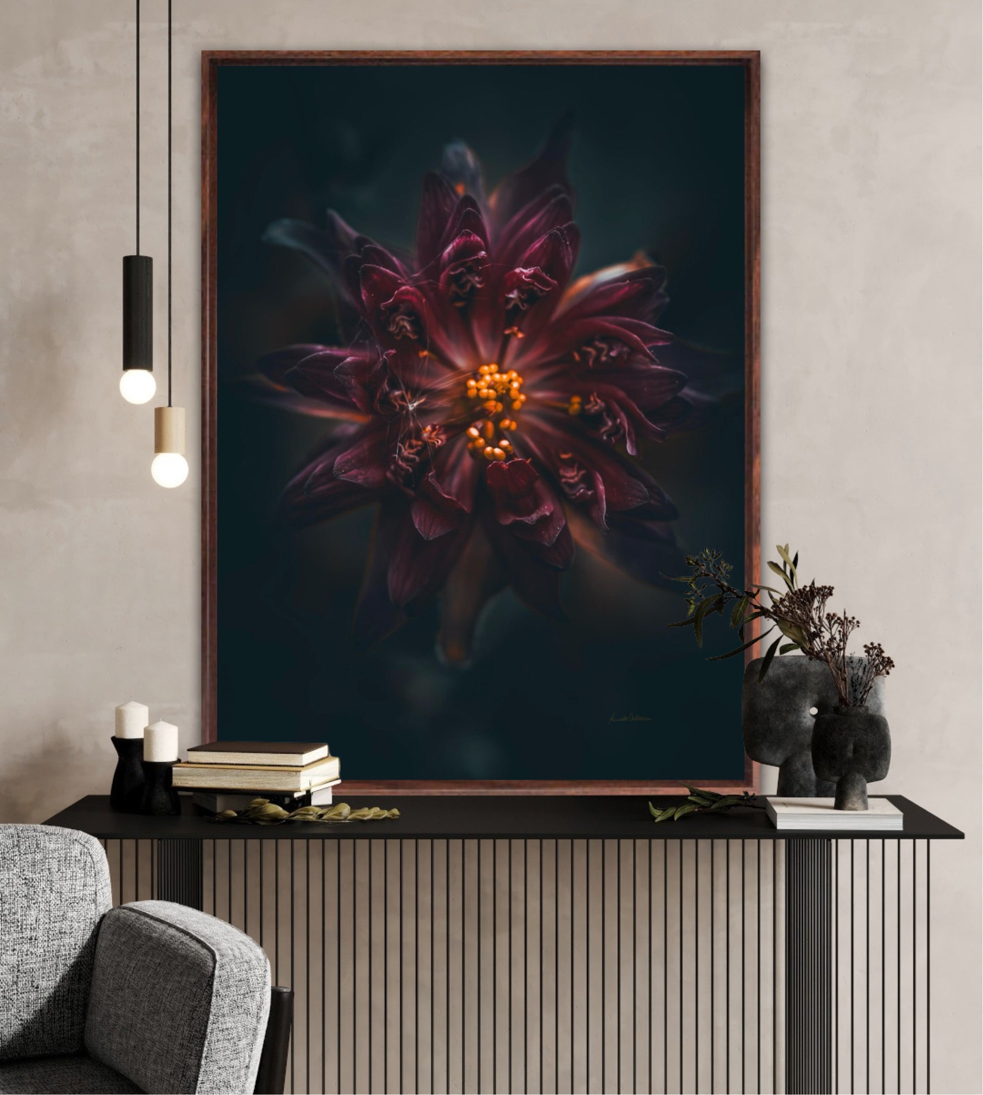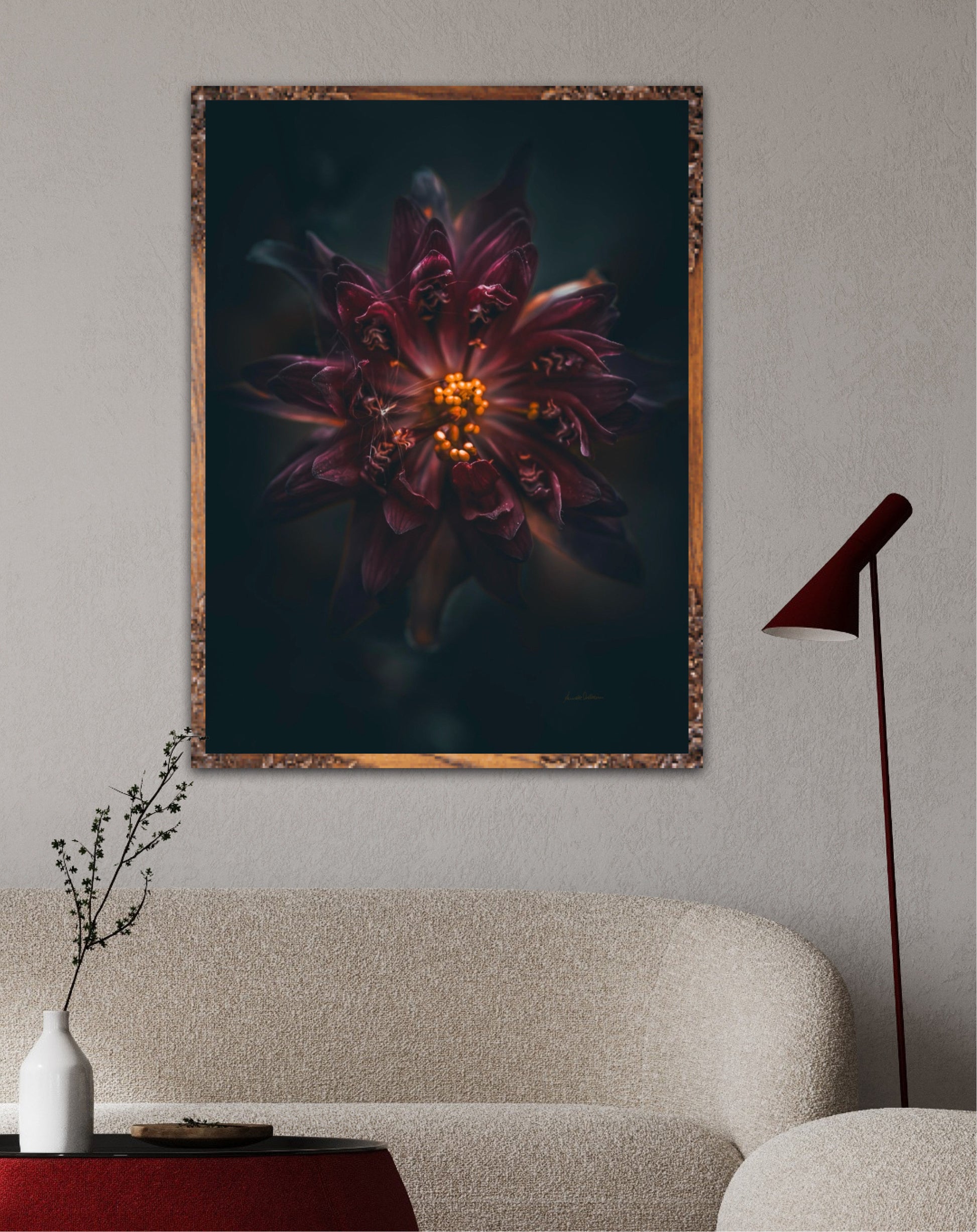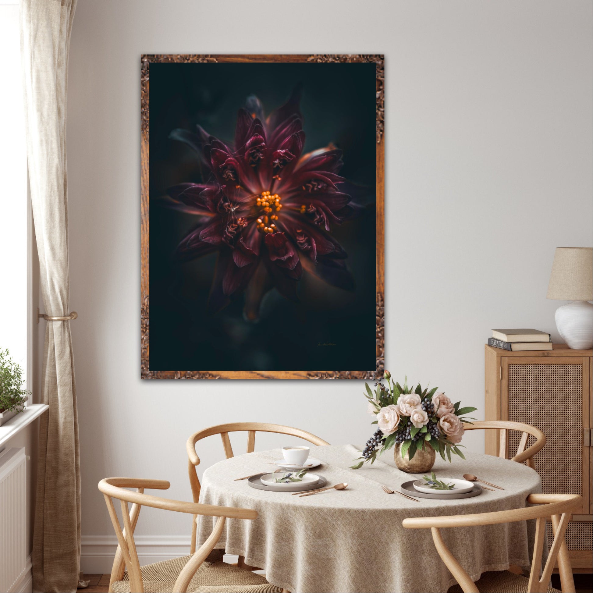 Beautiful photographic wall art of a gorgeous warm deep red-lilac flower on a dark background. This art piece will warm your heart.