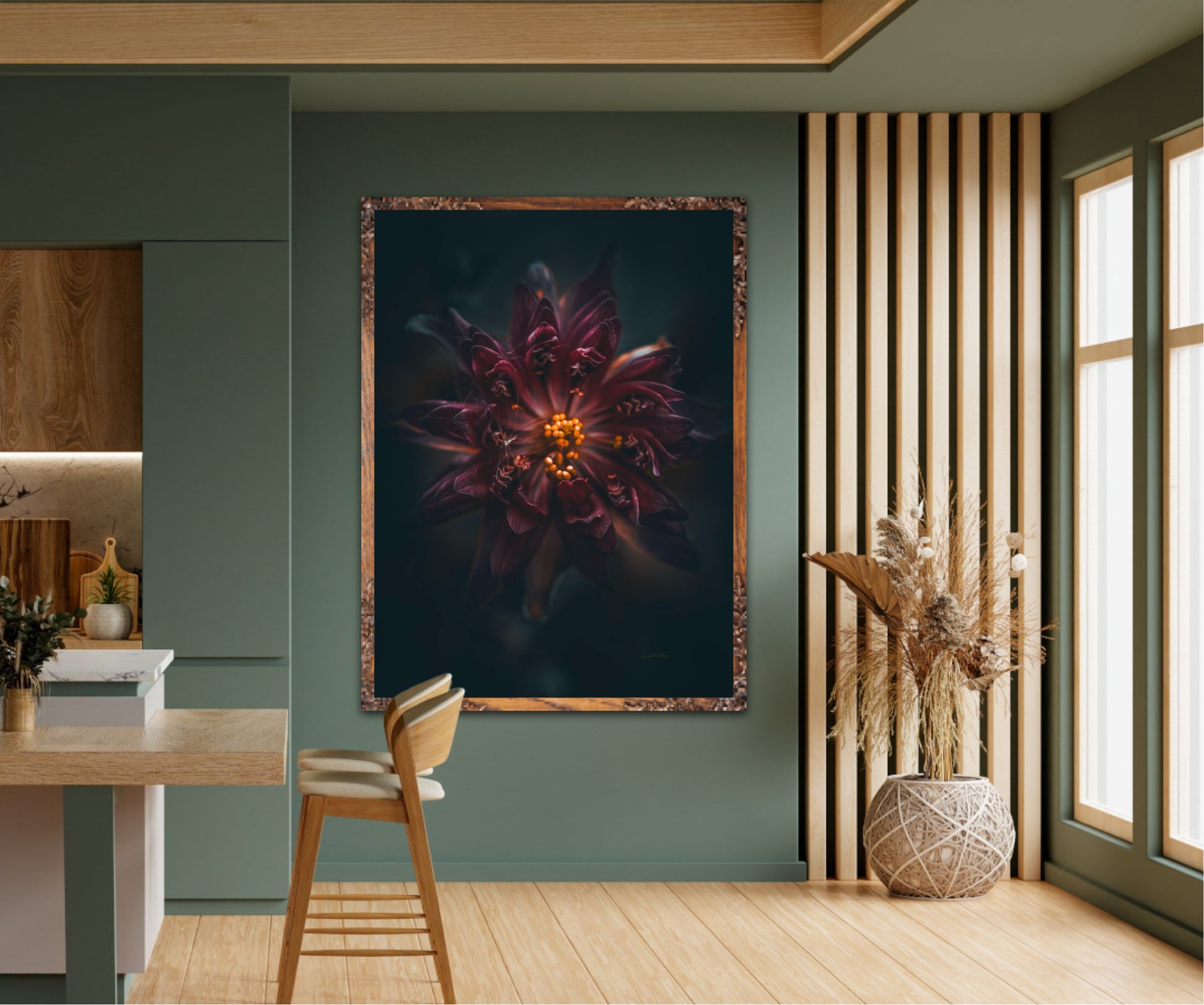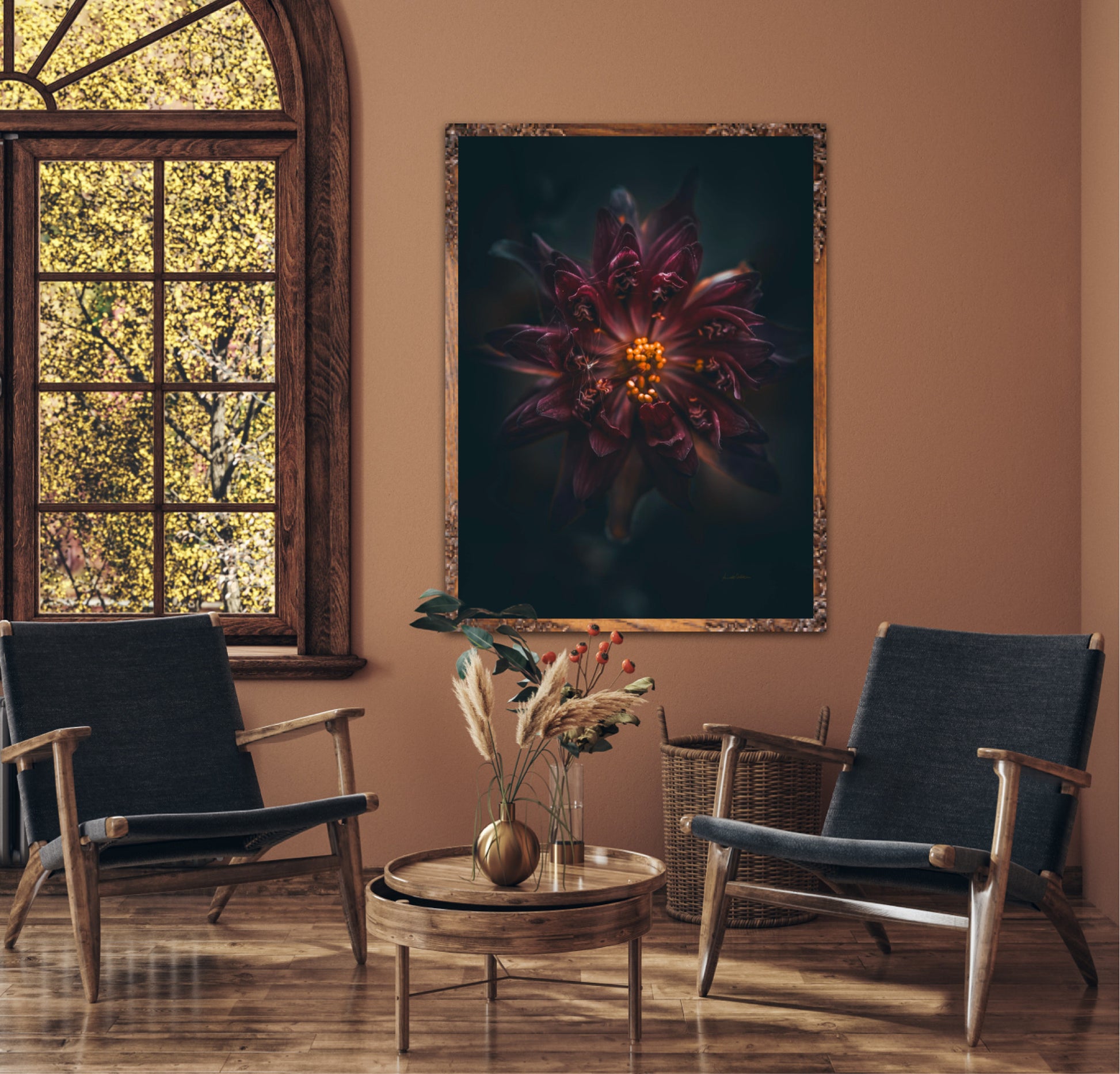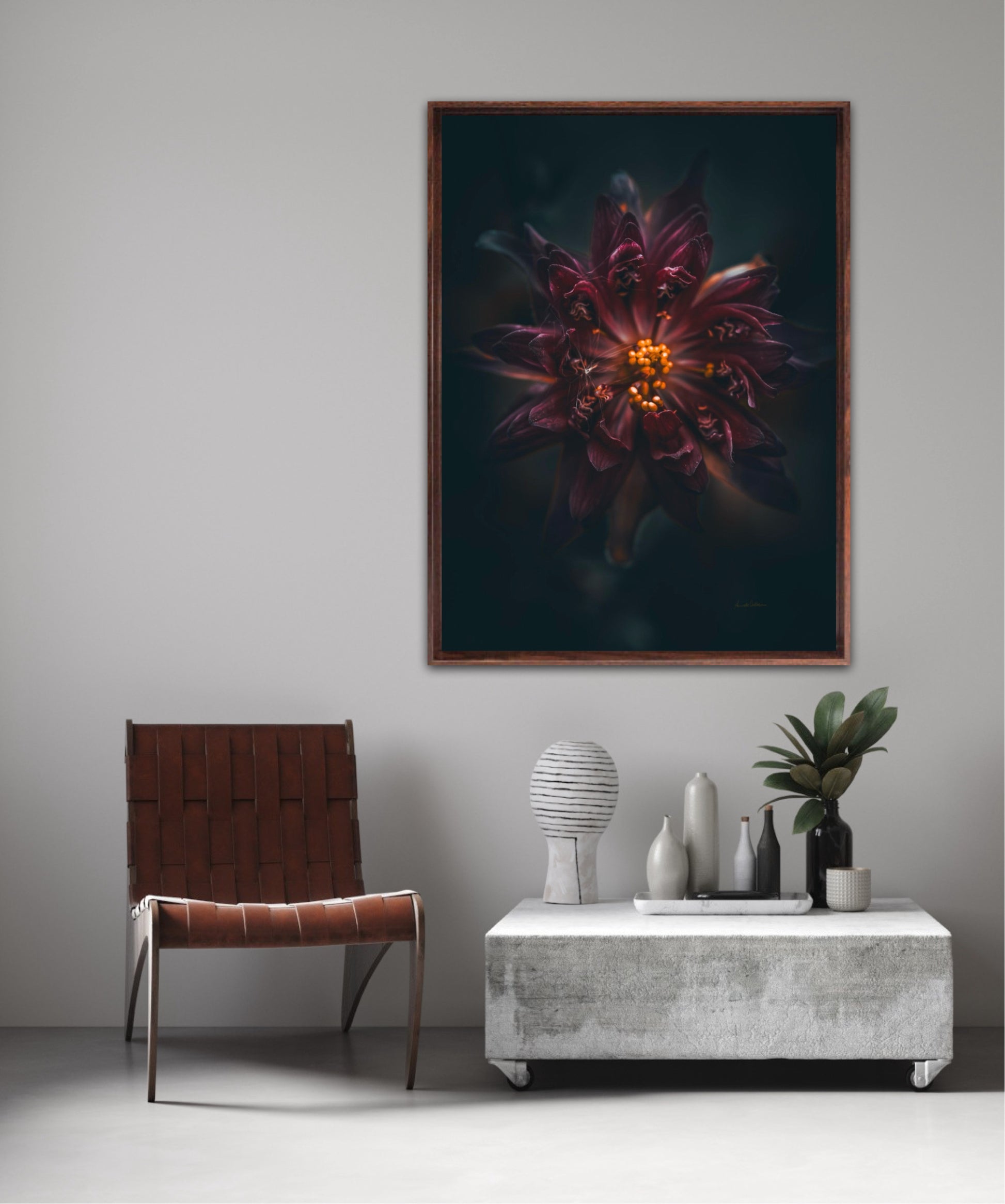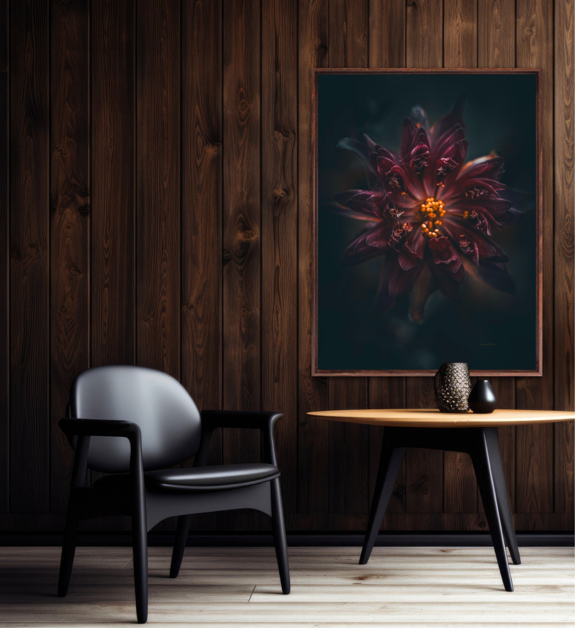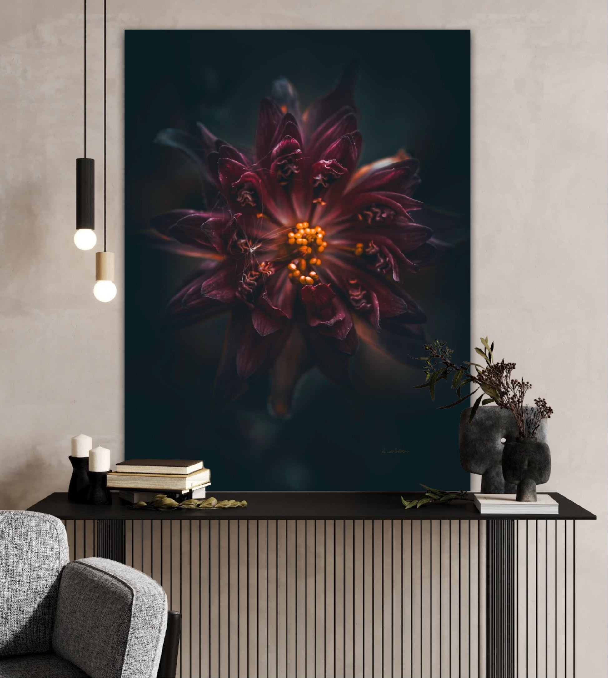 Beautiful photographic wall art of a gorgeous warm deep red-lilac flower on a dark background. This art piece will warm your heart.