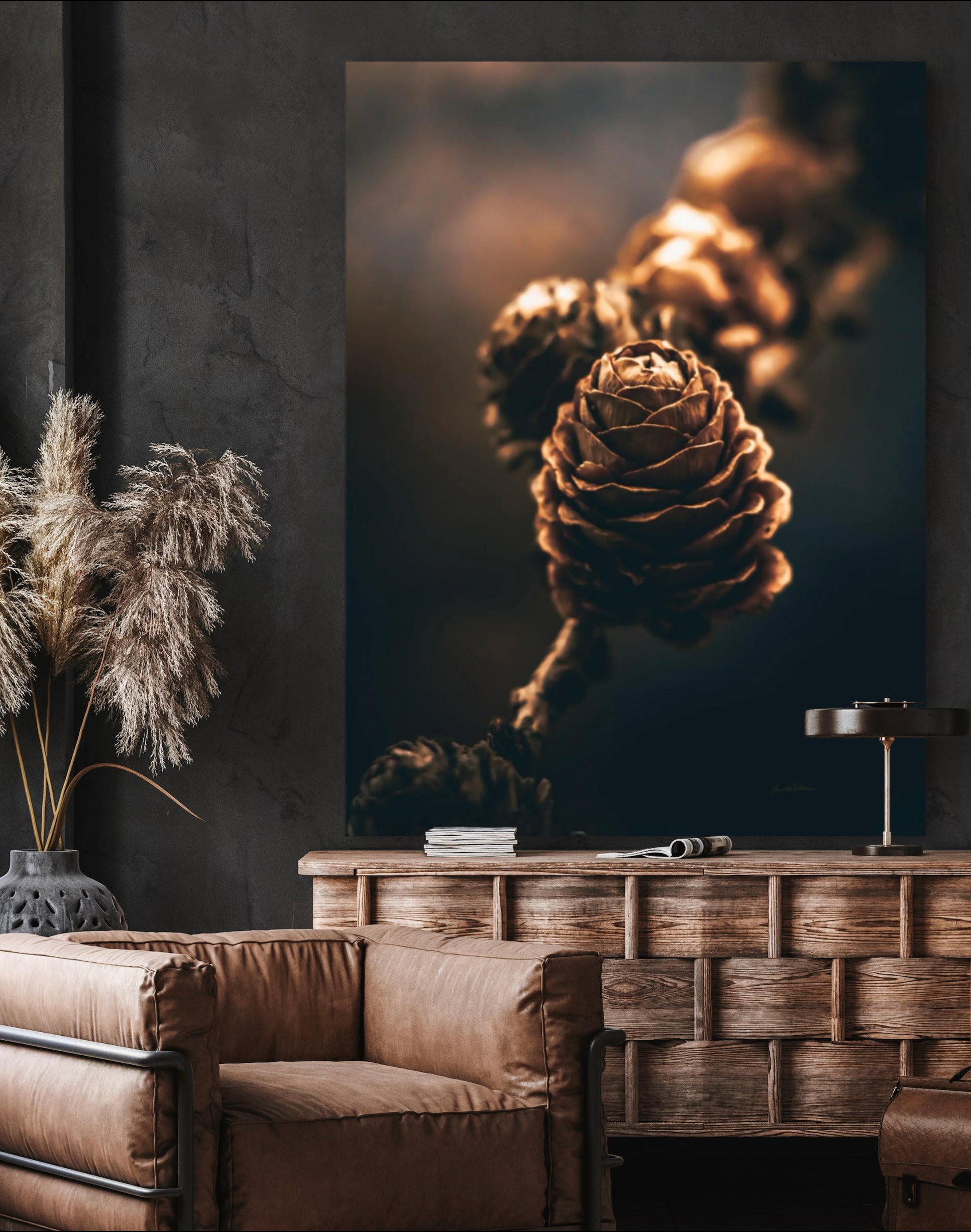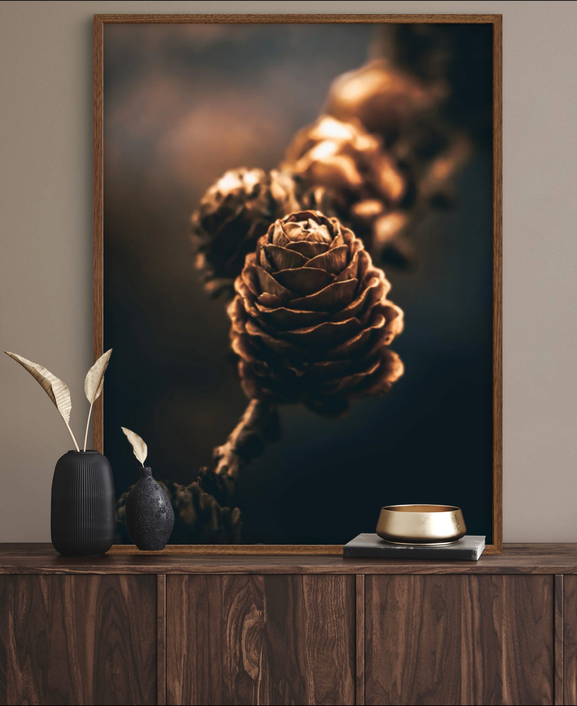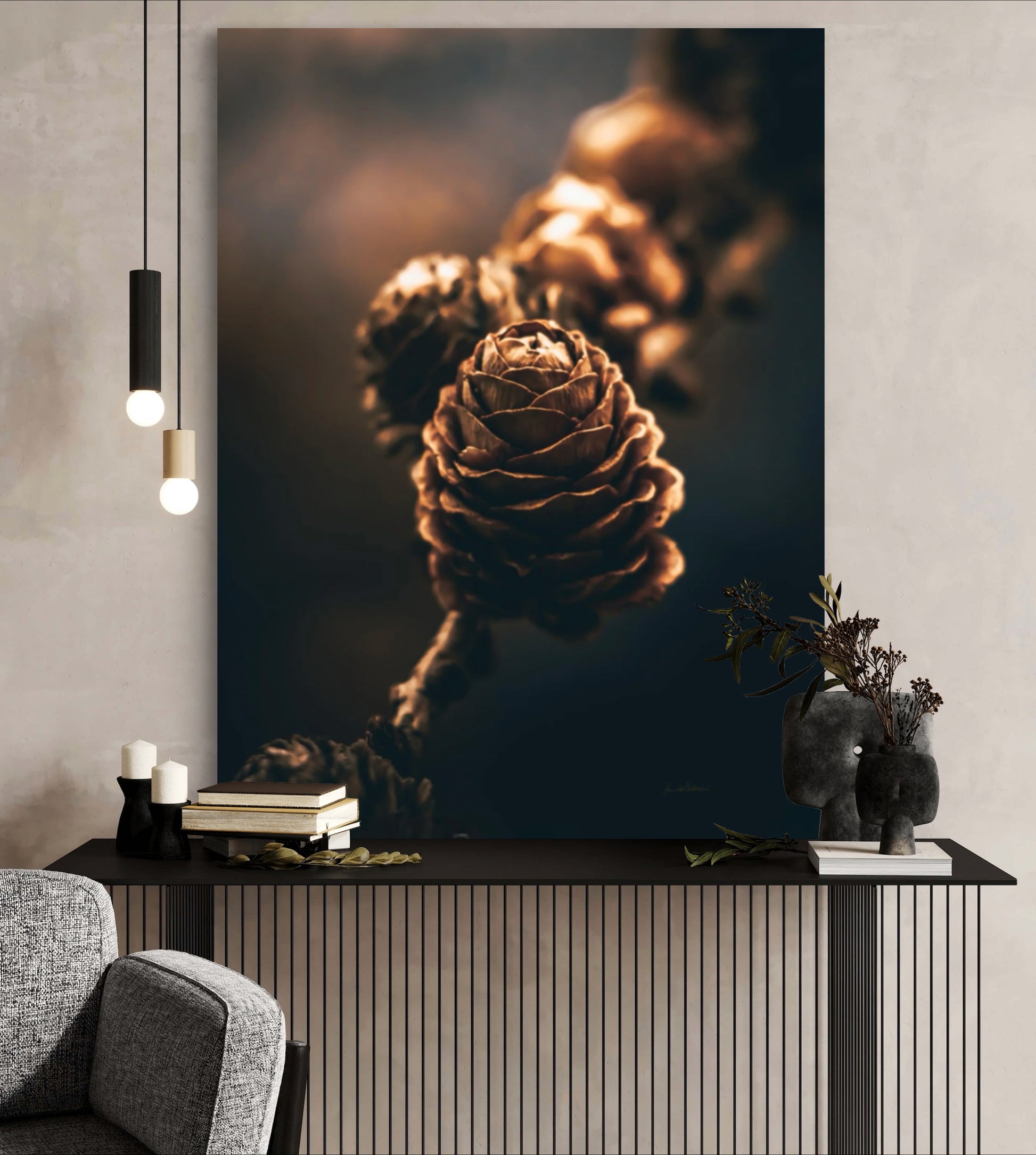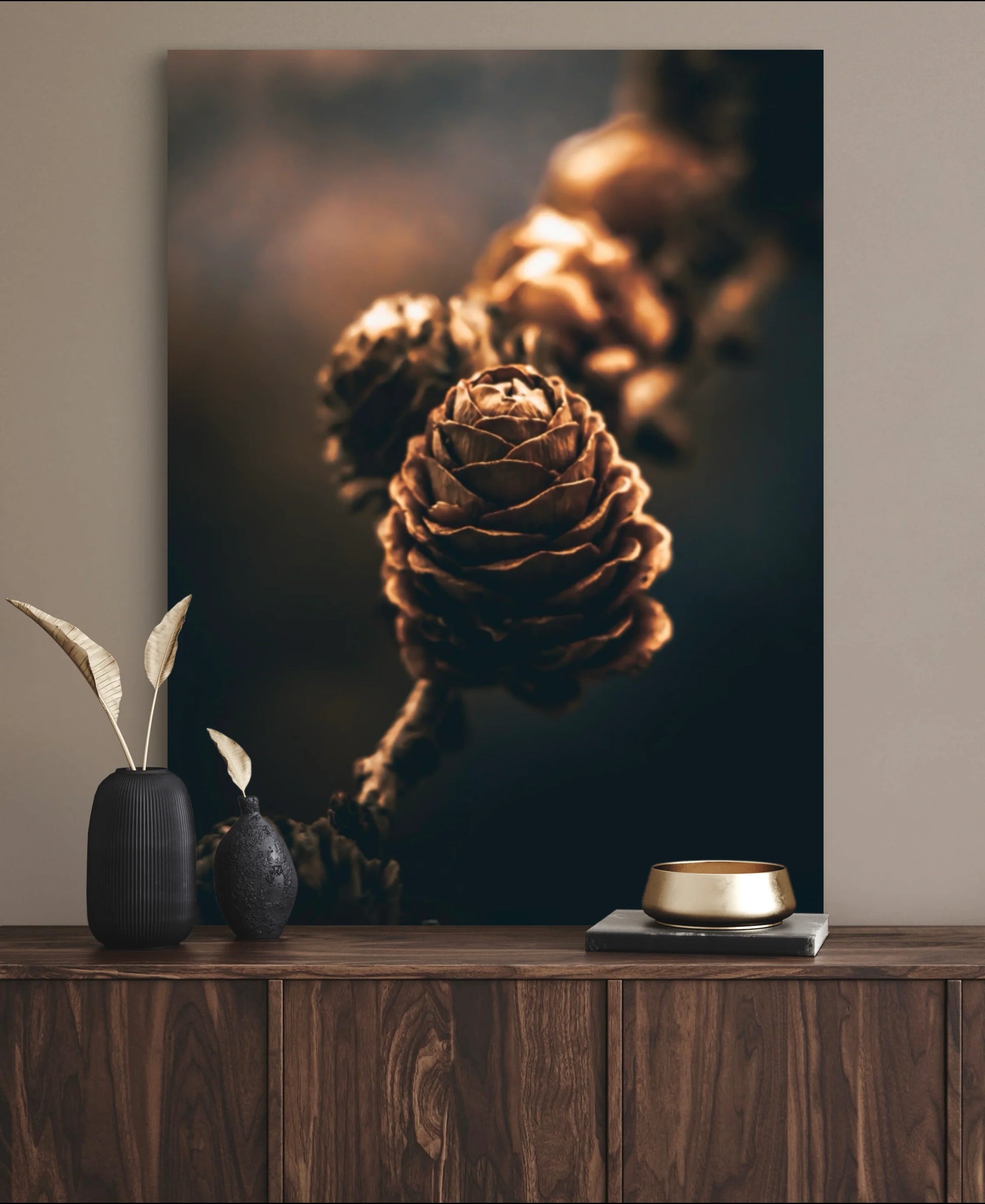 Beautiful photographic wall art of pinecones in warm, golden tones. This wall art gives your home a gorgeous cosy hygge vibe and is unique and authentic.