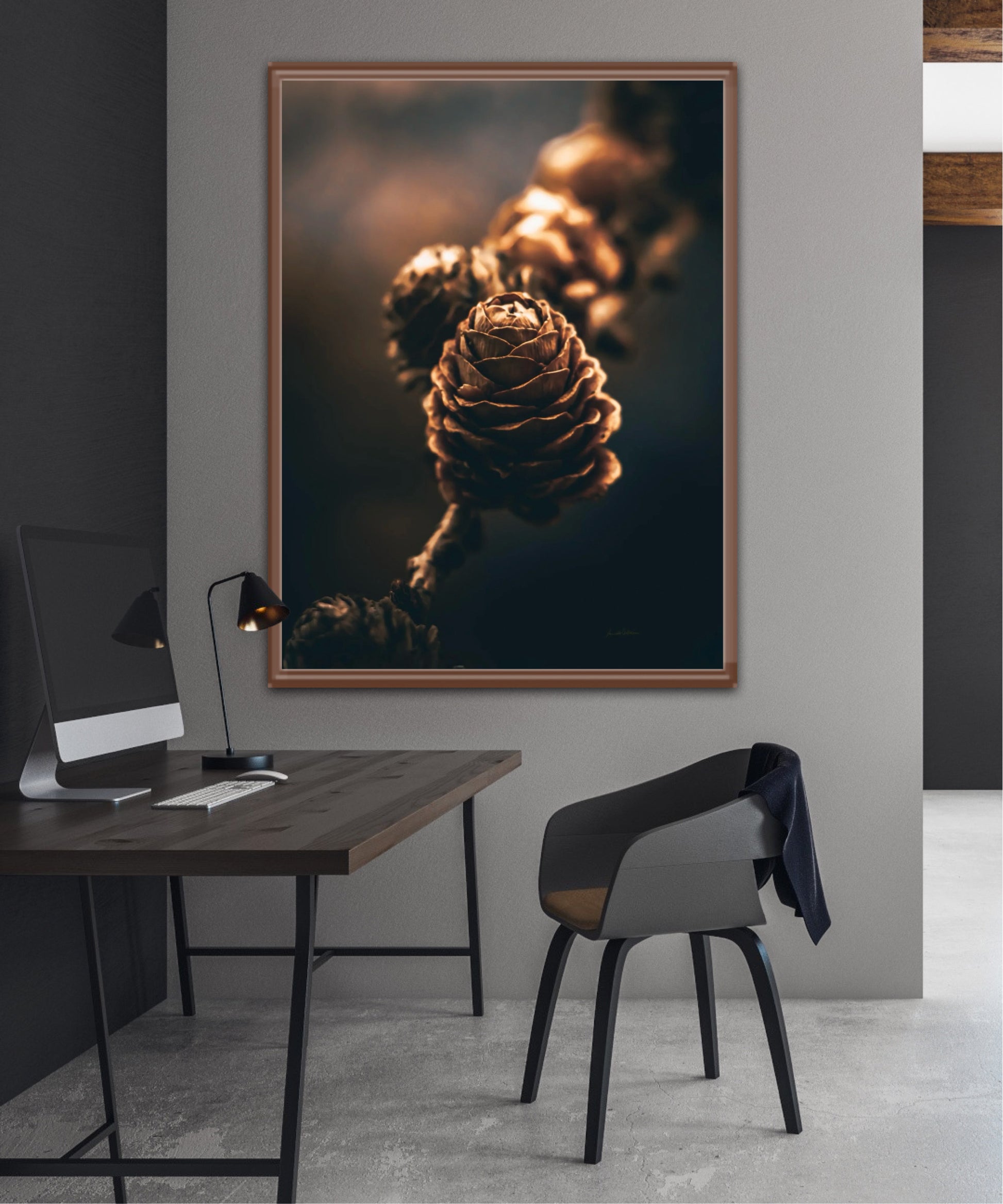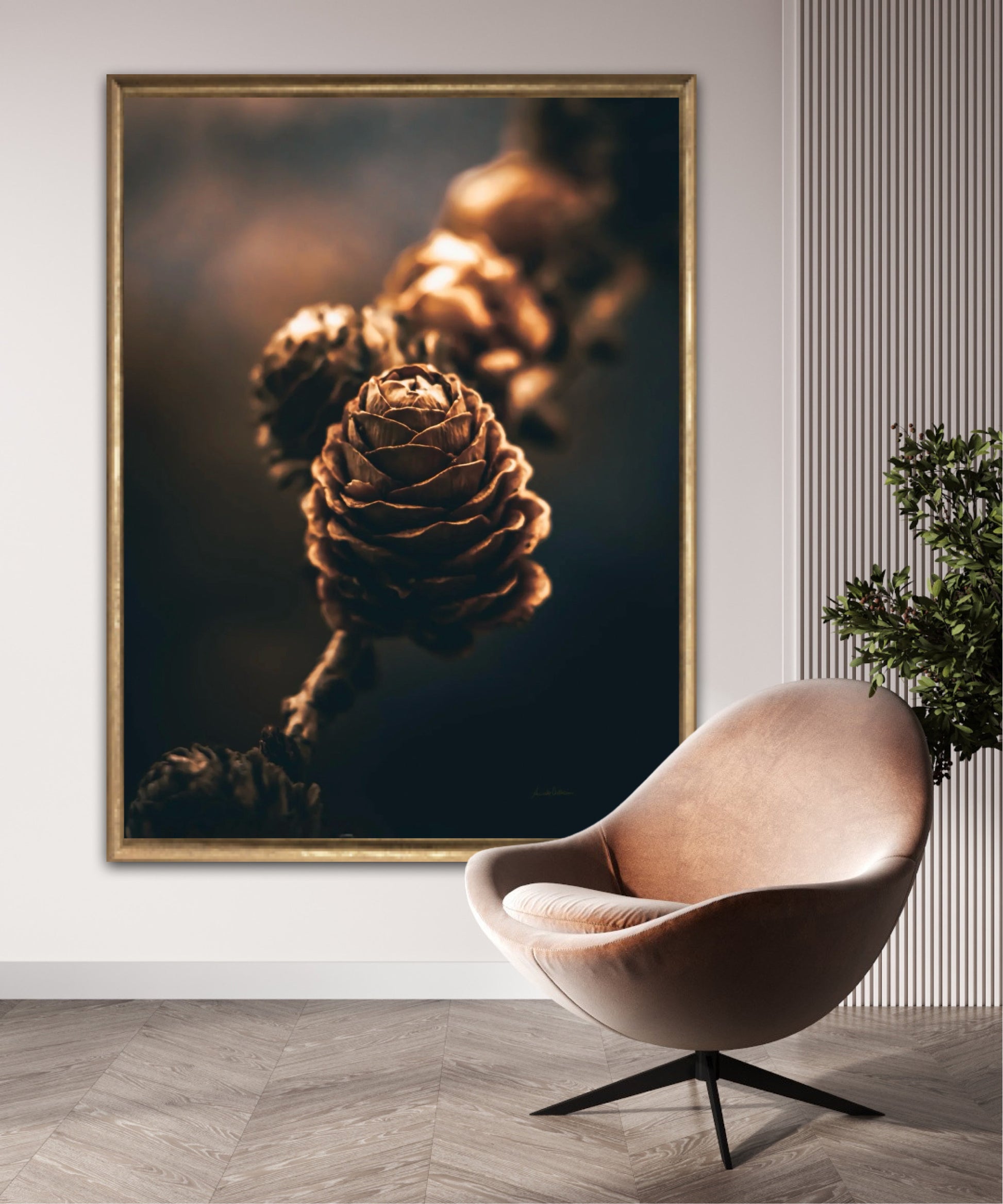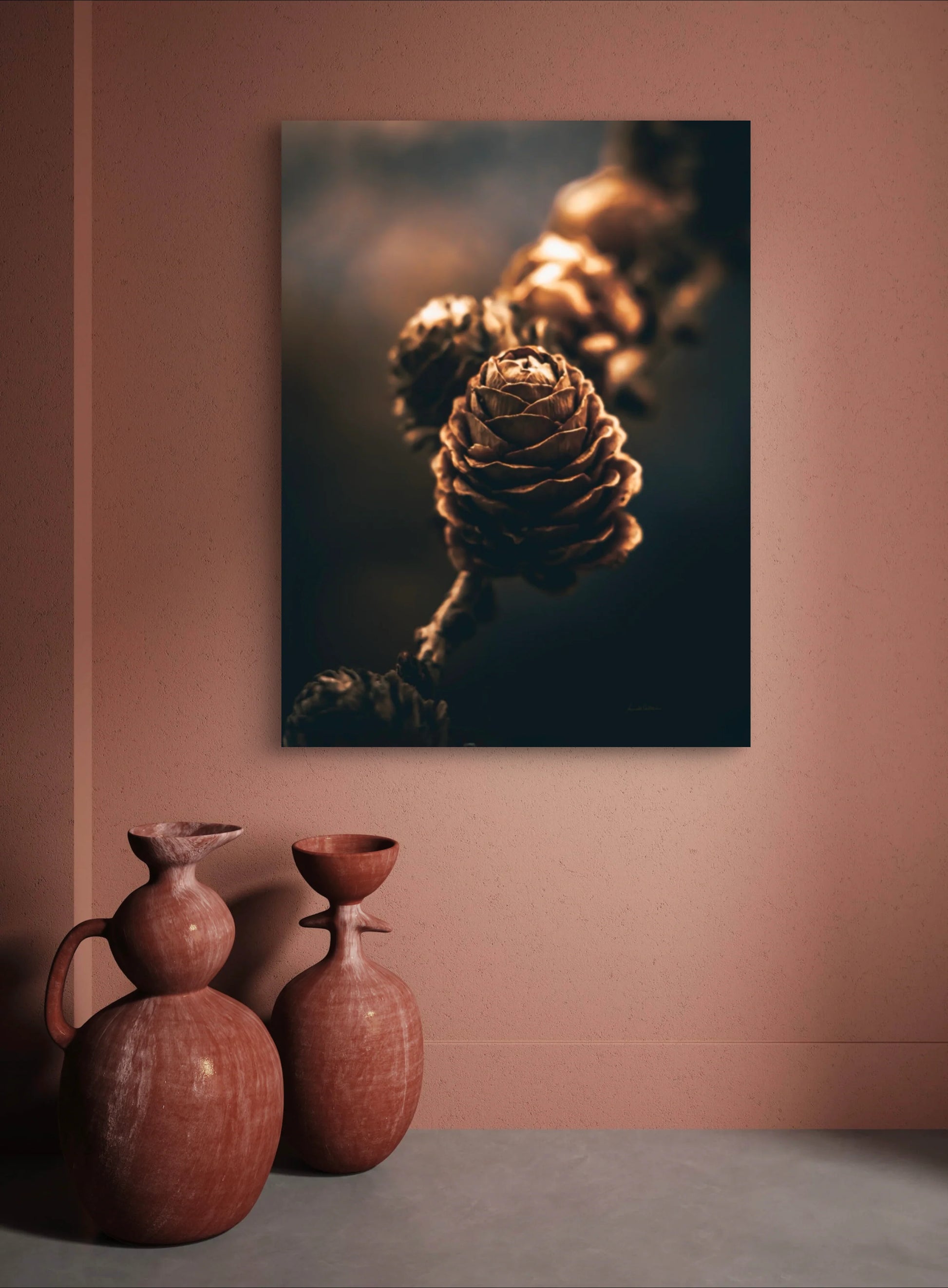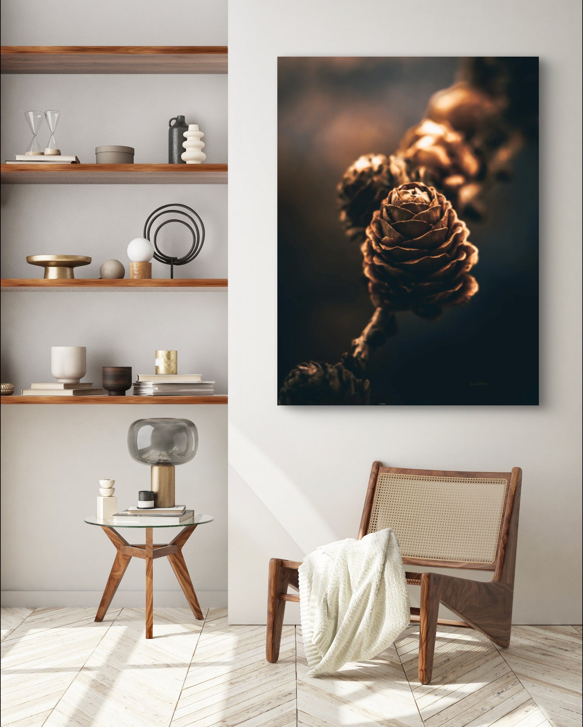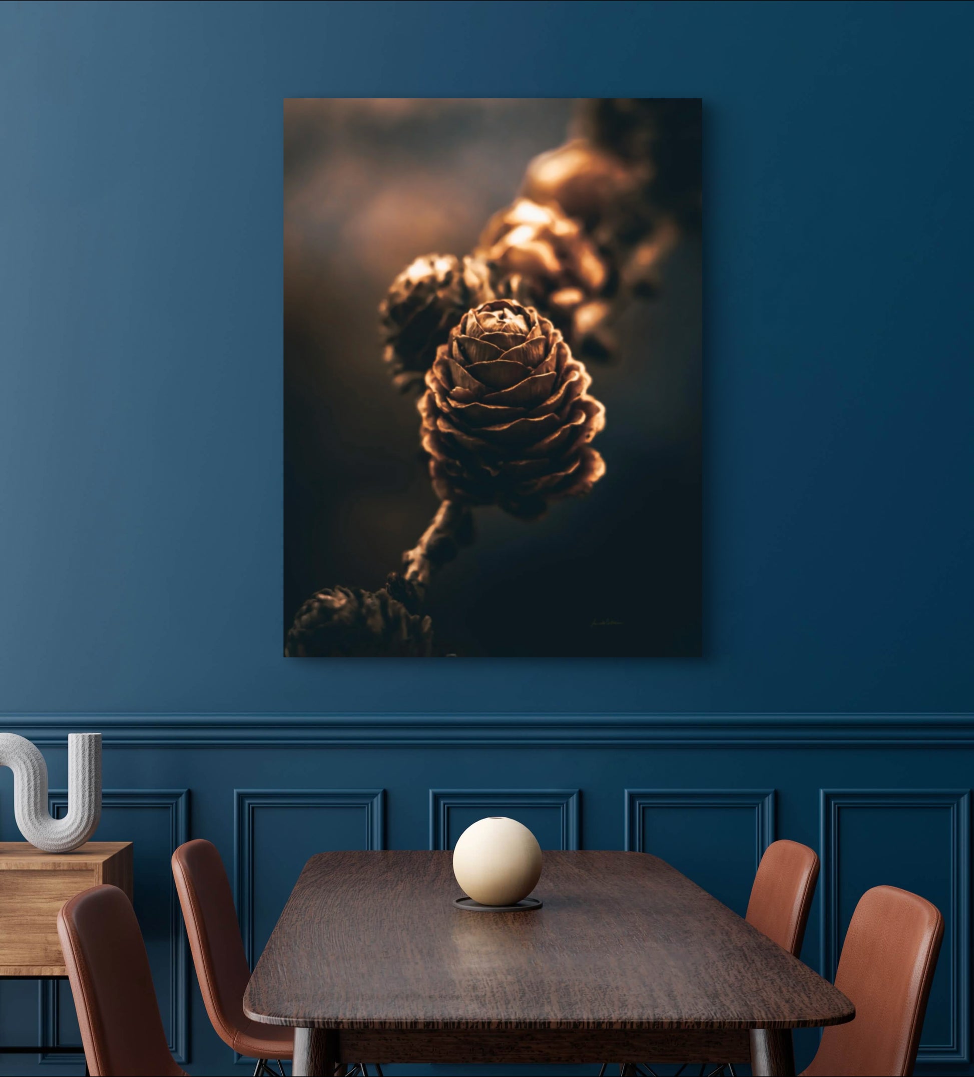 Beautiful photographic wall art of pinecones in warm, golden tones. This wall art gives your home a gorgeous cosy hygge vibe and is unique and authentic.