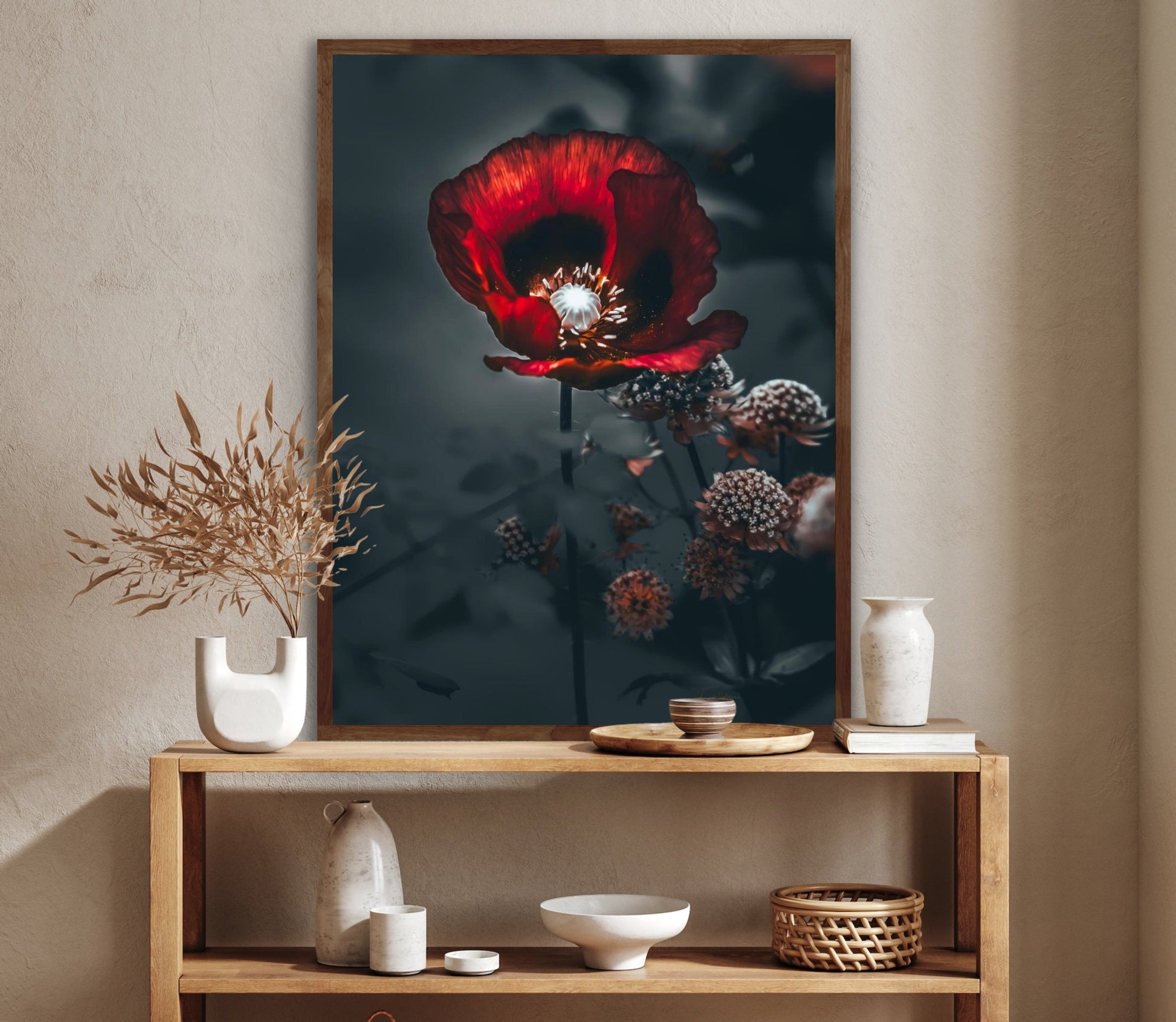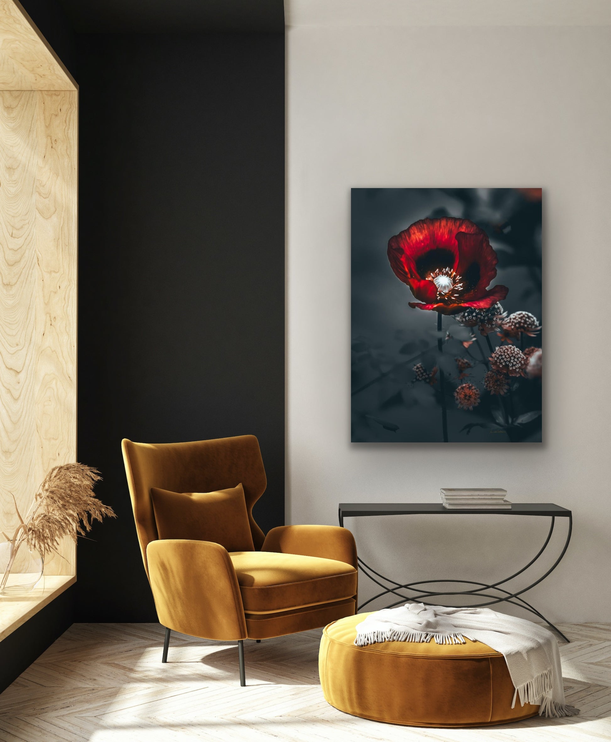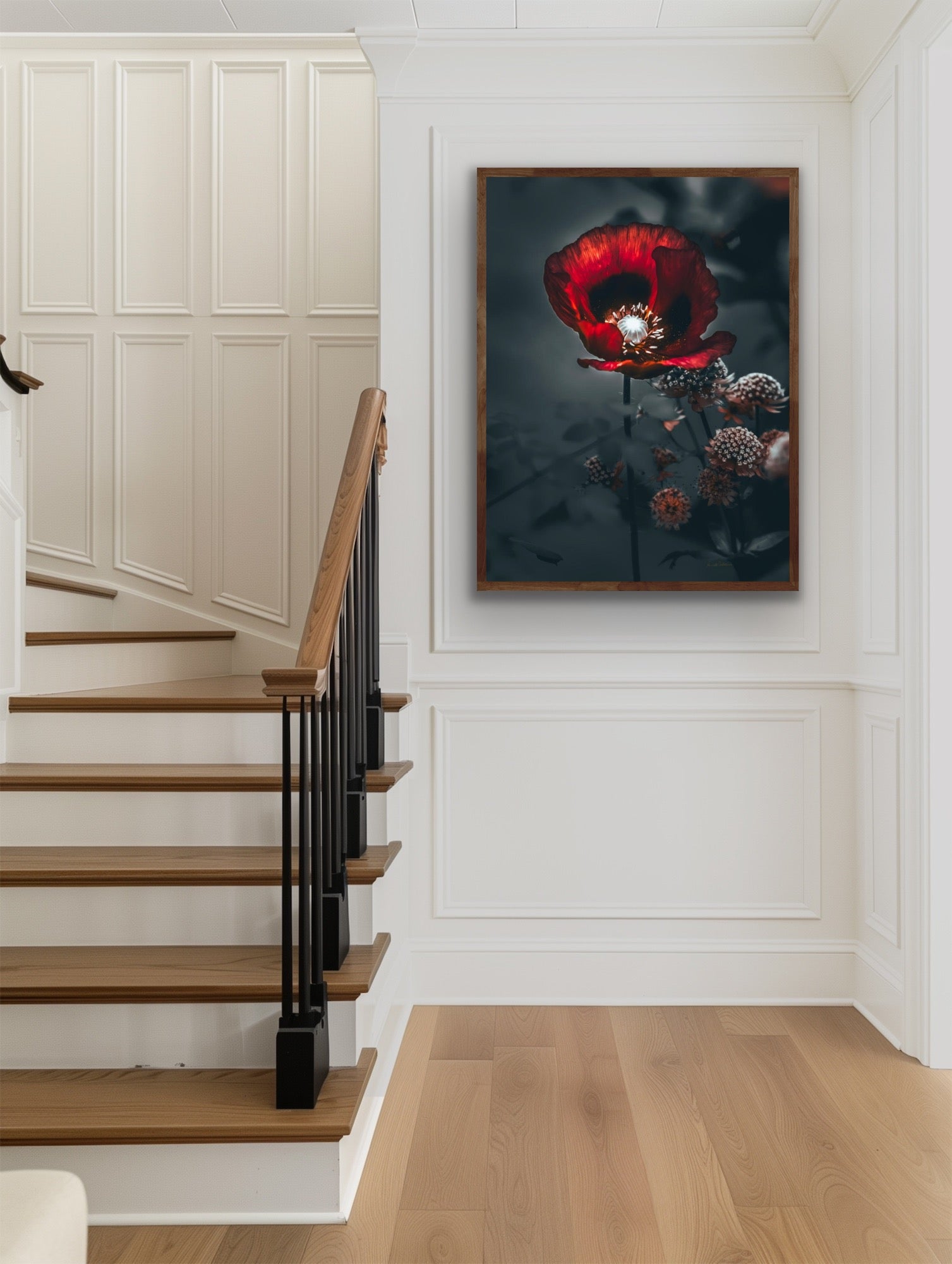 Beautiful photographic wall art of a poppy flower in stunning red tones on a dark blue-grey background. Nature at its finest.