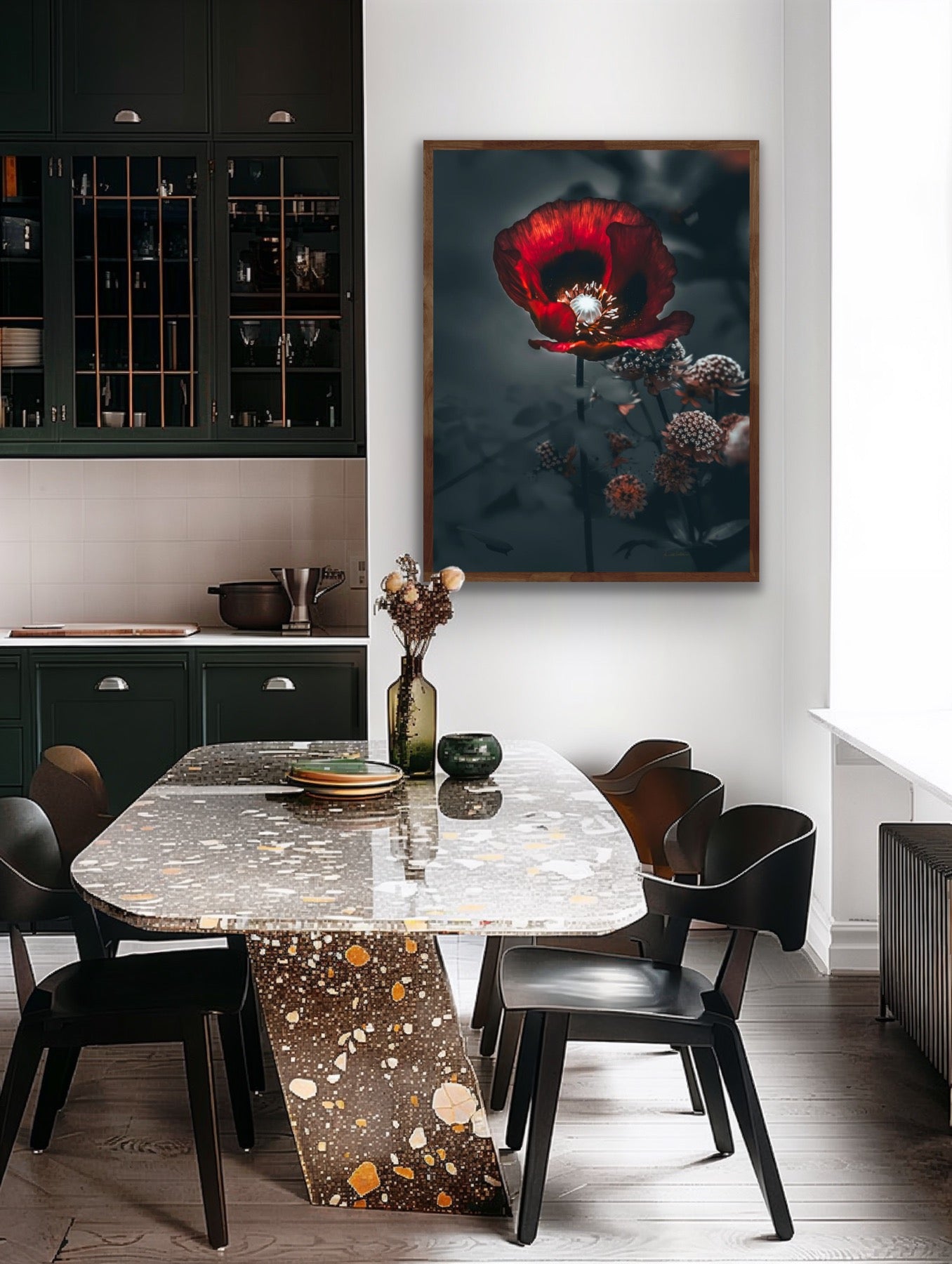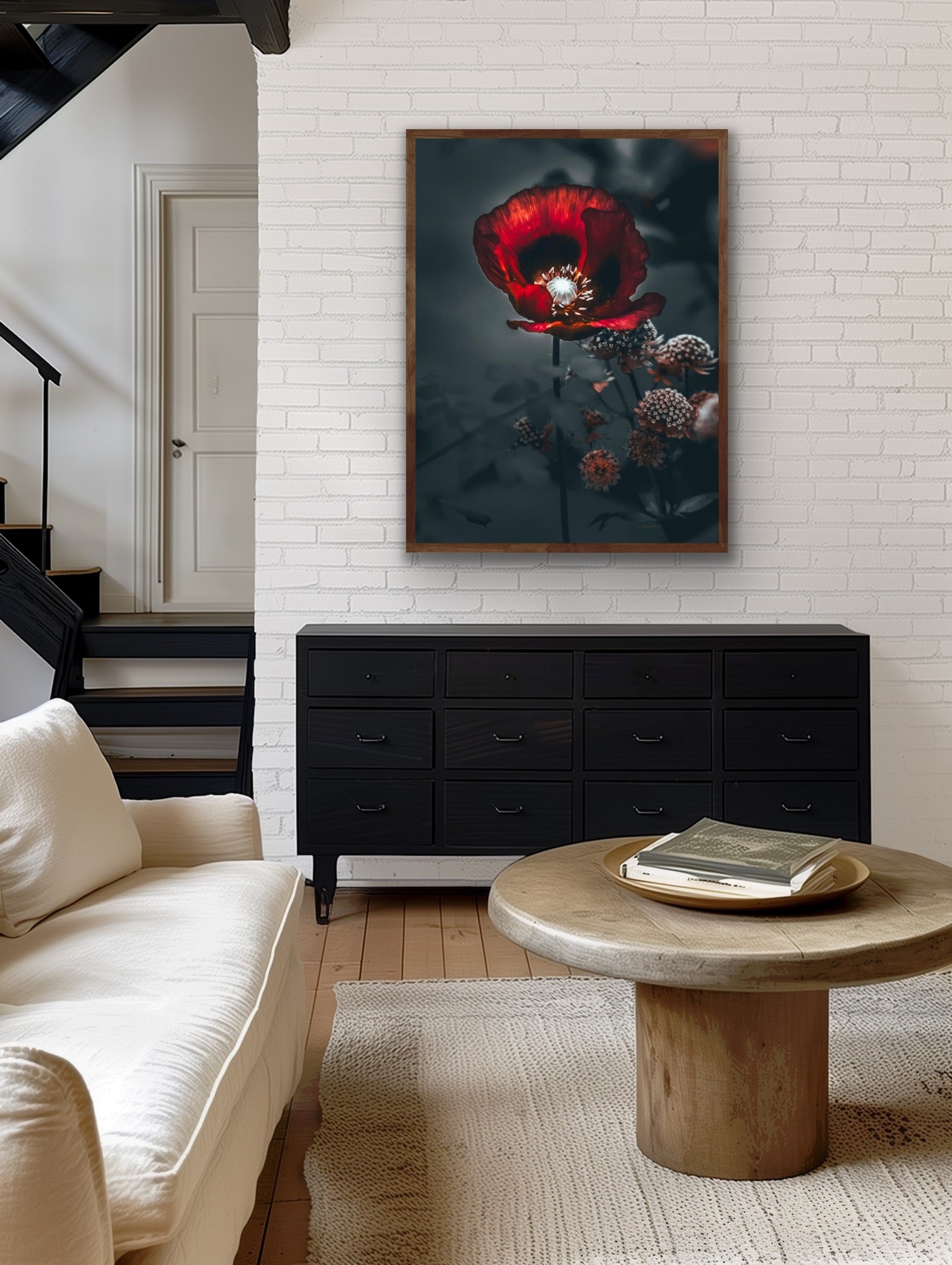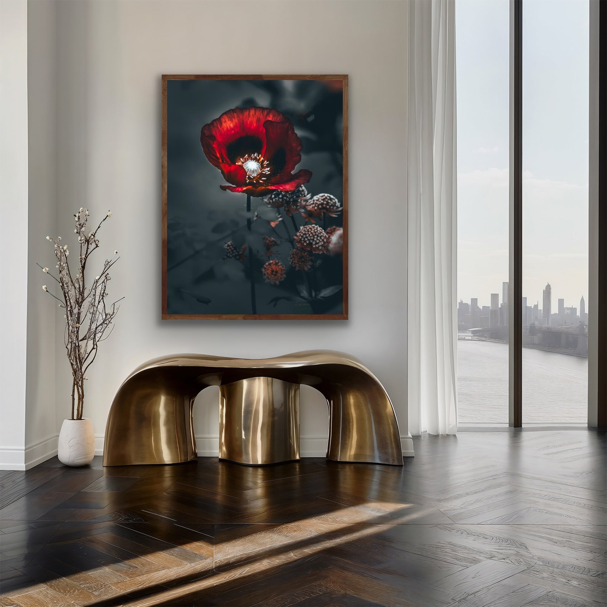 Beautiful photographic wall art of a poppy flower in stunning red tones on a dark blue-grey background. Nature at its finest.