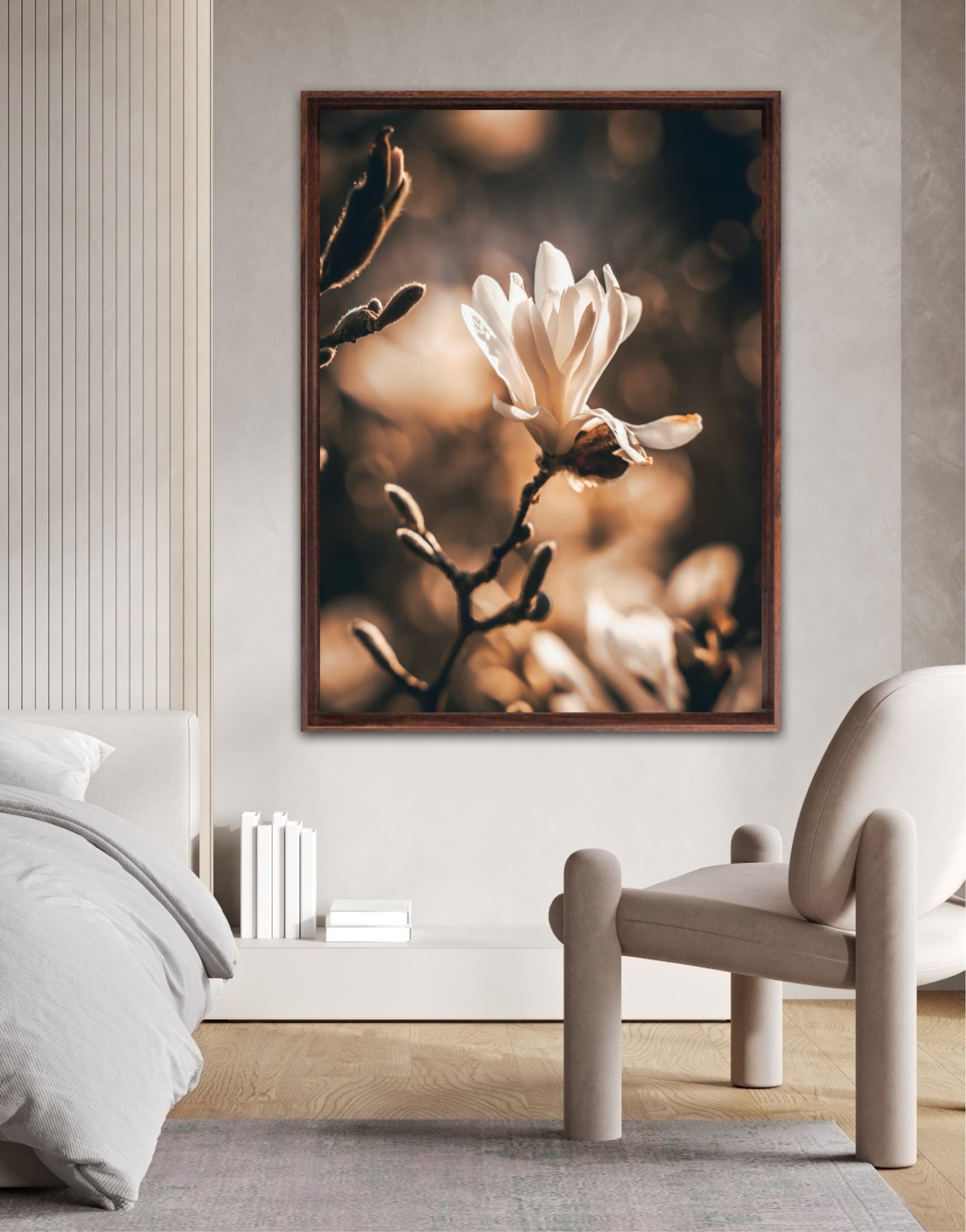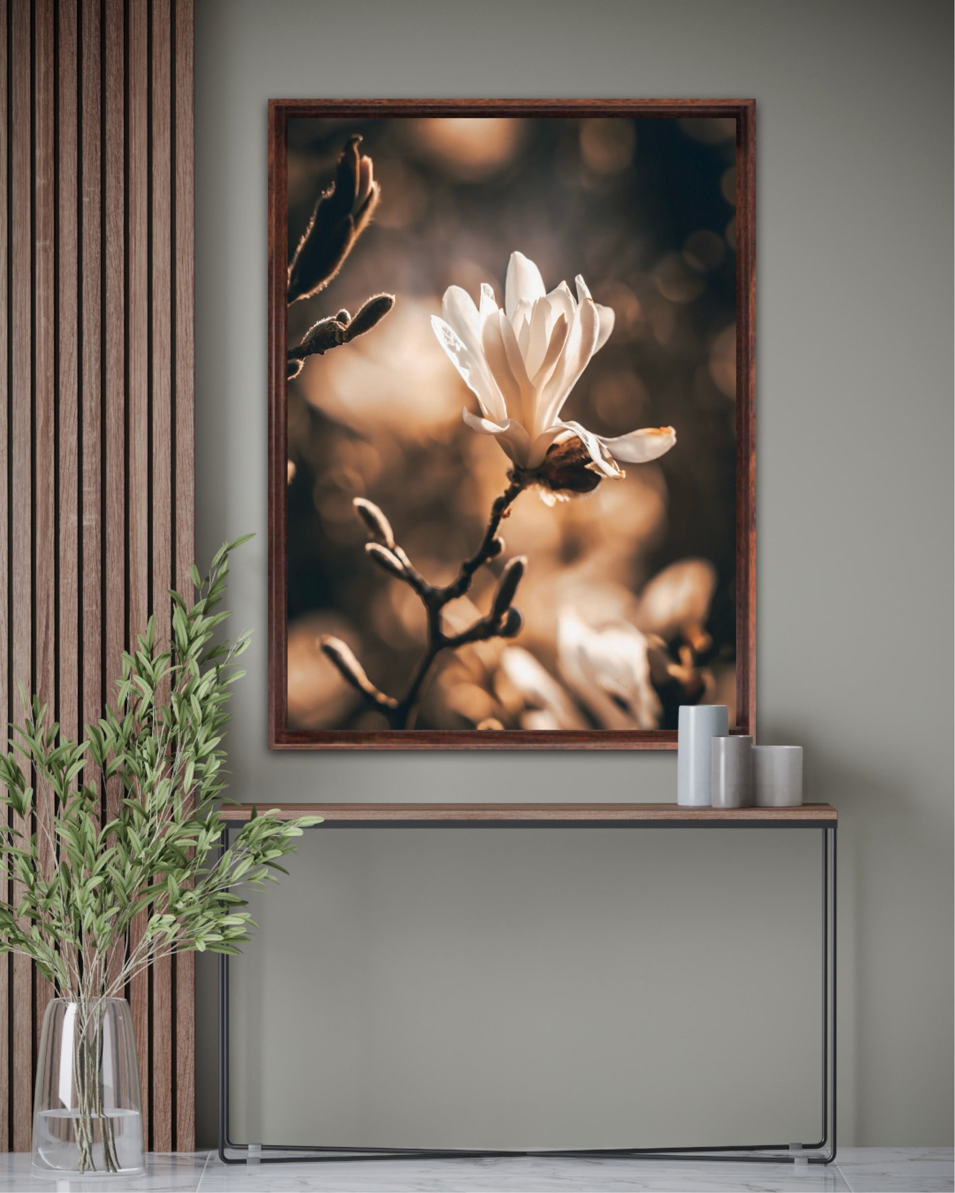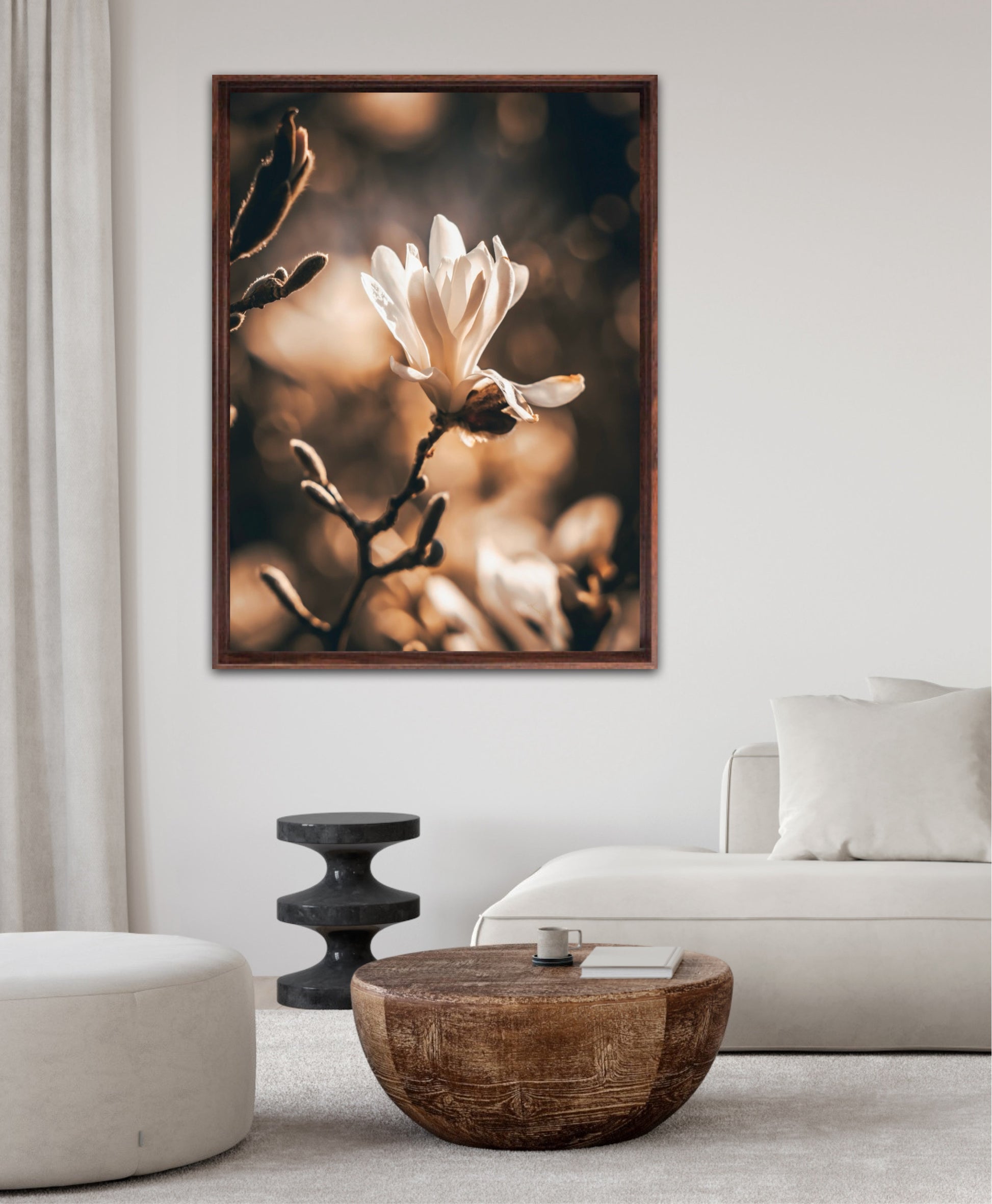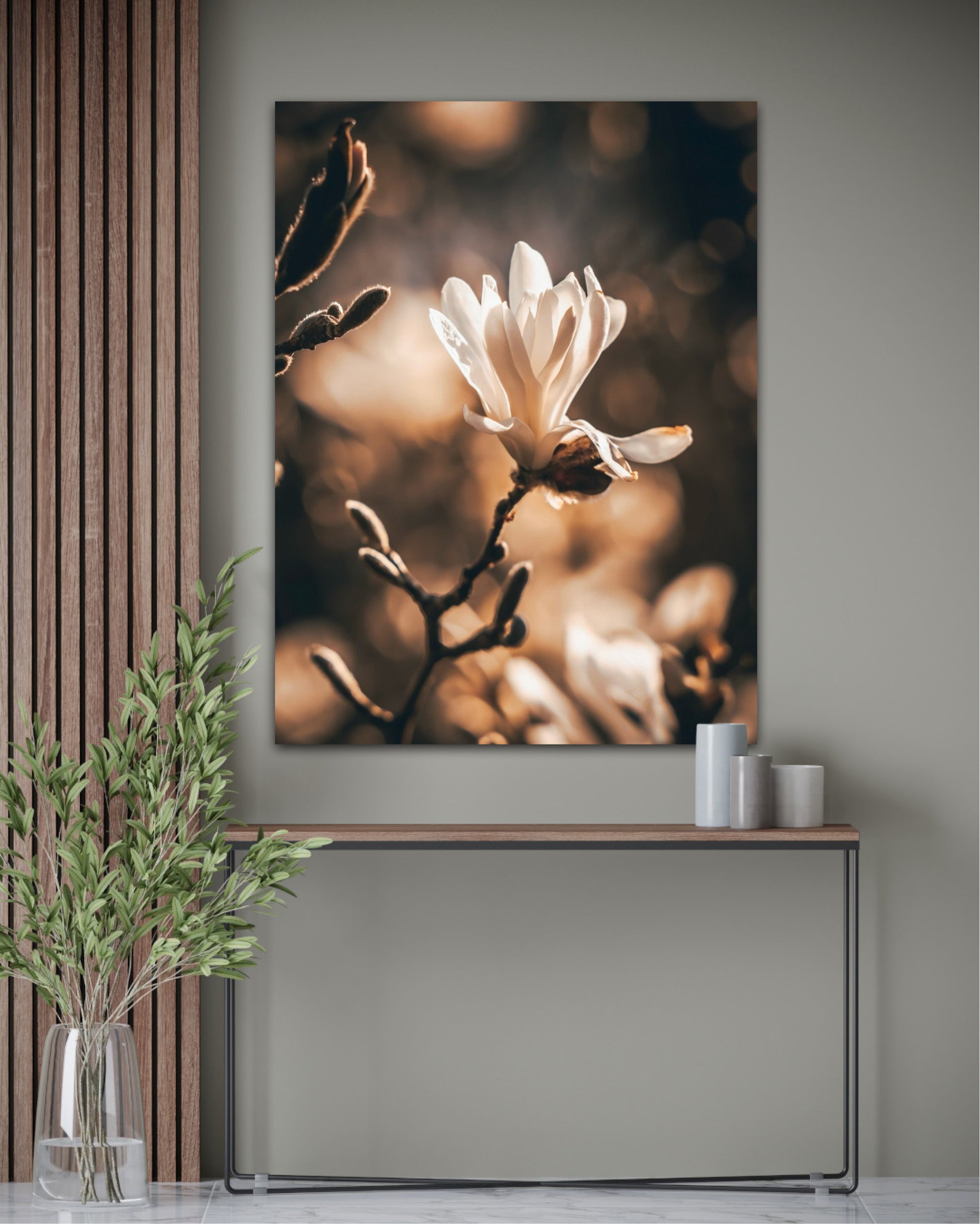 Beautiful photographic artwork of a magnolia flower in beautiful tones of white, brown, golden brown and black. The mural is a lovely representation of the magnolia flower and tree. Get a lovely beautiful piece of art on the wall with this beautiful motif.