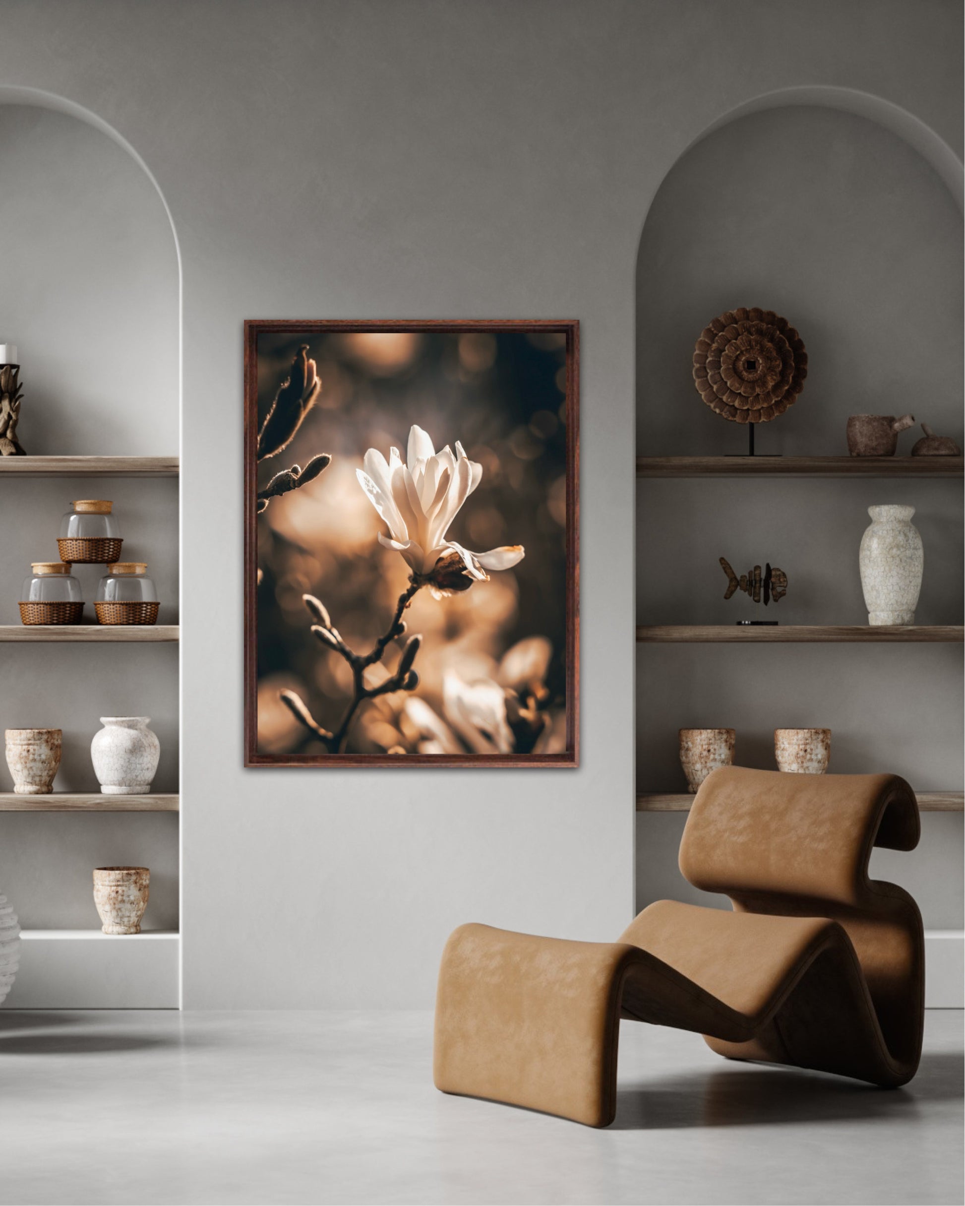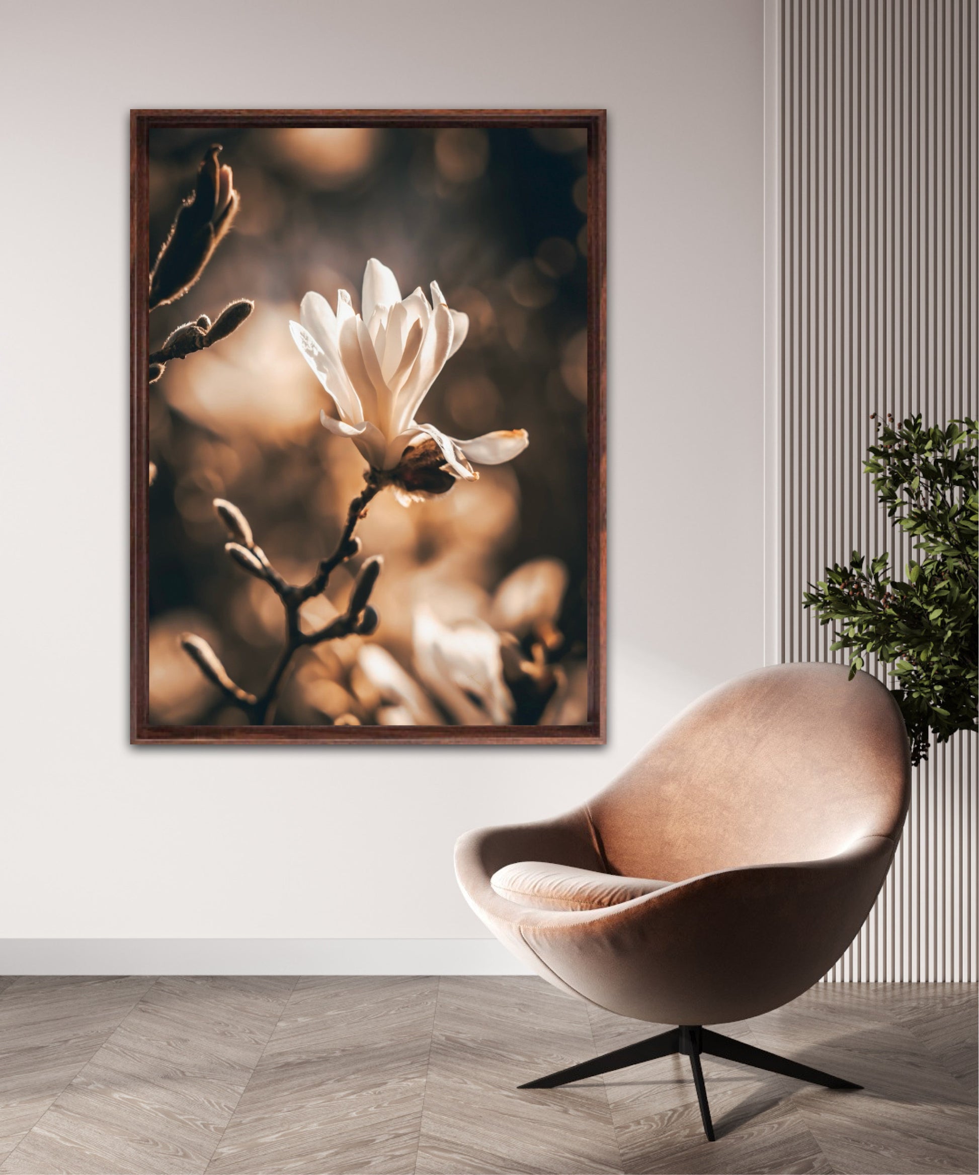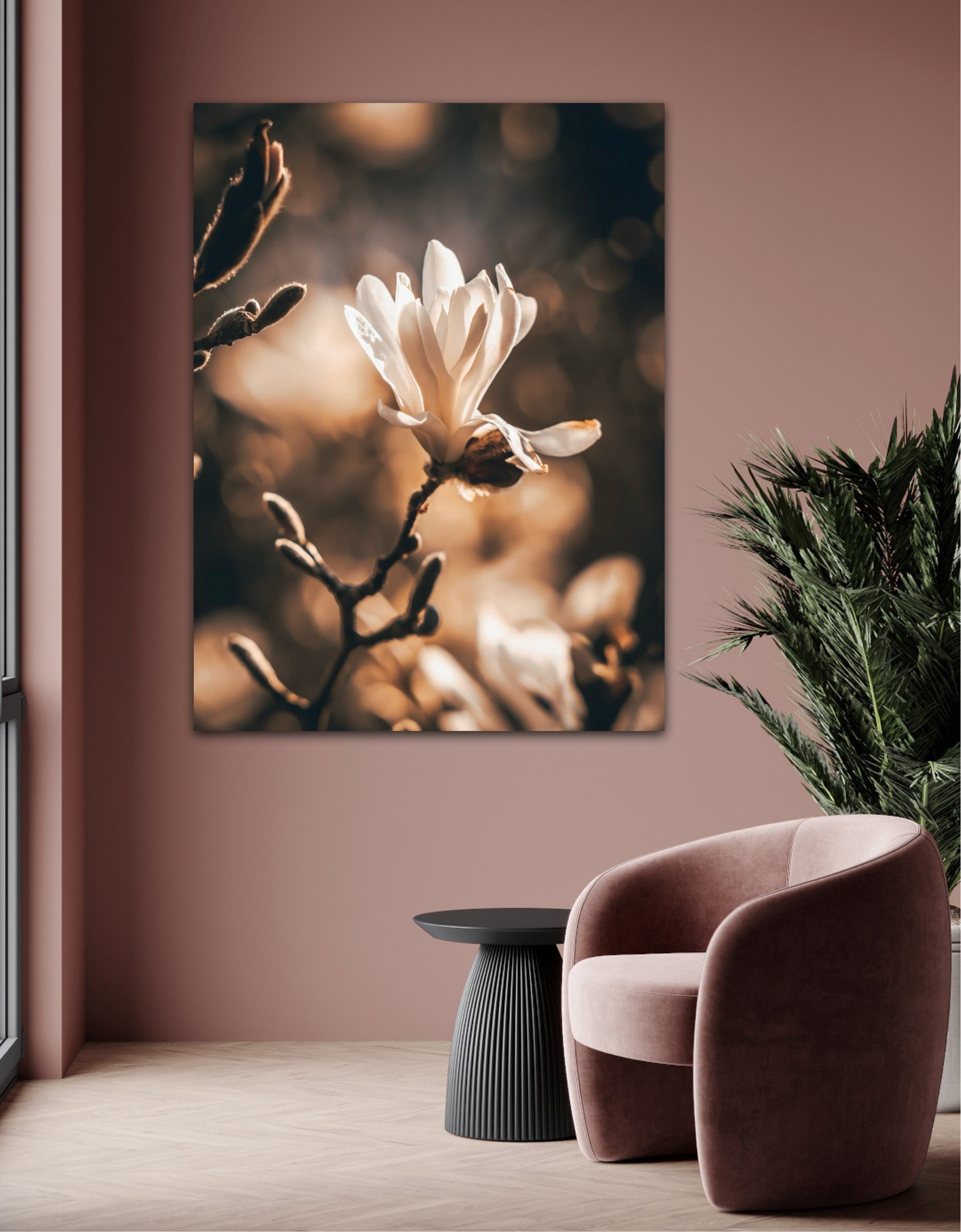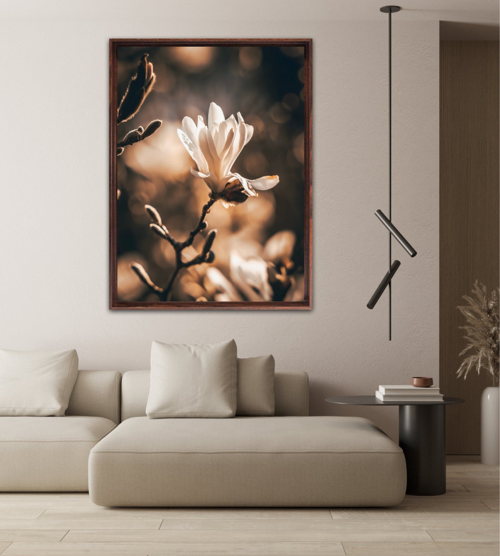 Beautiful photographic artwork of a magnolia flower in beautiful tones of white, brown, golden brown and black. The mural is a lovely representation of the magnolia flower and tree. Get a lovely beautiful piece of art on the wall with this beautiful motif.