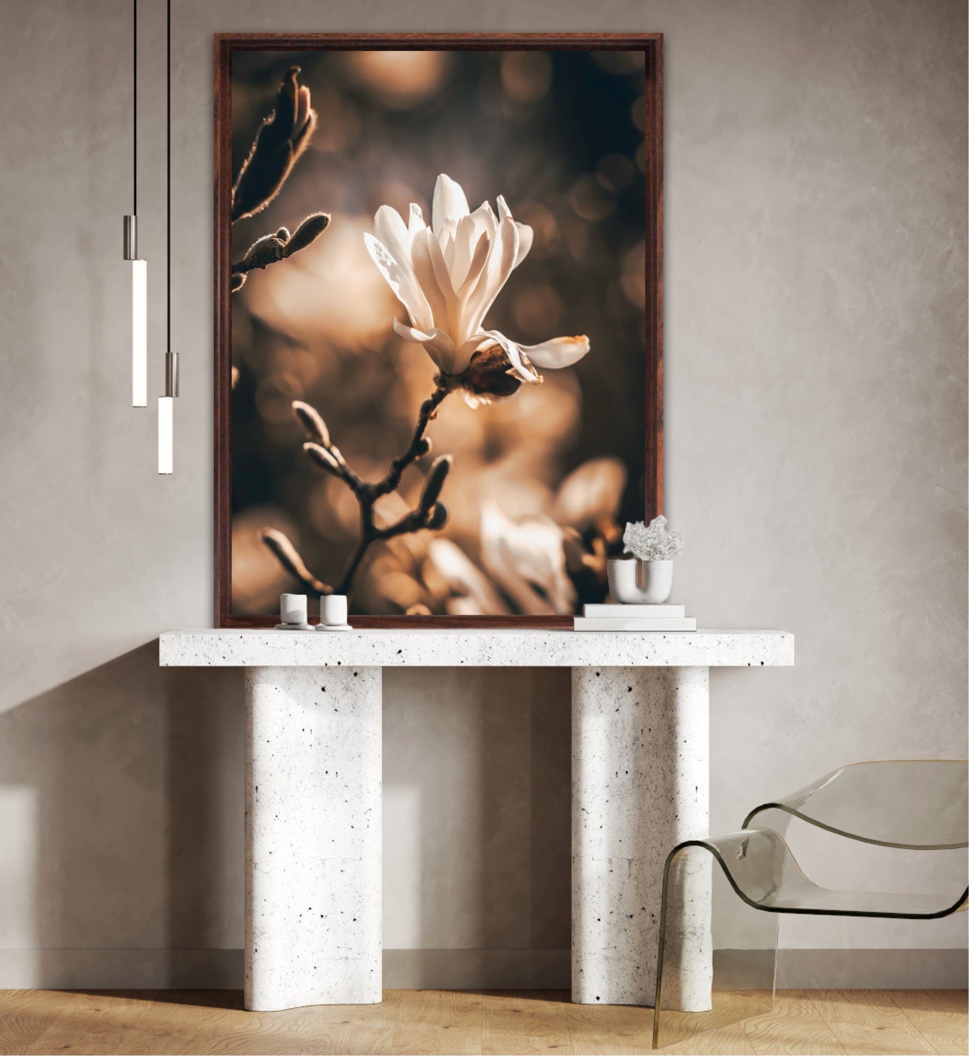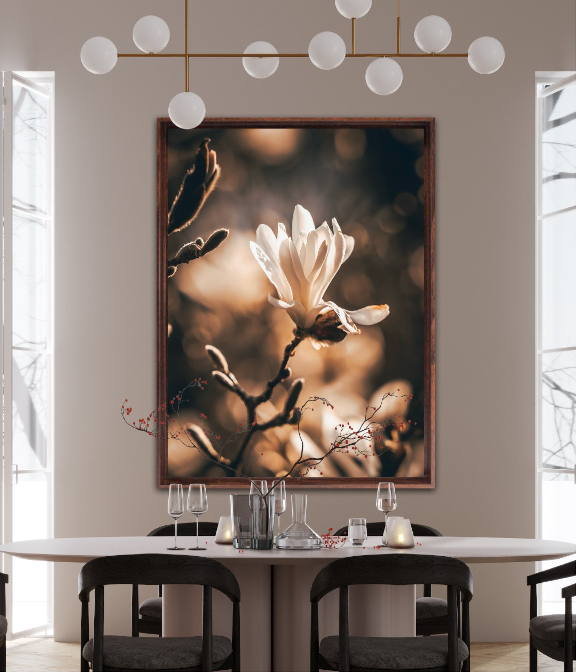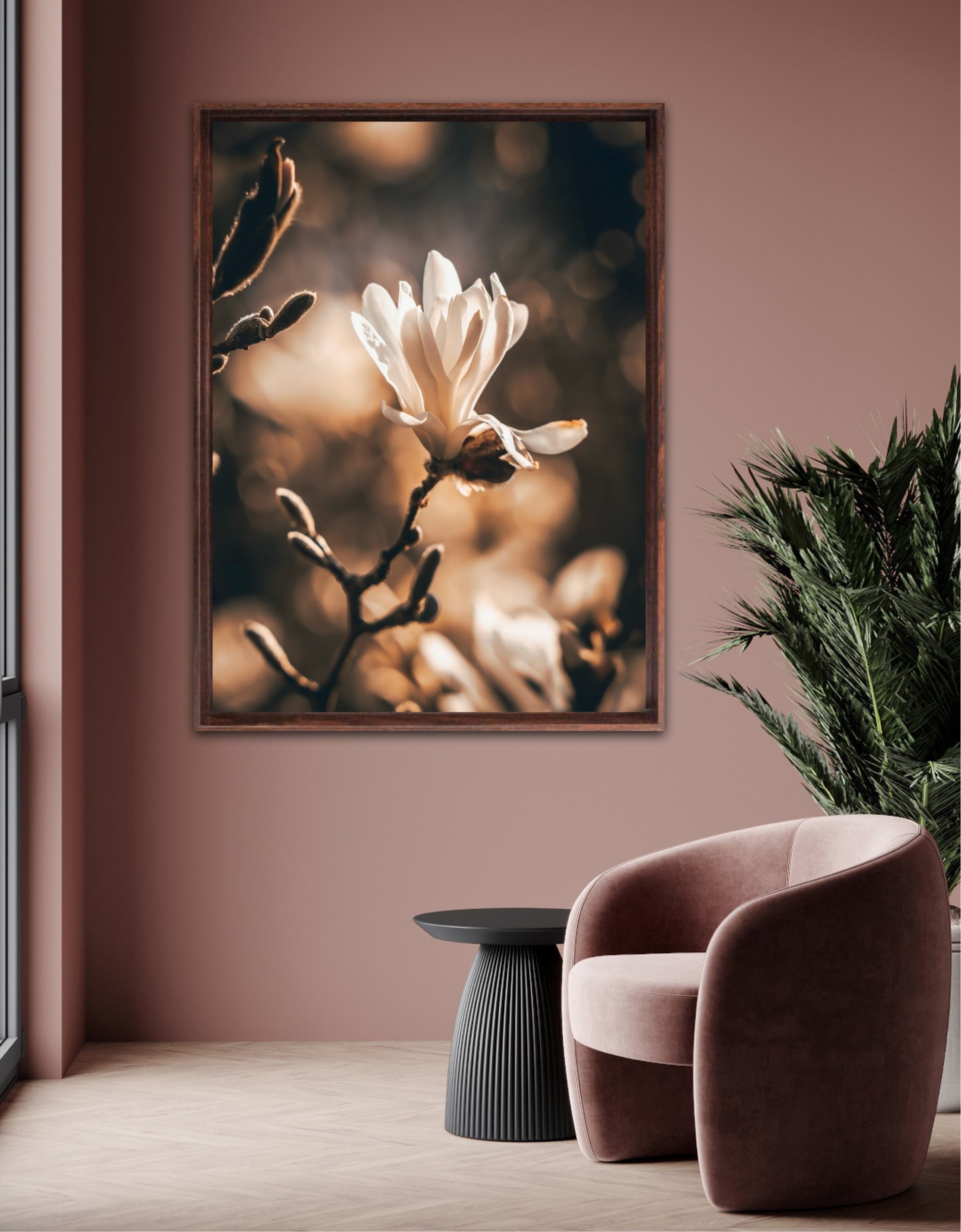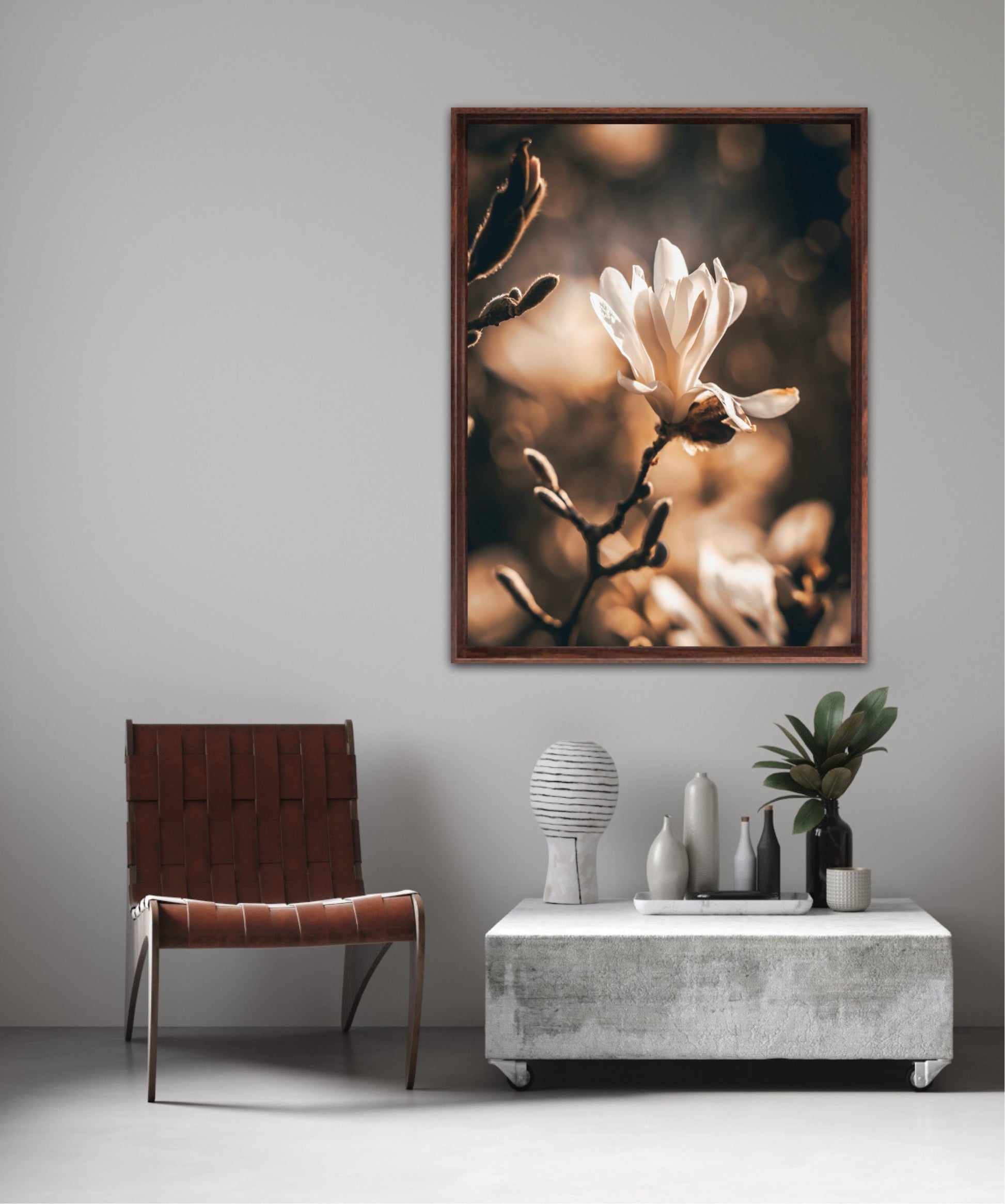 Beautiful photographic artwork of a magnolia flower in beautiful tones of white, brown, golden brown and black. The mural is a lovely representation of the magnolia flower and tree. Get a lovely beautiful piece of art on the wall with this beautiful motif.