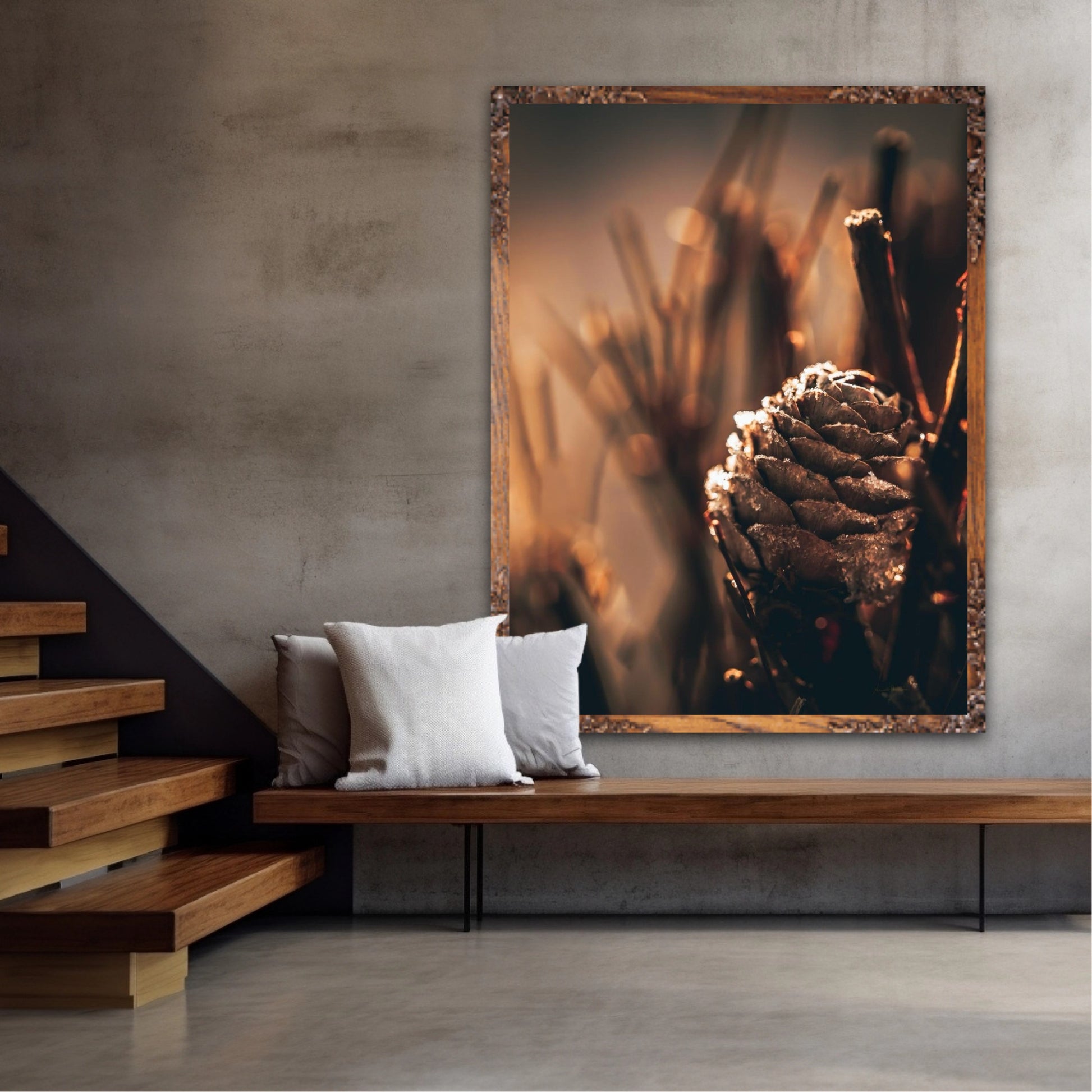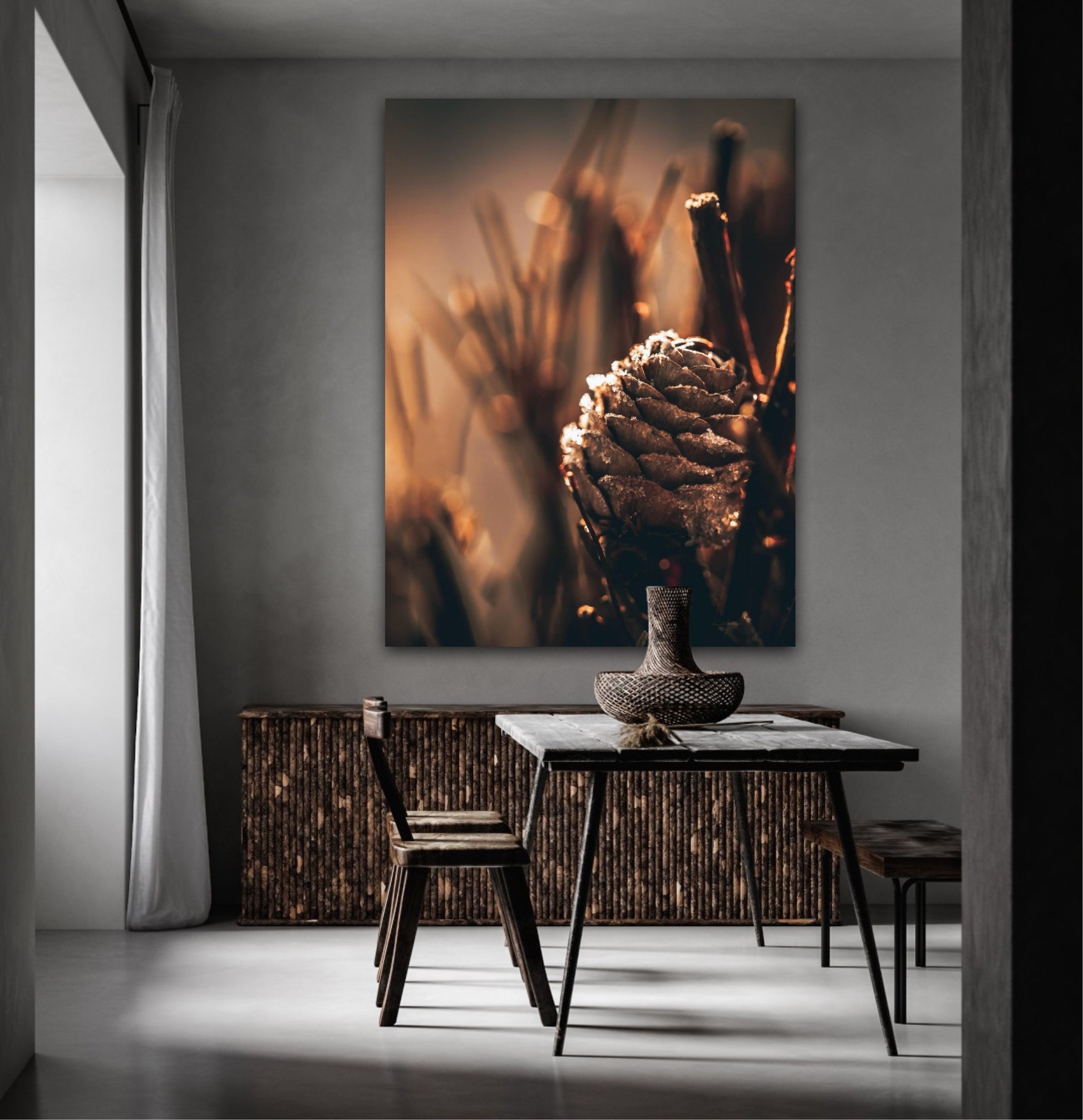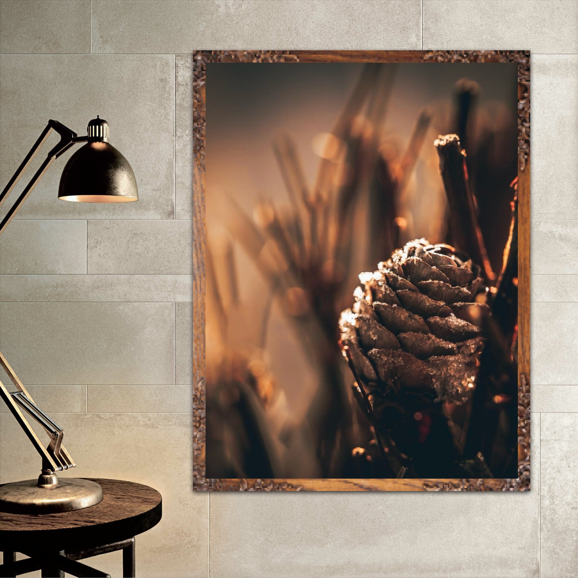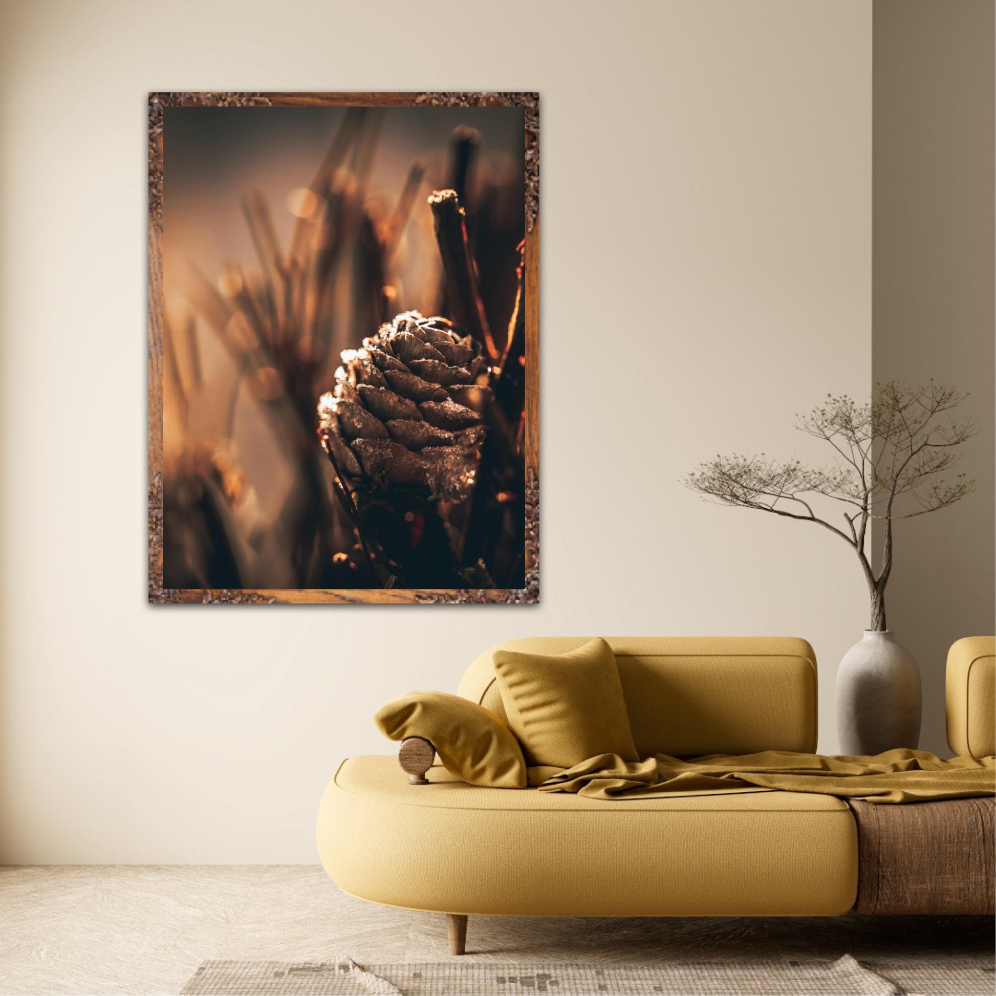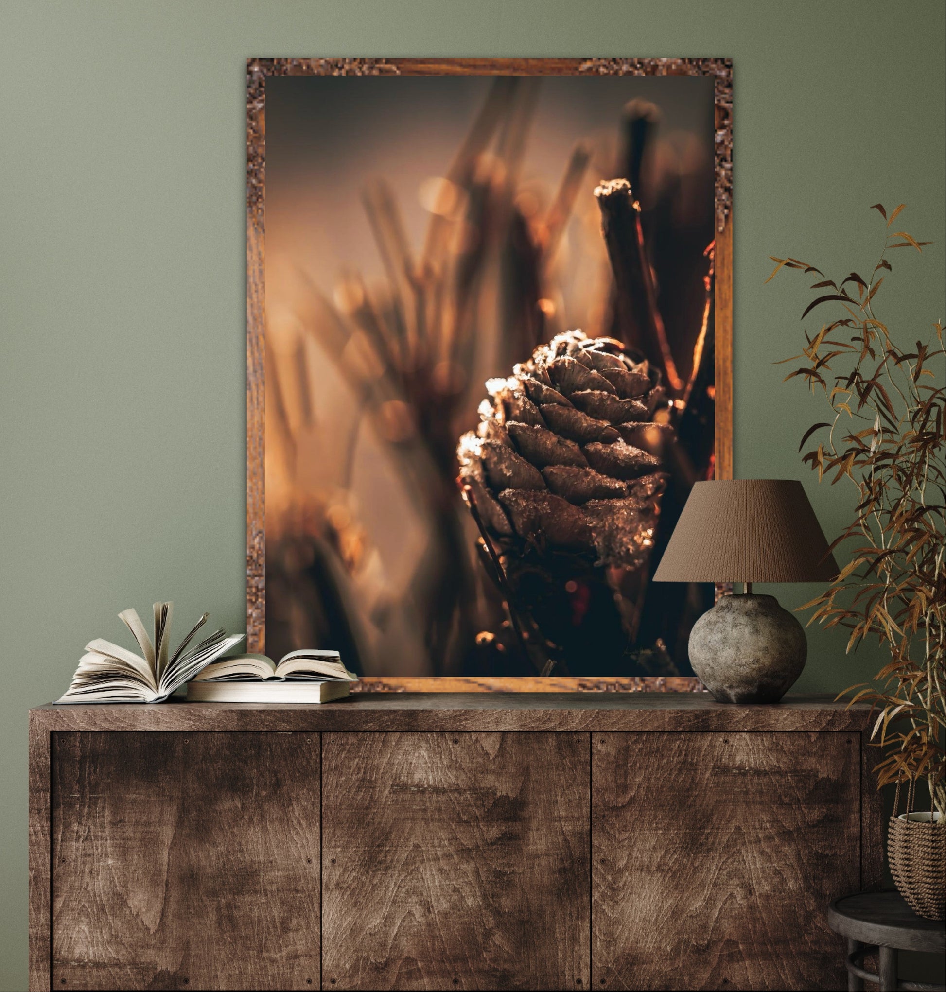 Beautiful and warm photographic art image of a larch cone with frost in warm colours leaning against a wooden stick. Beautiful and peaceful, get the good feeling with this beautiful artwork.