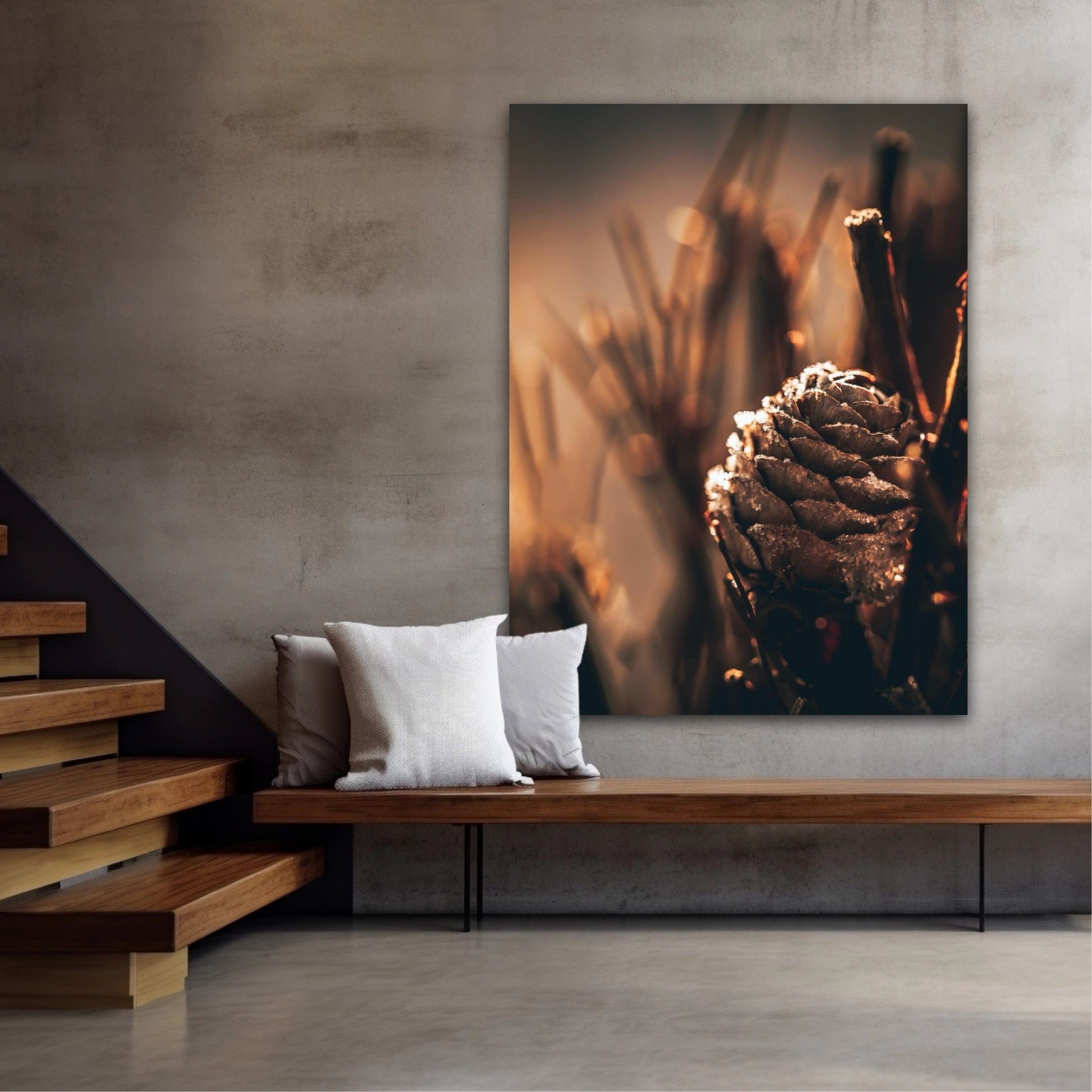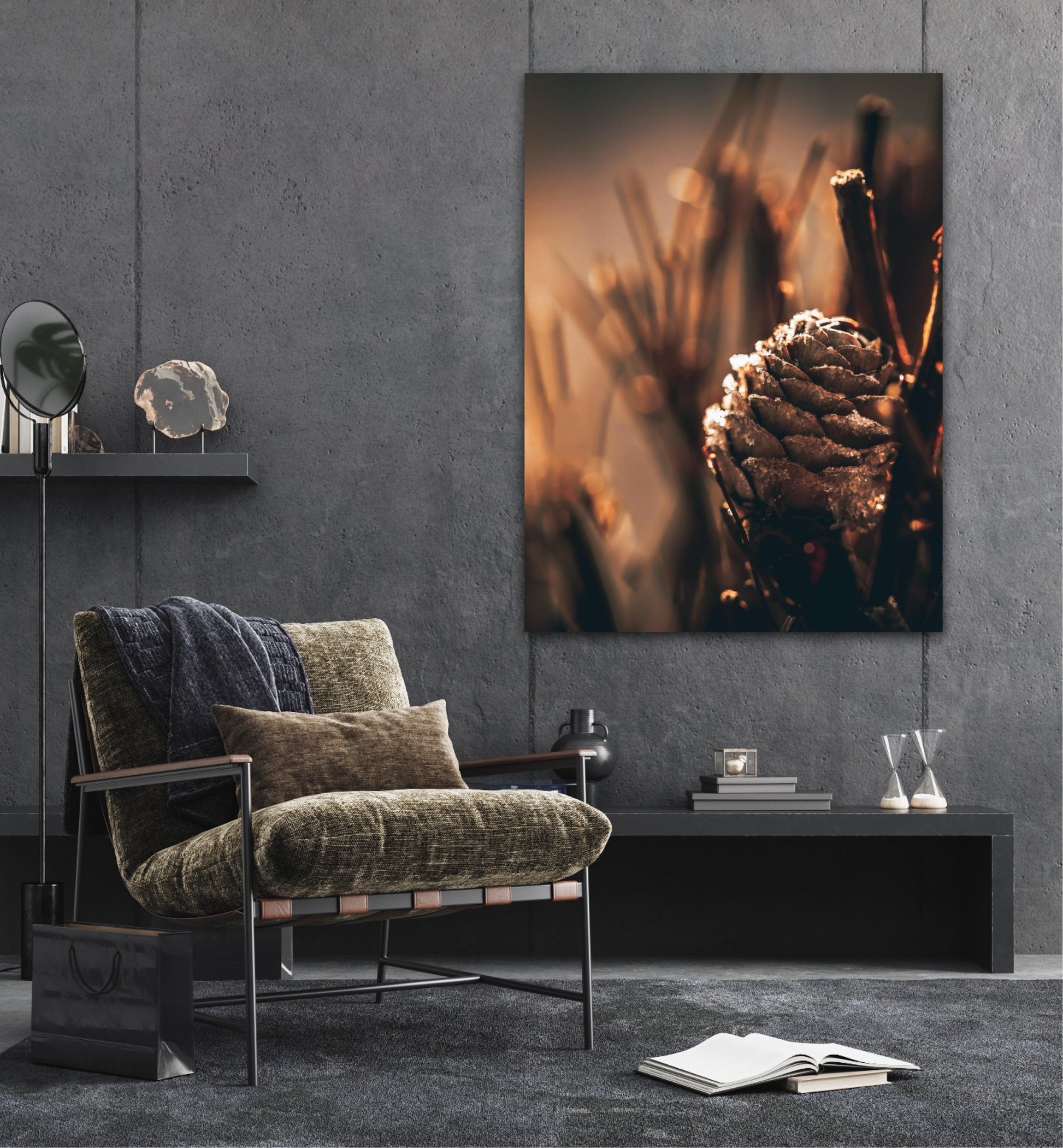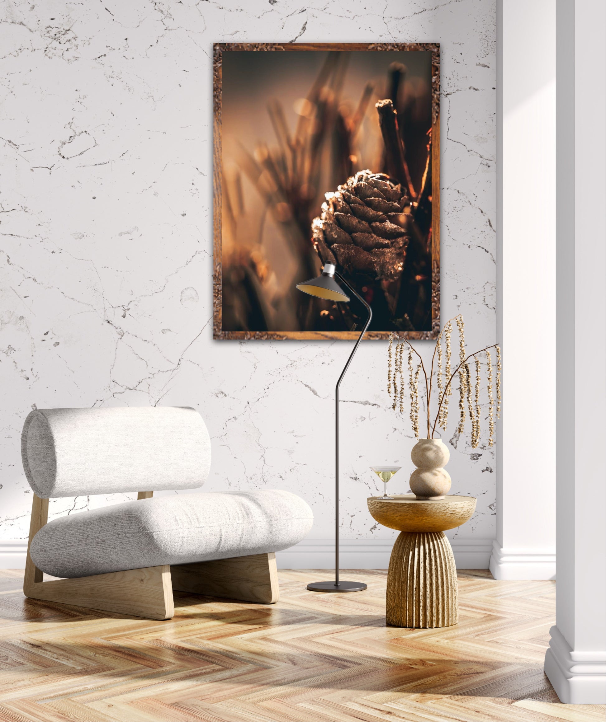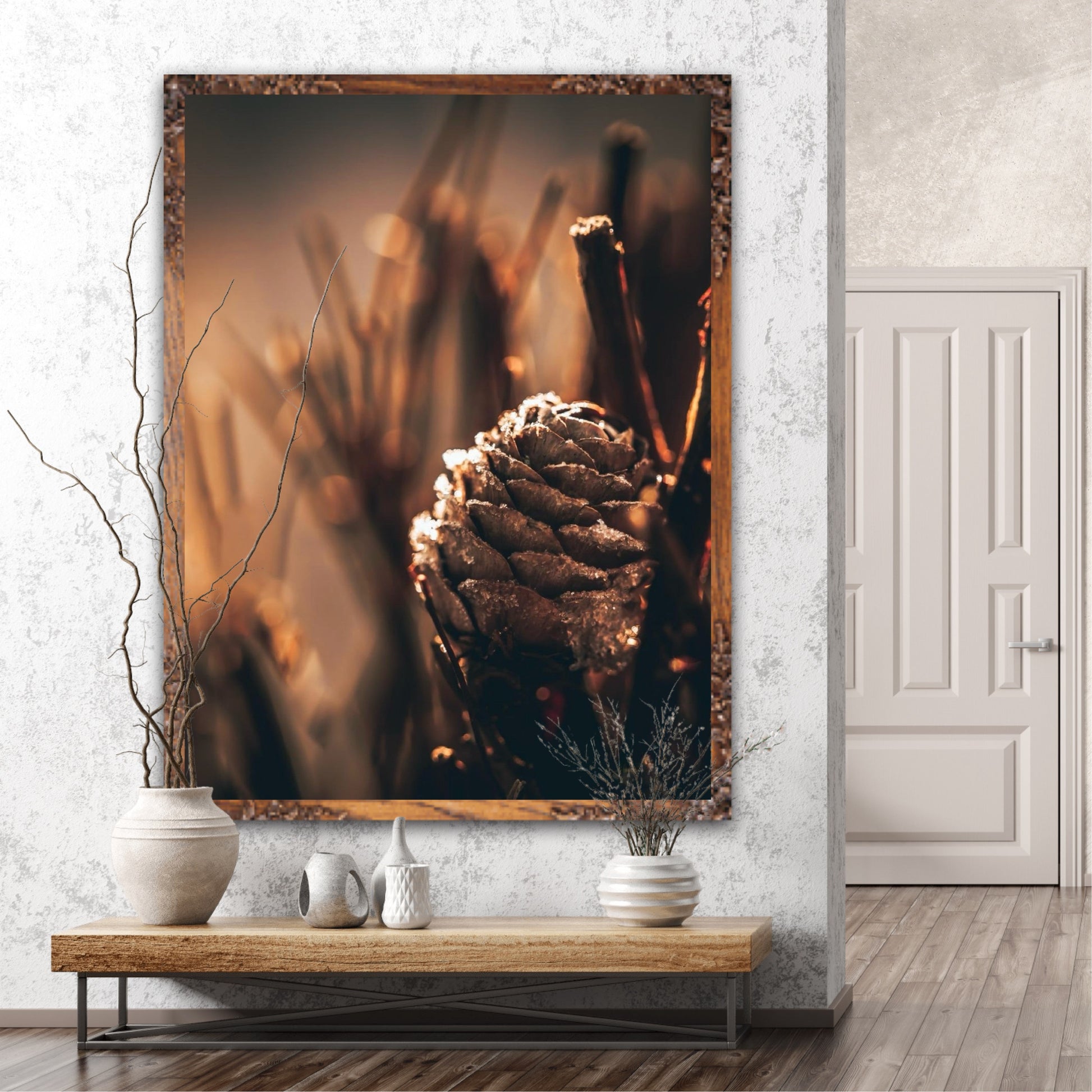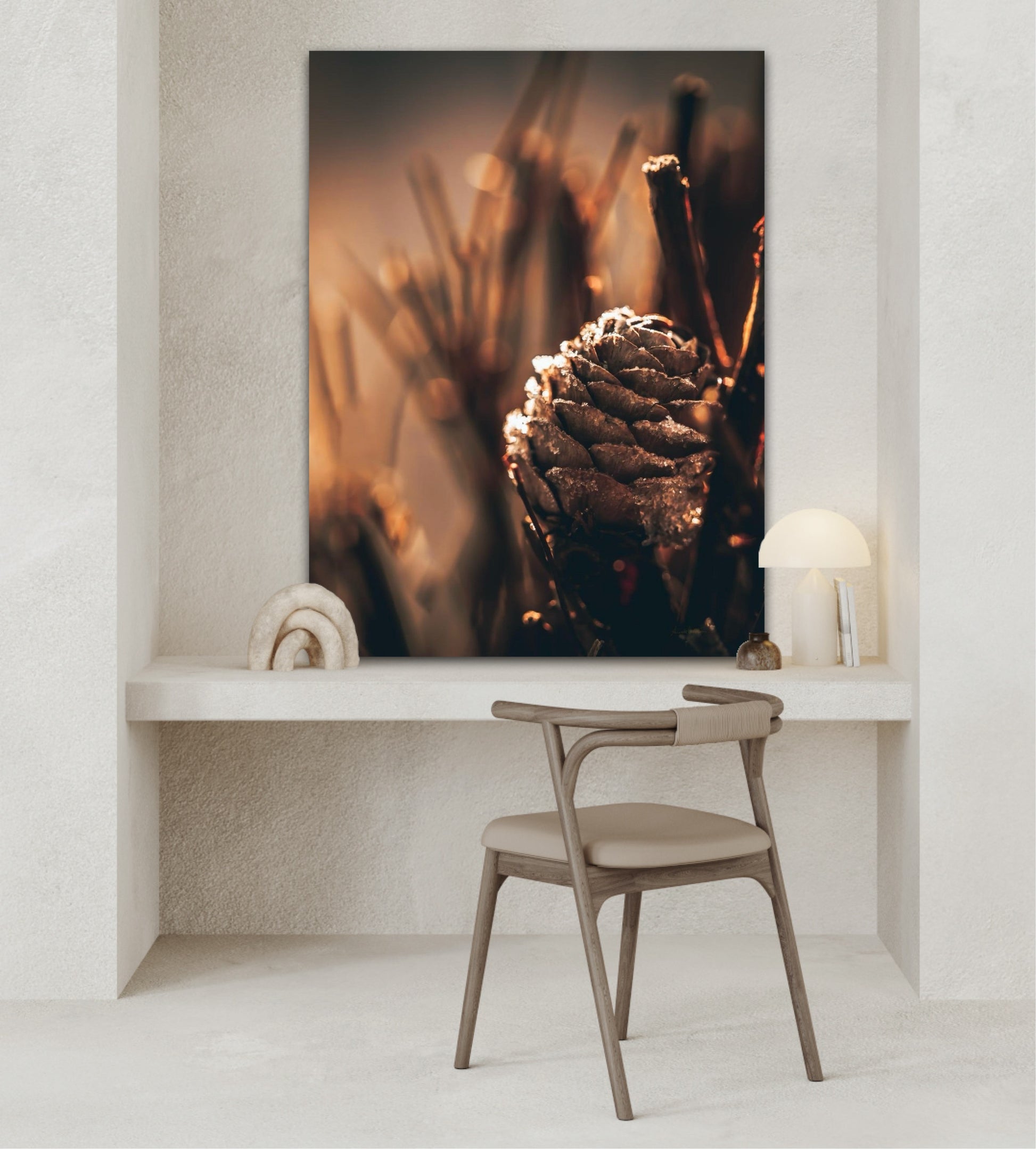 Beautiful and warm photographic art image of a larch cone with frost in warm colours leaning against a wooden stick. Beautiful and peaceful, get the good feeling with this beautiful artwork.