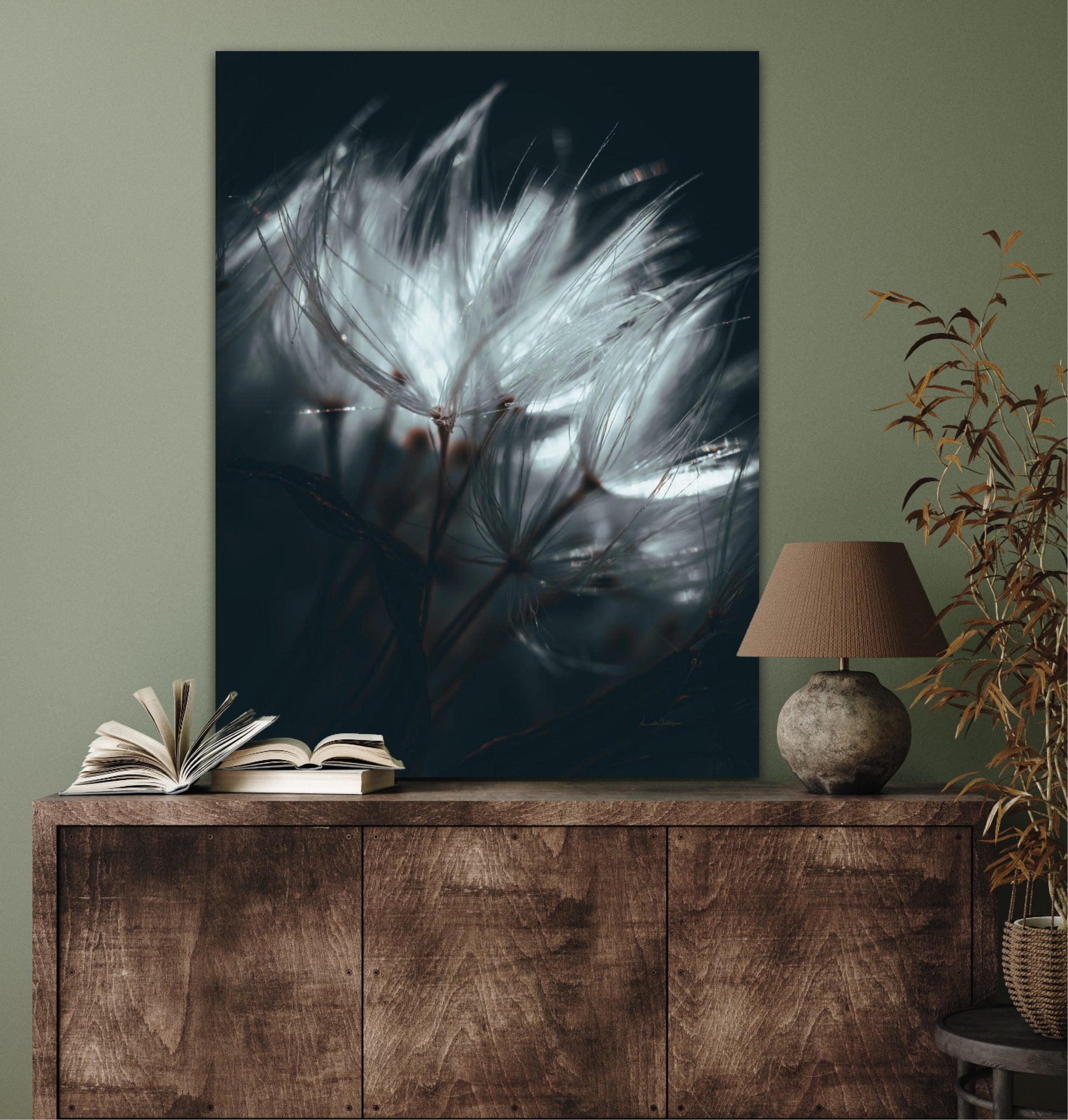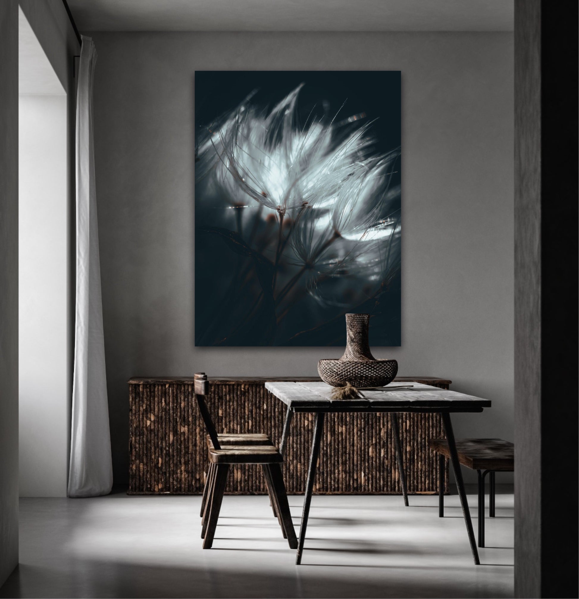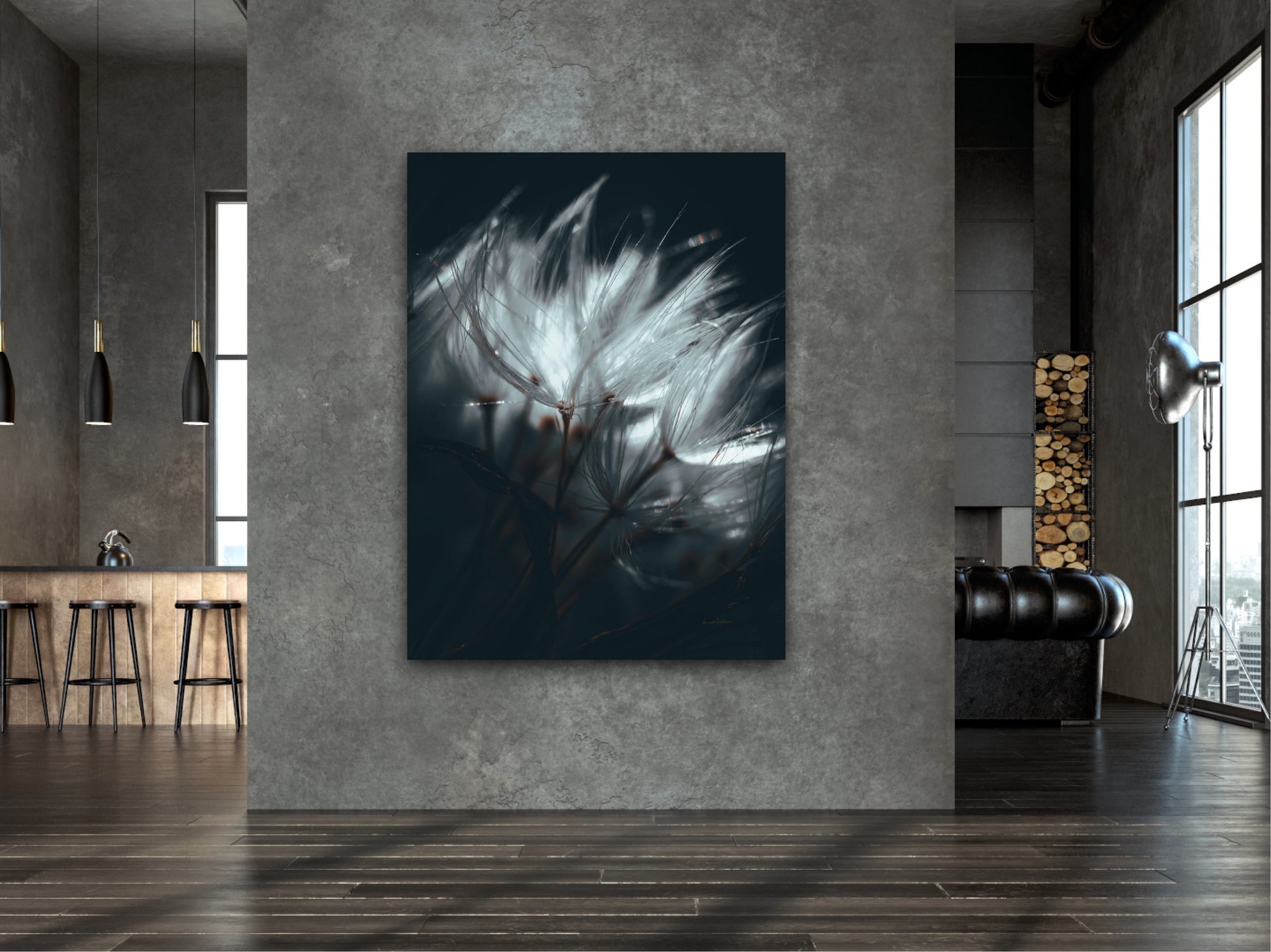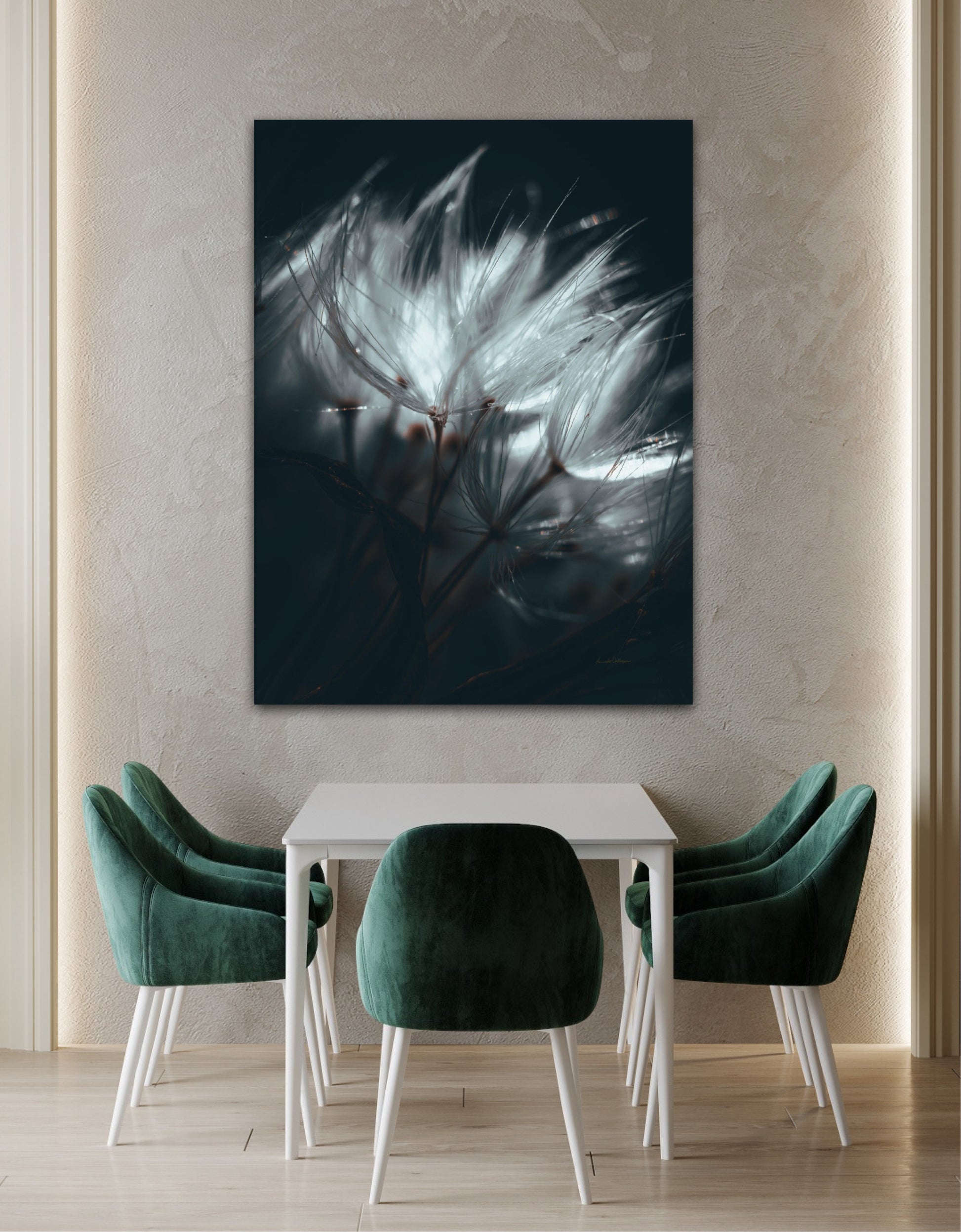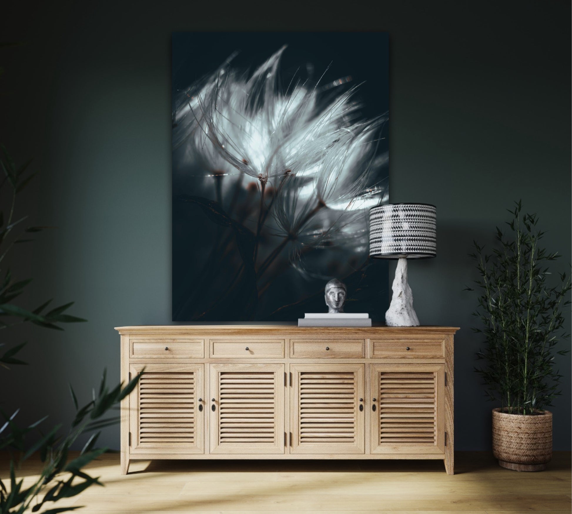 Beautiful photographic wall art of dandelion seeds in black and white. The dandelion seeds shine in the light, giving an otherworldly impression. Get a beautiful piece of art on your wall that will impress everyone who visits.