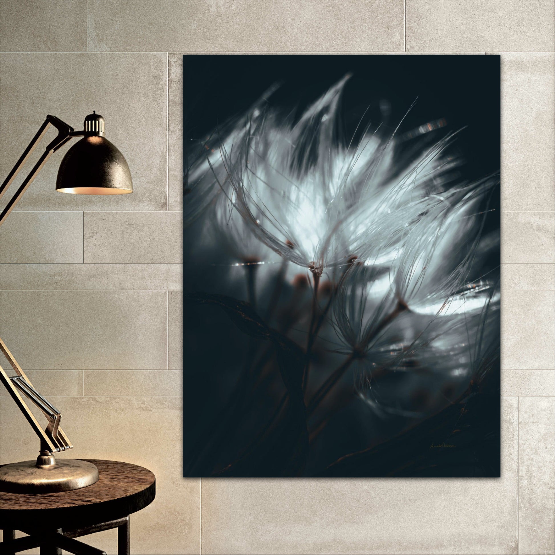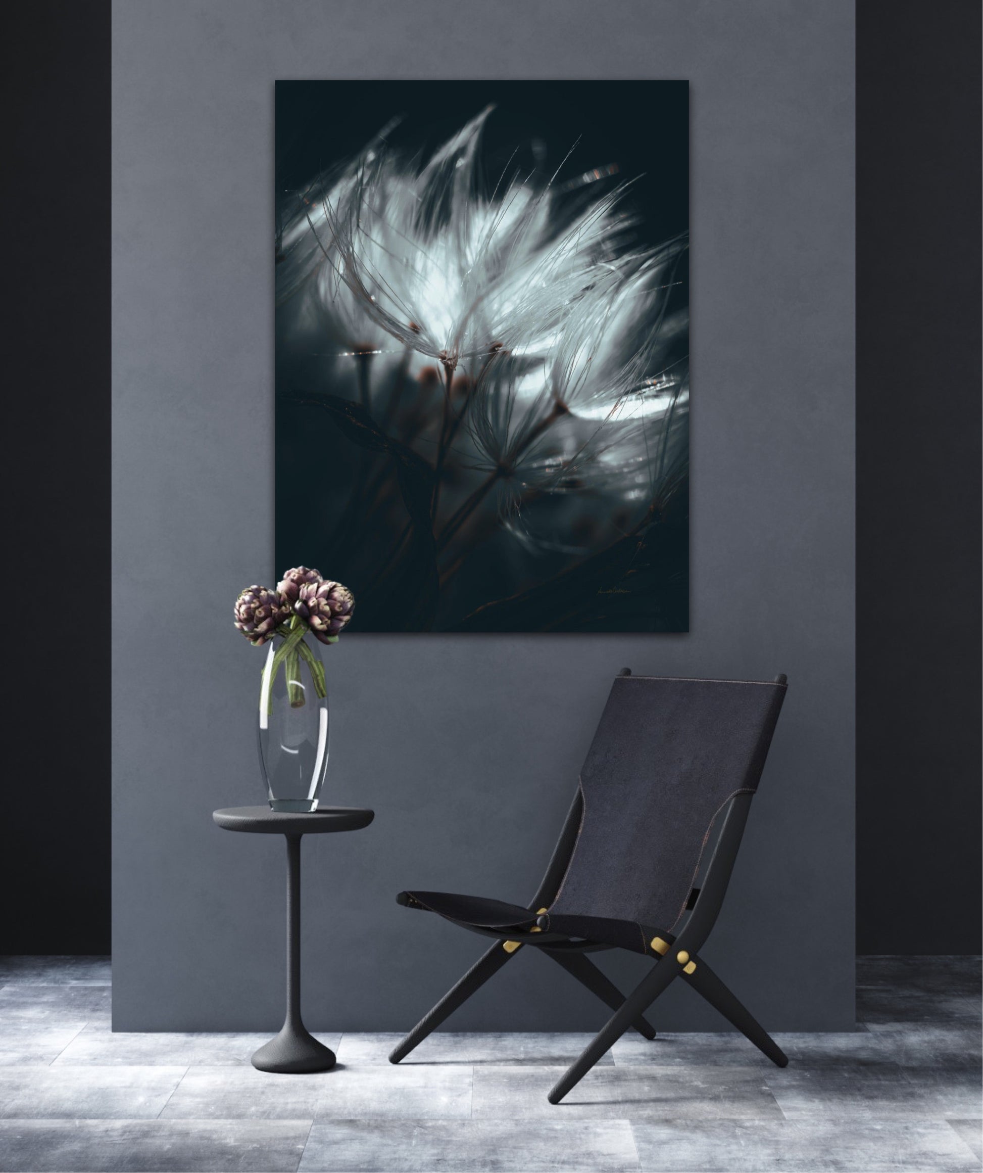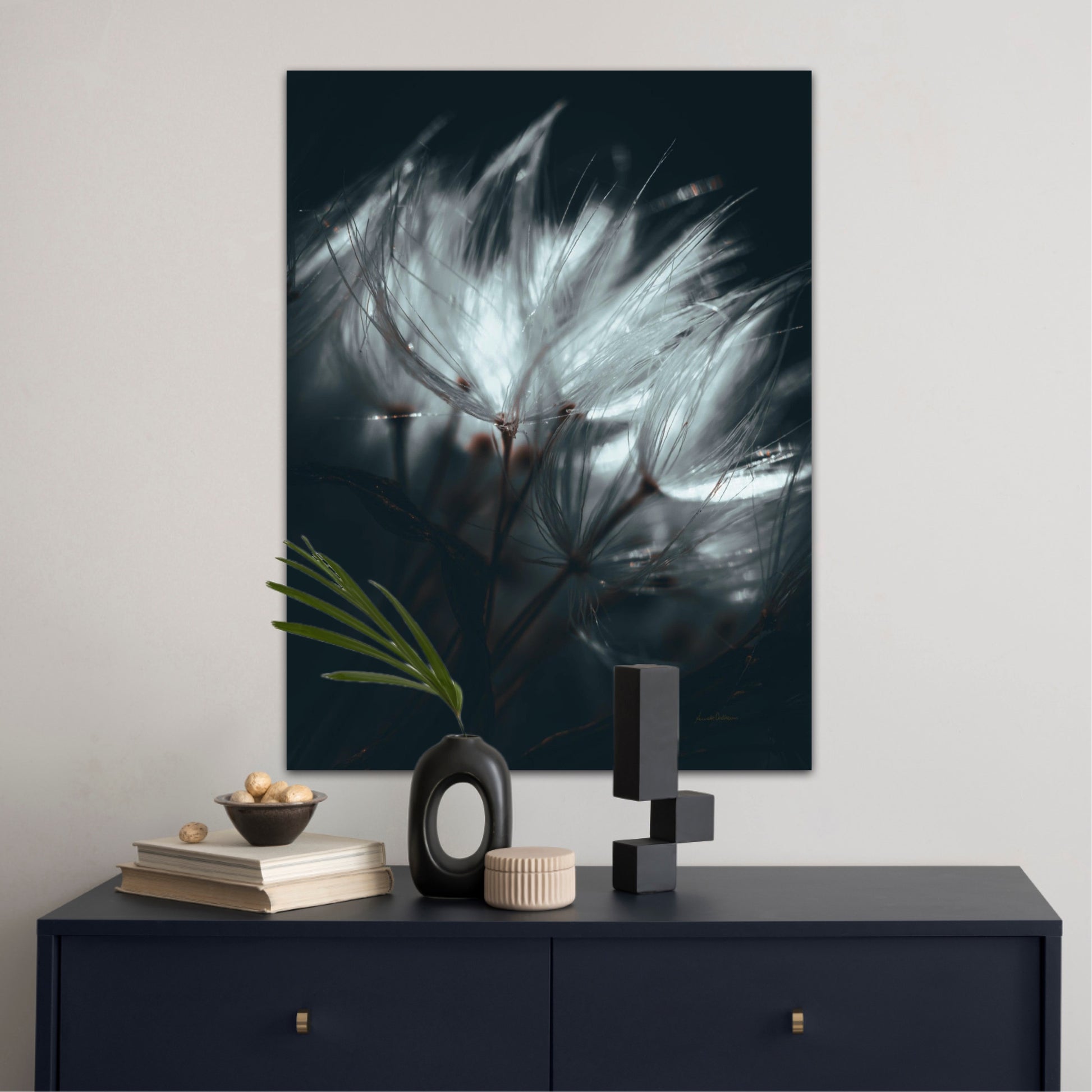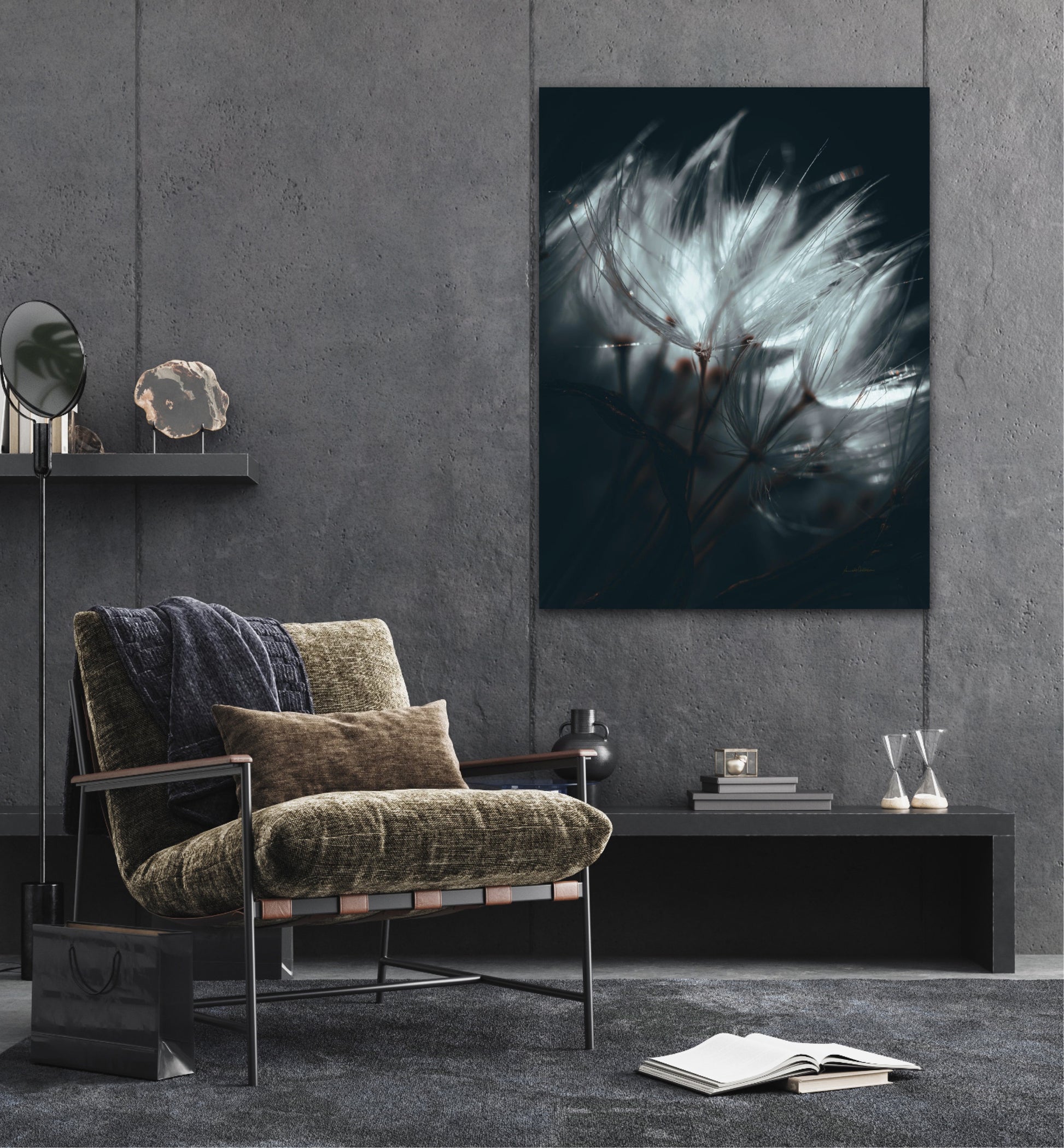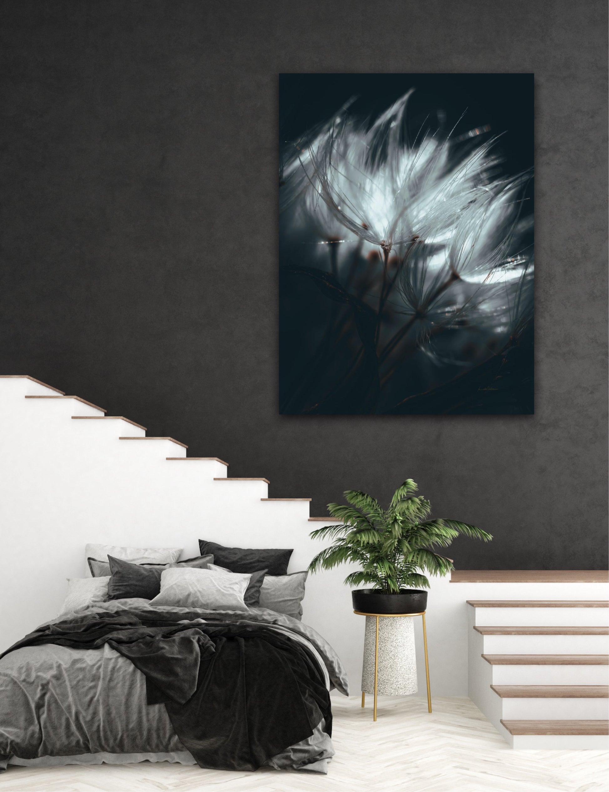 Beautiful photographic wall art of dandelion seeds in black and white. The dandelion seeds shine in the light, giving an otherworldly impression. Get a beautiful piece of art on your wall that will impress everyone who visits.