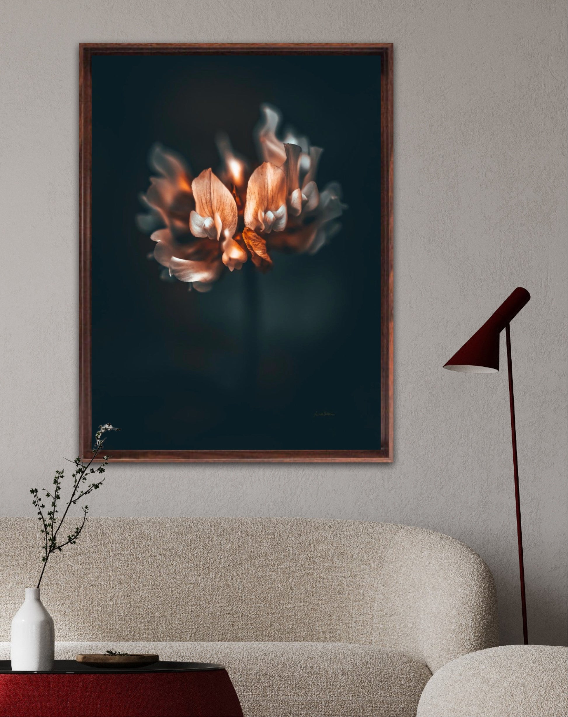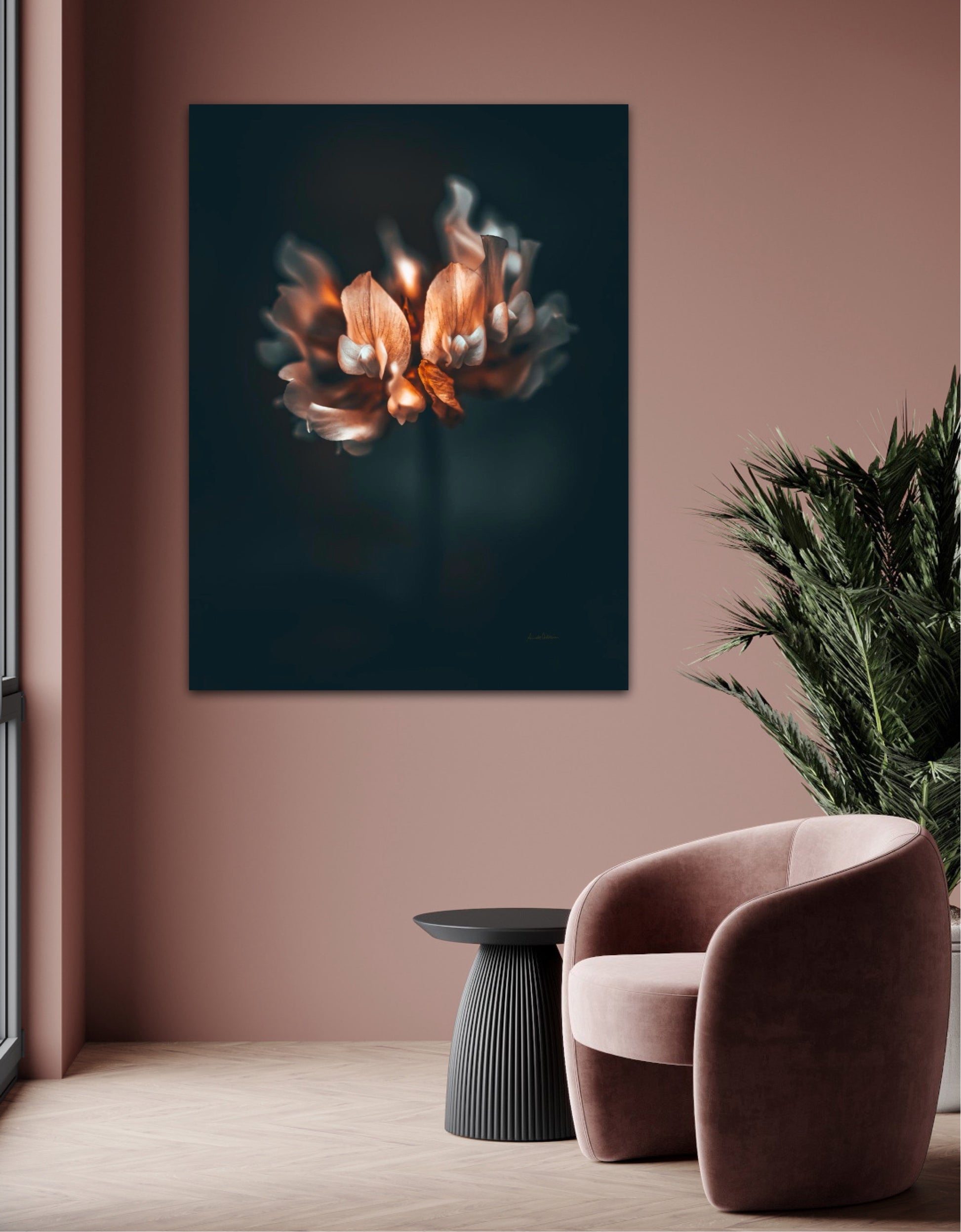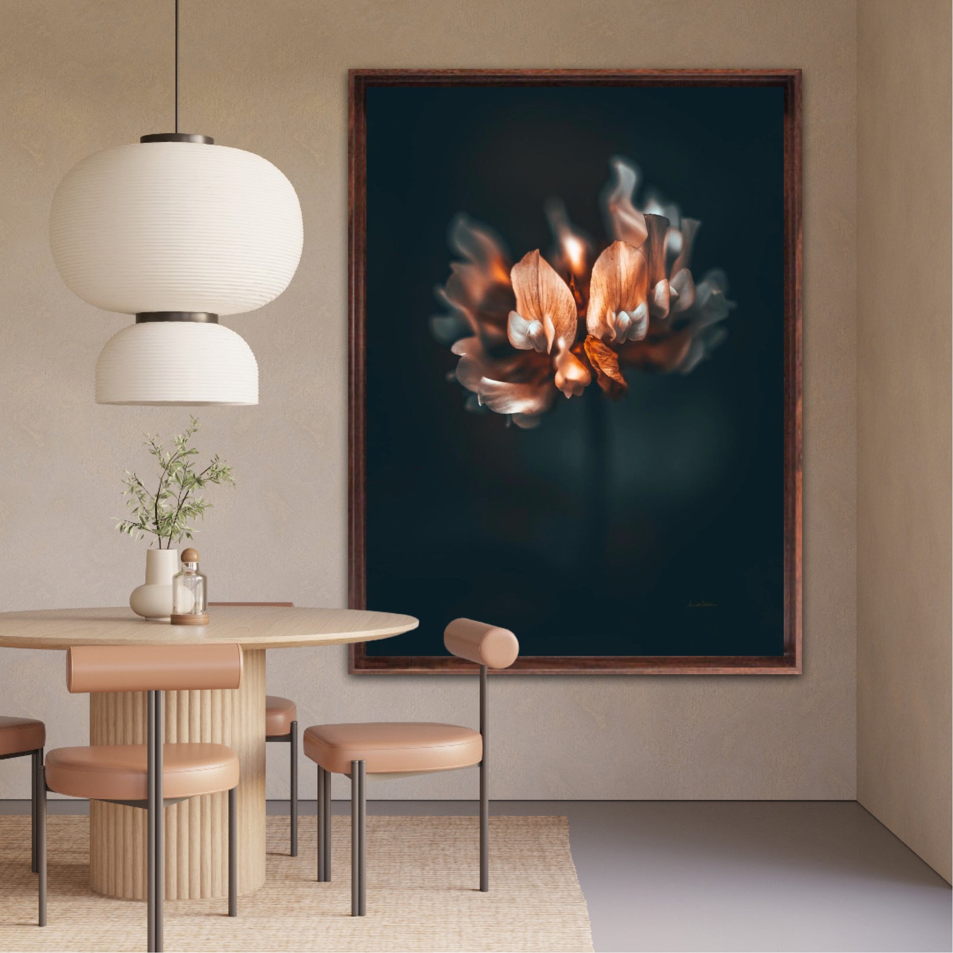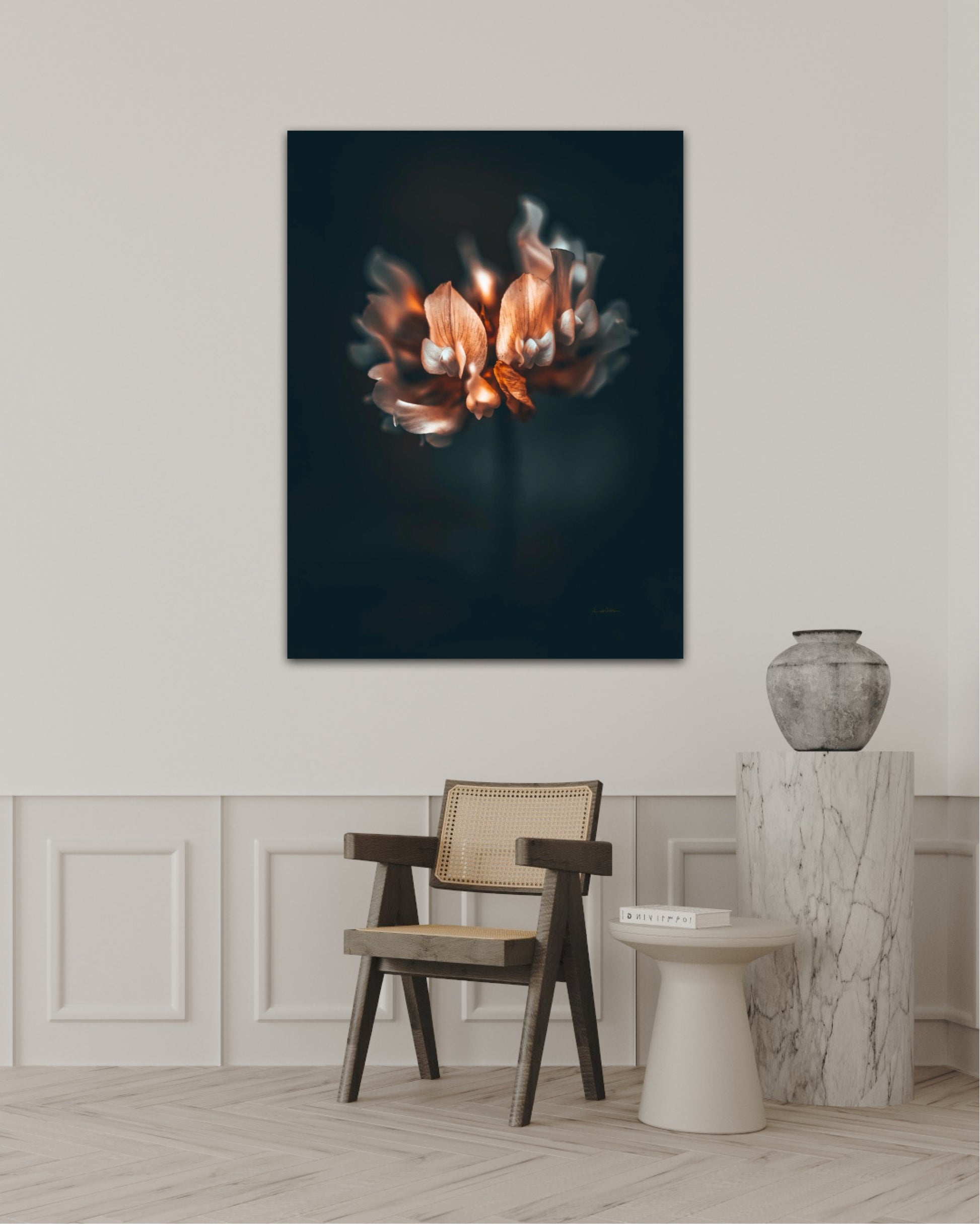 Beautiful photographic wall art of a clover flower in mysterious light on a dark background. This wall picture will be a great decoration on your wall. It gives you serenity from nature, and will impress friends and family. Get a beautiful piece of art on the wall. The mural fits particularly well in the cabin.