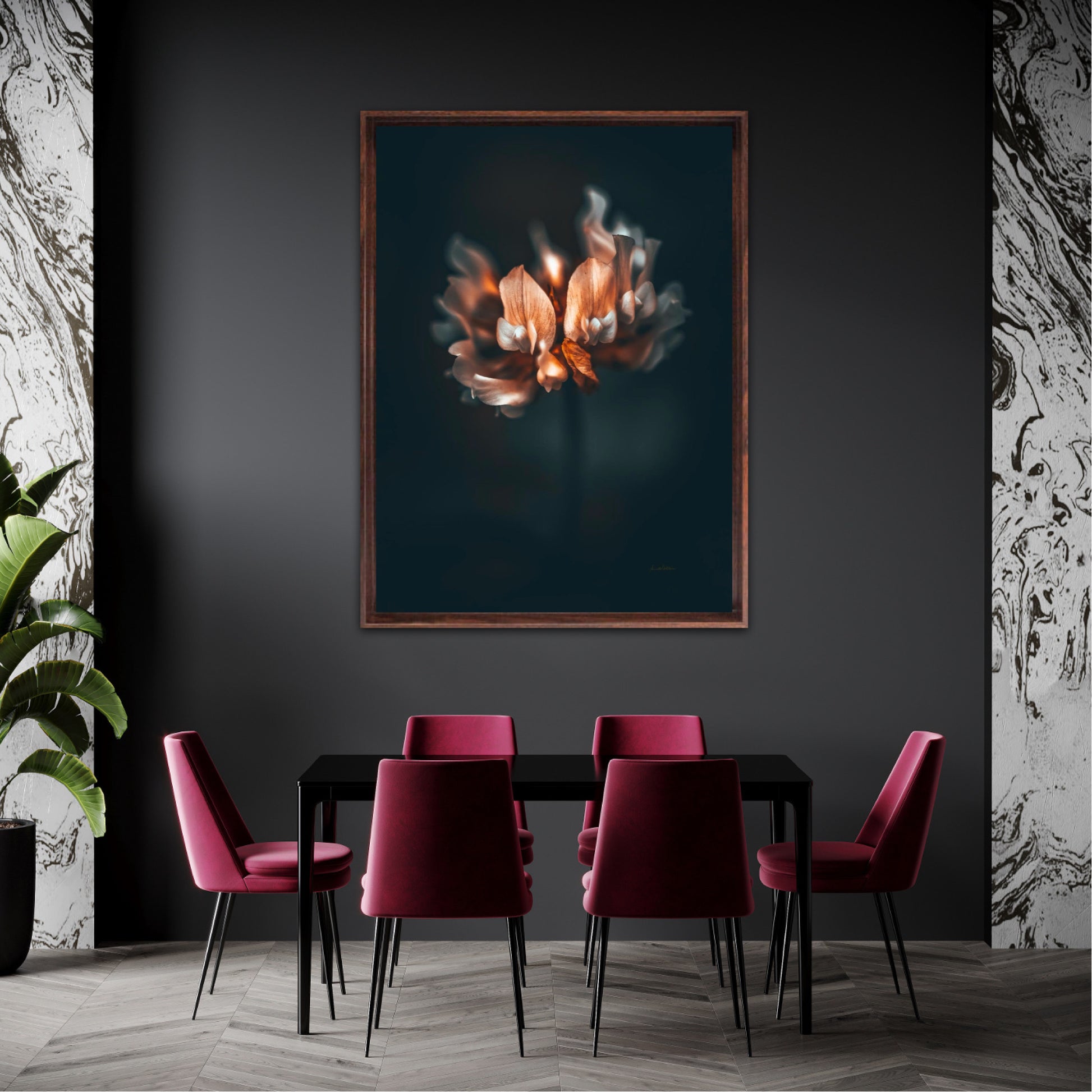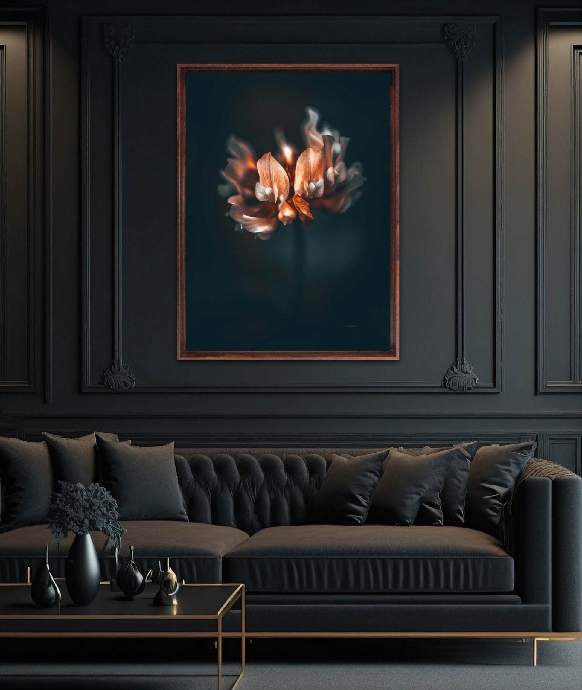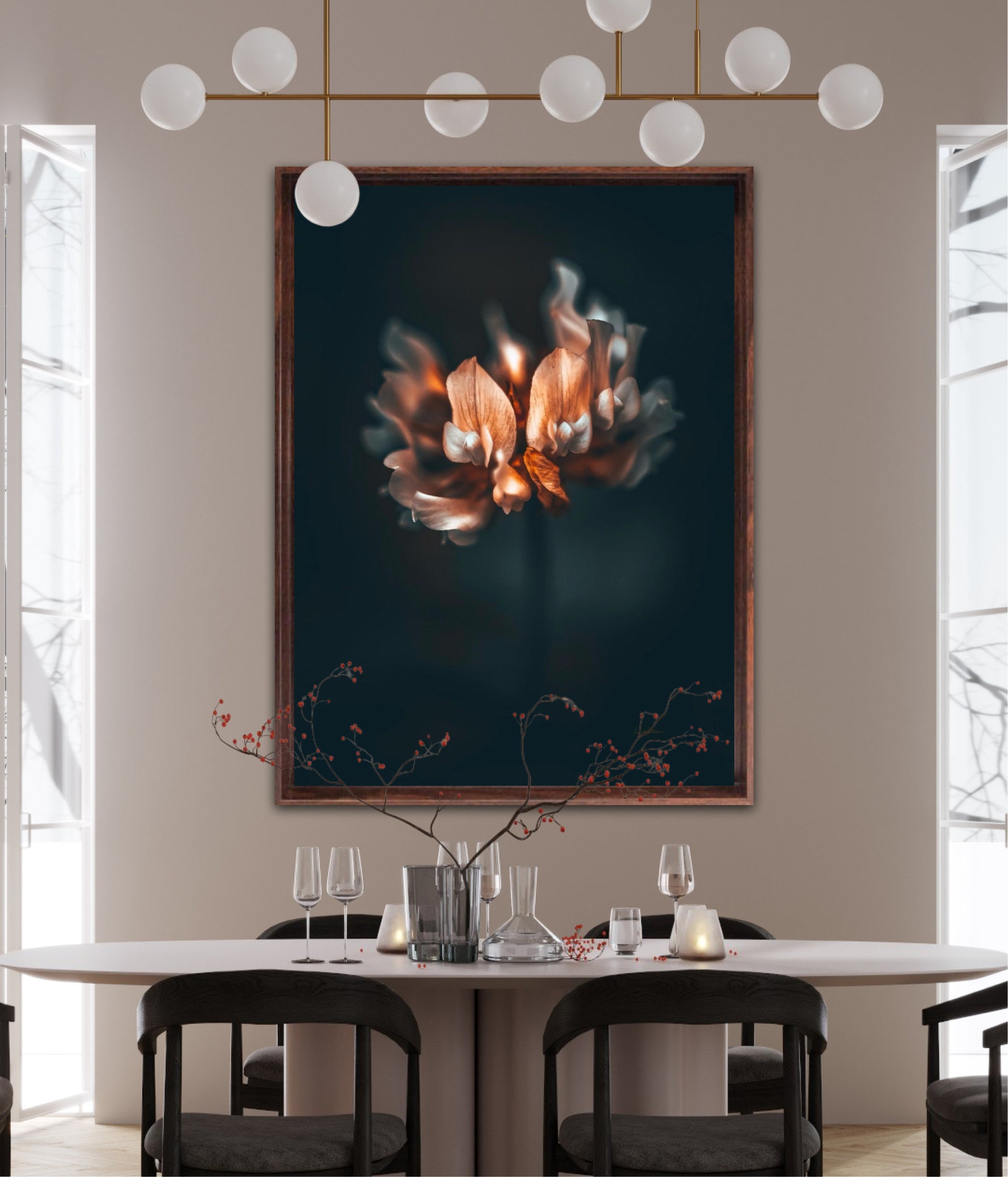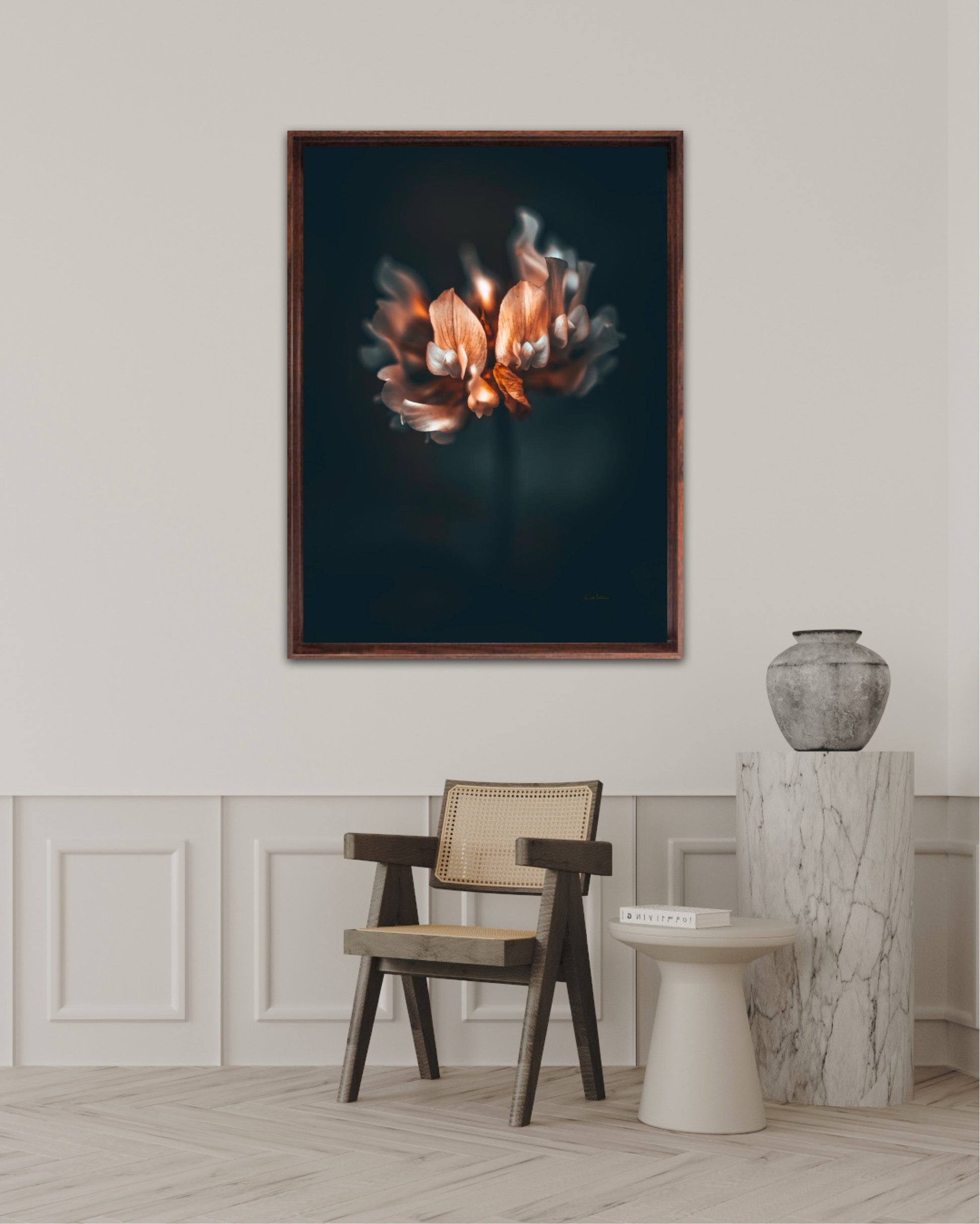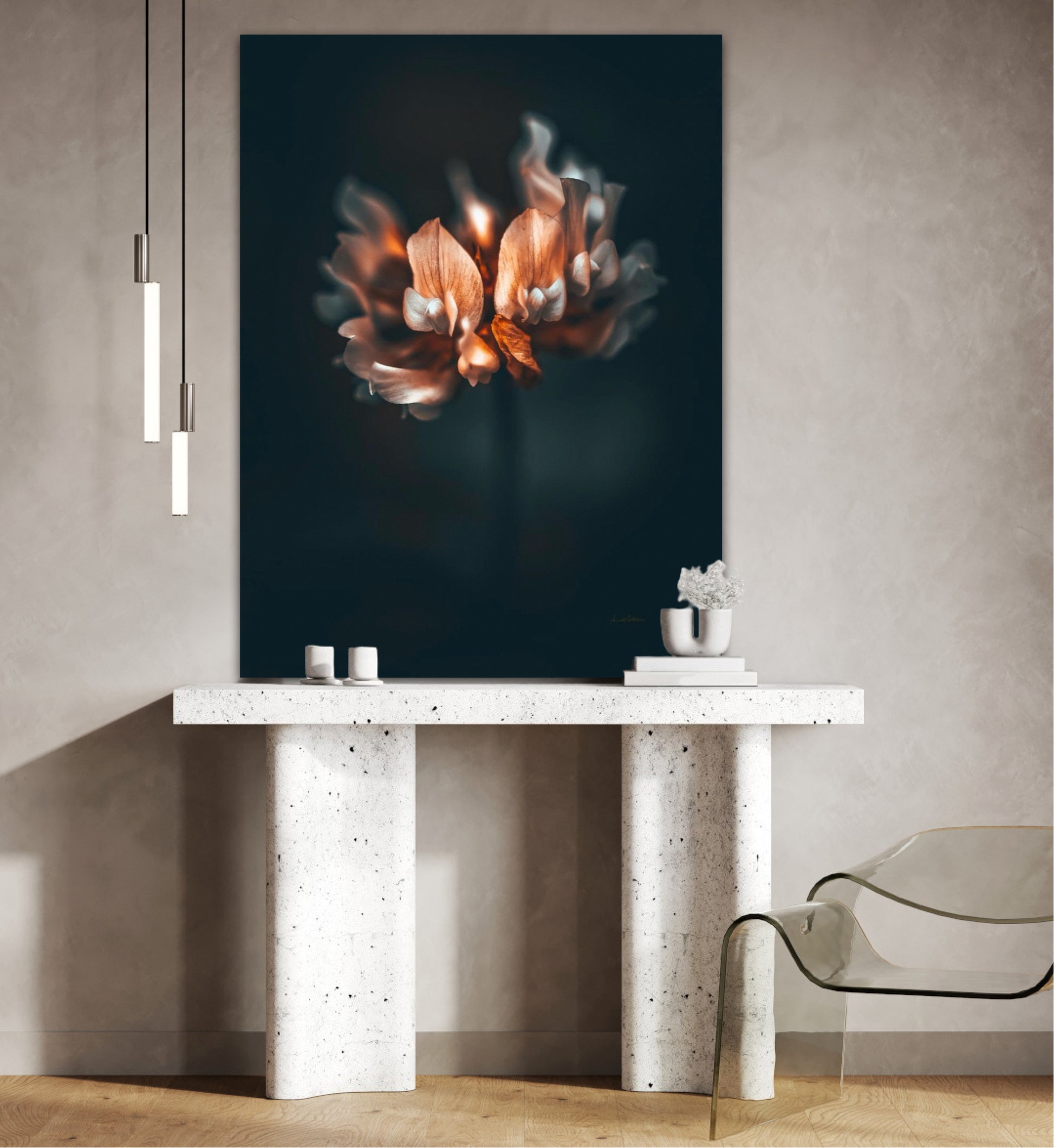 Beautiful photographic wall art of a clover flower in mysterious light on a dark background. This wall picture will be a great decoration on your wall. It gives you serenity from nature, and will impress friends and family. Get a beautiful piece of art on the wall. The mural fits particularly well in the cabin.
