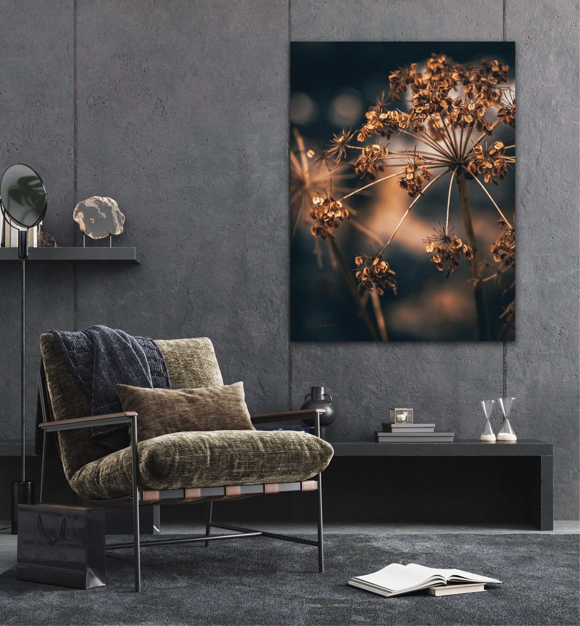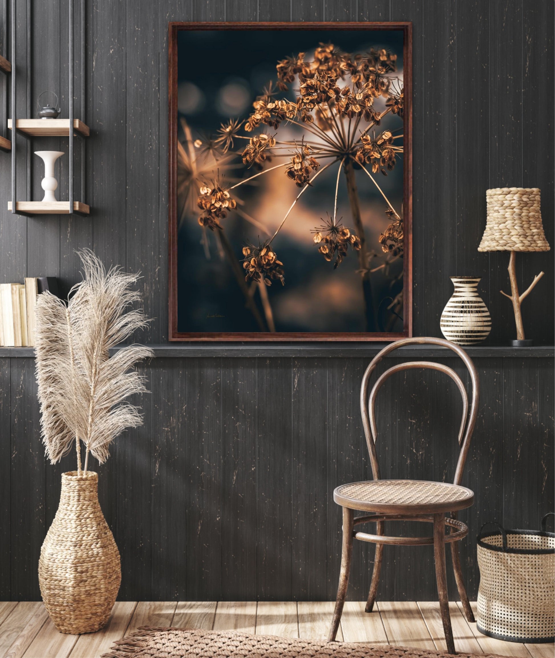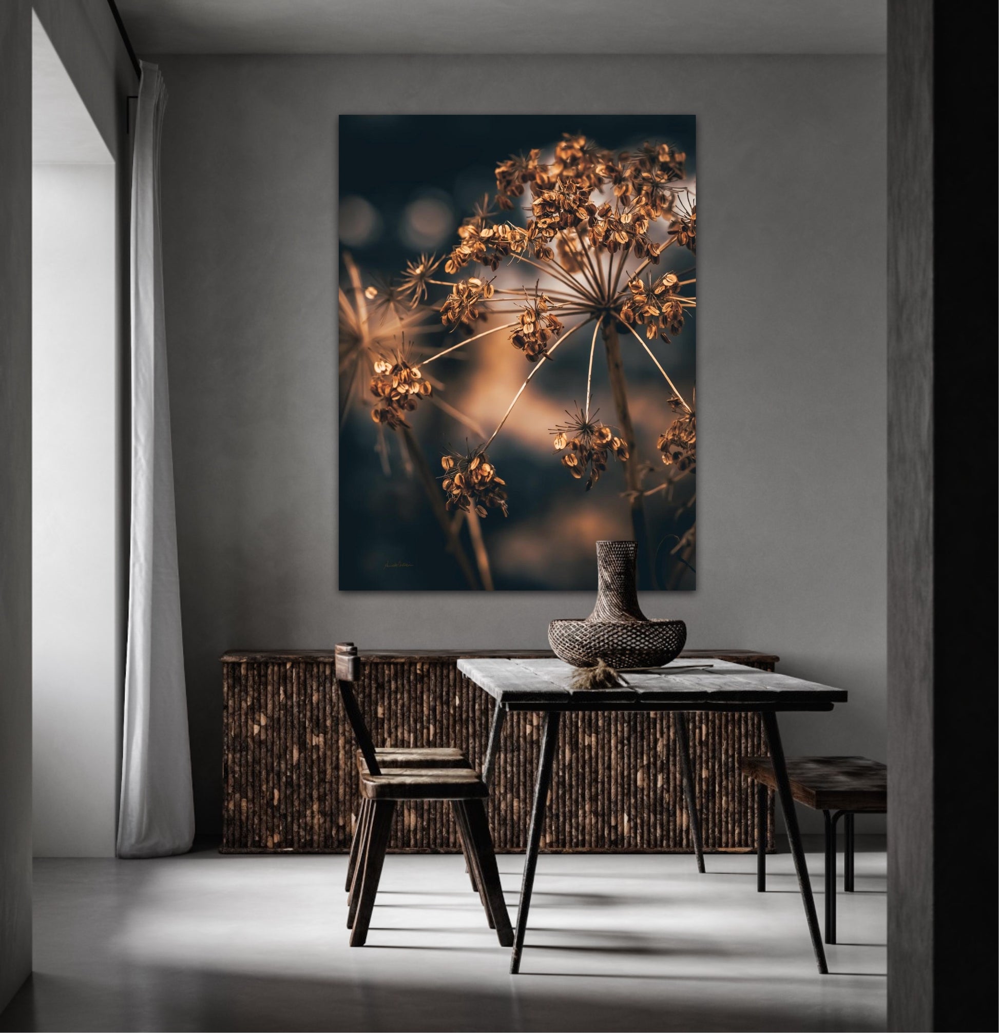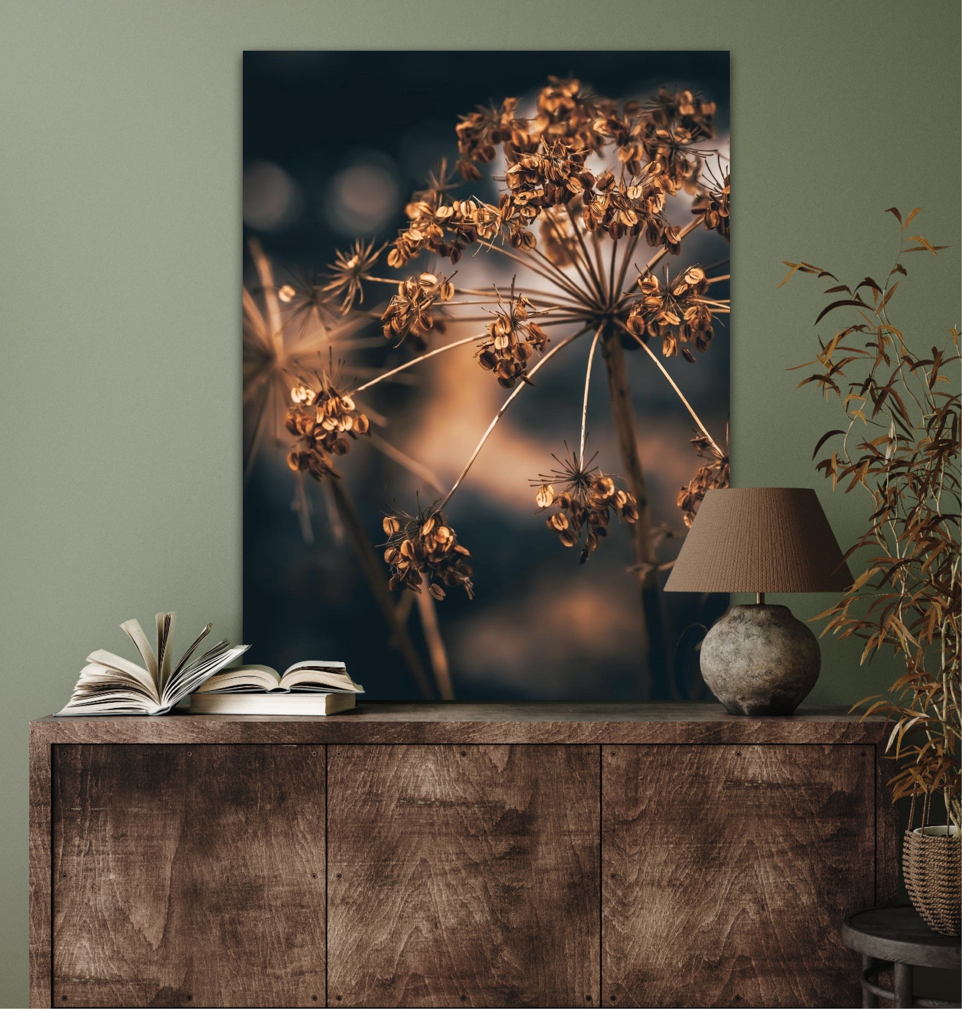 Striking photographic wall art of a dried Heracleum in beautiful brown tones. This beautiful artwork will be an eye-catcher in the living room and has such beautiful colours. Get a really nice artwork on the wall with this beautiful motif. This artwork will be a stand-out piece in your home.