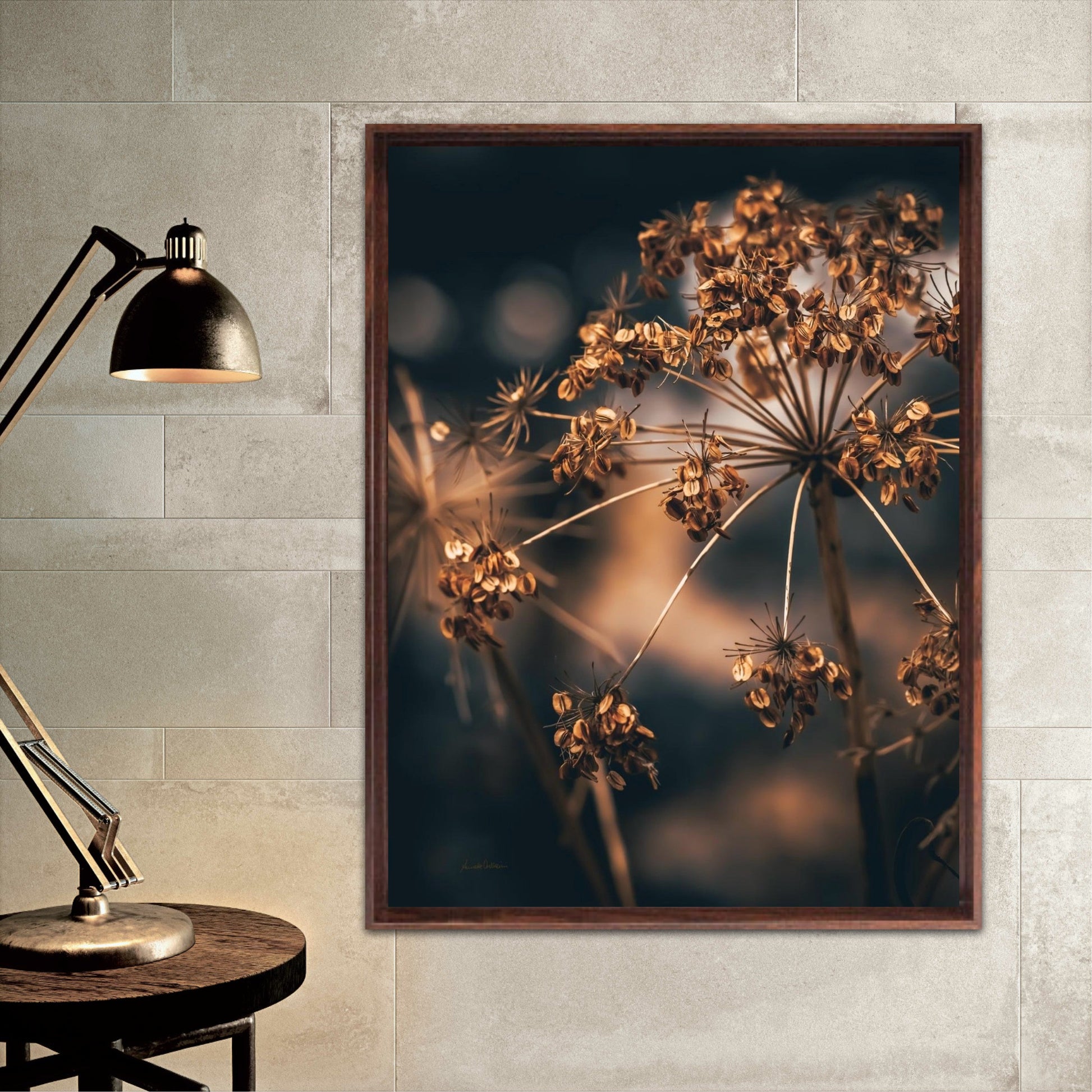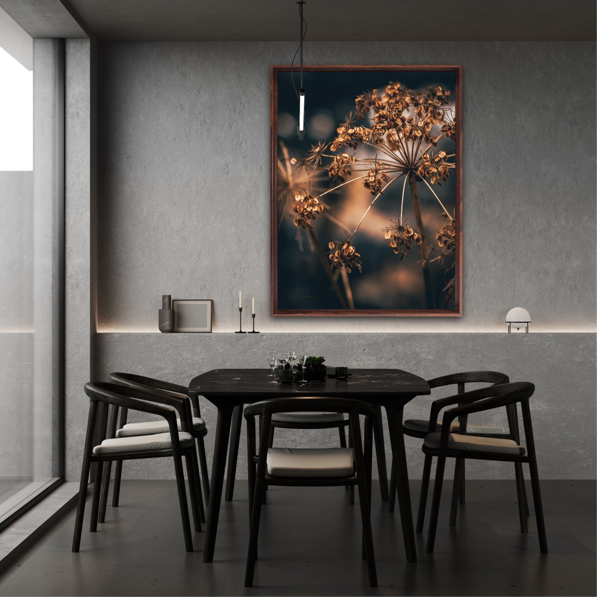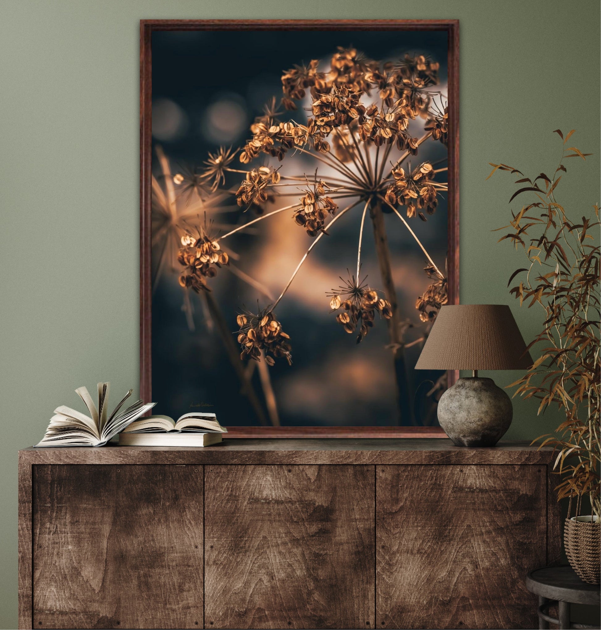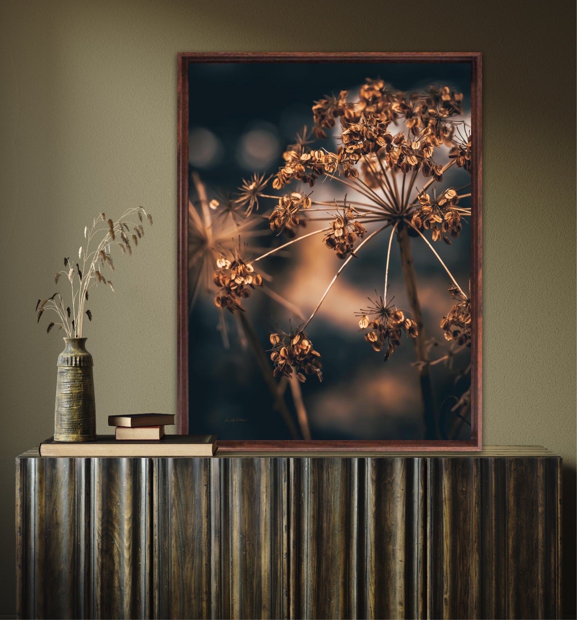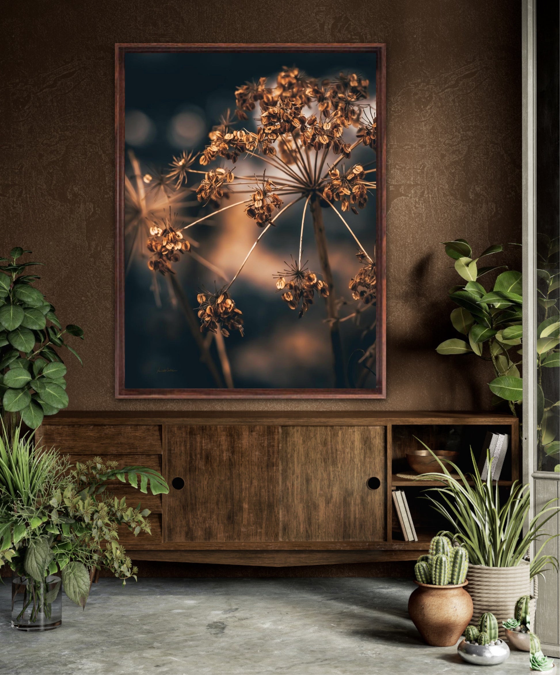 Striking photographic wall art of a dried Heracleum in beautiful brown tones. This beautiful artwork will be an eye-catcher in the living room and has such beautiful colours. Get a really nice artwork on the wall with this beautiful motif. This artwork will be a stand-out piece in your home.