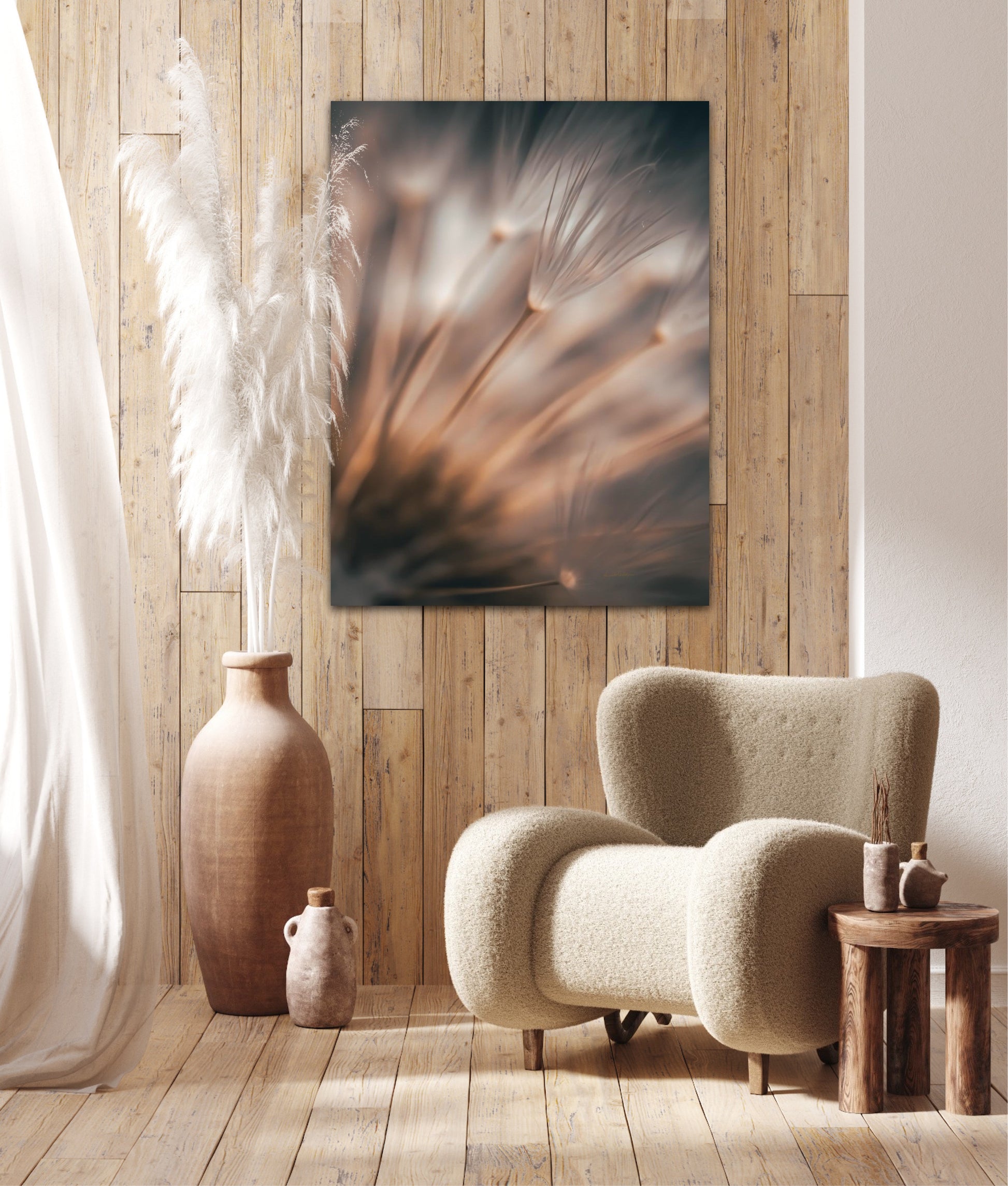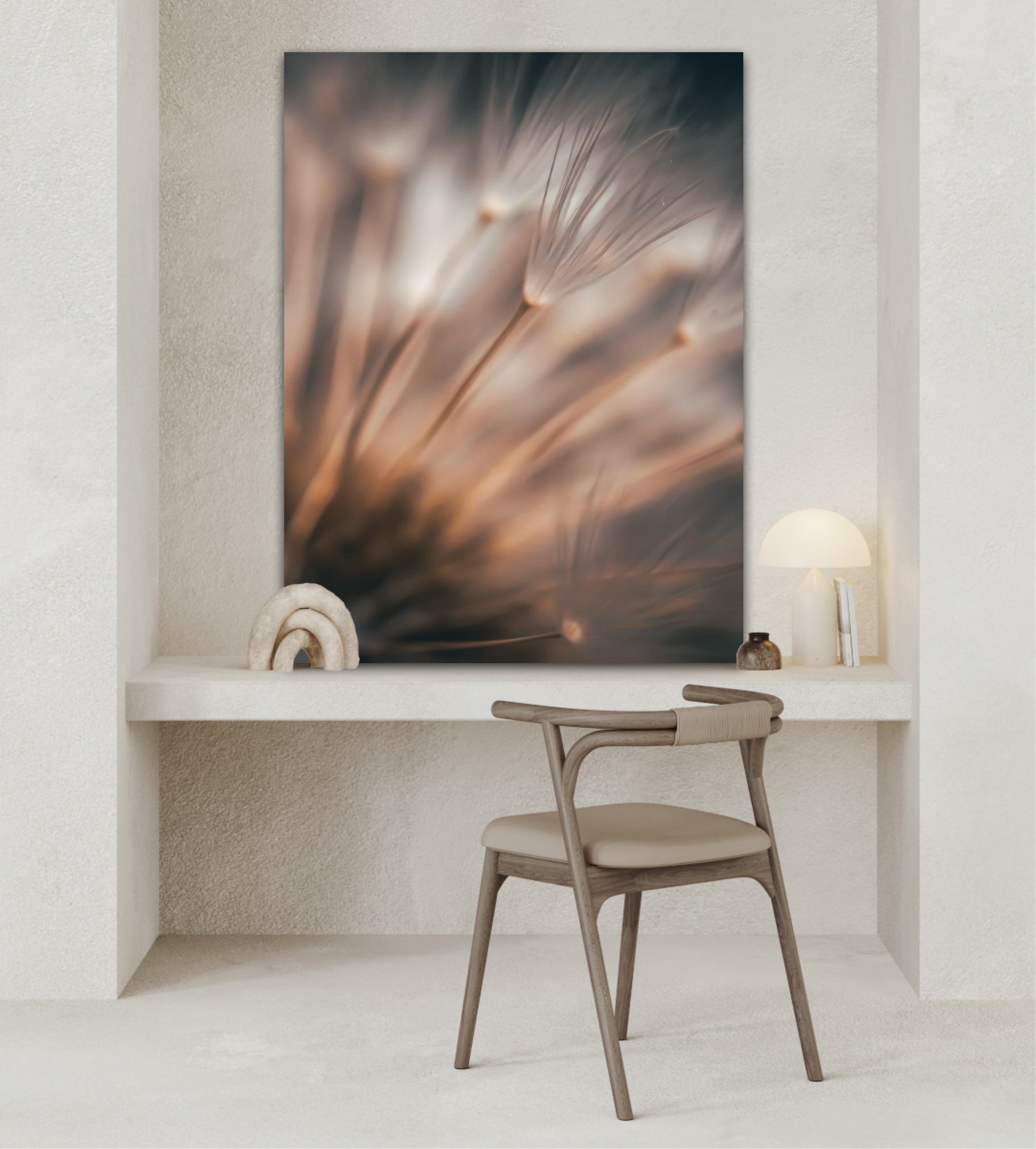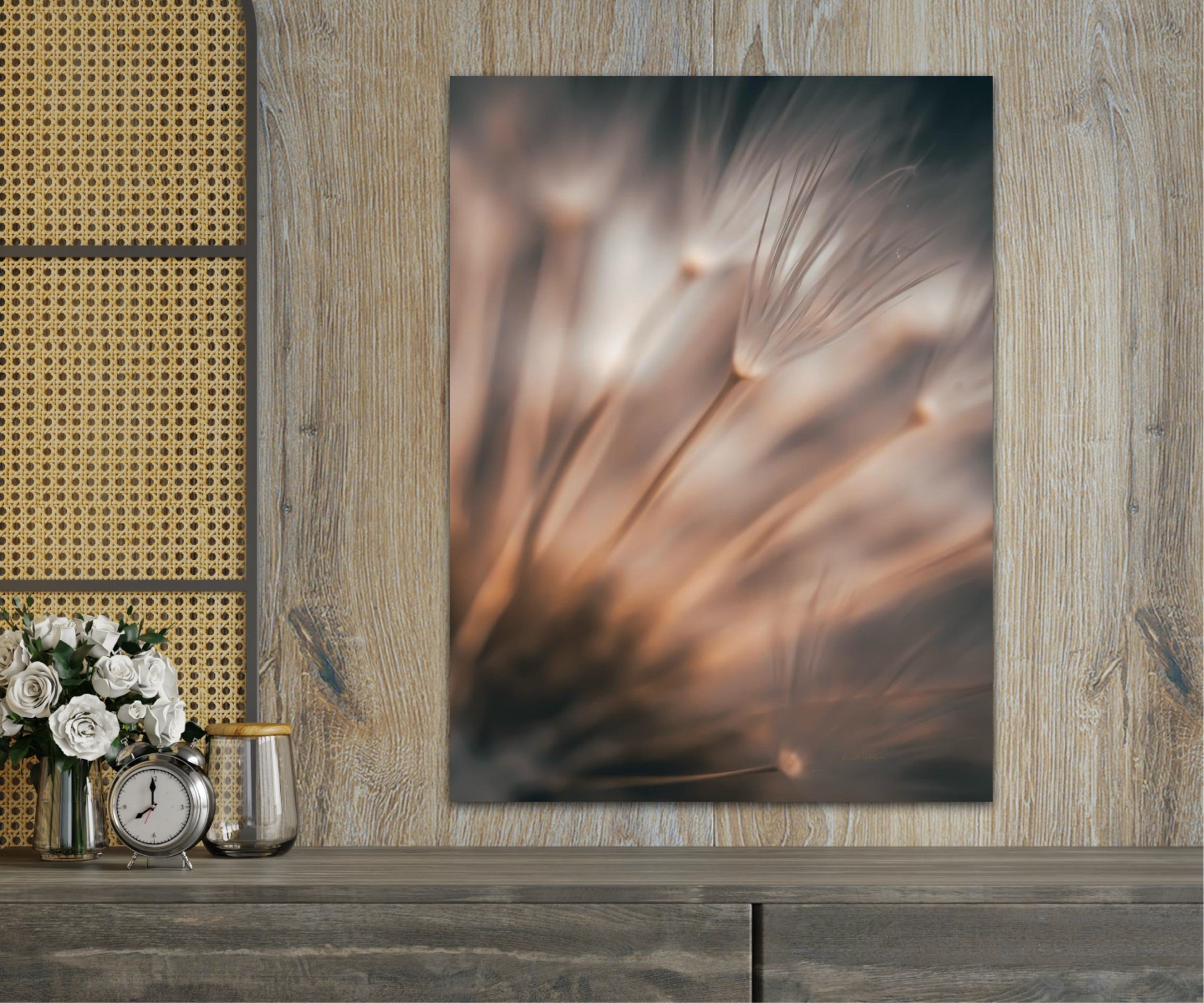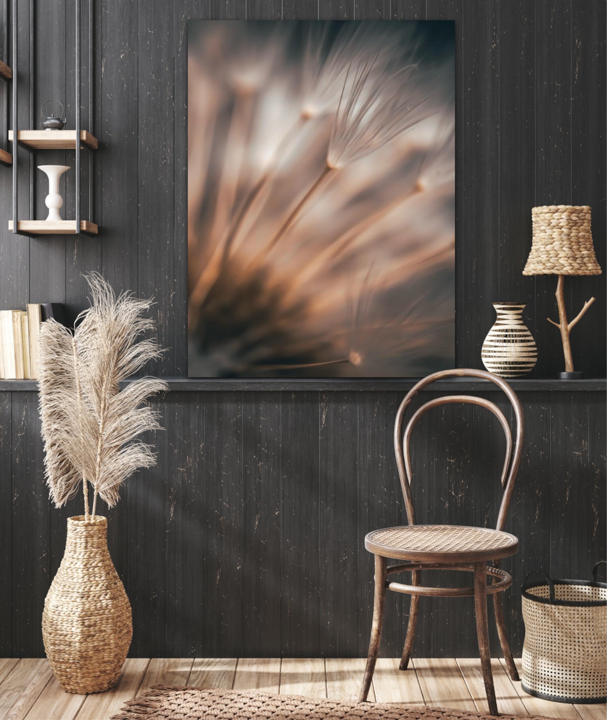 Striking photographic wall art of a dandelion close up in stunning golden brown tones, with beautiful details and dramatic light. This artwork will be a stand-out piece in your home and bring you peace and tranquility.