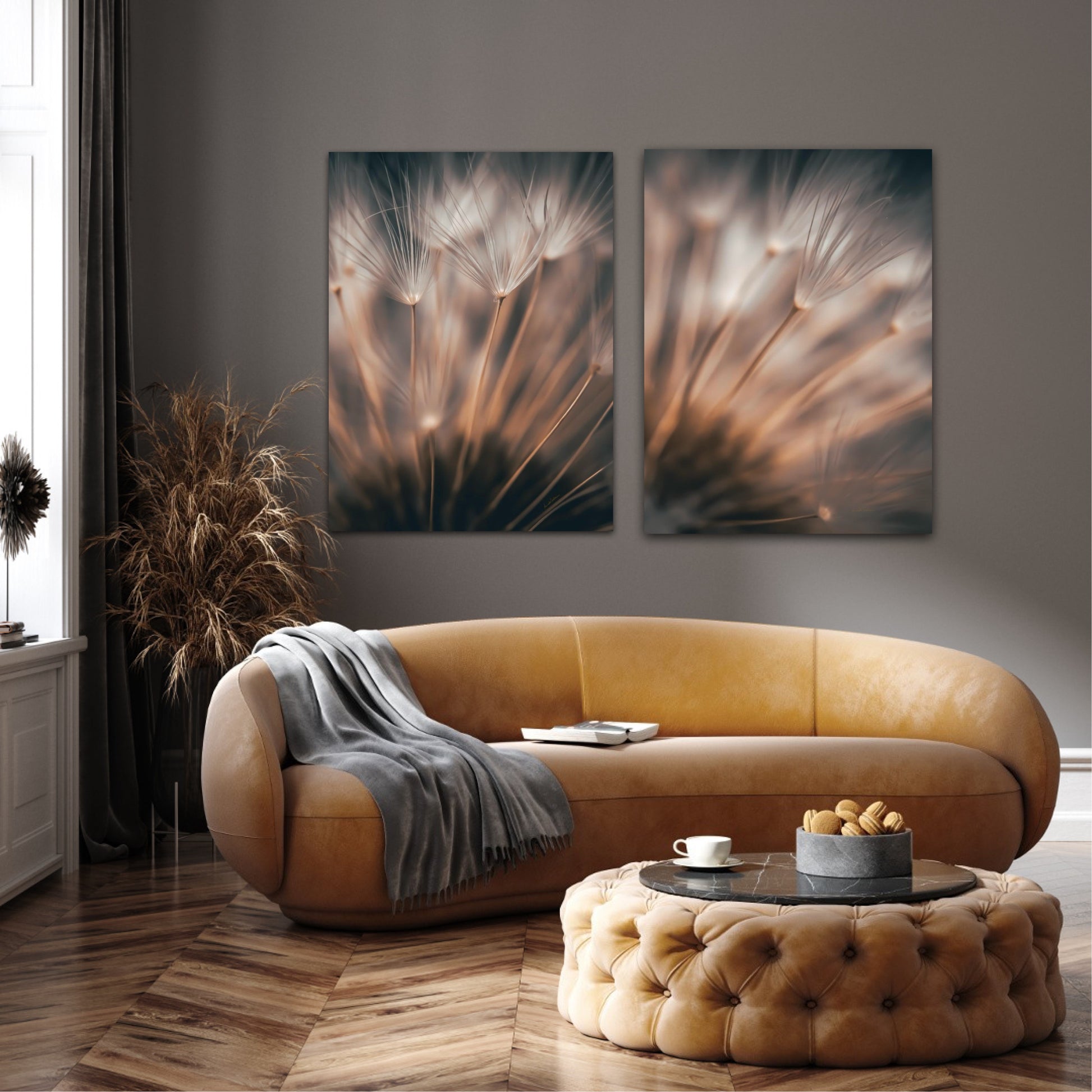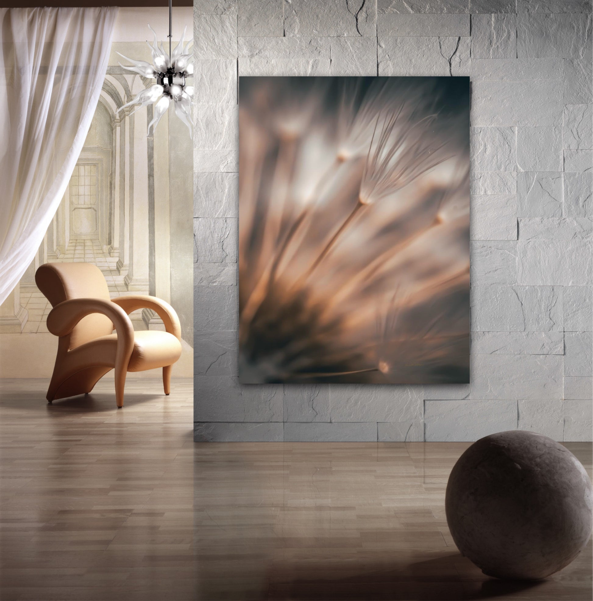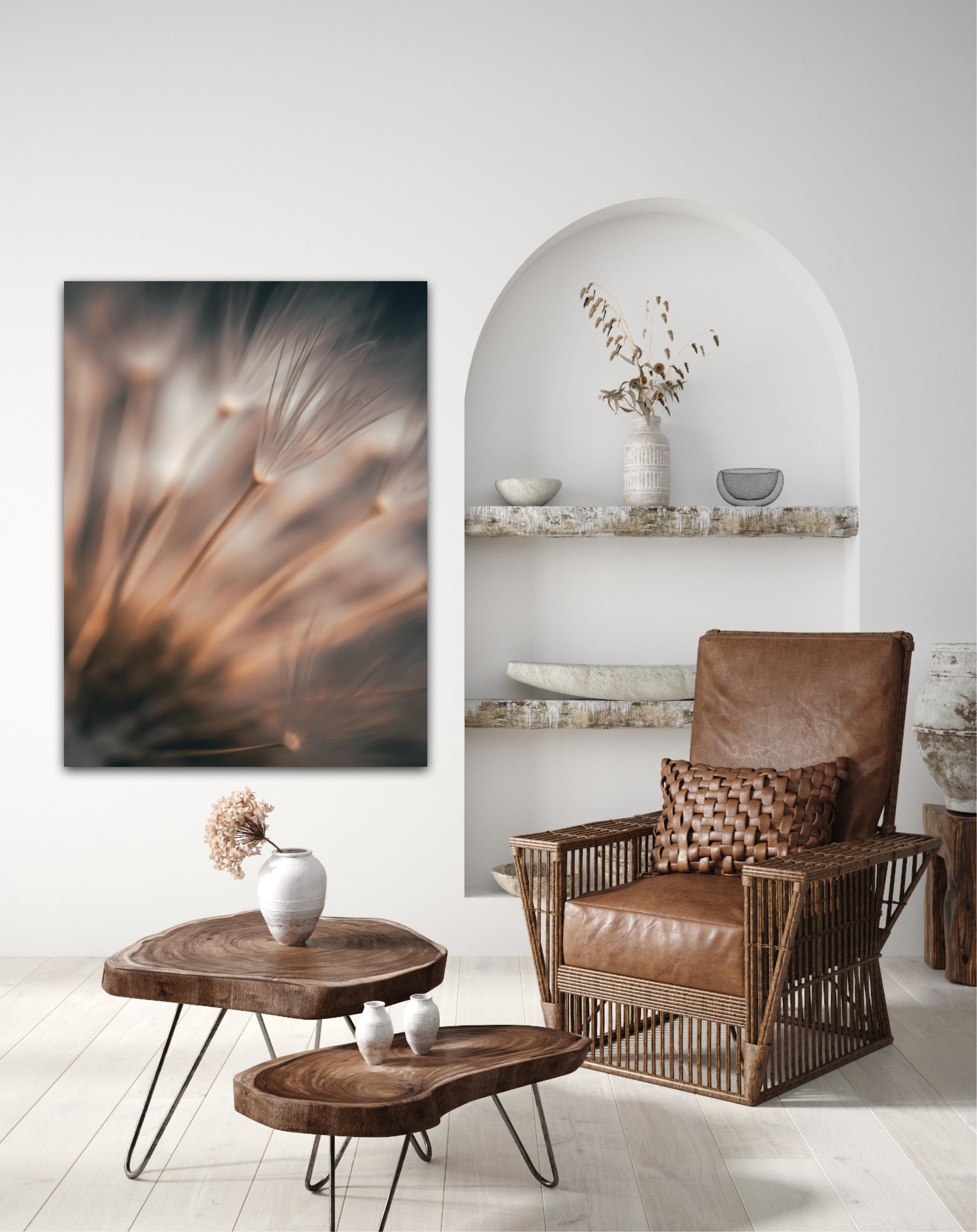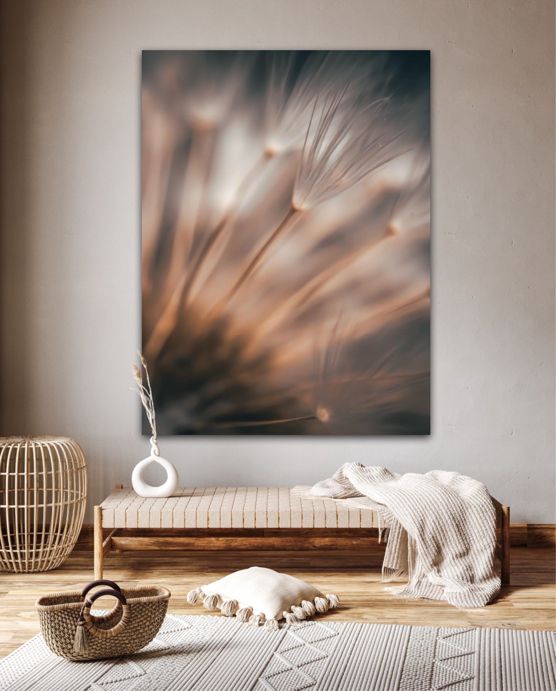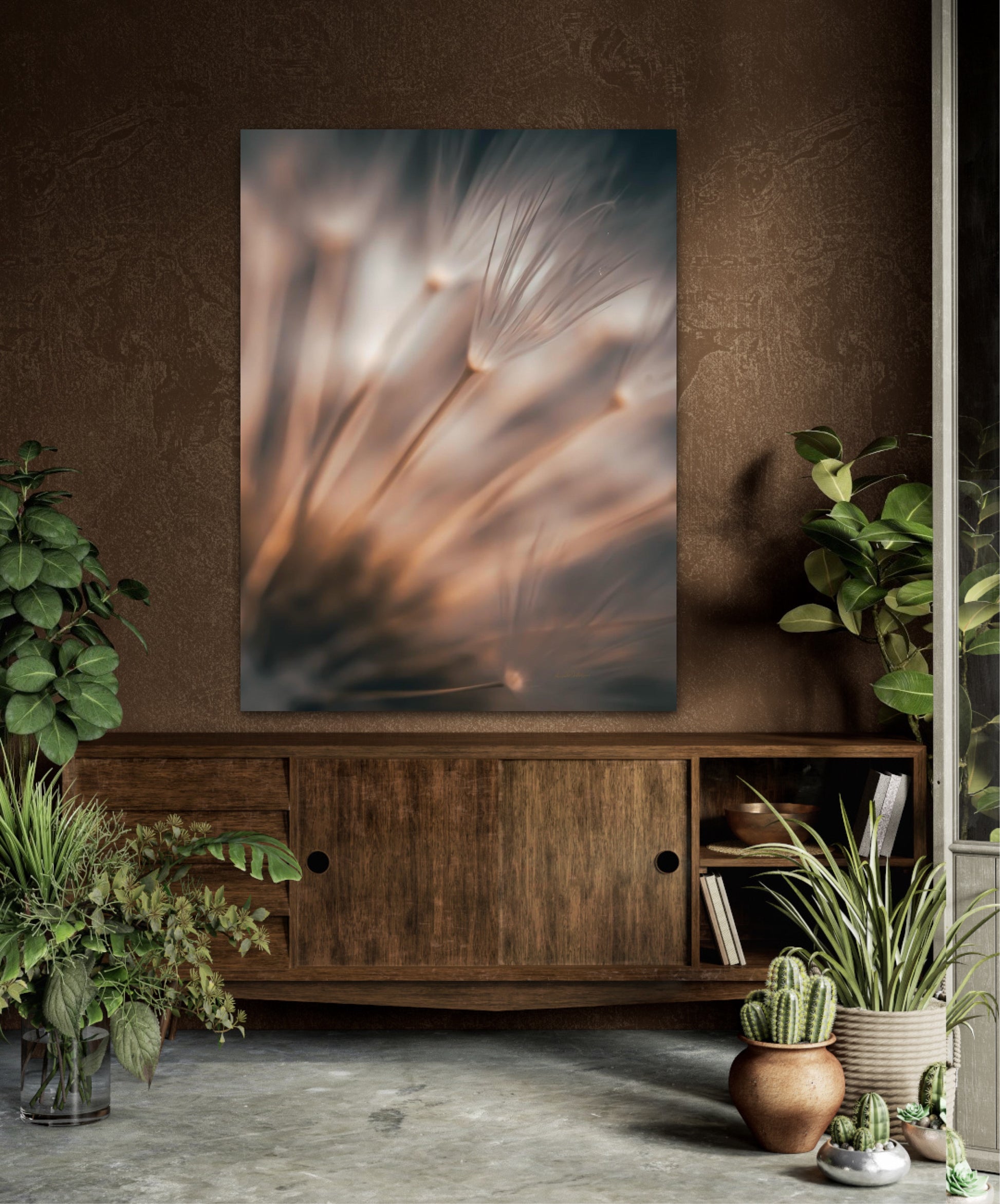 Striking photographic wall art of a dandelion close up in stunning golden brown tones, with beautiful details and dramatic light. This artwork will be a stand-out piece in your home and bring you peace and tranquility.