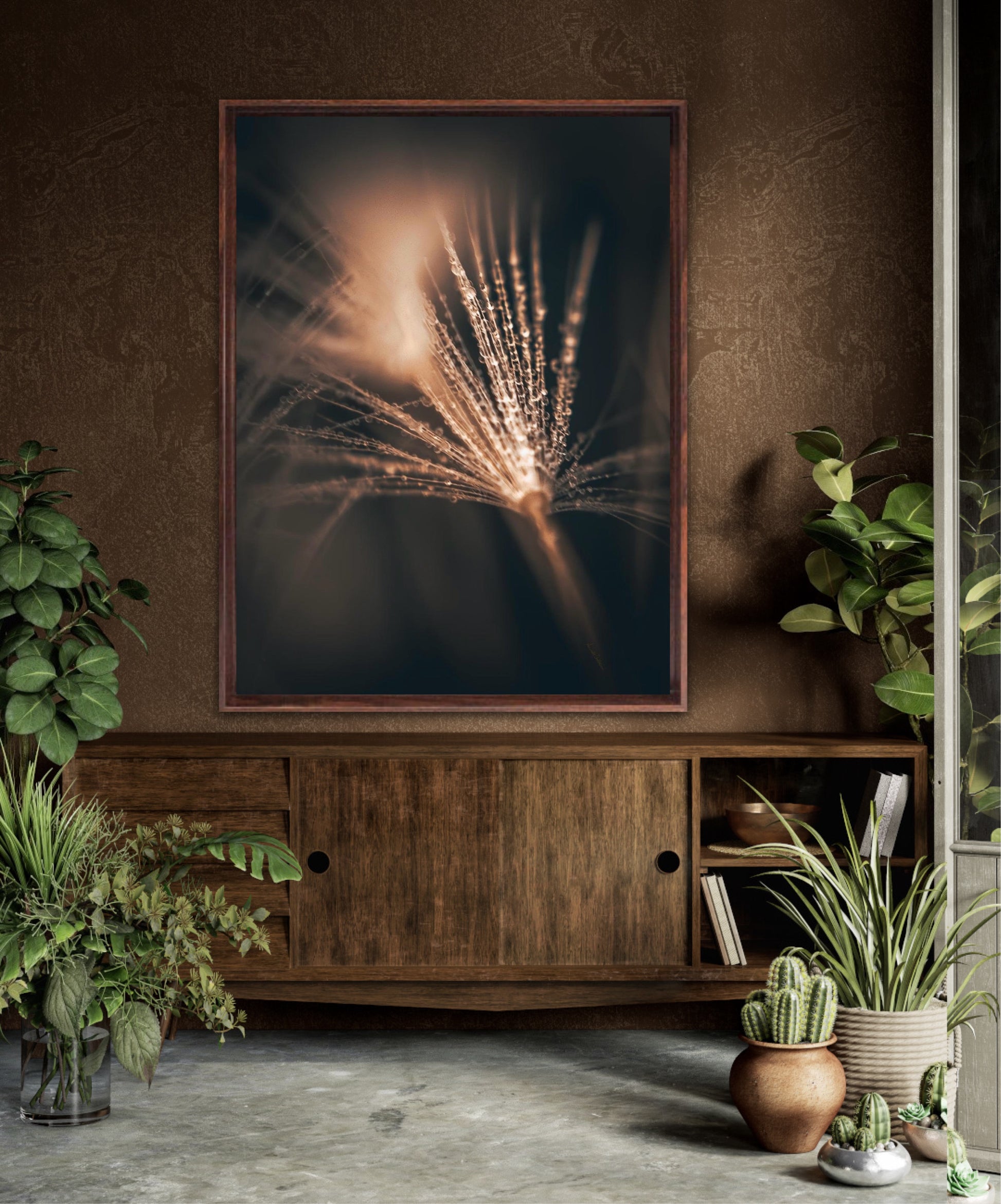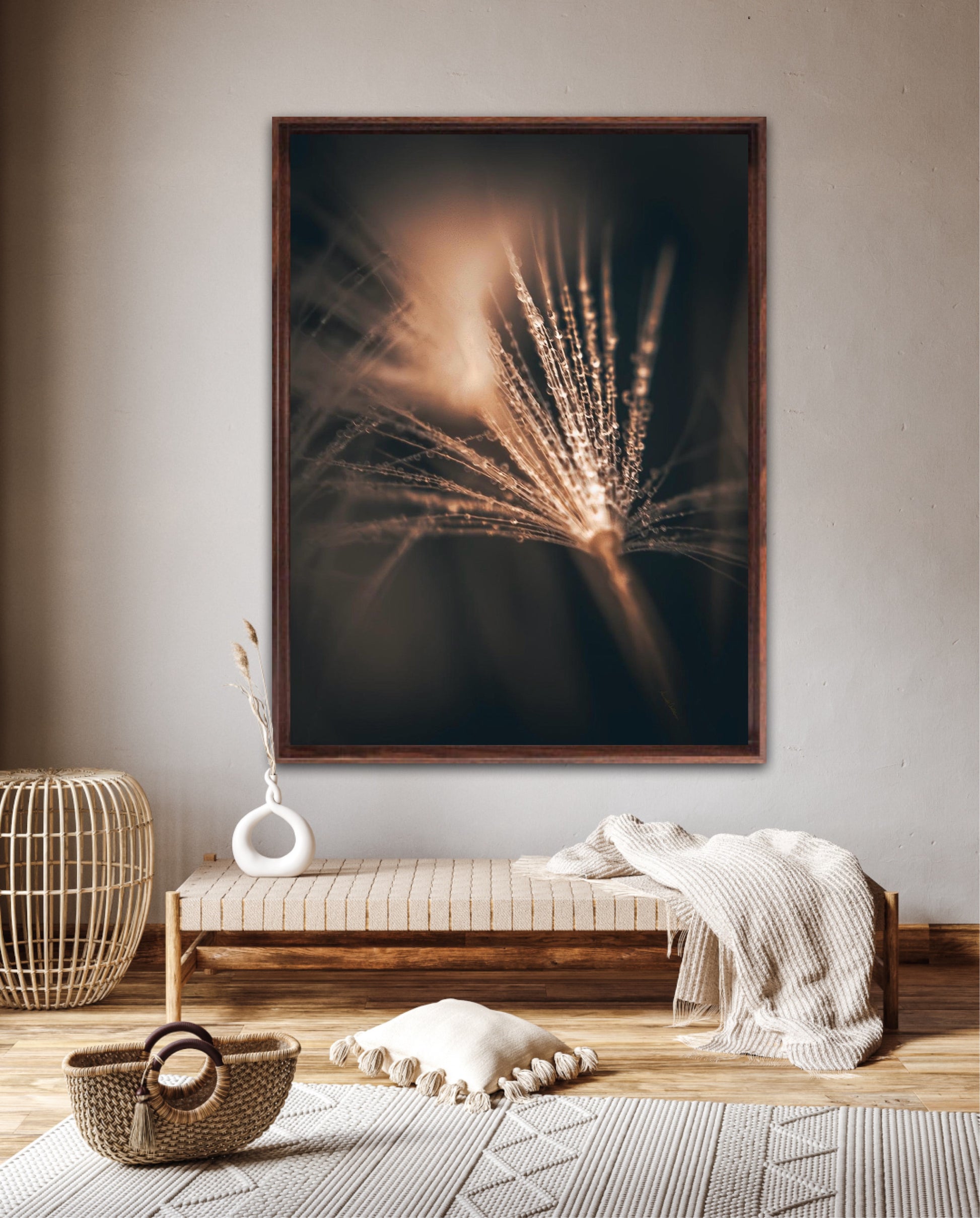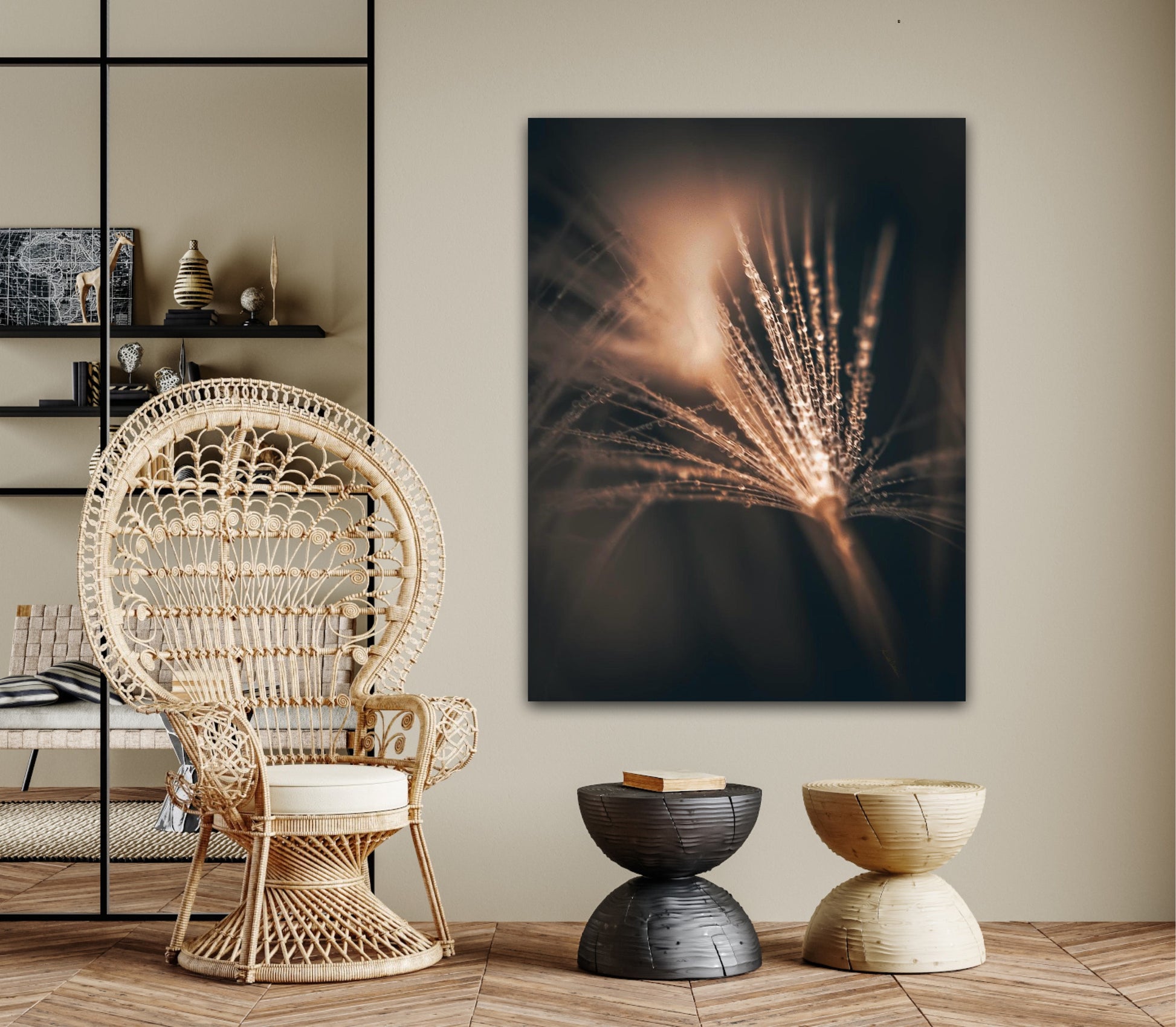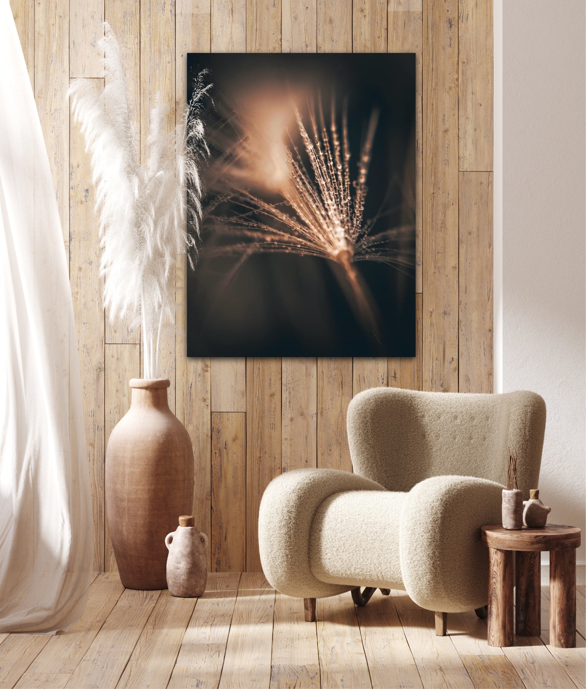 Striking photographic wall art of a dandelion seed close up in stunning golden brown tones, with beautiful details of raindrops and dramatic light. This artwork will be a stand-out piece in your home and bring you peace and tranquility.