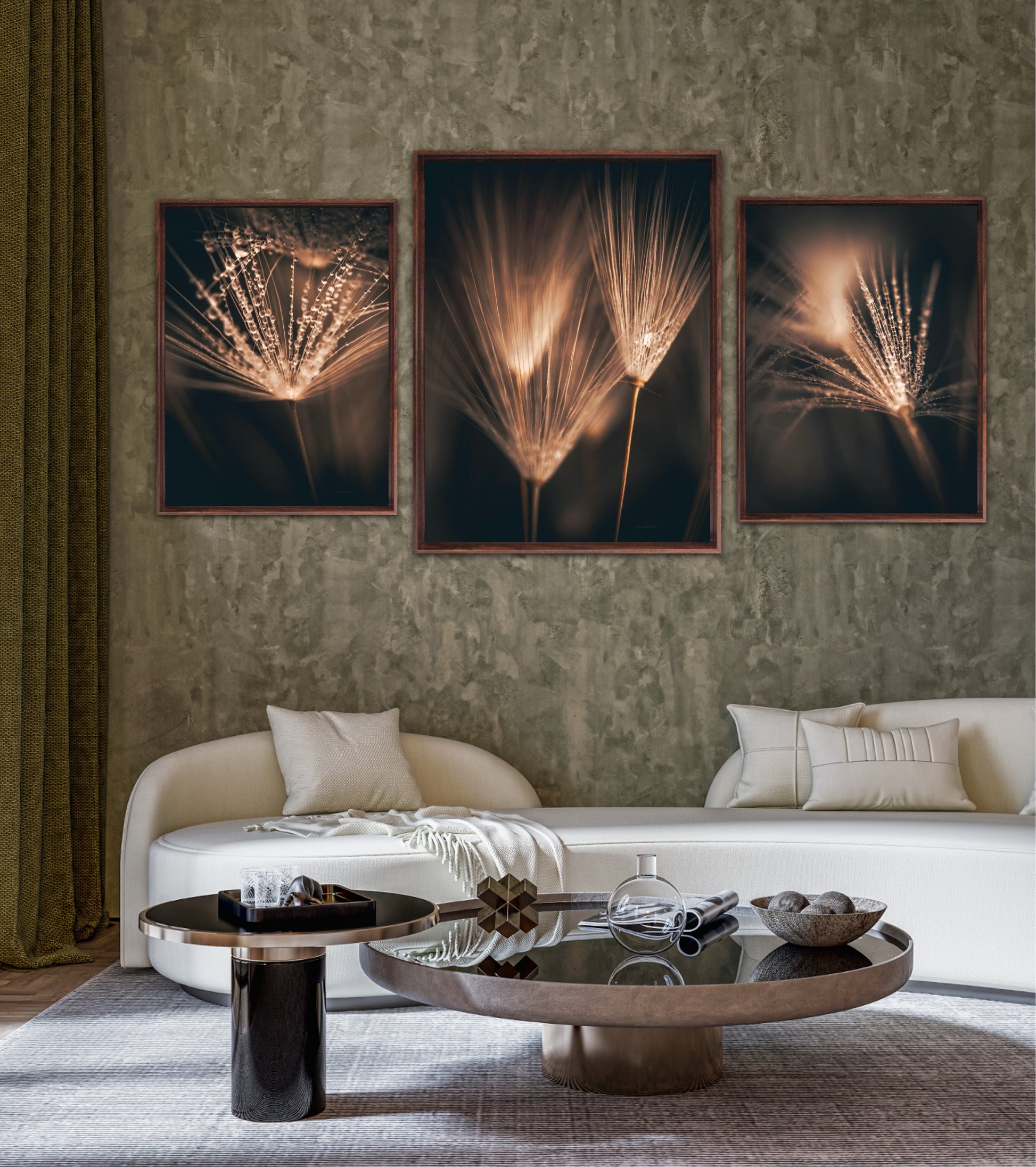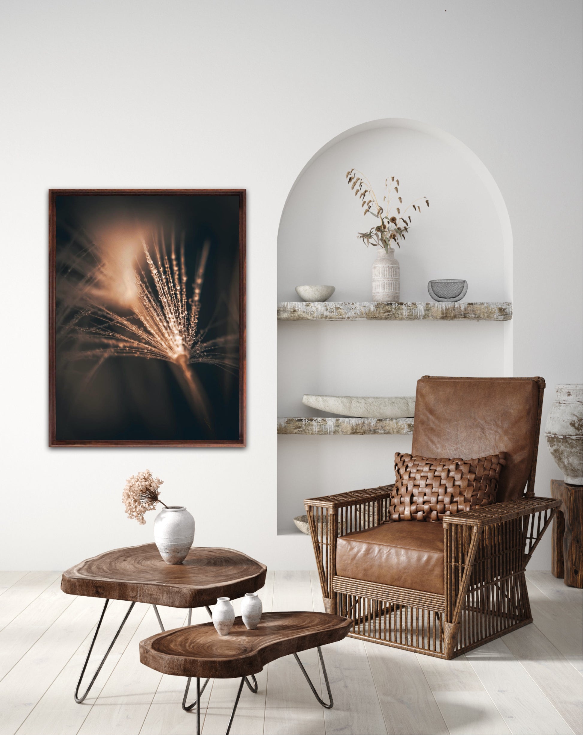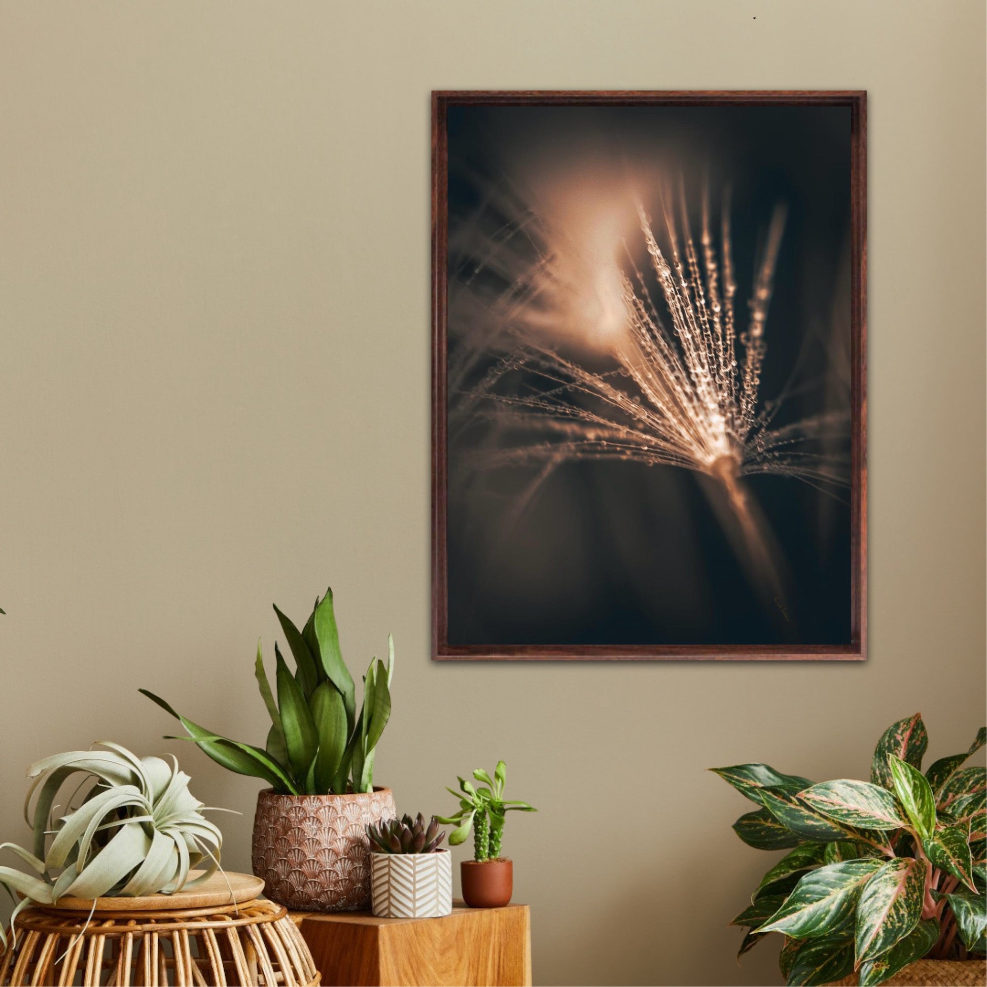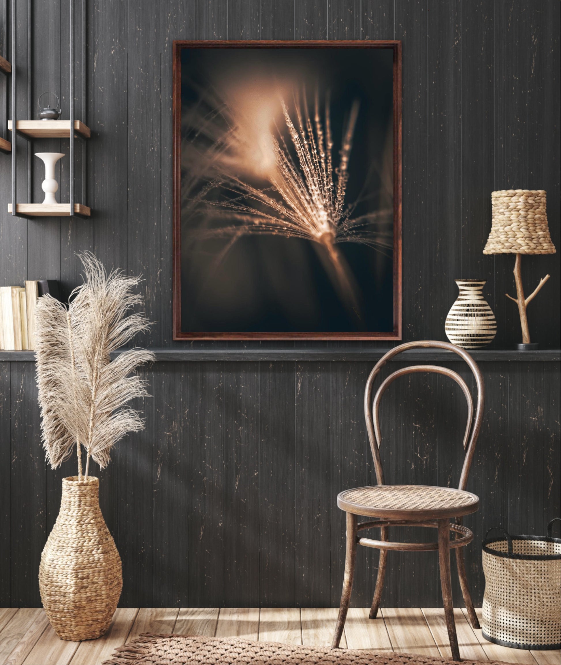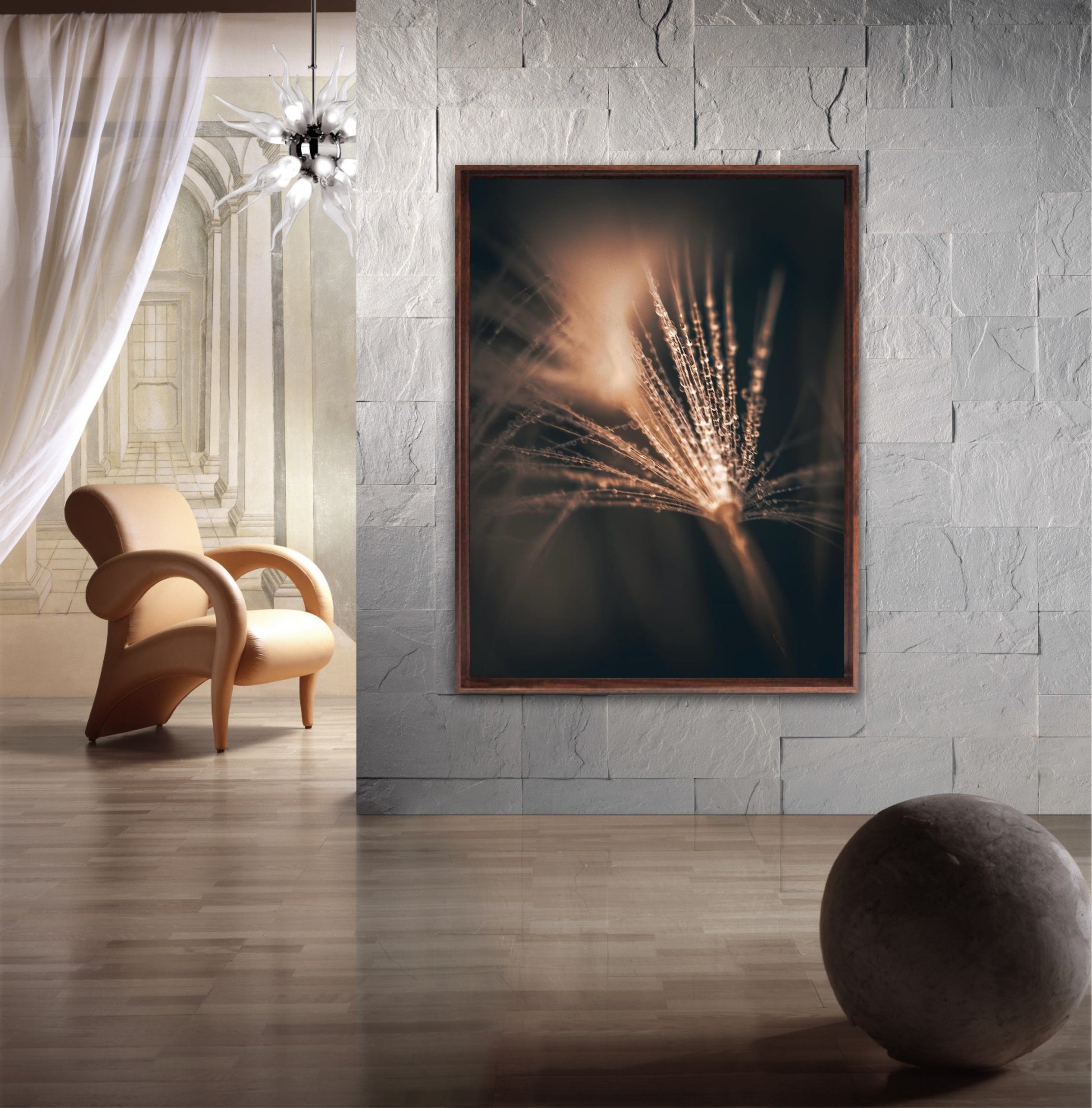 Striking photographic wall art of a dandelion seed close up in stunning golden brown tones, with beautiful details of raindrops and dramatic light. This artwork will be a stand-out piece in your home and bring you peace and tranquility.