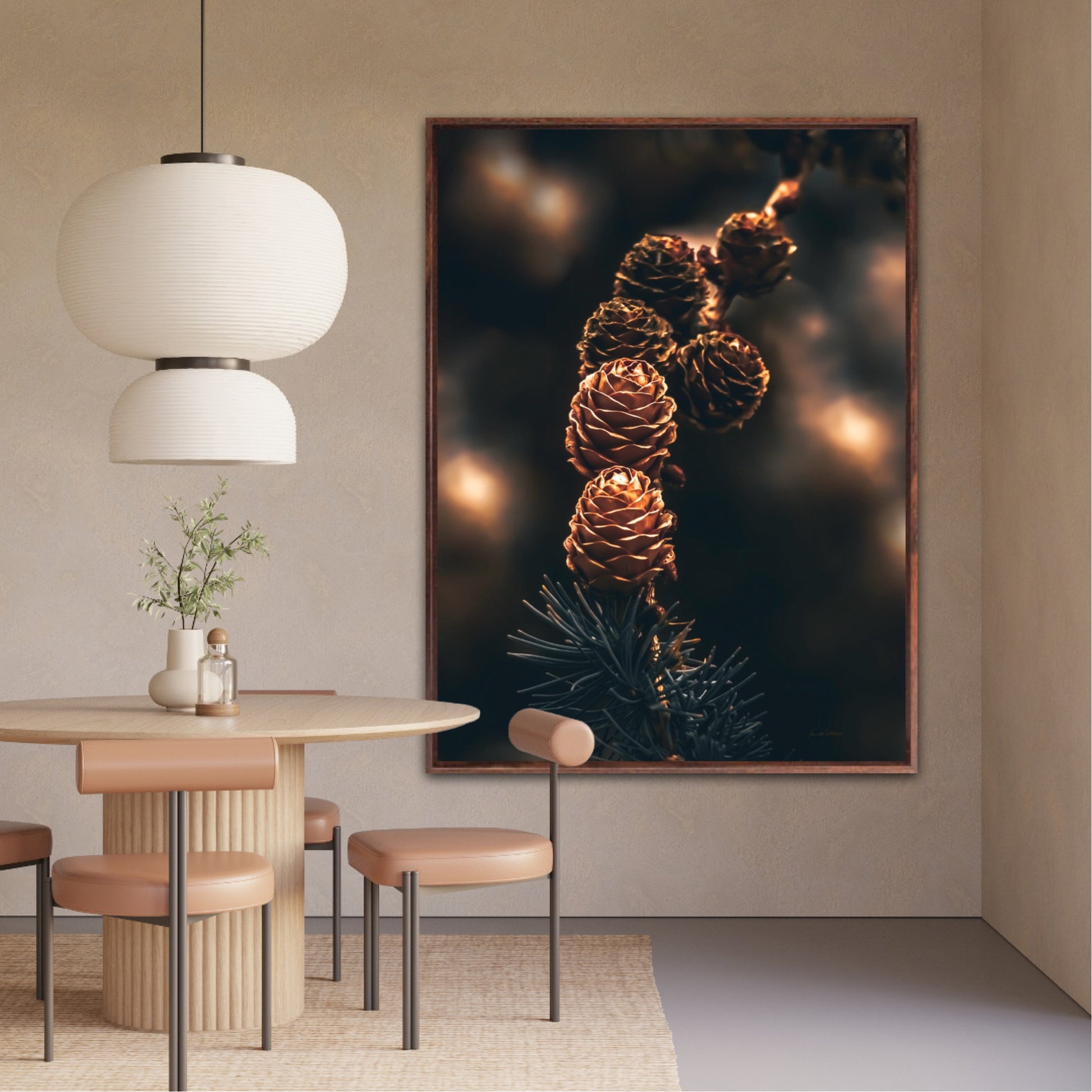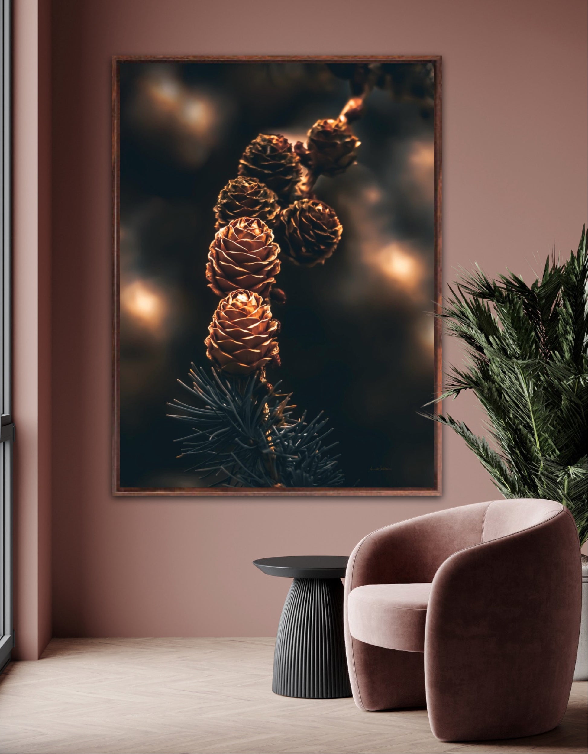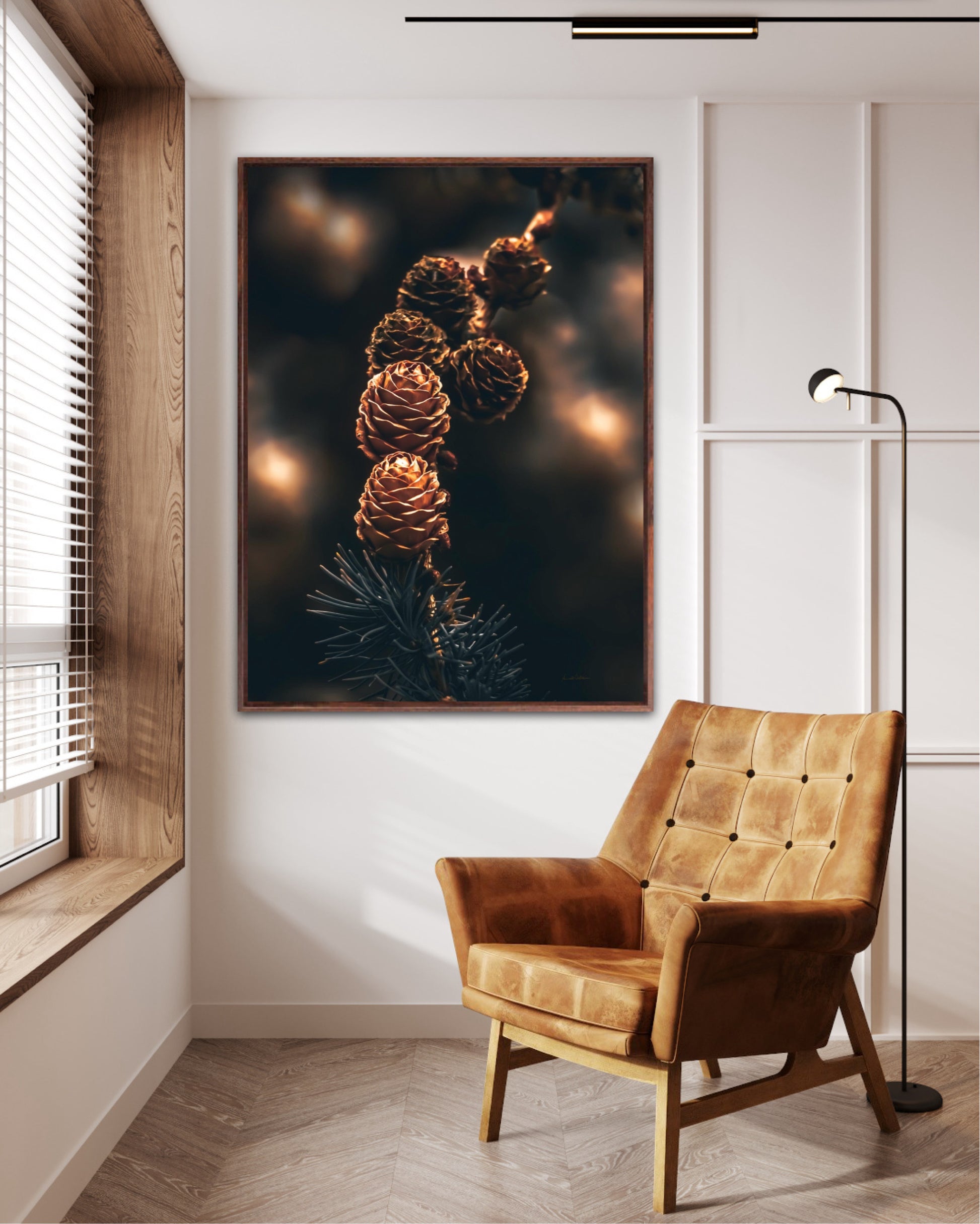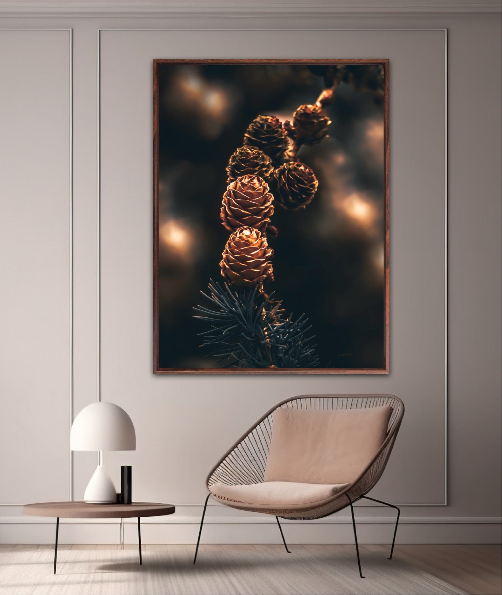 Beautiful photographic wall art of a golden pinecones in dark and dramatic tones with a golden light in the background. This artwork gives your hope that special cosy vibe.