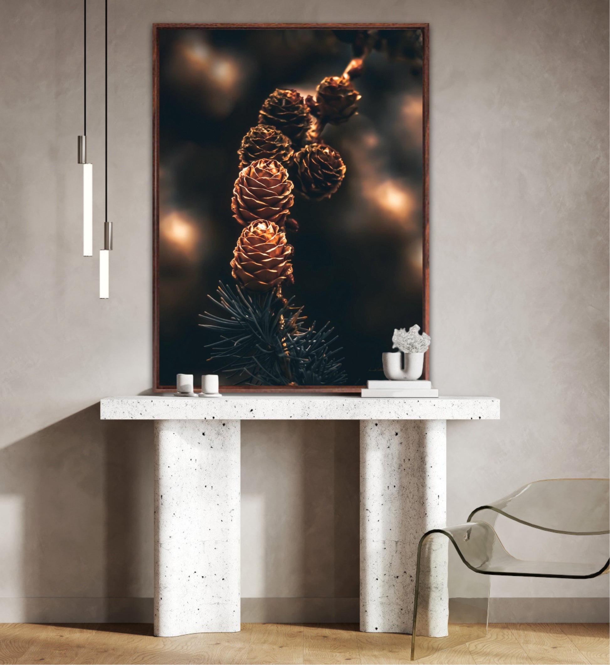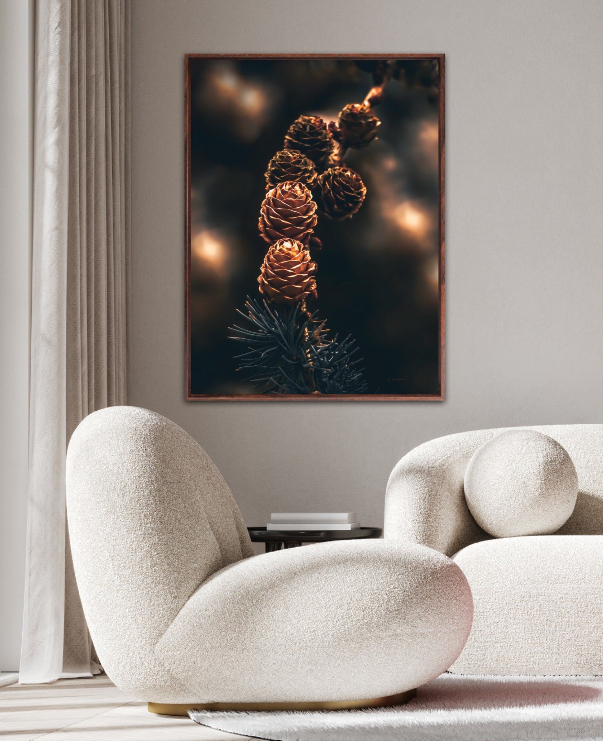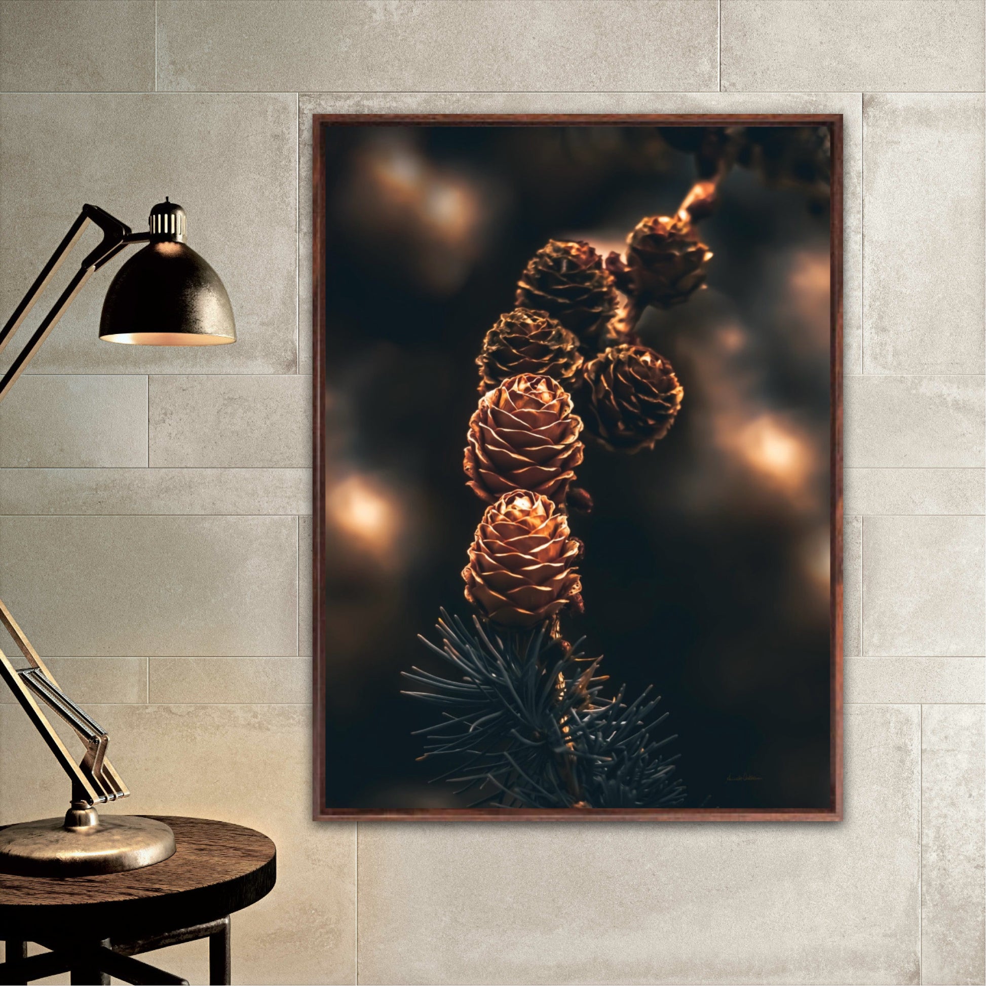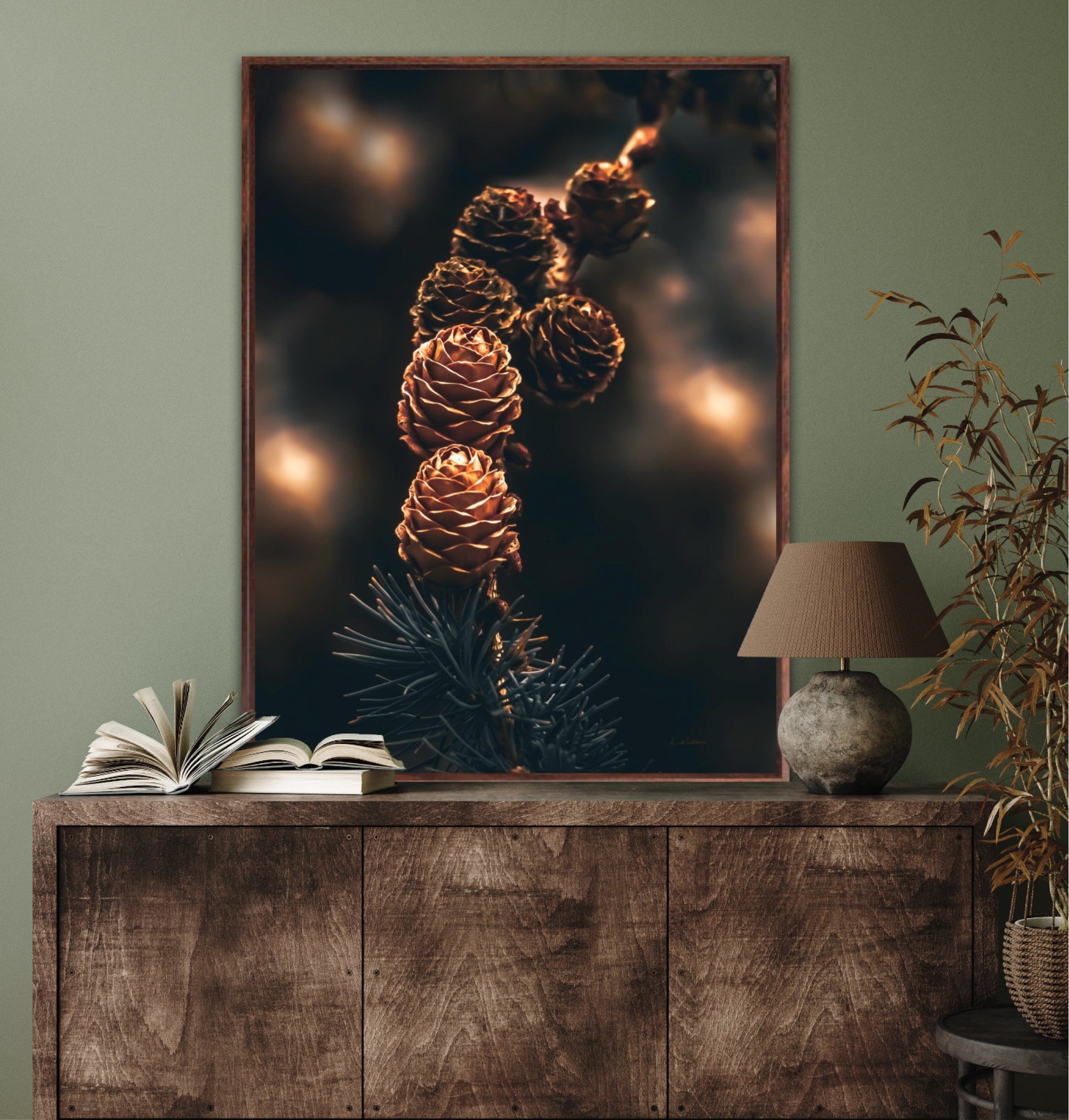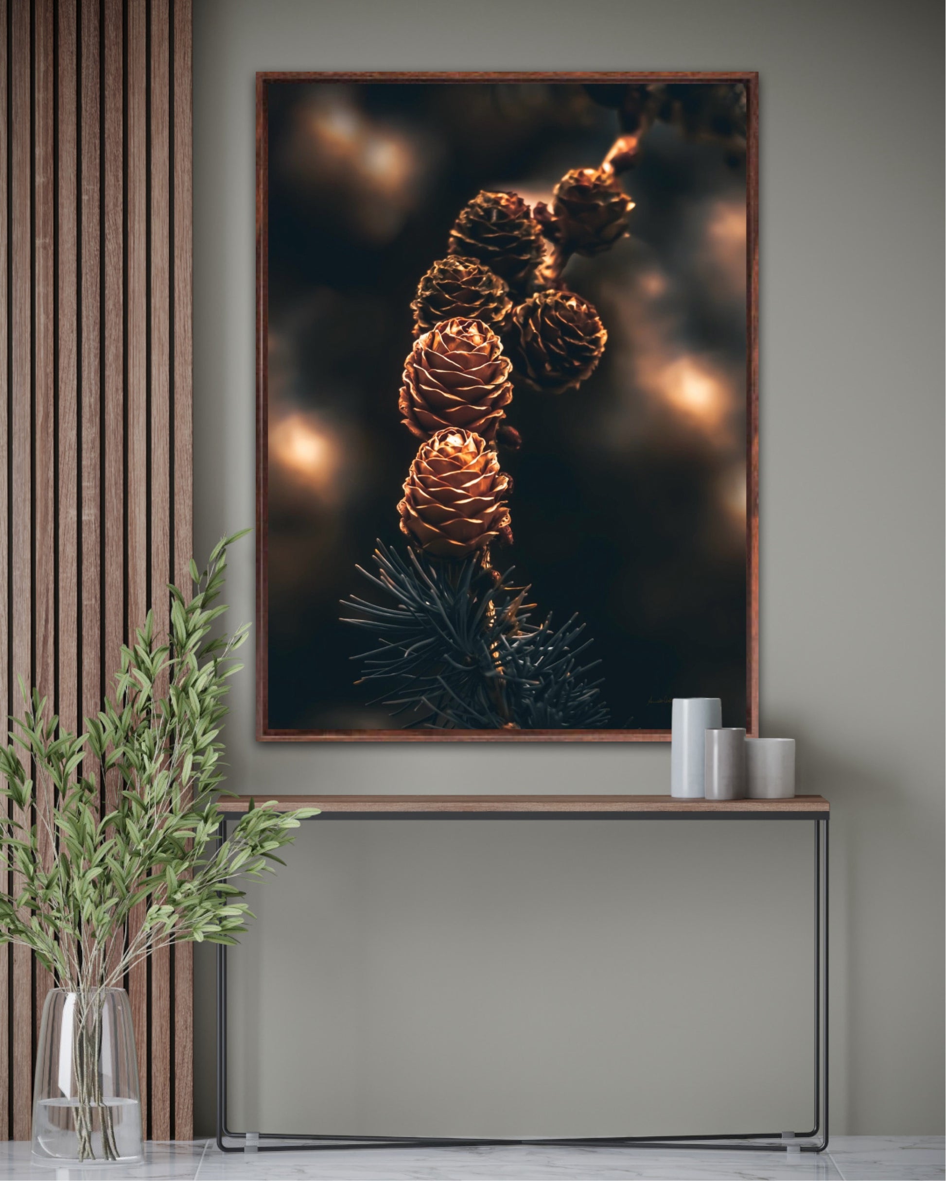 Beautiful photographic wall art of a golden pinecones in dark and dramatic tones with a golden light in the background. This artwork gives your hope that special cosy vibe.
