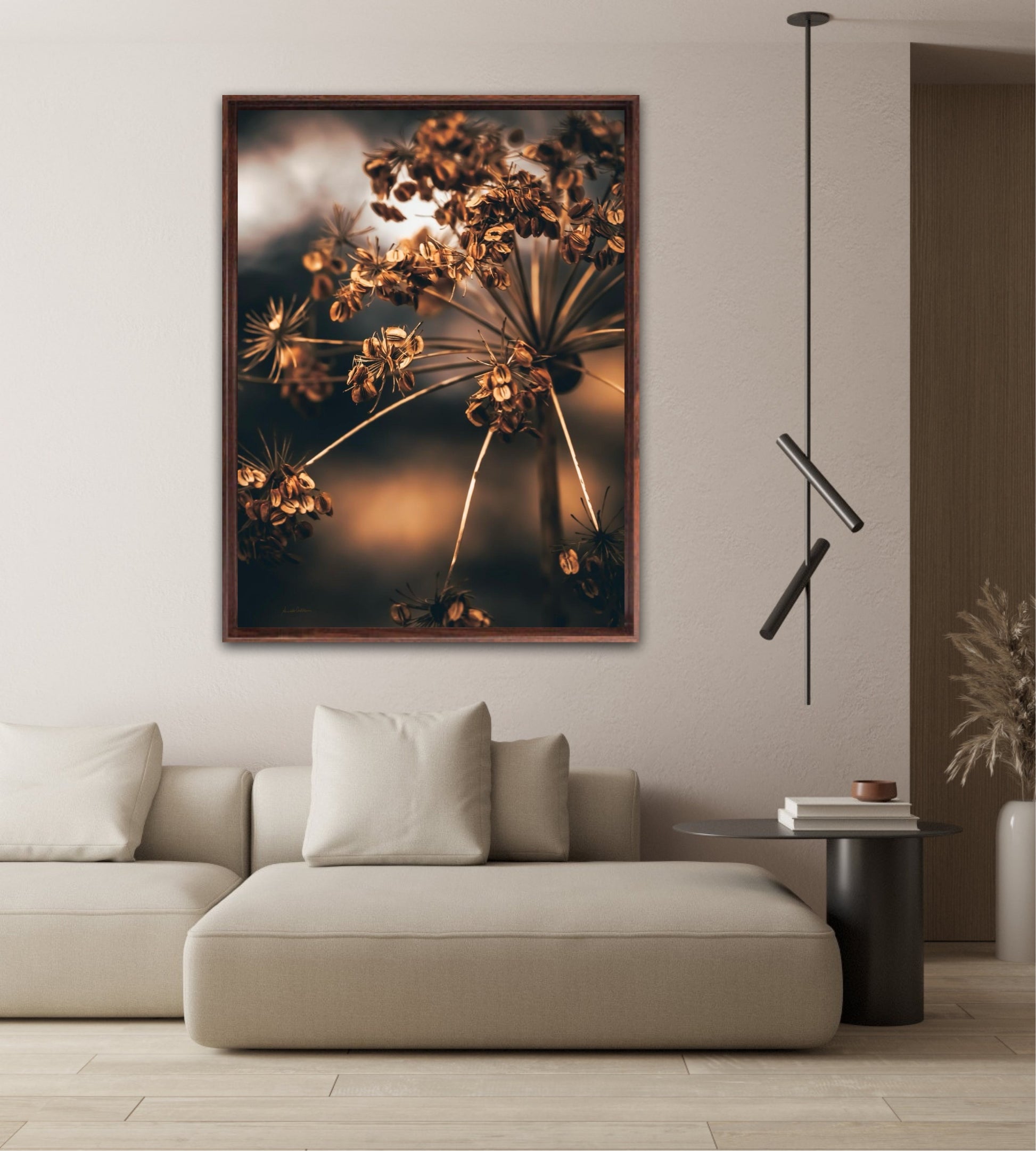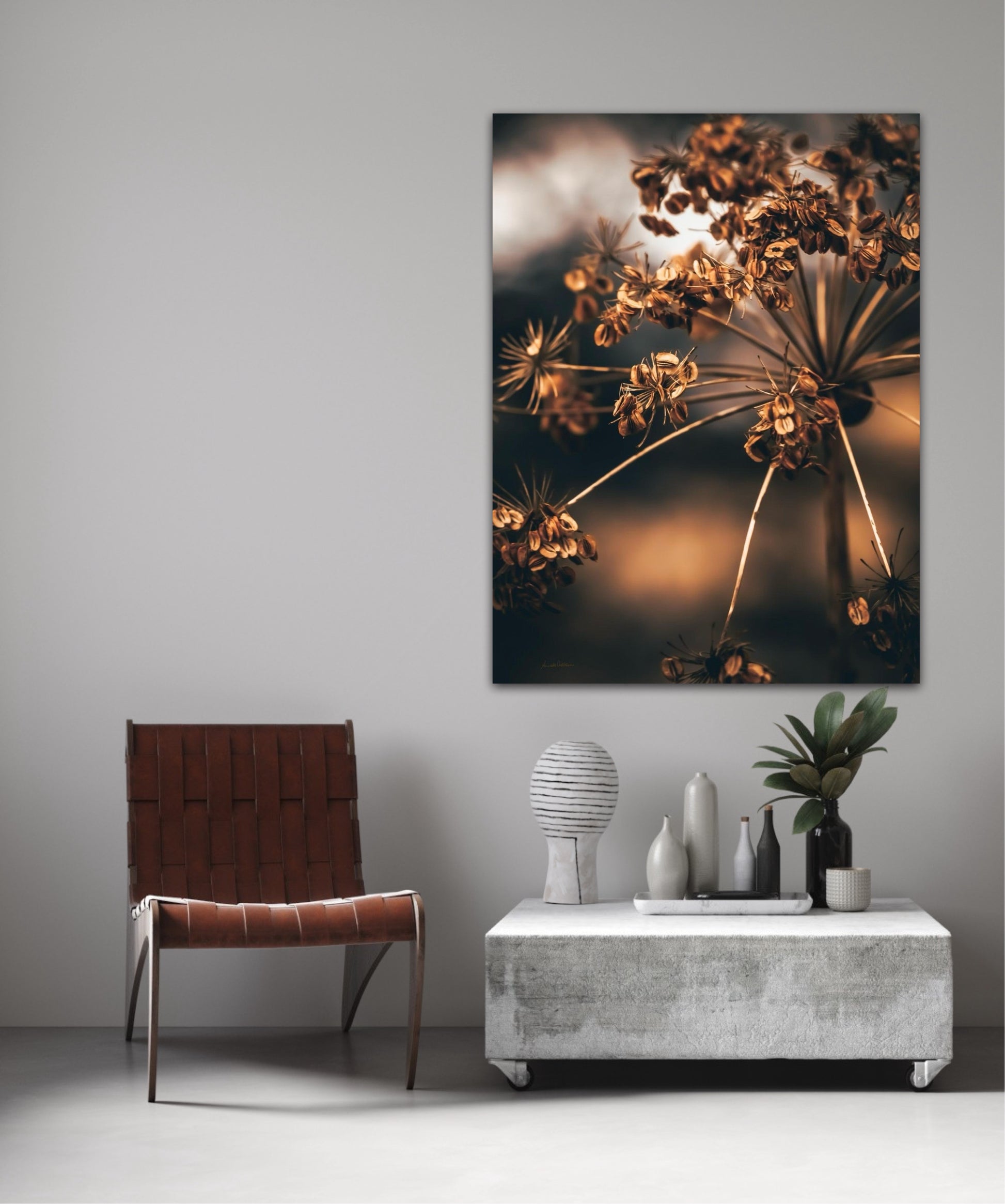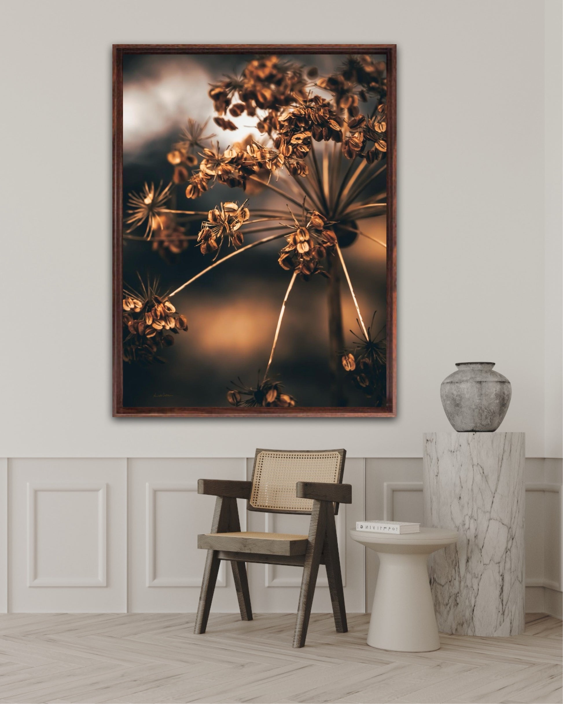 Striking photographic wall art of a dried Heracleum in beautiful brown tones. This beautiful artwork will be an eye-catcher in the living room and has such beautiful colours. Get a really nice artwork on the wall with this beautiful motif. This artwork will be a stand-out piece in your home.