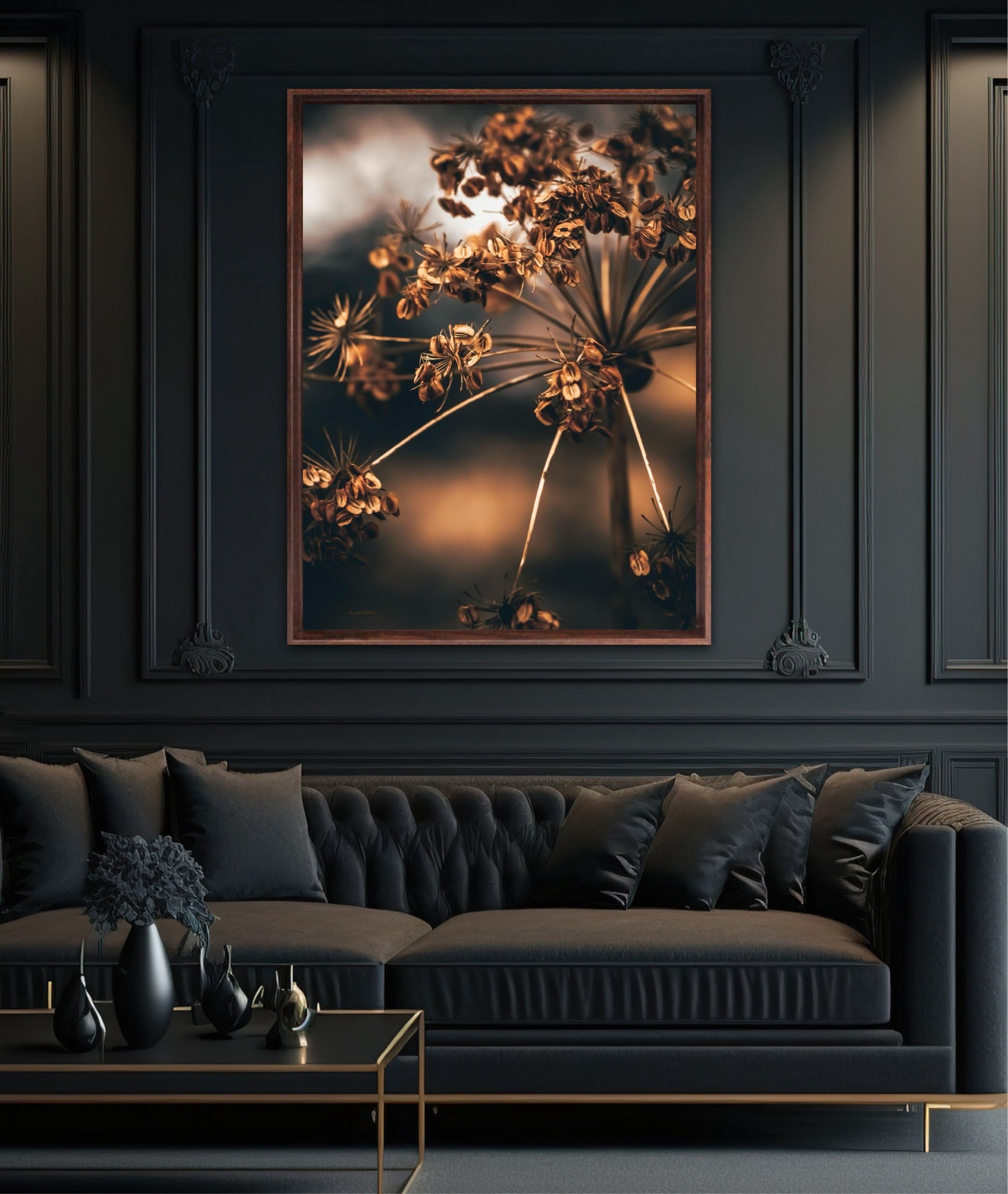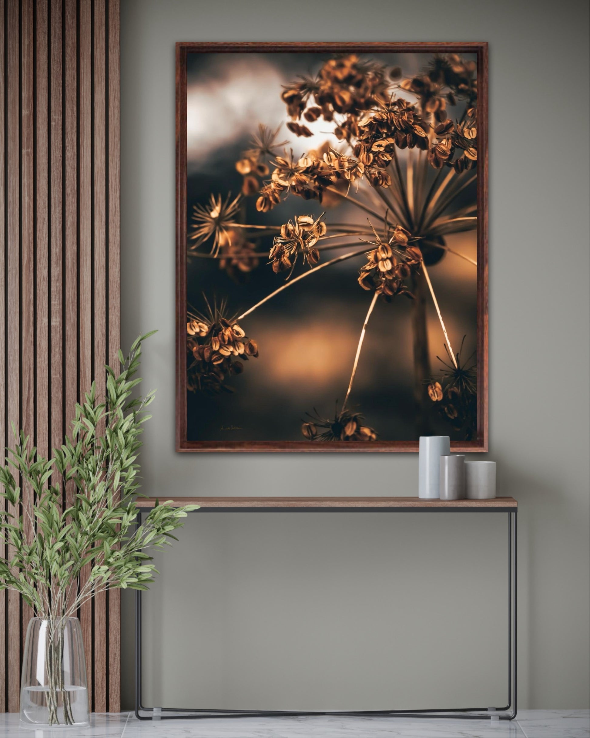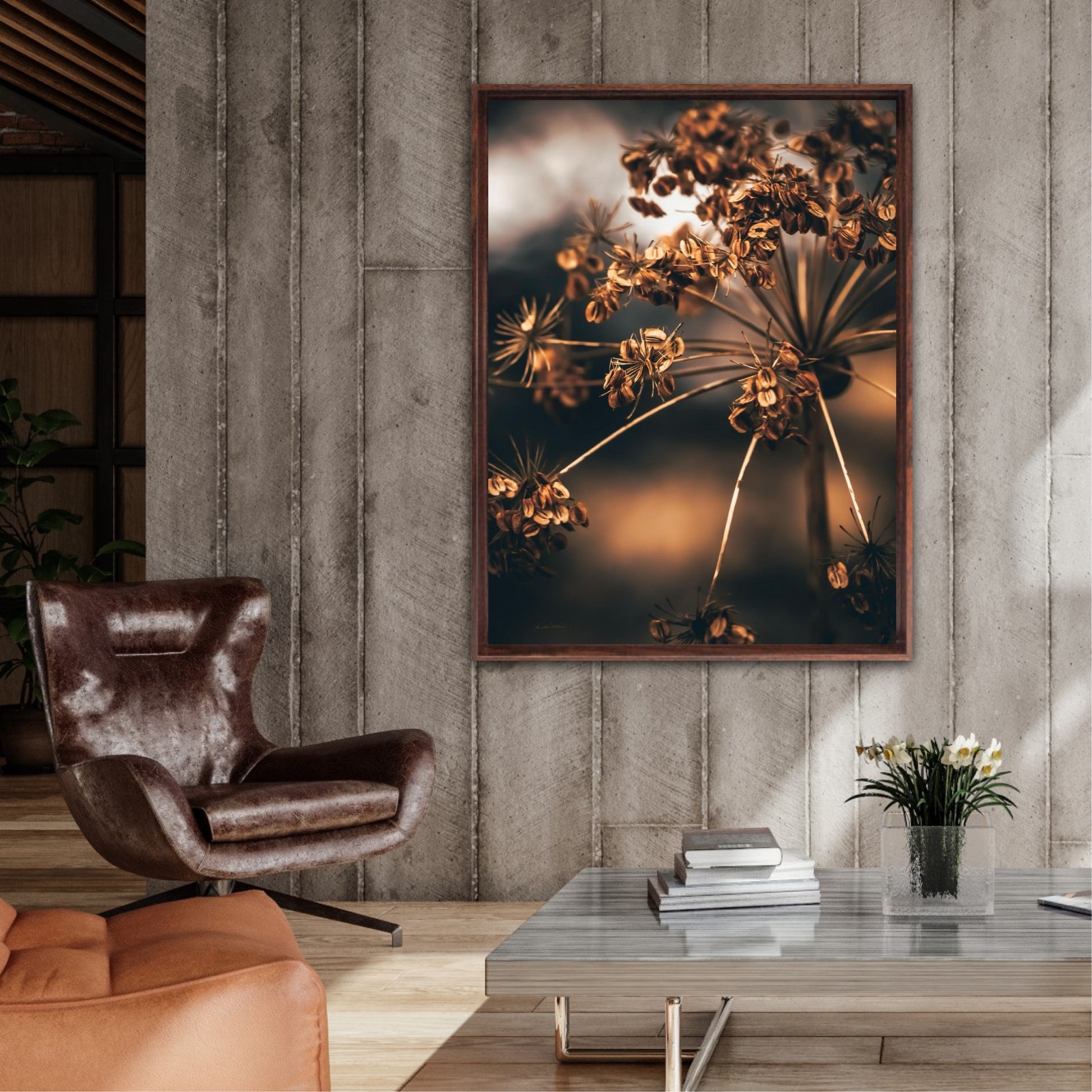 Striking photographic wall art of a dried Heracleum in beautiful brown tones. This beautiful artwork will be an eye-catcher in the living room and has such beautiful colours. Get a really nice artwork on the wall with this beautiful motif. This artwork will be a stand-out piece in your home.